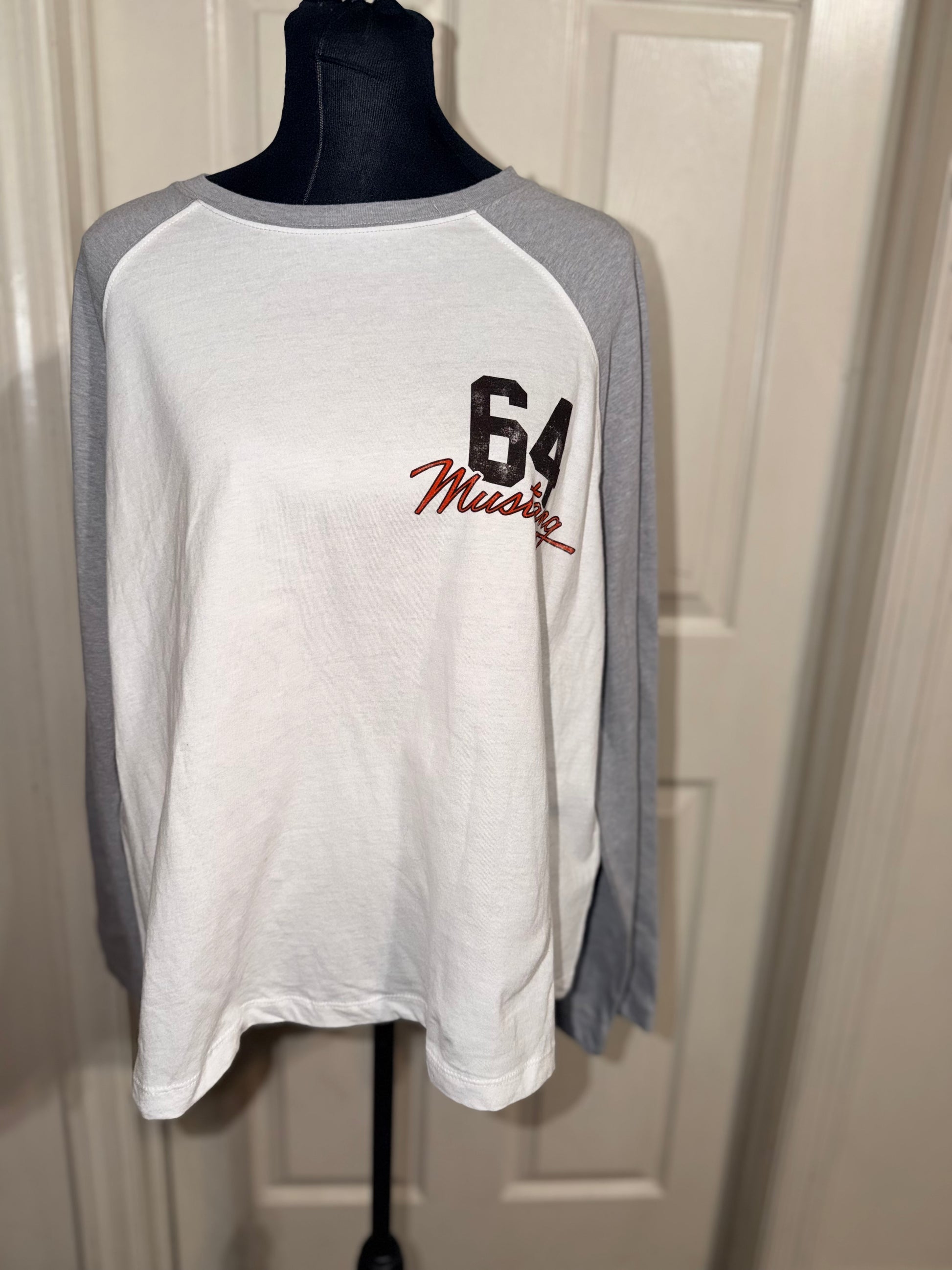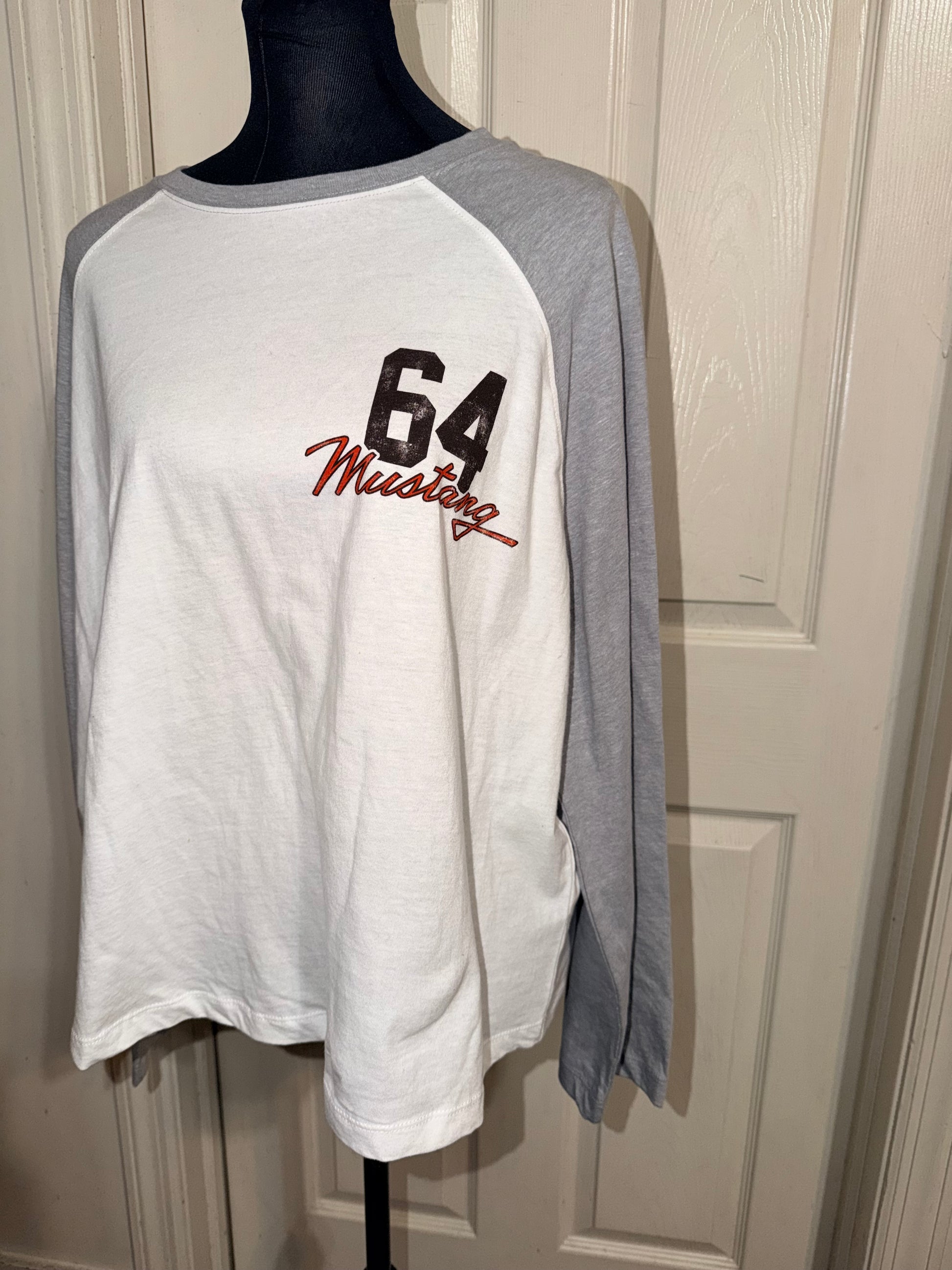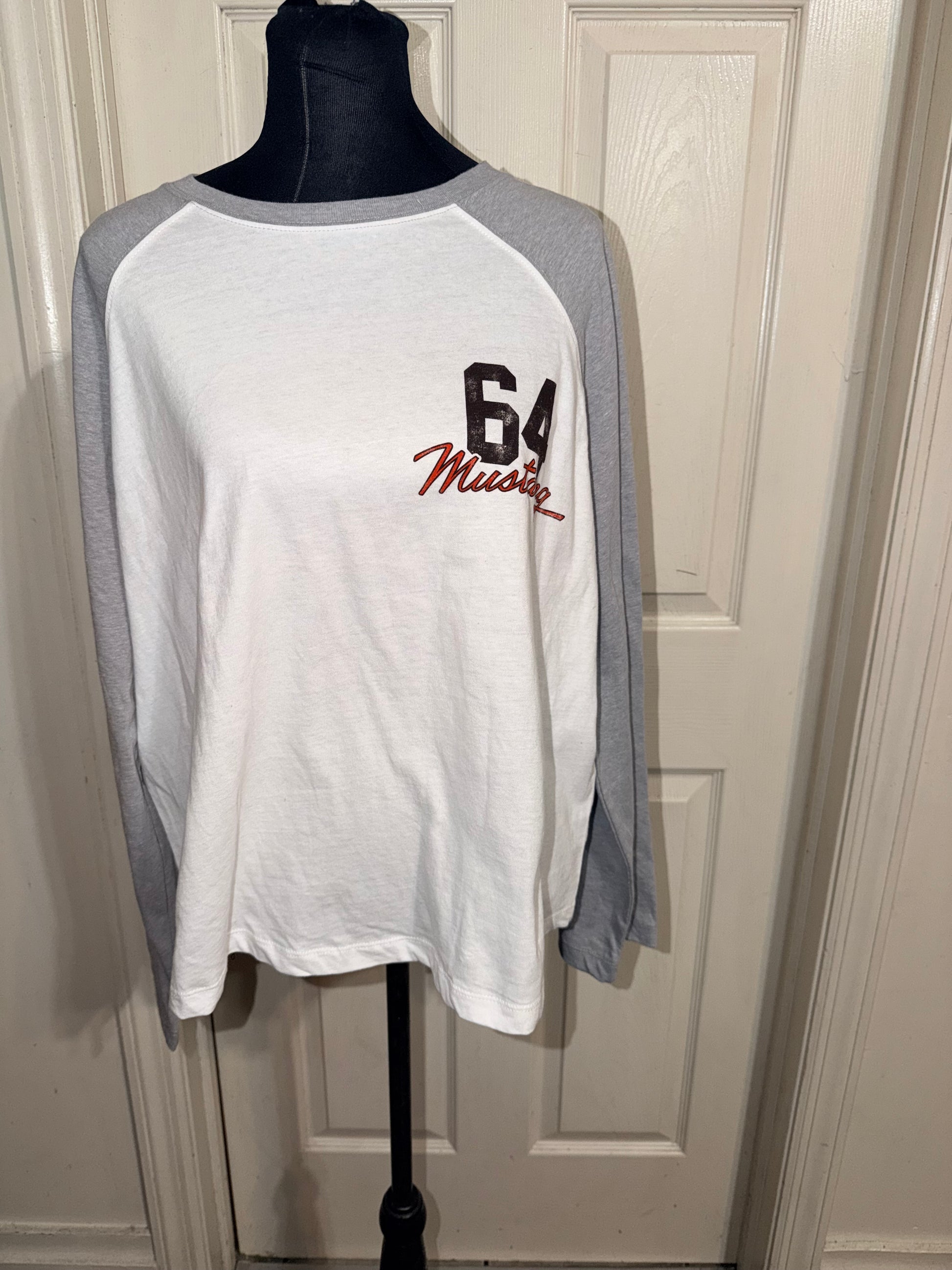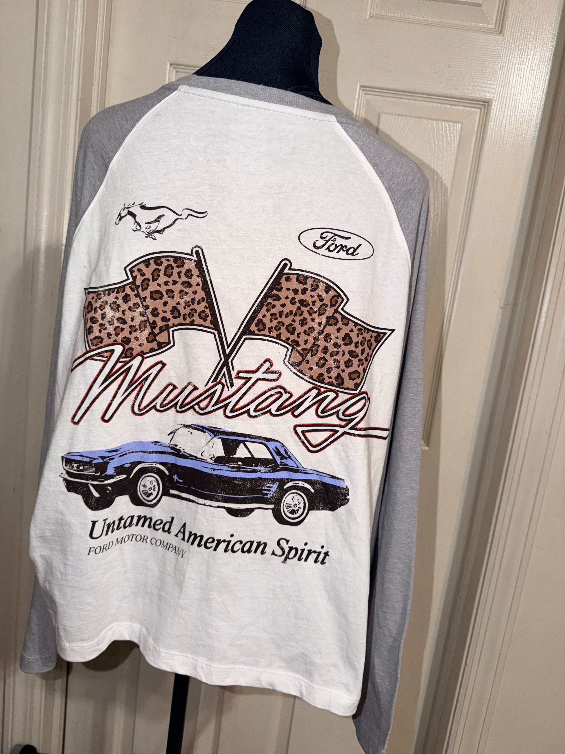 A white Ford Mustang double sided raglan 3/4 tee. Oversized, but this could still fit an XL without being huge.
