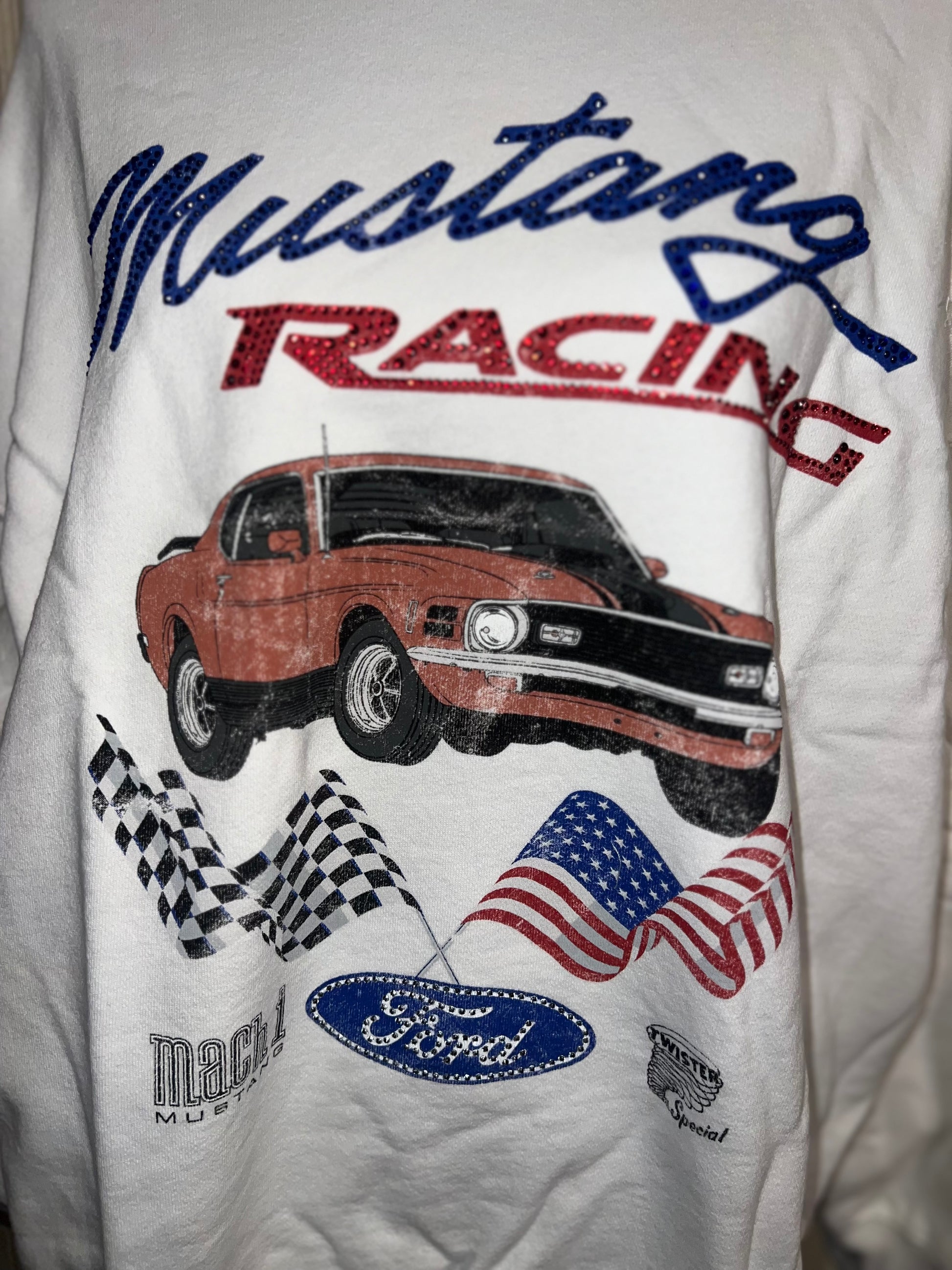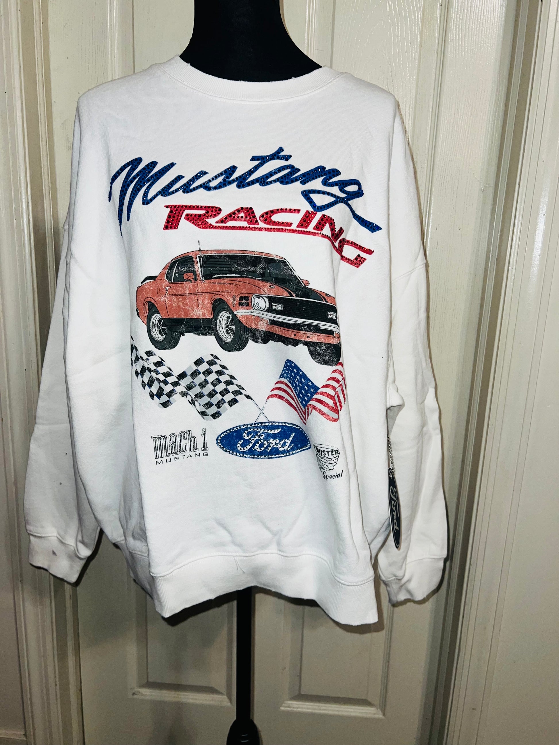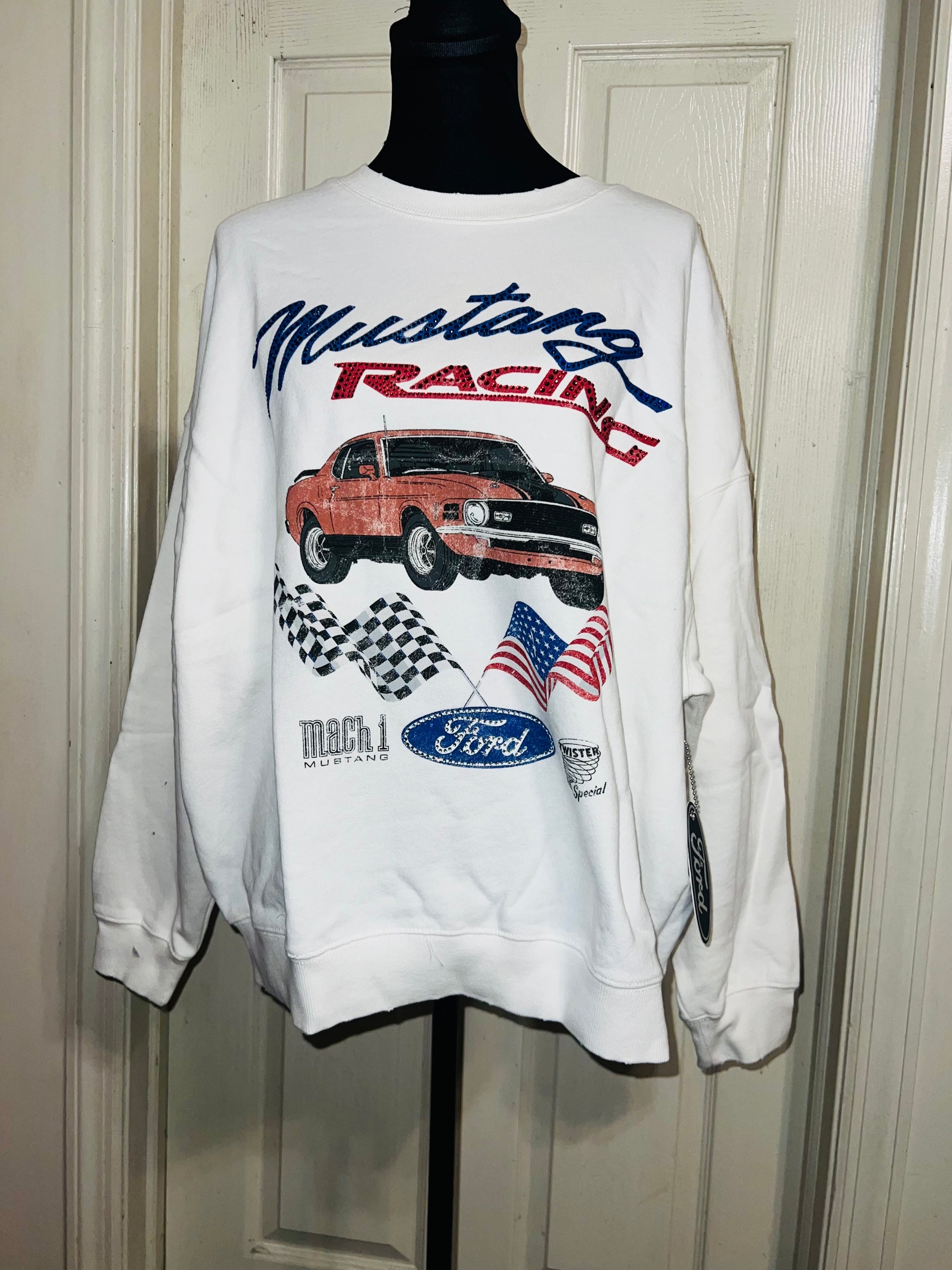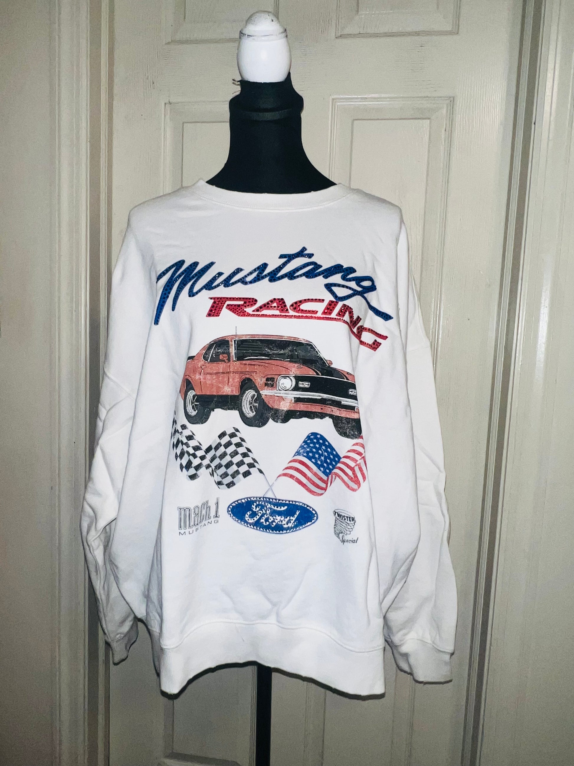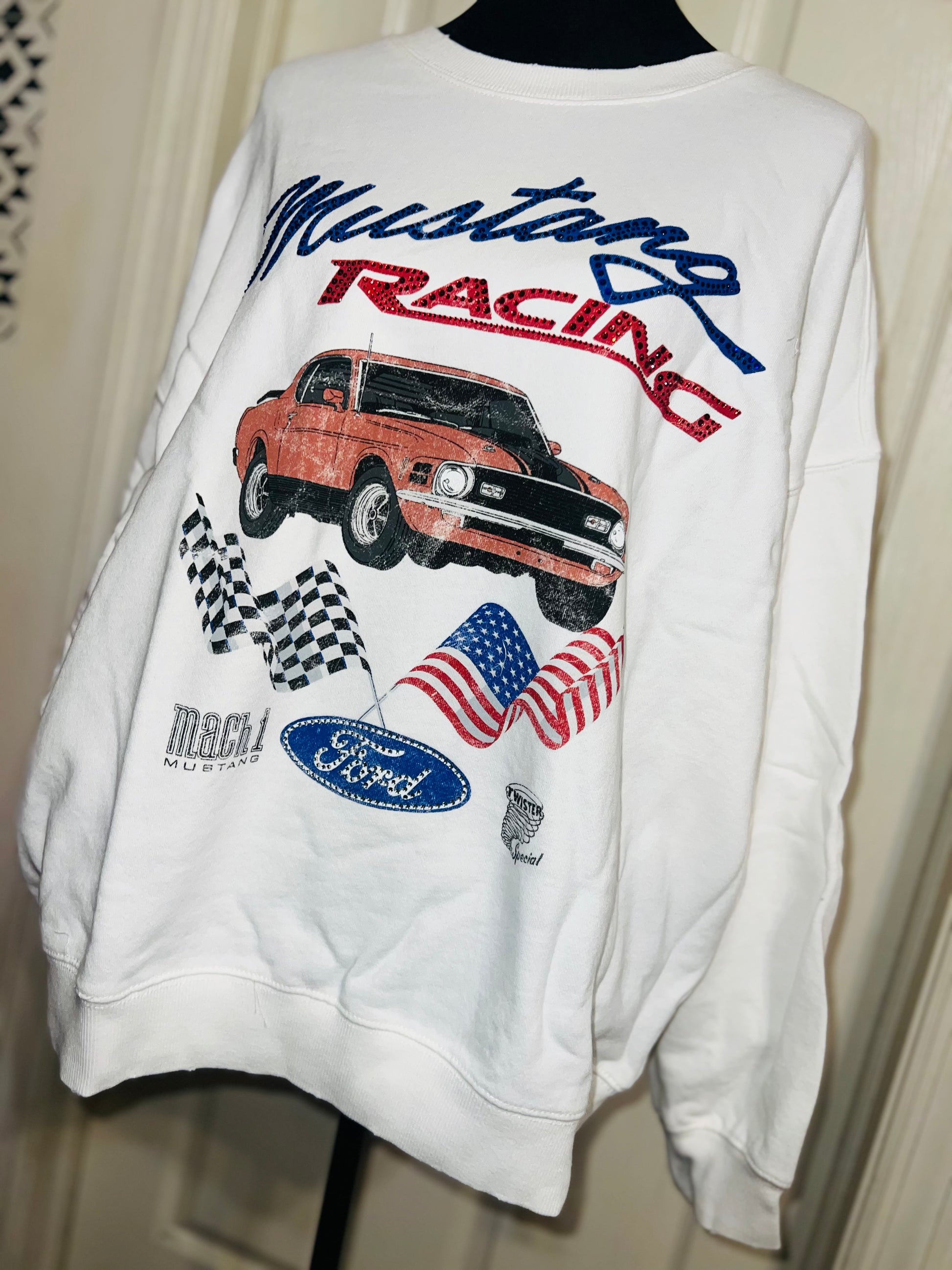 A white Ford Mustang oversized sweatshirt with very small gems around the small Ford symbol at the bottom. Super comfortable and so cute. Size XL, oversized.