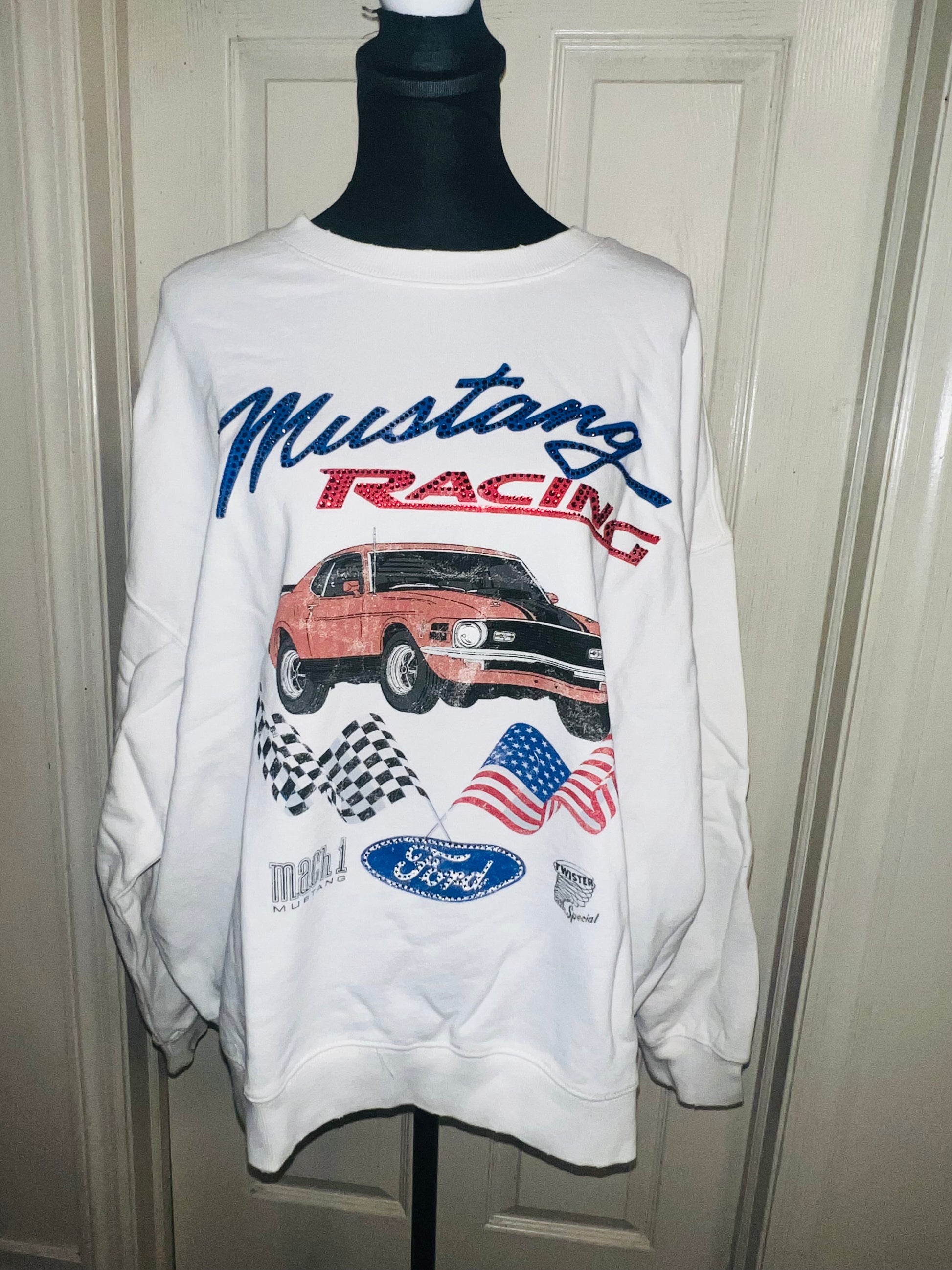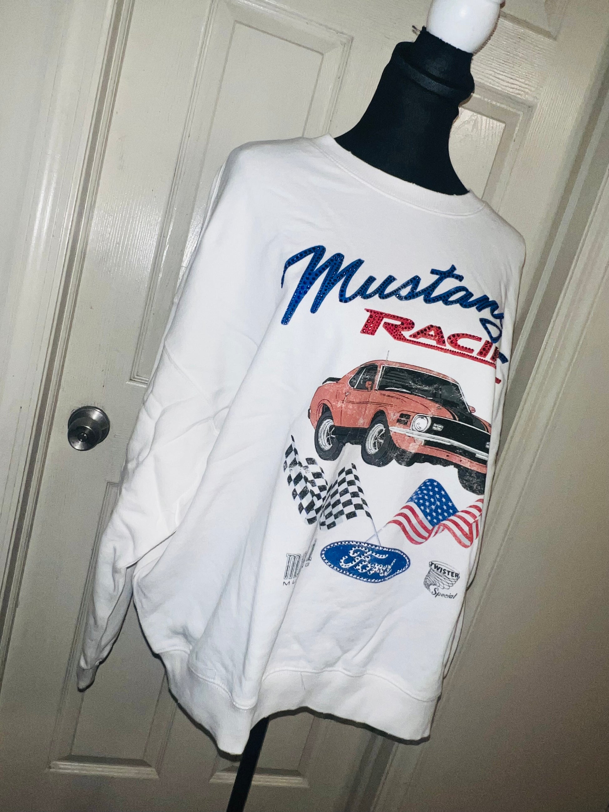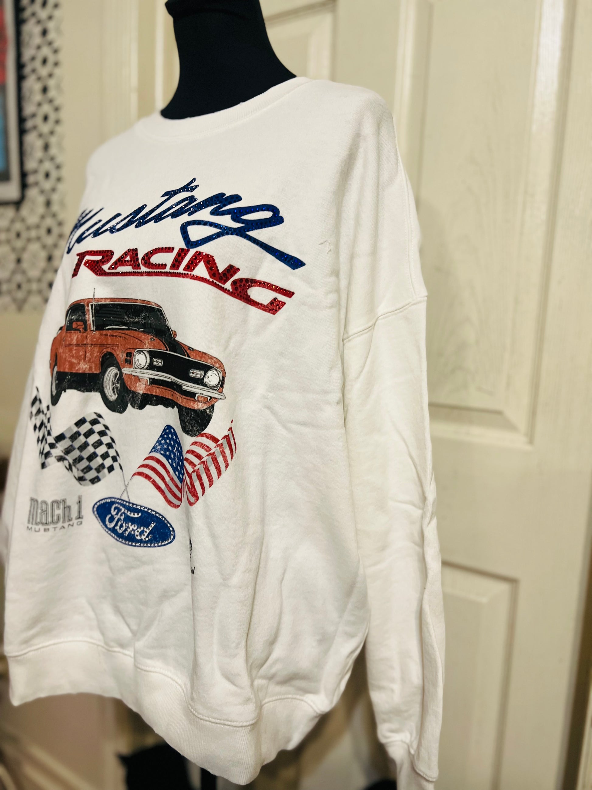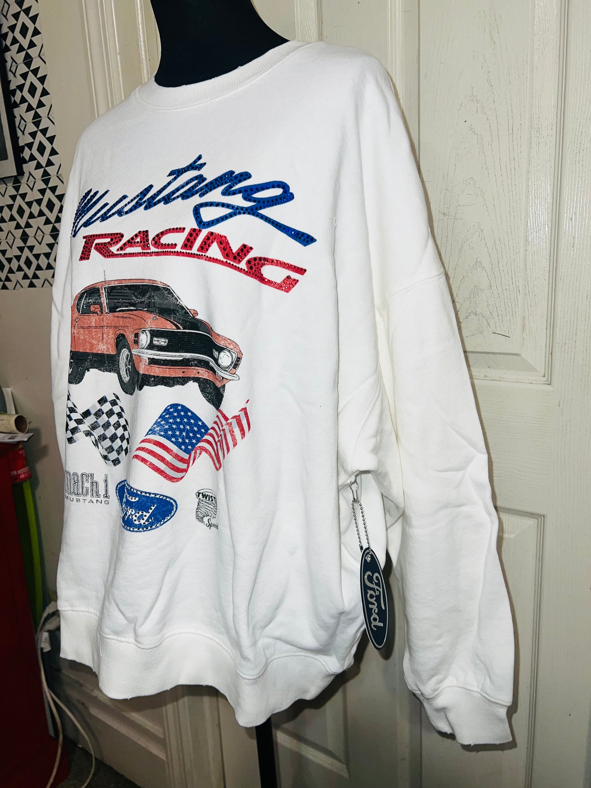 A white Ford Mustang oversized sweatshirt with very small gems around the small Ford symbol at the bottom. Super comfortable and so cute. Size XL, oversized.