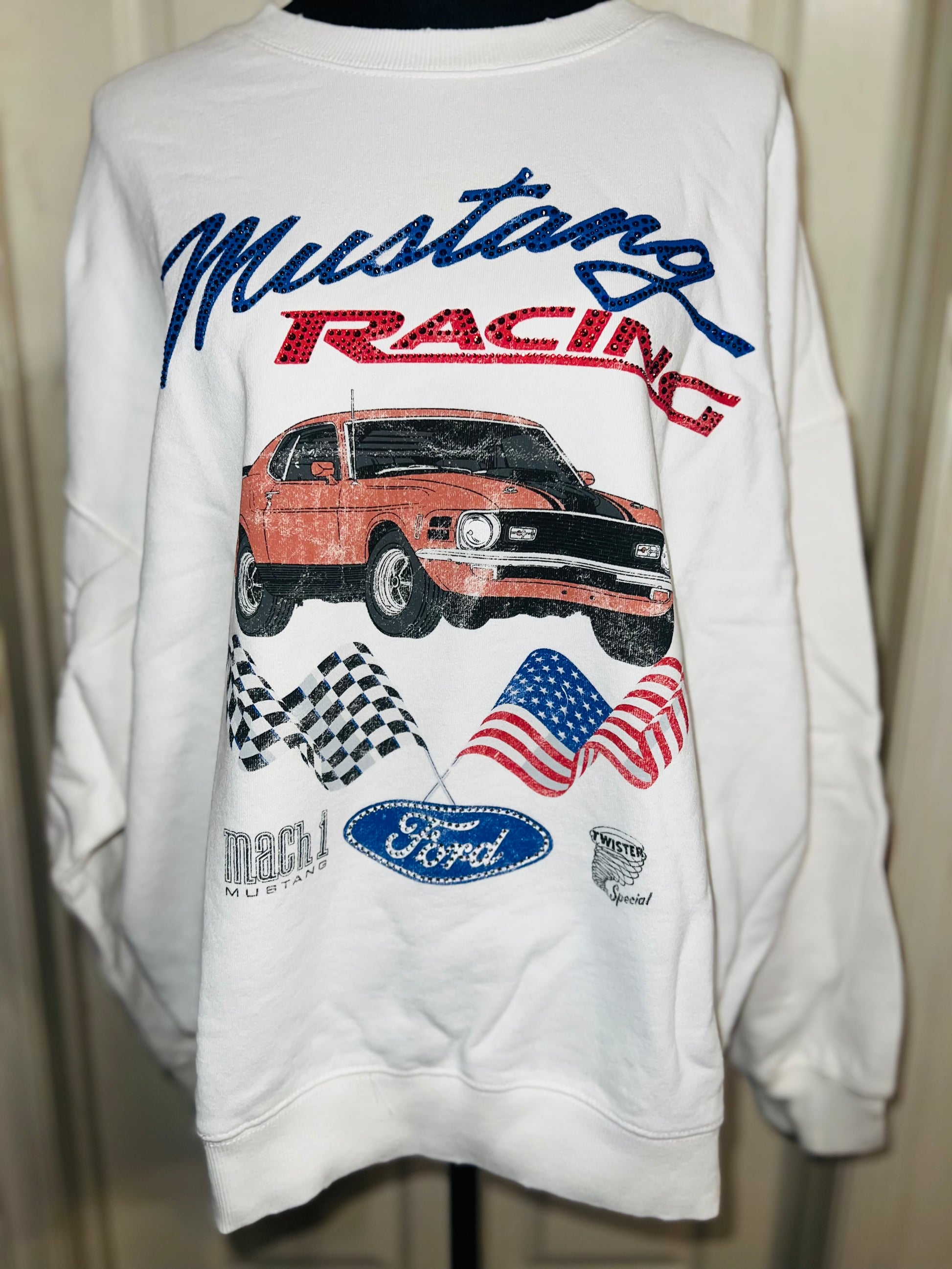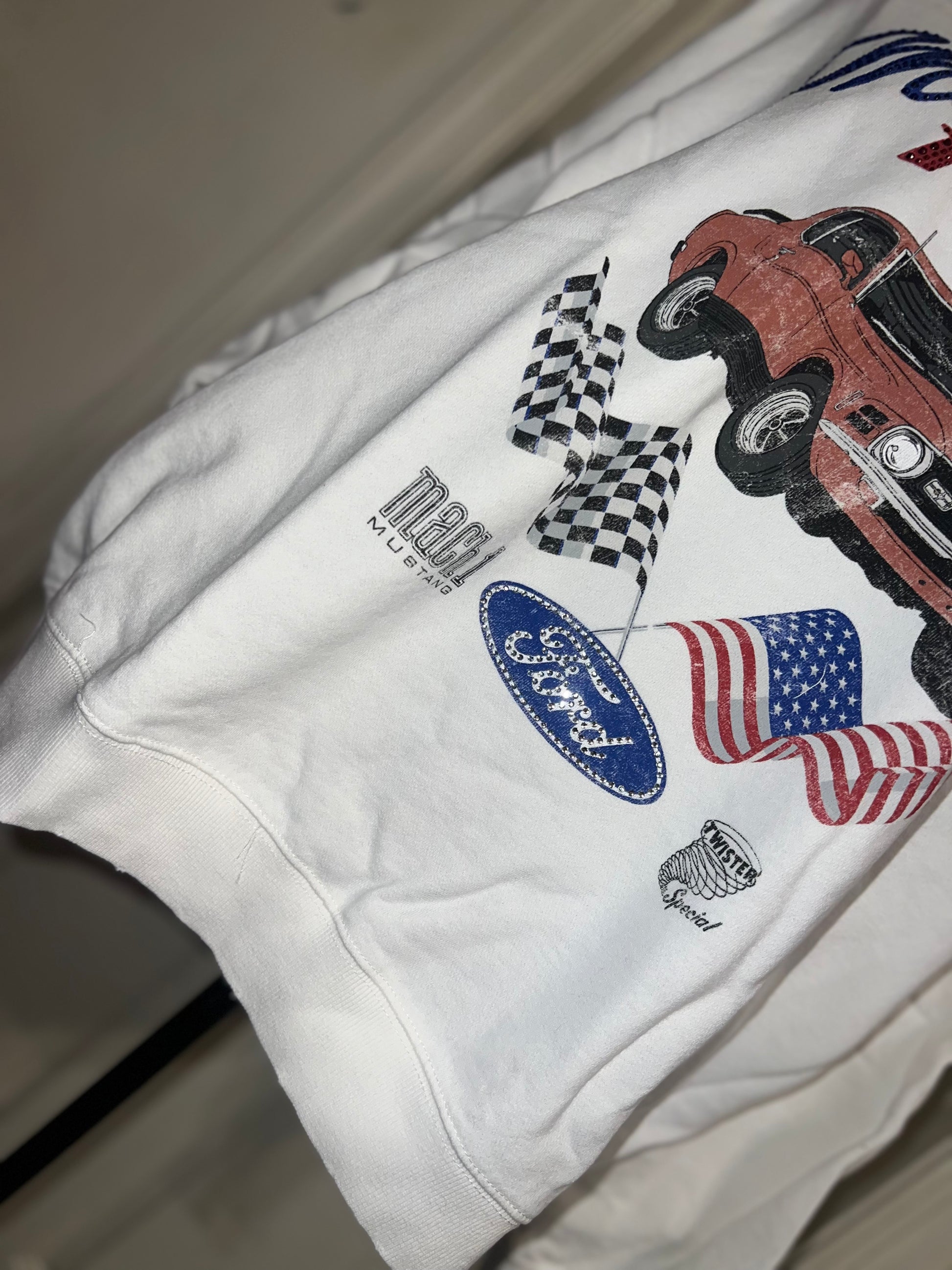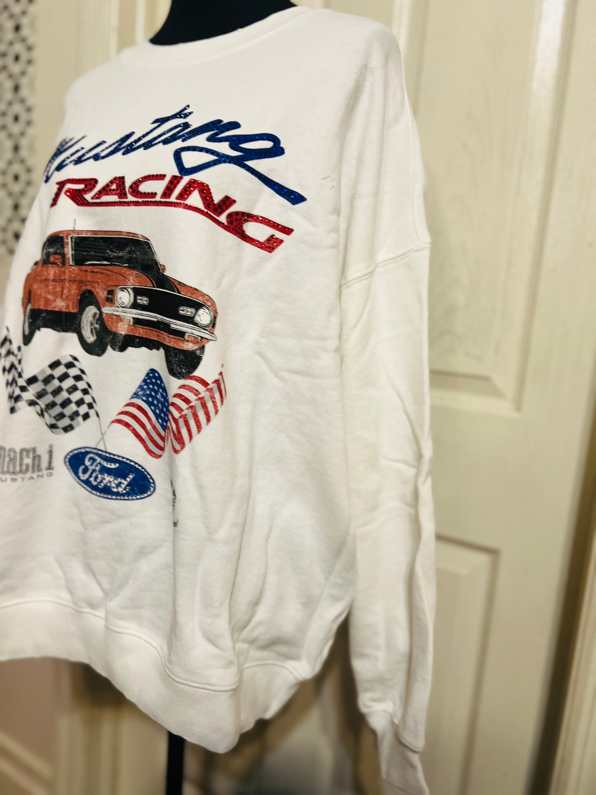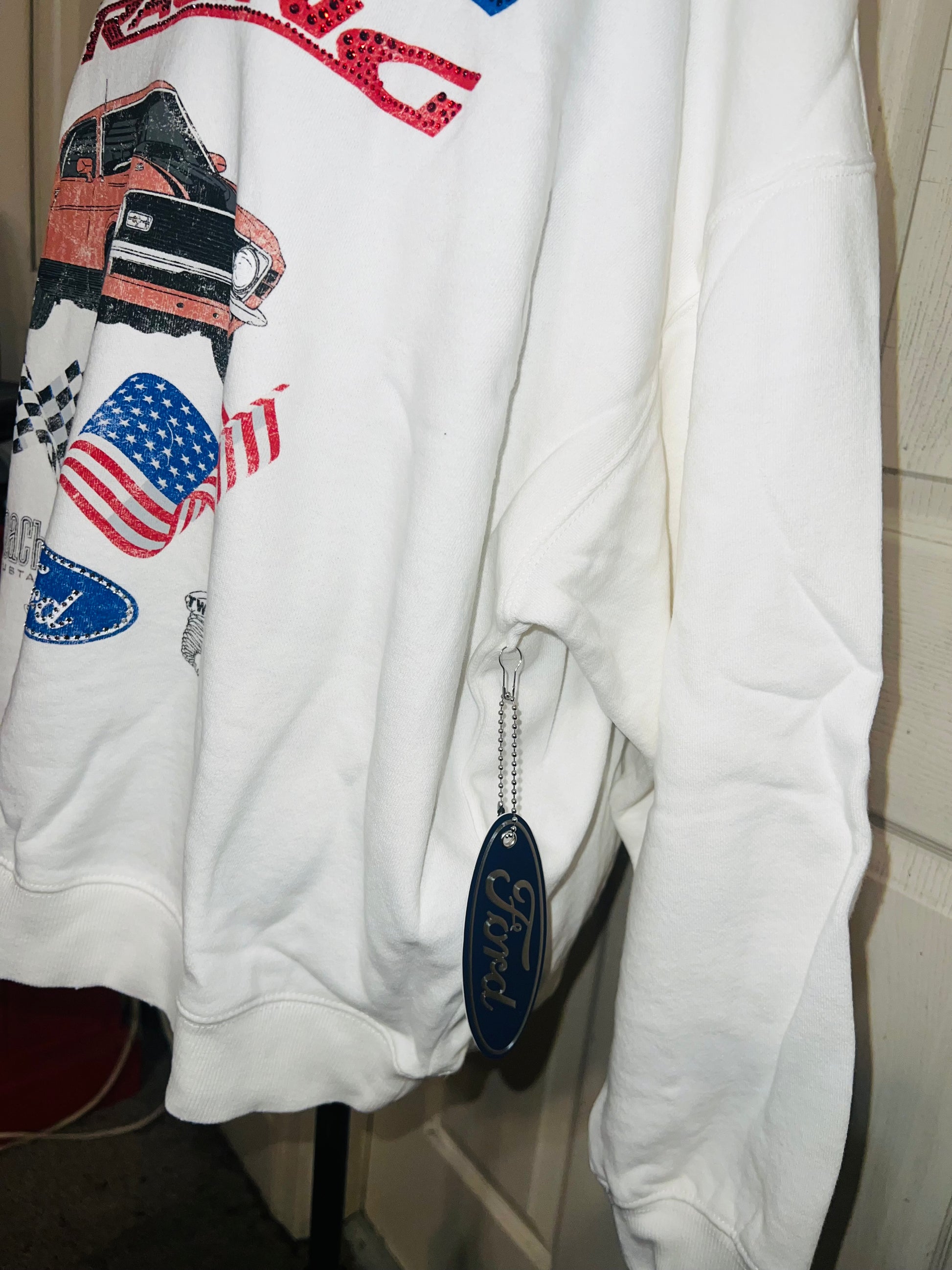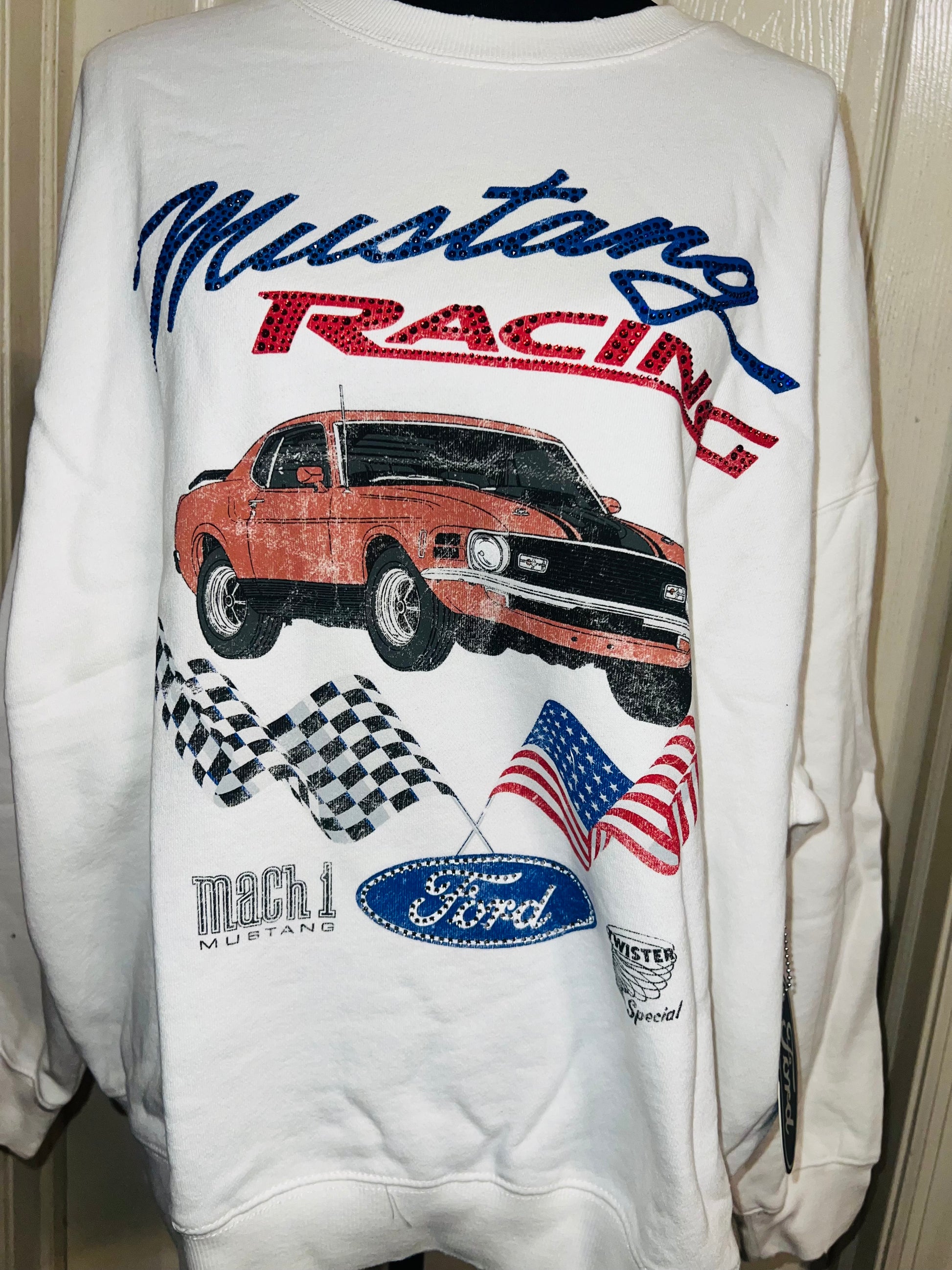 A white Ford Mustang oversized sweatshirt with very small gems around the small Ford symbol at the bottom. Super comfortable and so cute. Size XL, oversized.