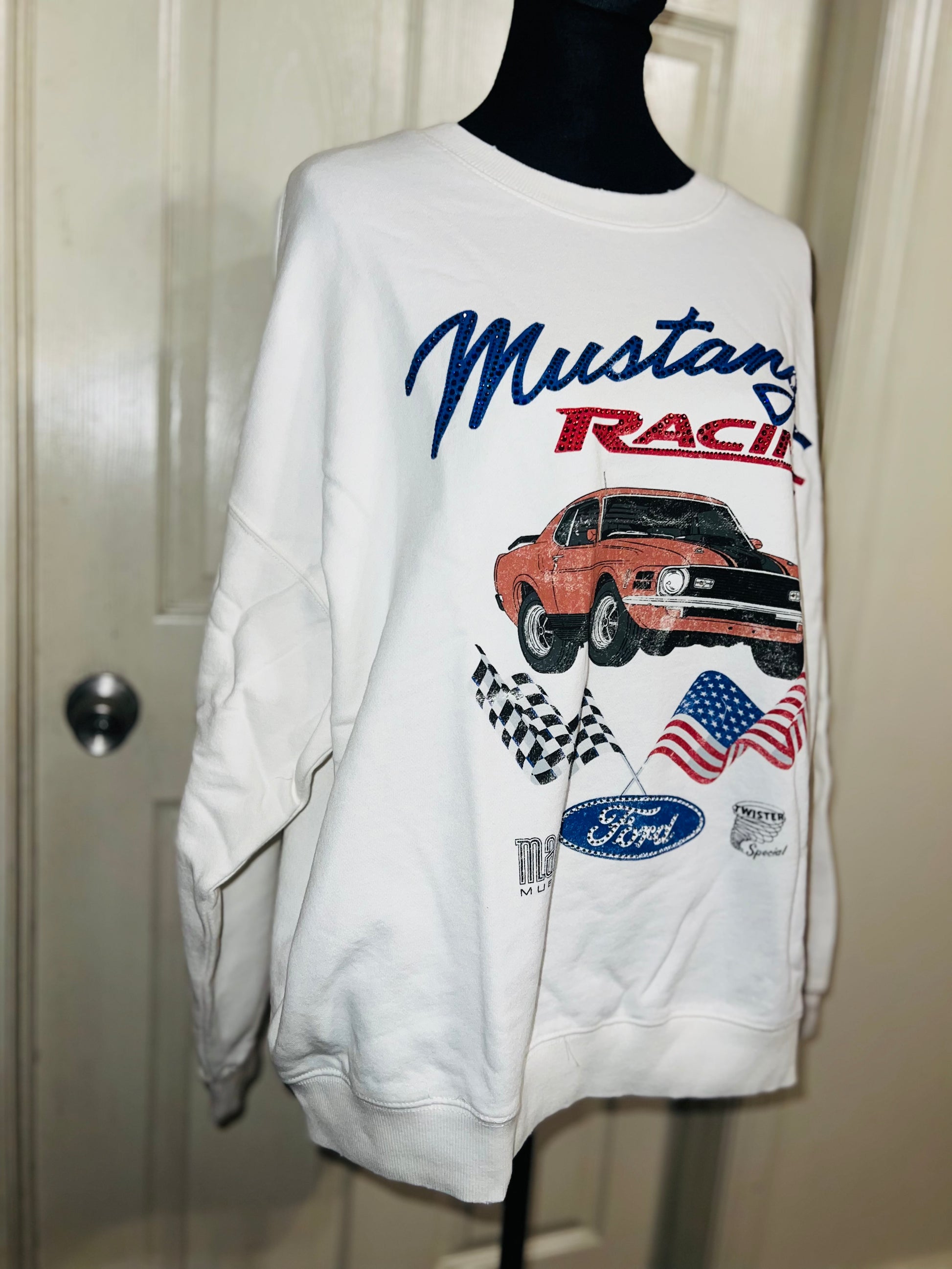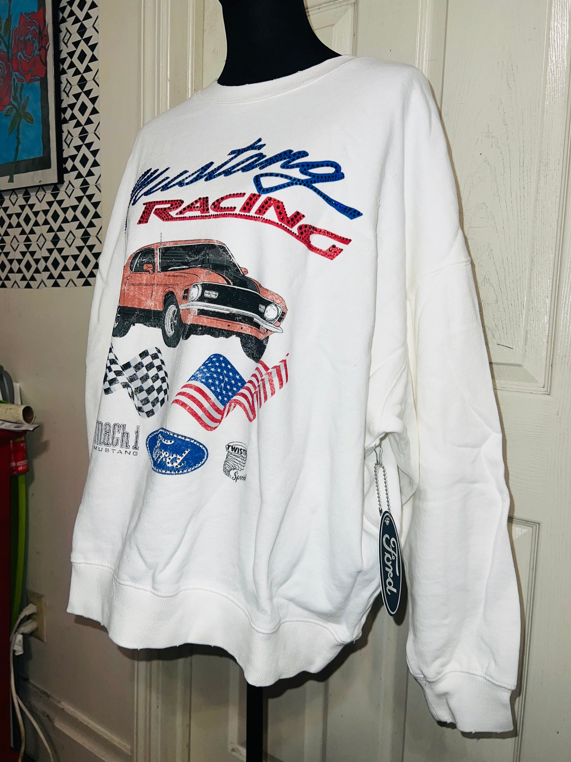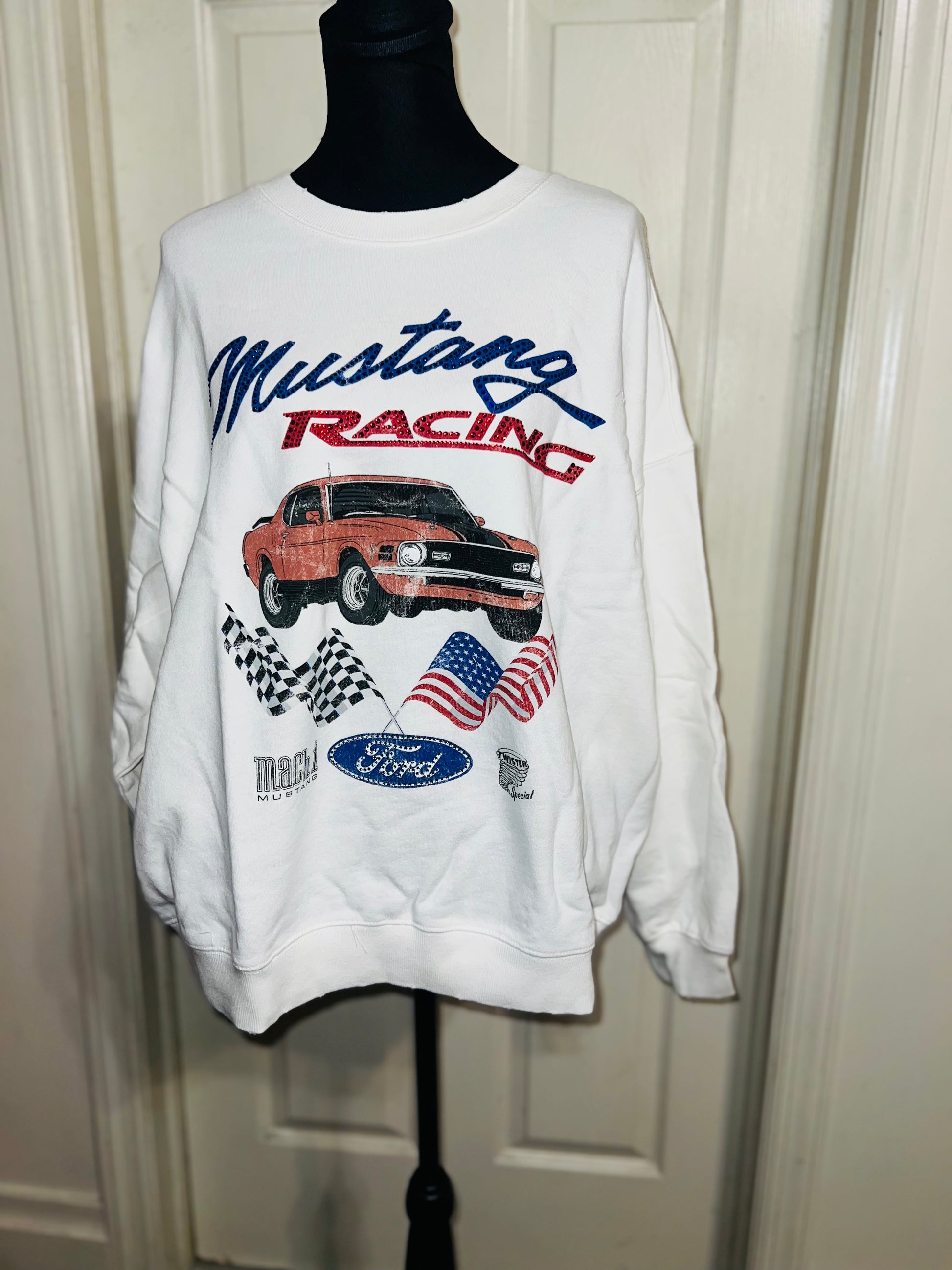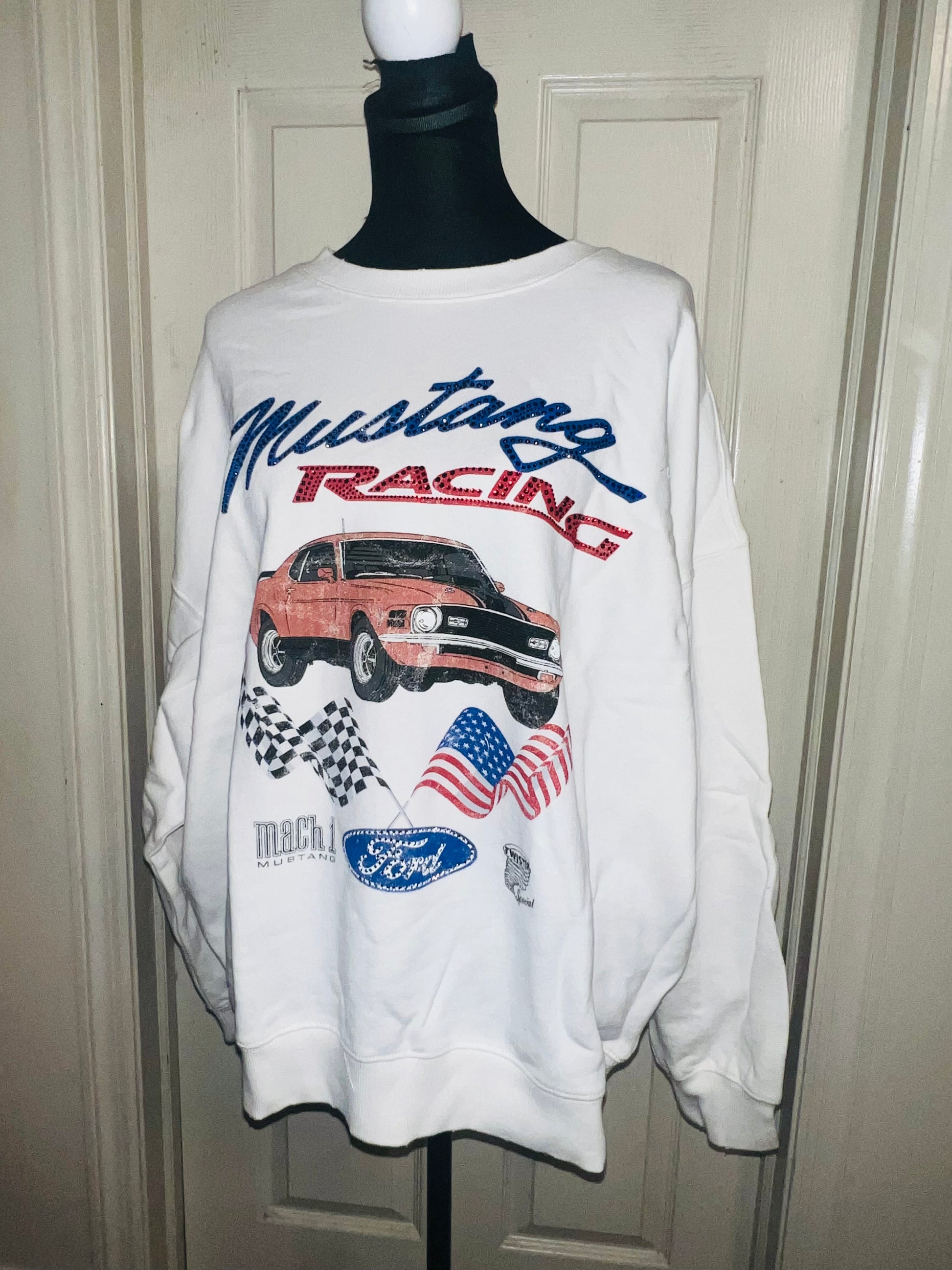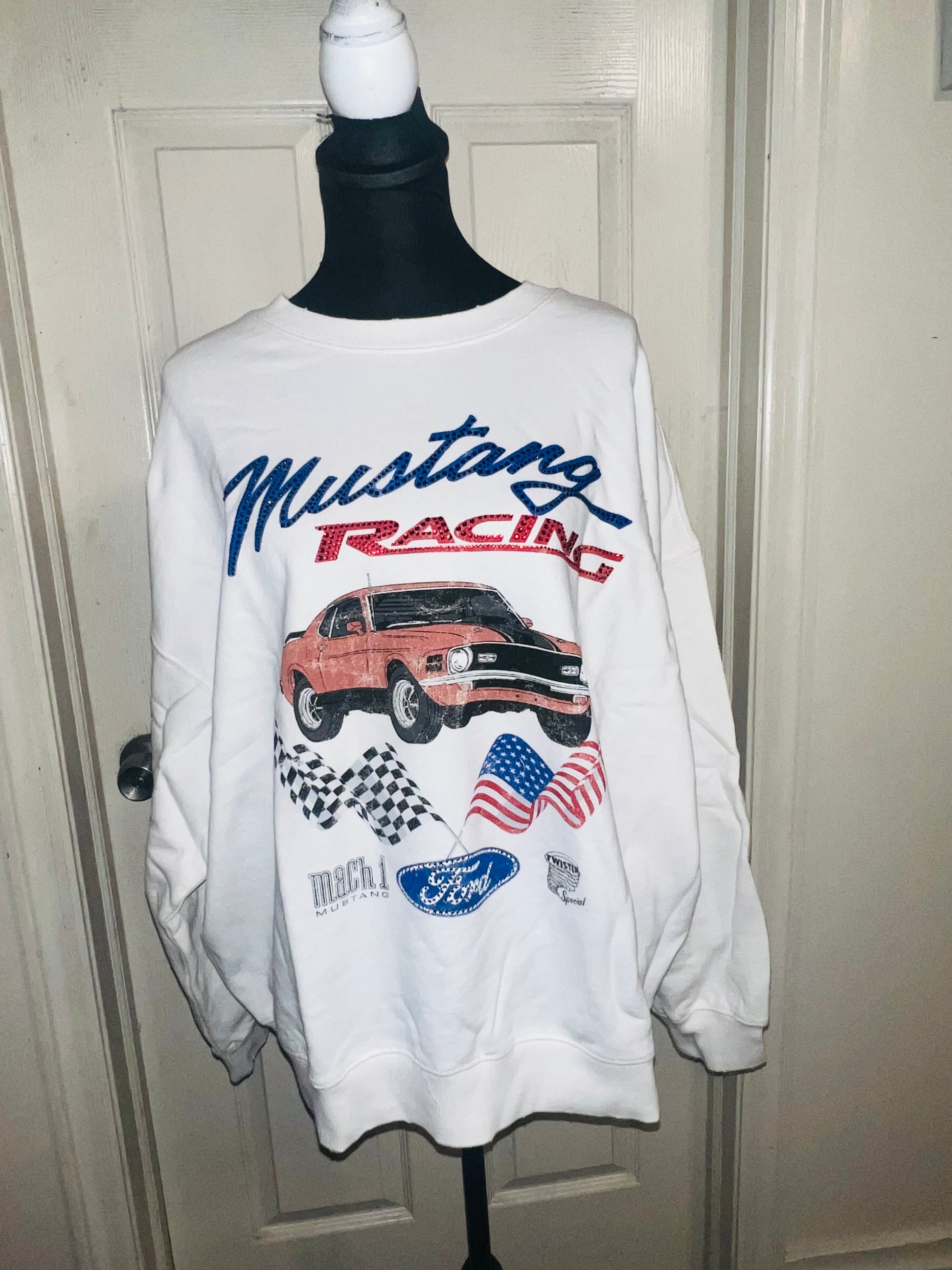 A white Ford Mustang oversized sweatshirt with very small gems around the small Ford symbol at the bottom. Super comfortable and so cute. Size XL, oversized.