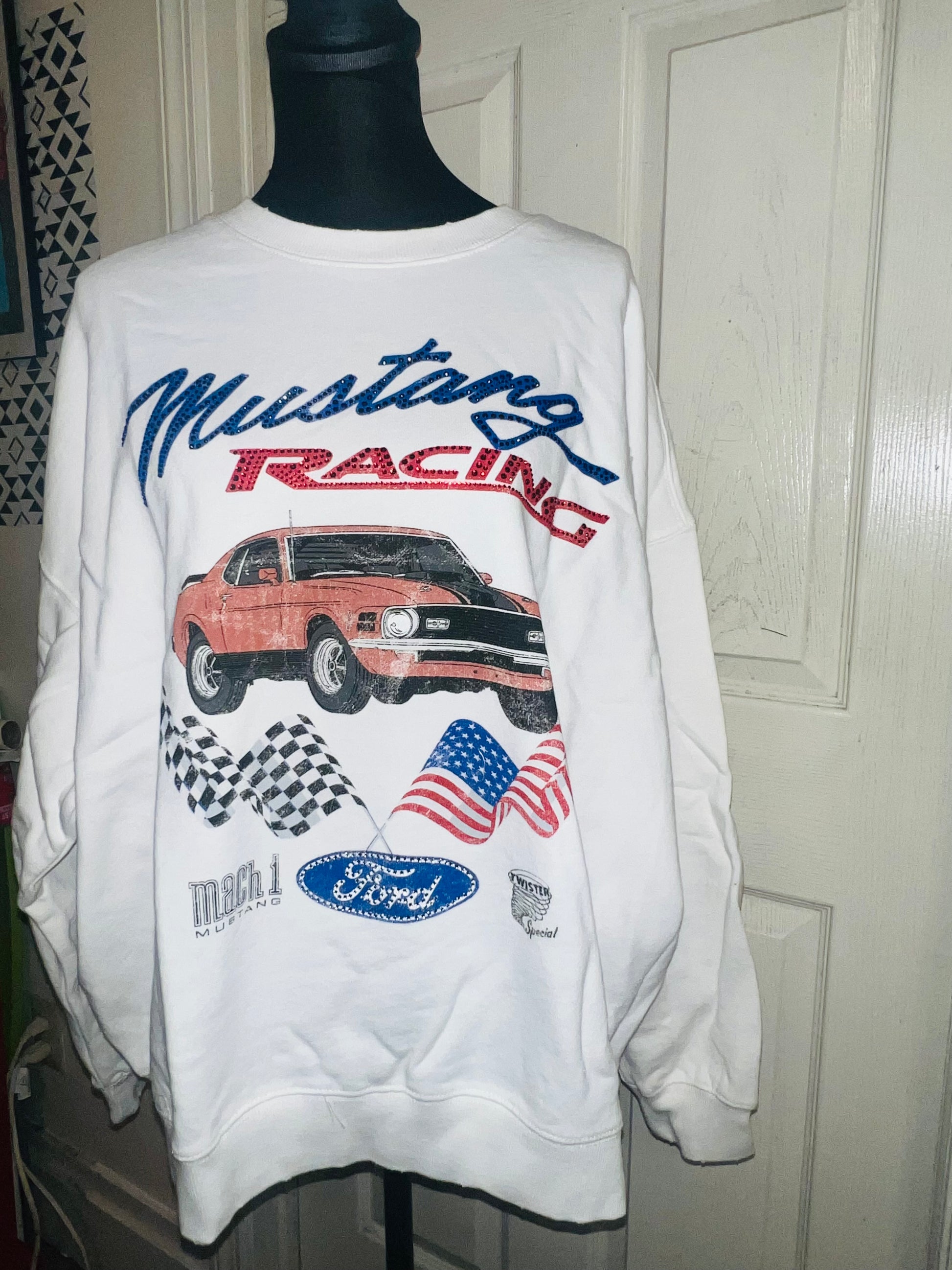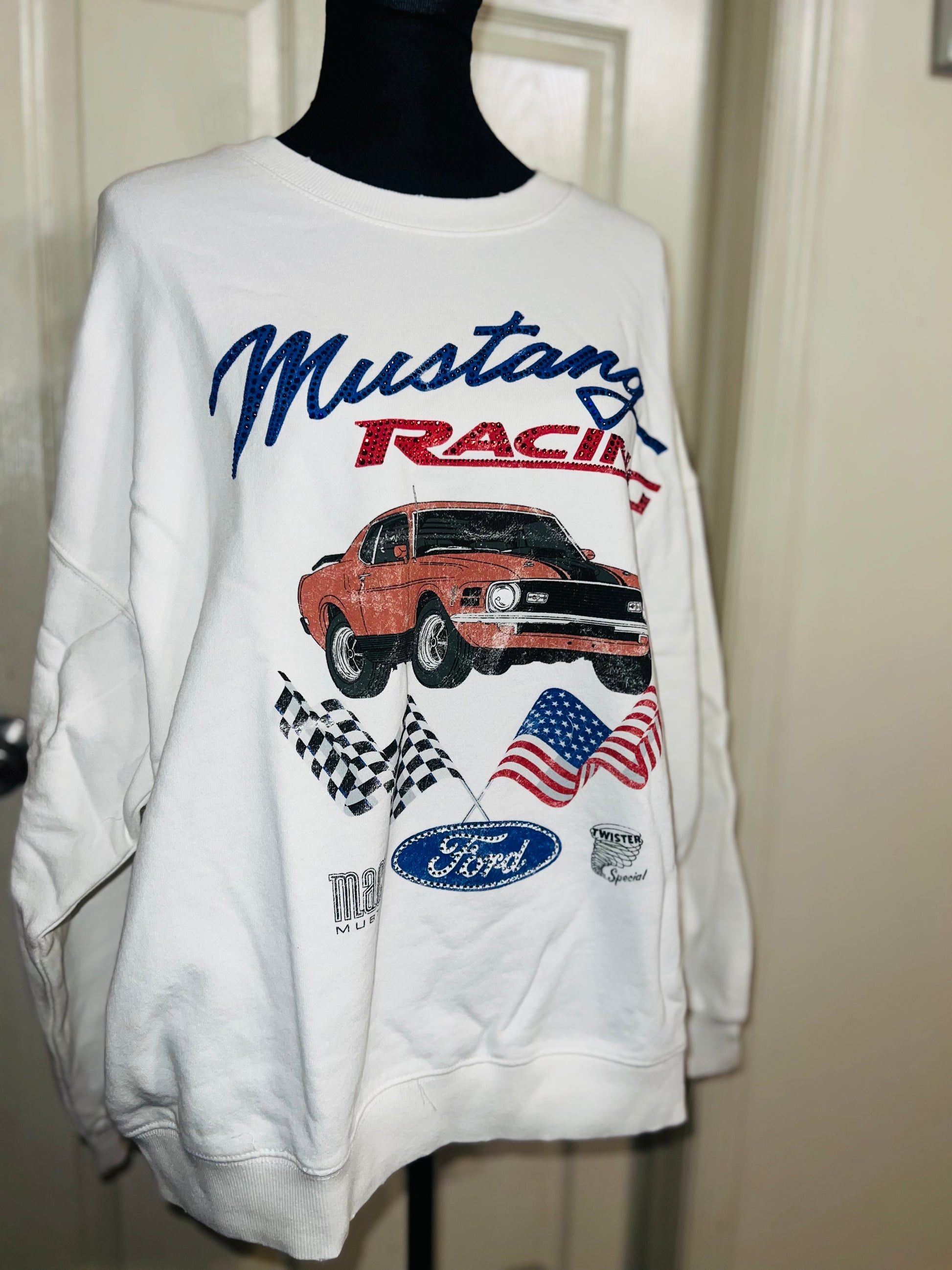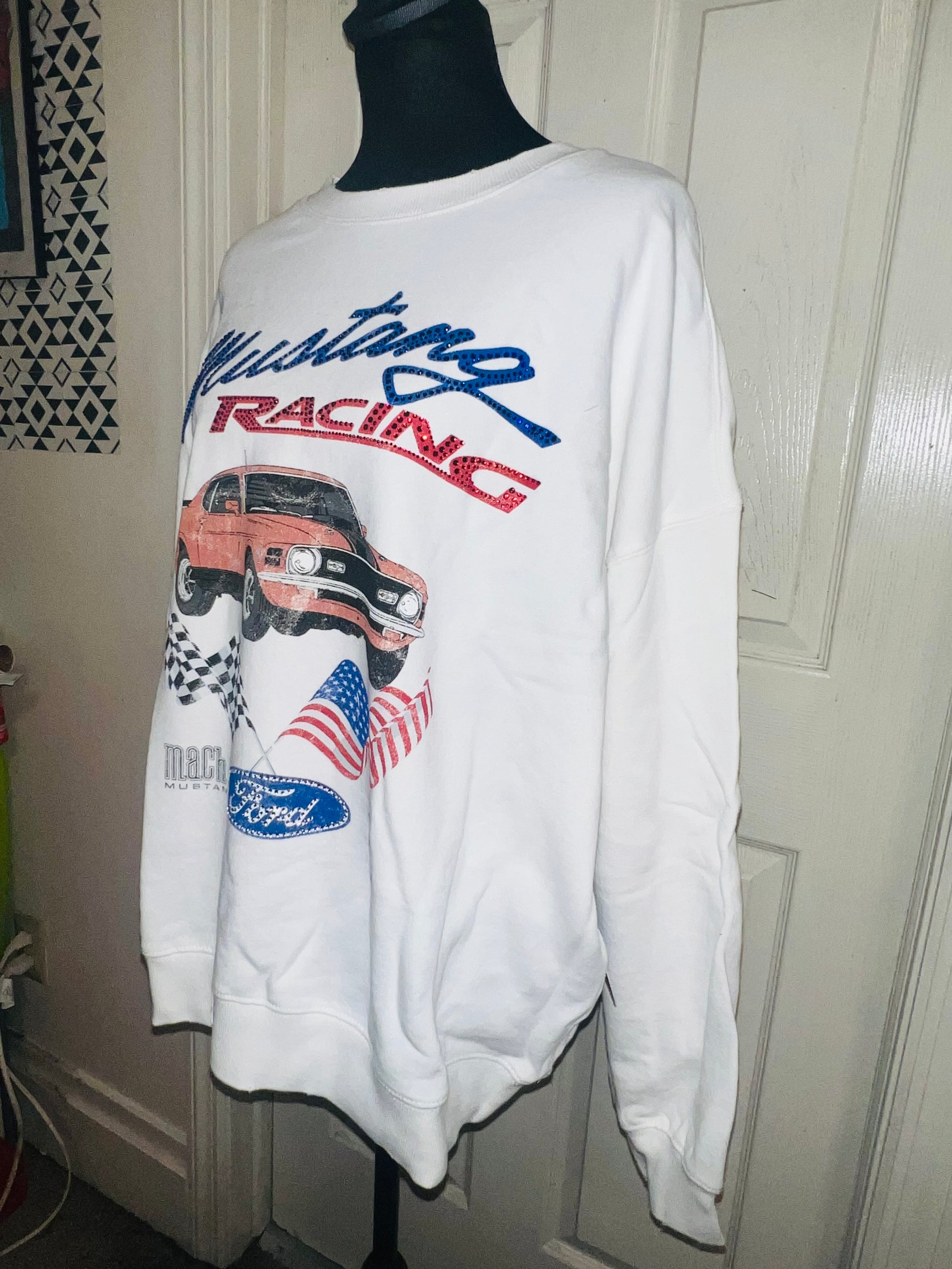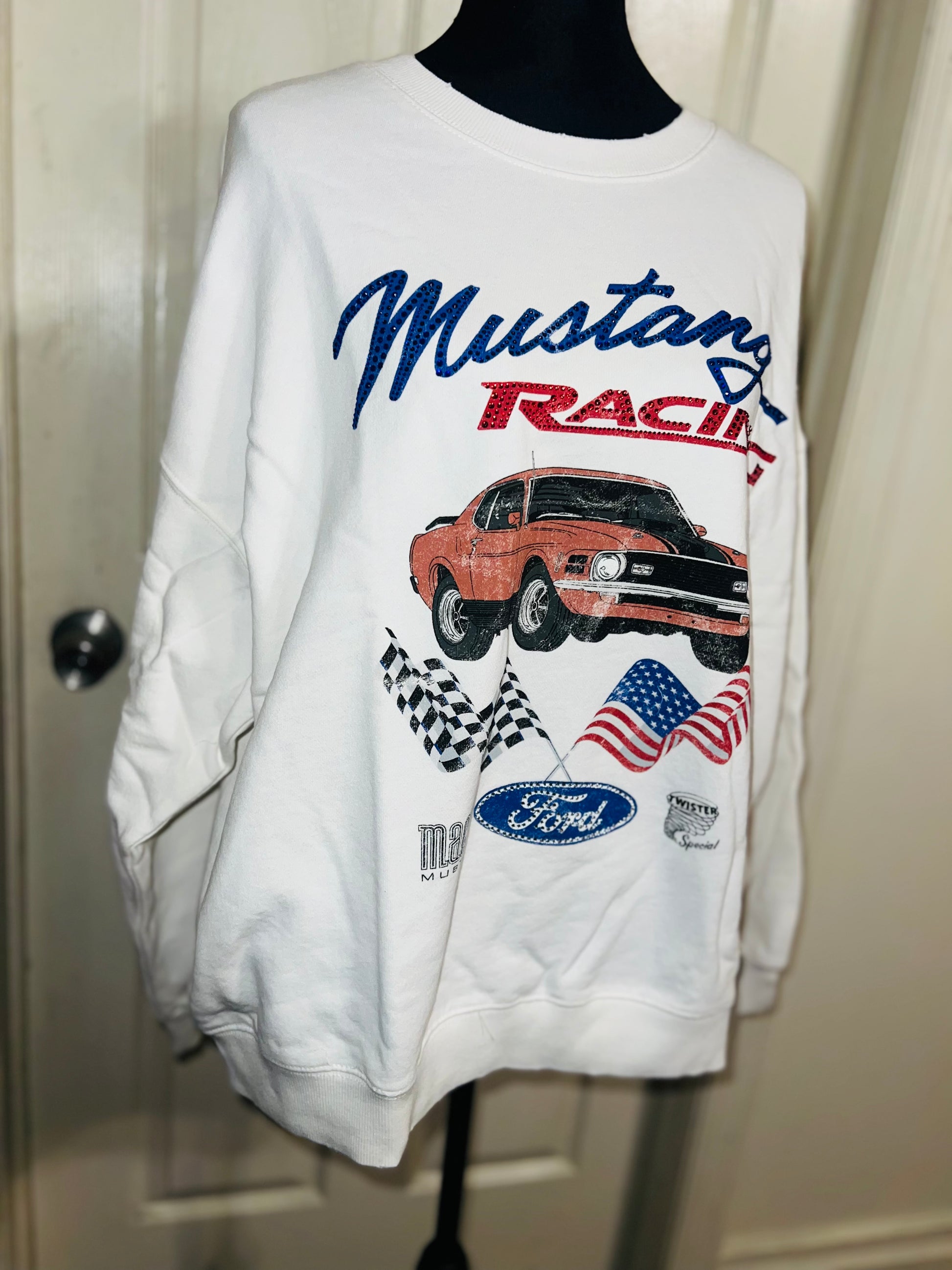 A white Ford Mustang oversized sweatshirt with very small gems around the small Ford symbol at the bottom. Super comfortable and so cute. Size XL, oversized.