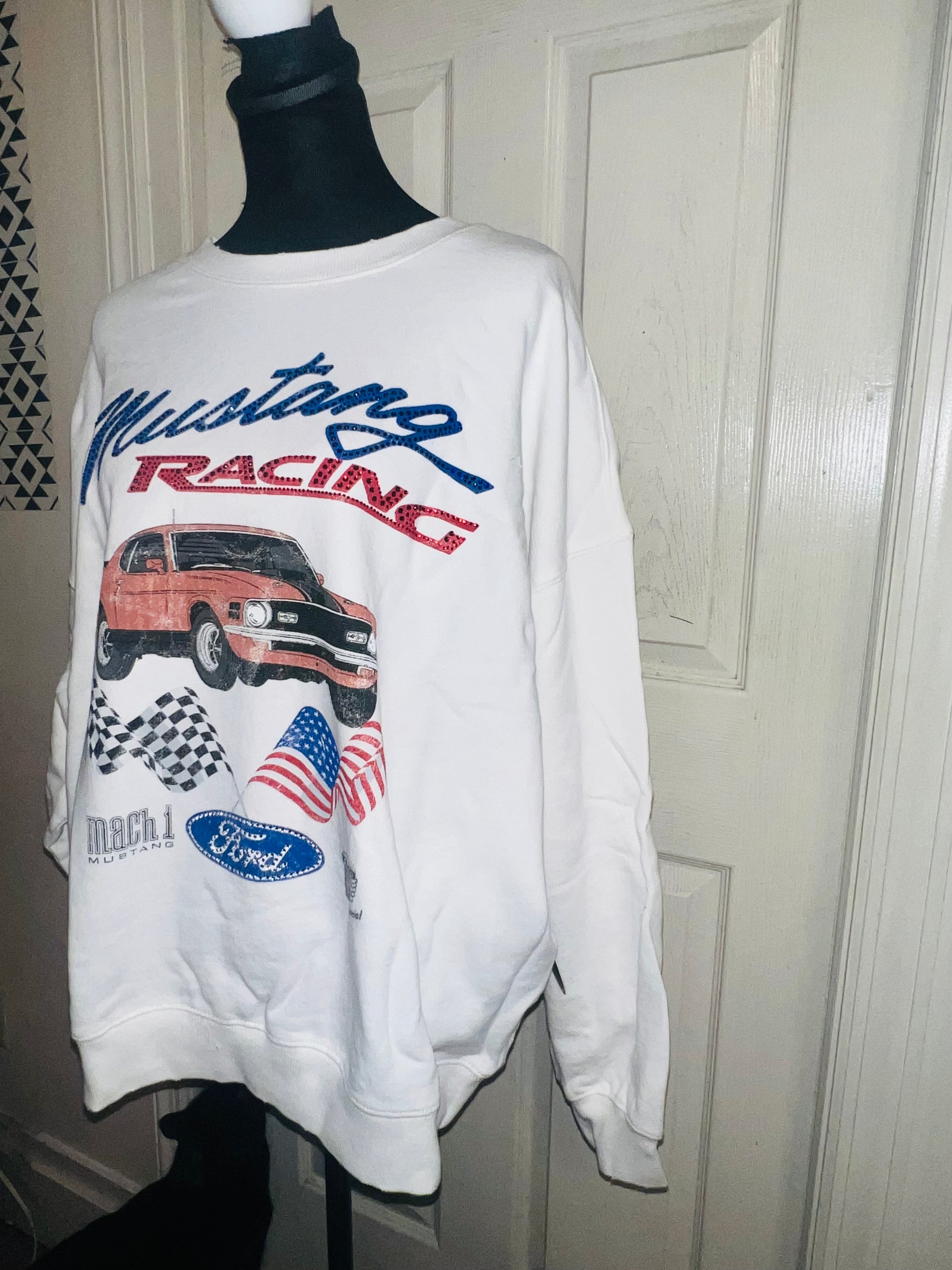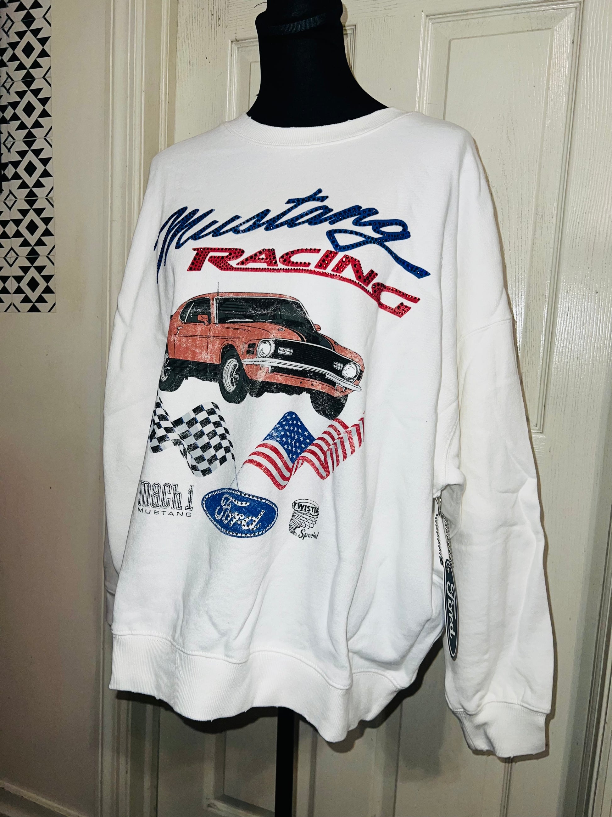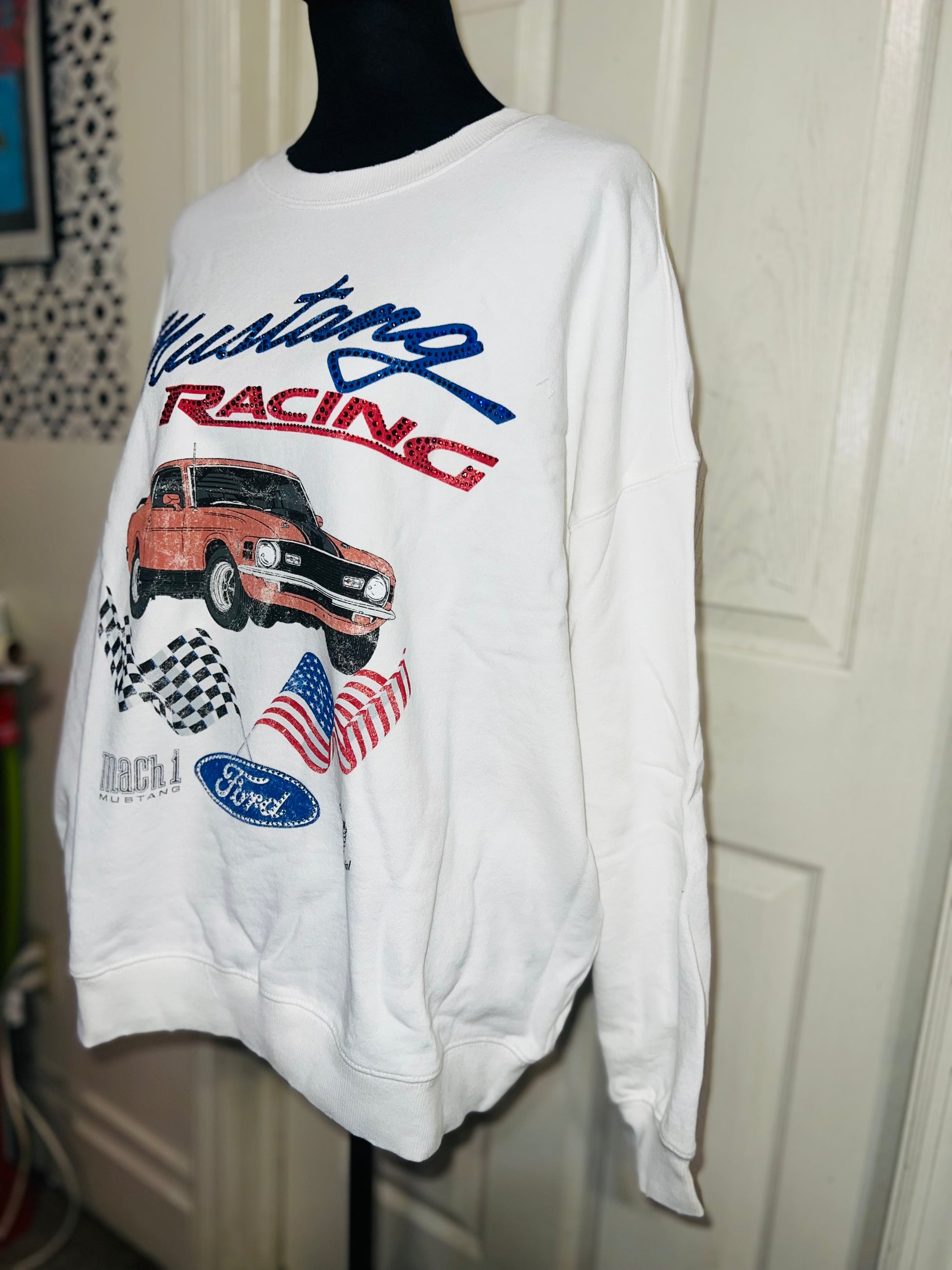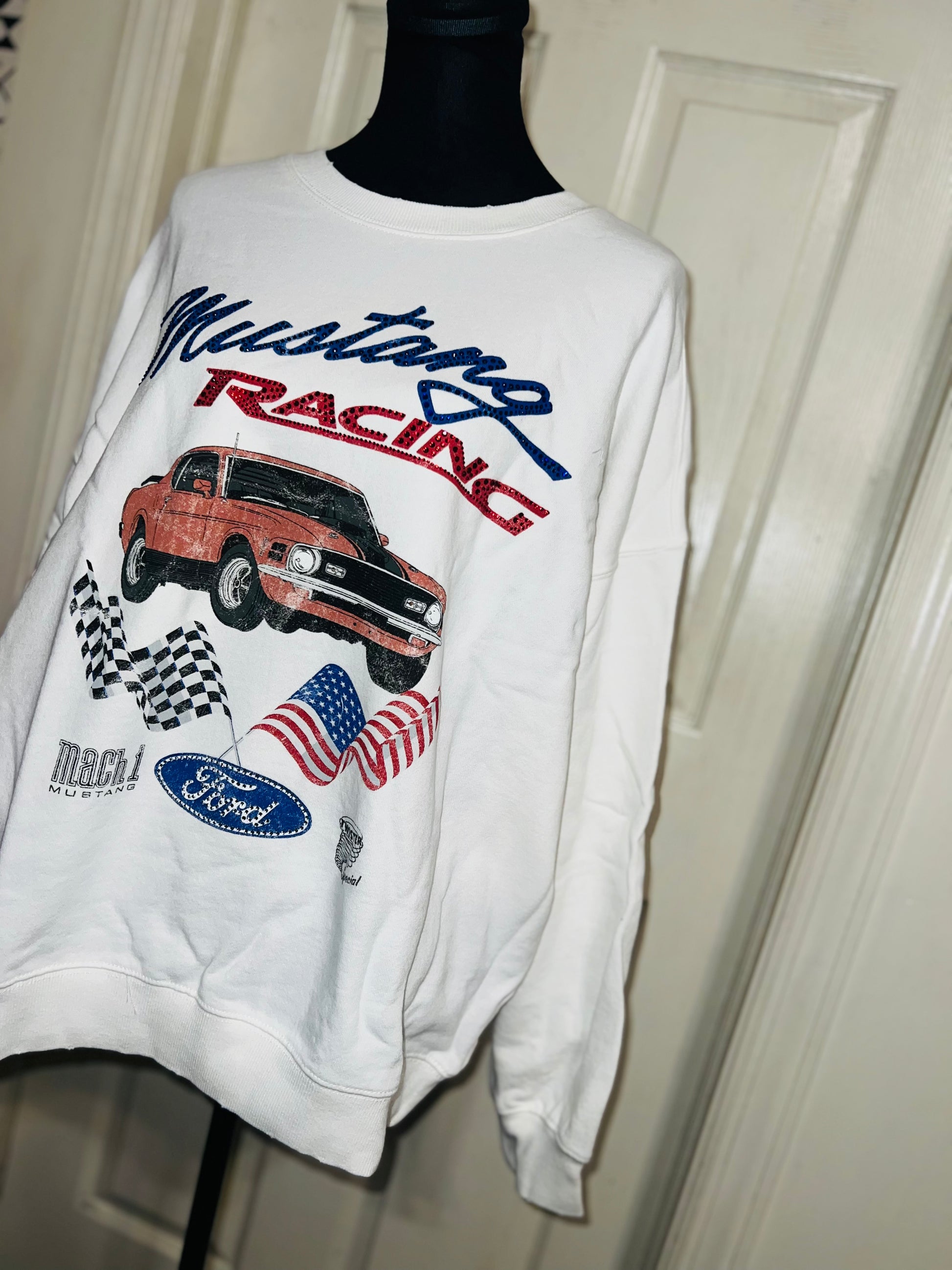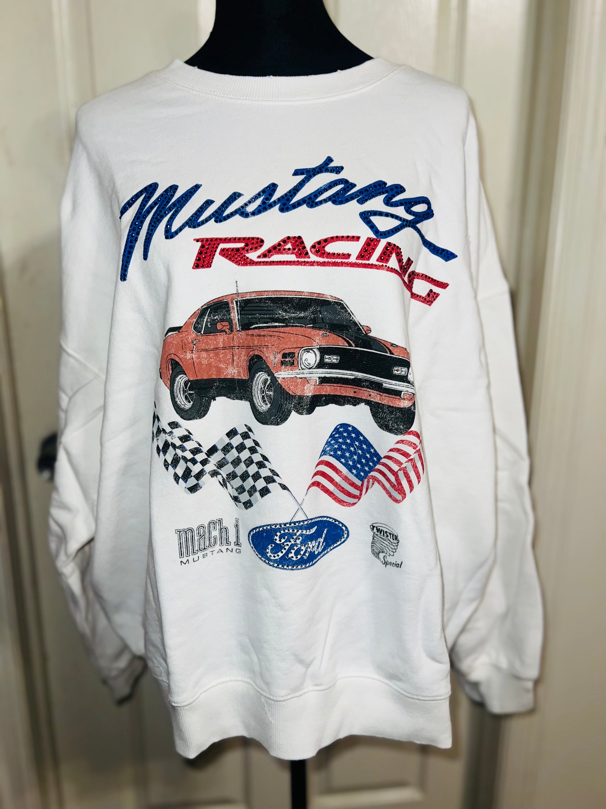 A white Ford Mustang oversized sweatshirt with very small gems around the small Ford symbol at the bottom. Super comfortable and so cute. Size XL, oversized.