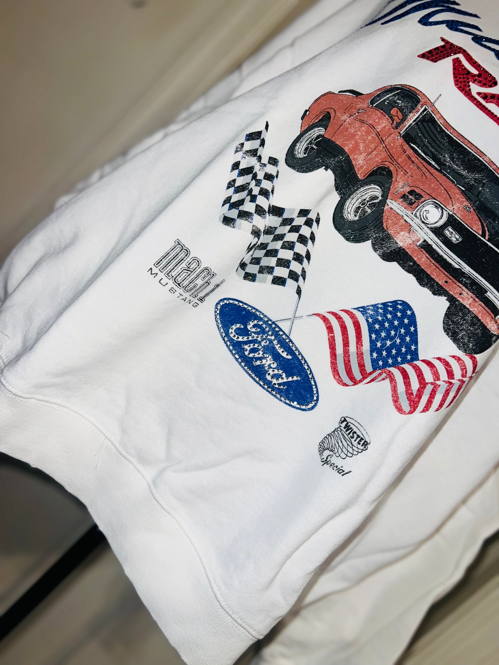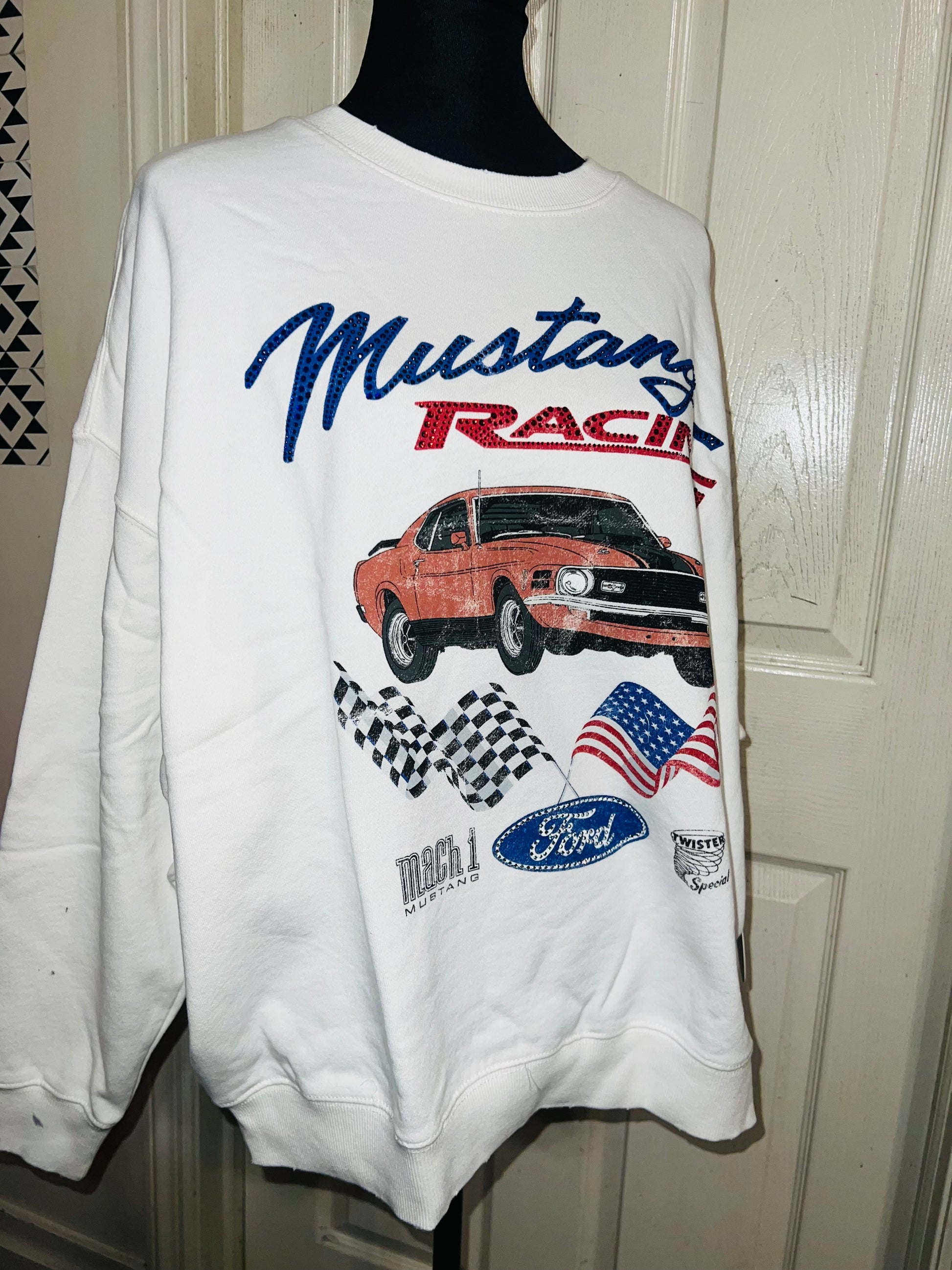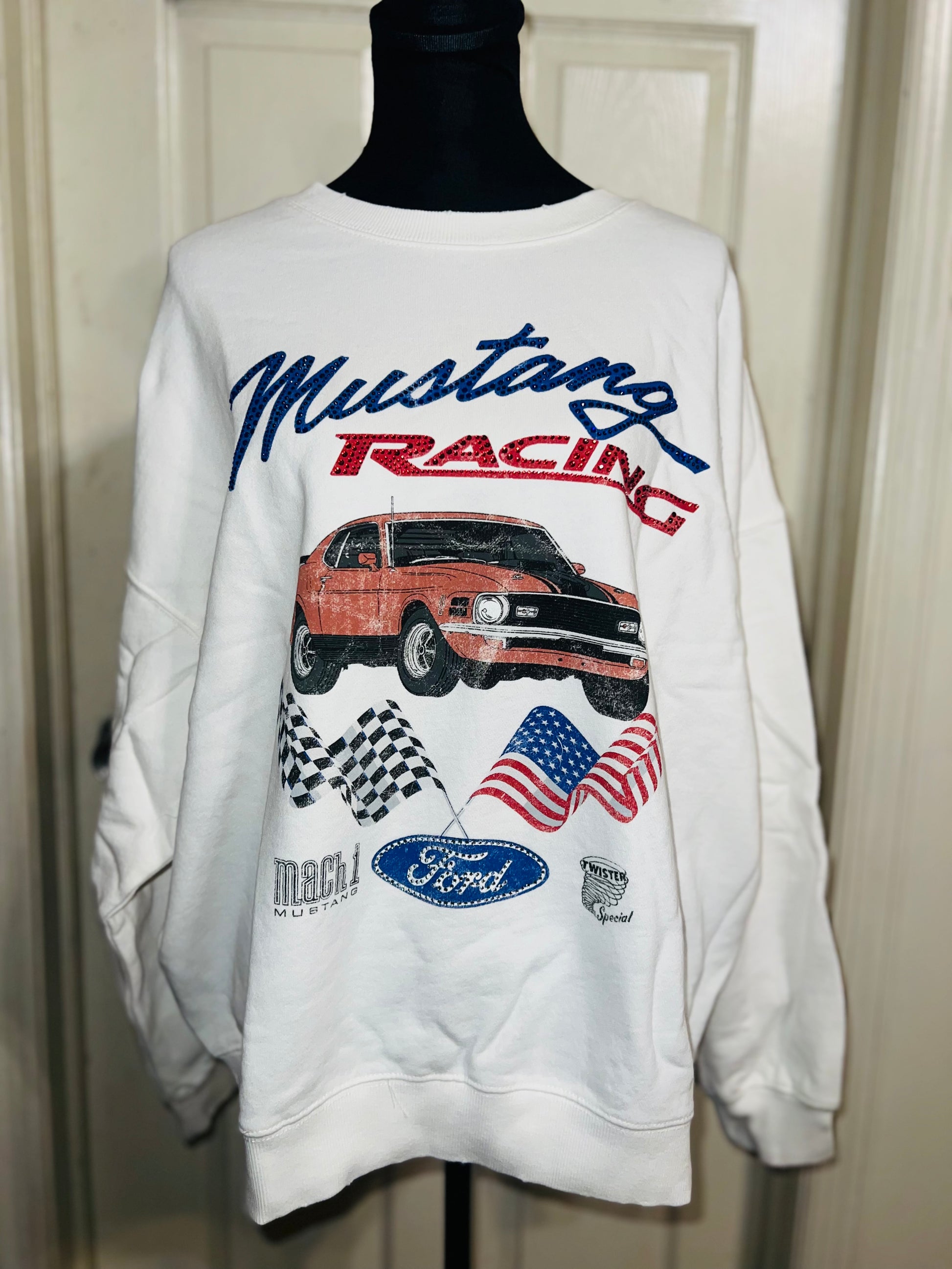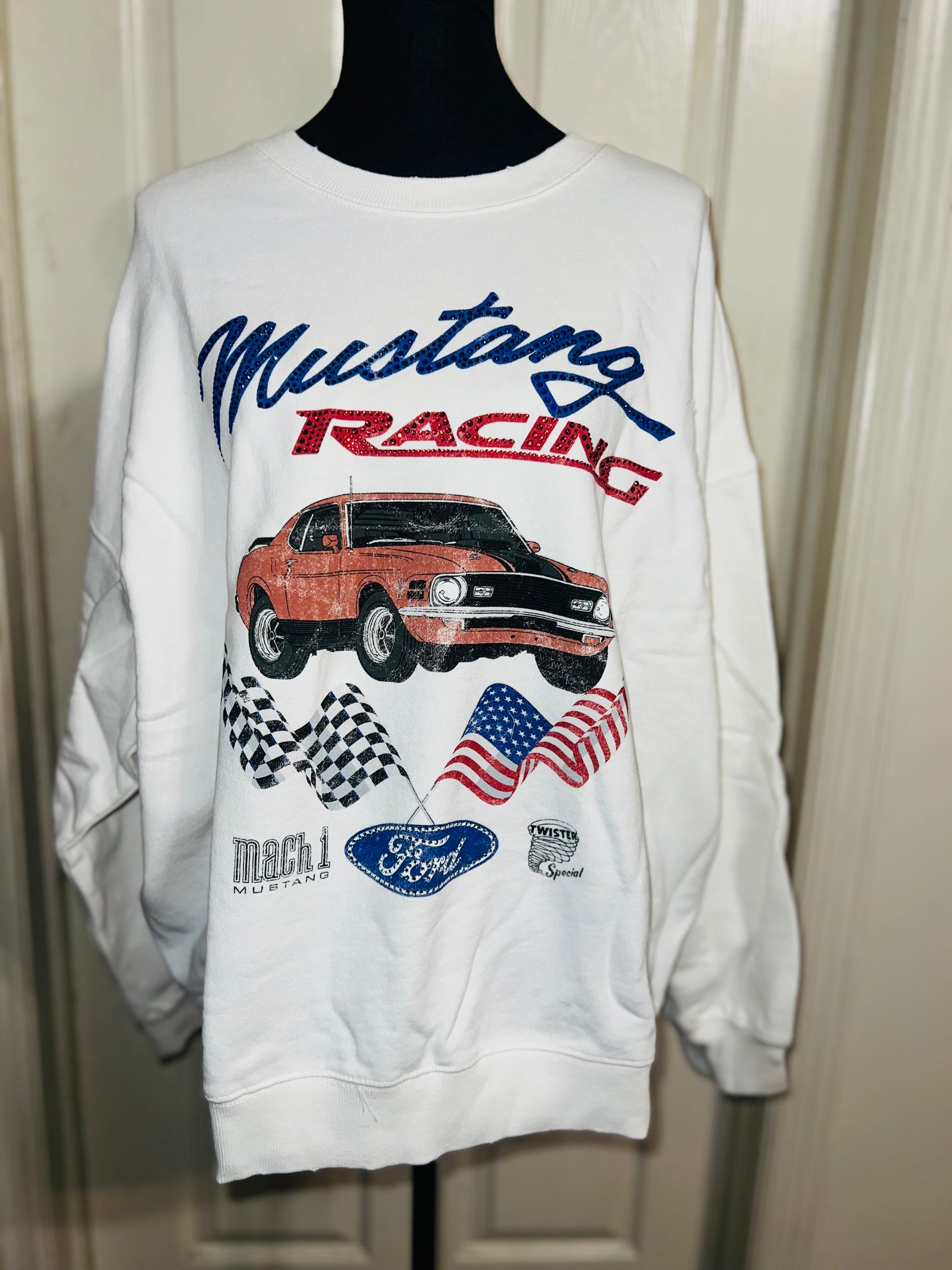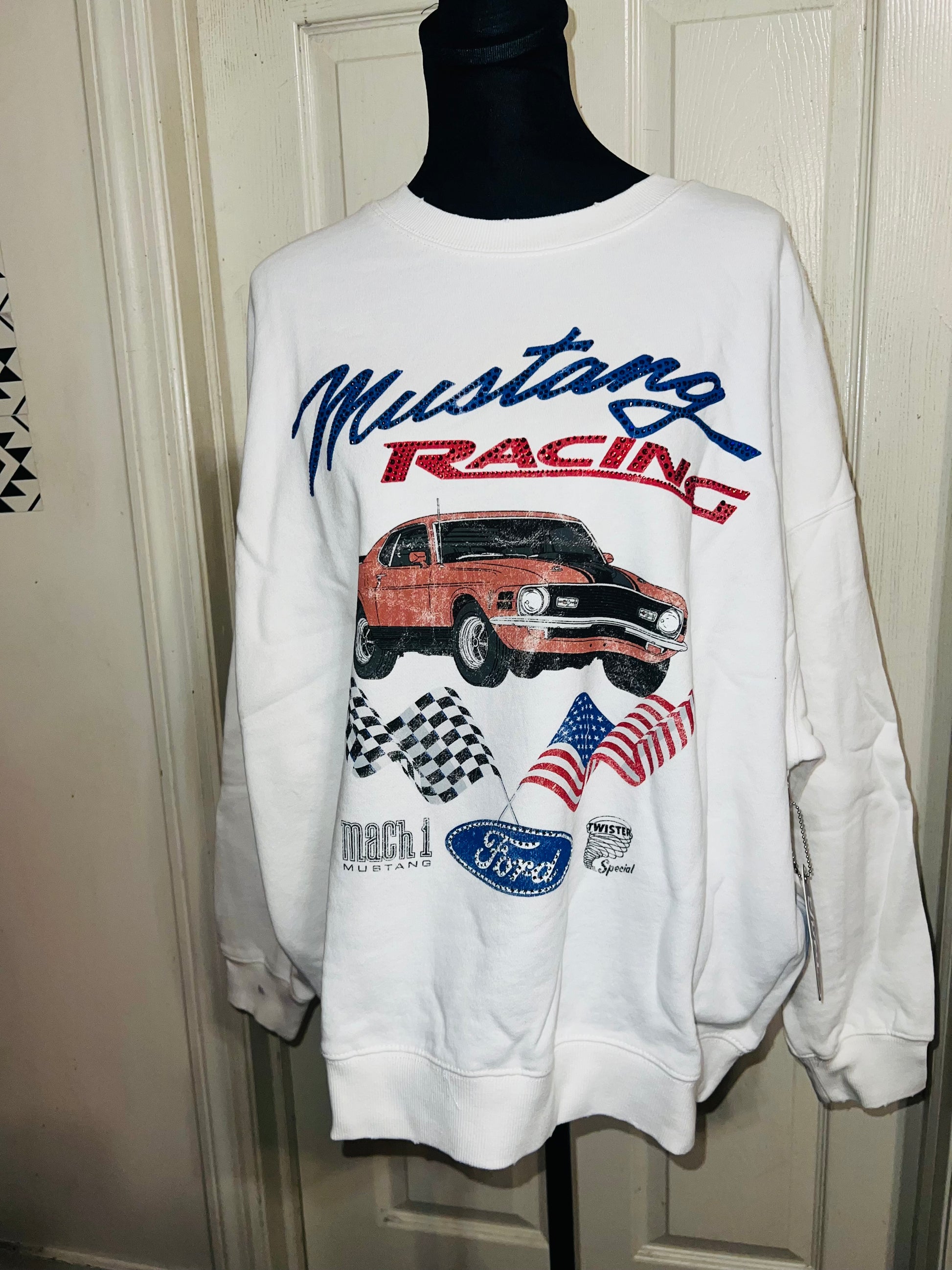 A white Ford Mustang oversized sweatshirt with very small gems around the small Ford symbol at the bottom. Super comfortable and so cute. Size XL, oversized.