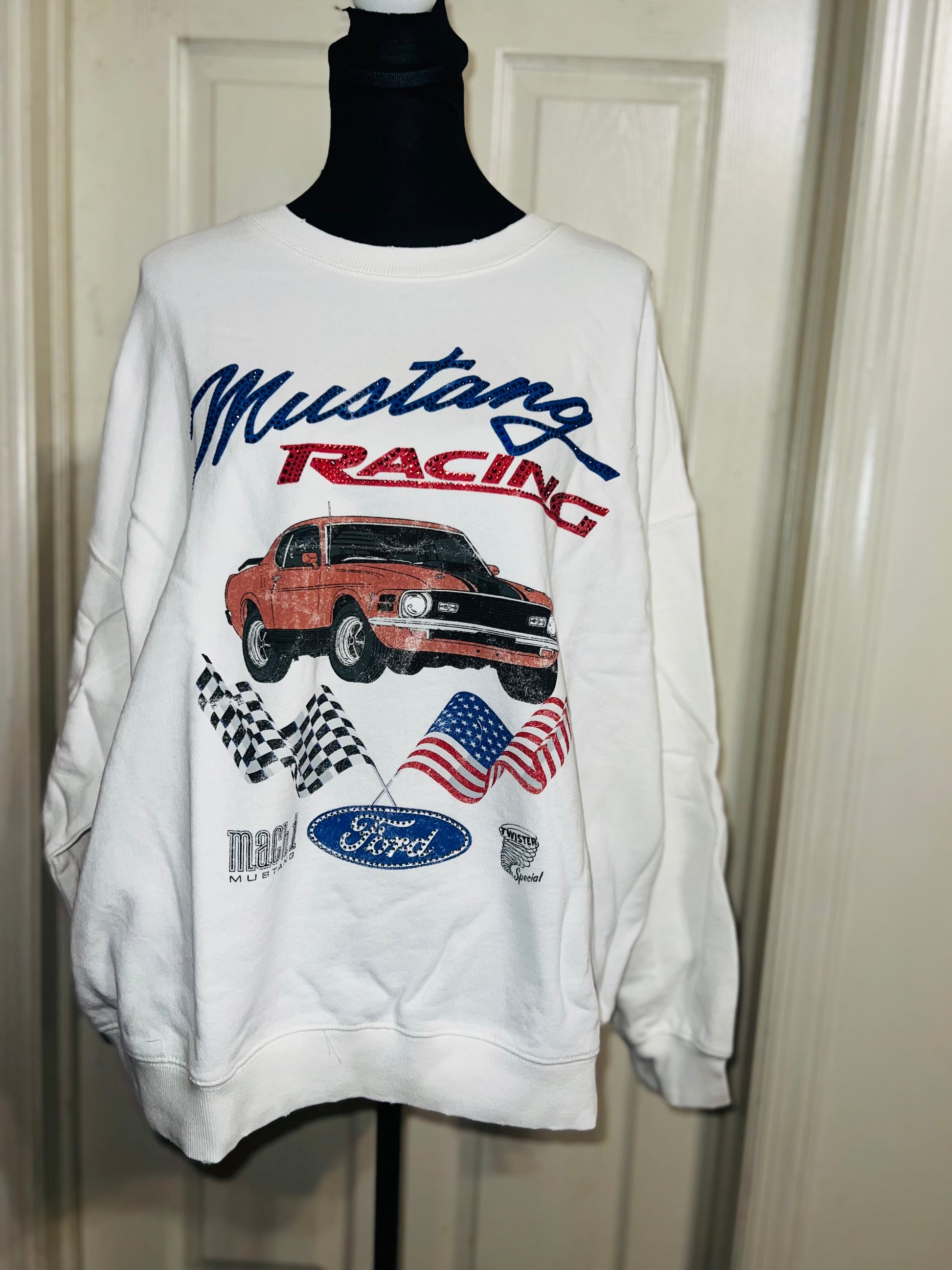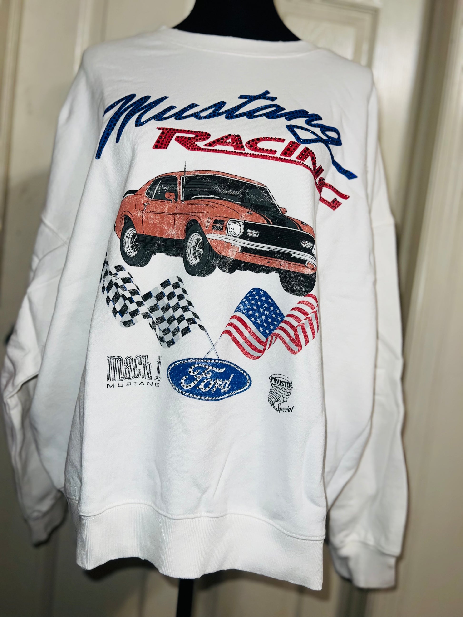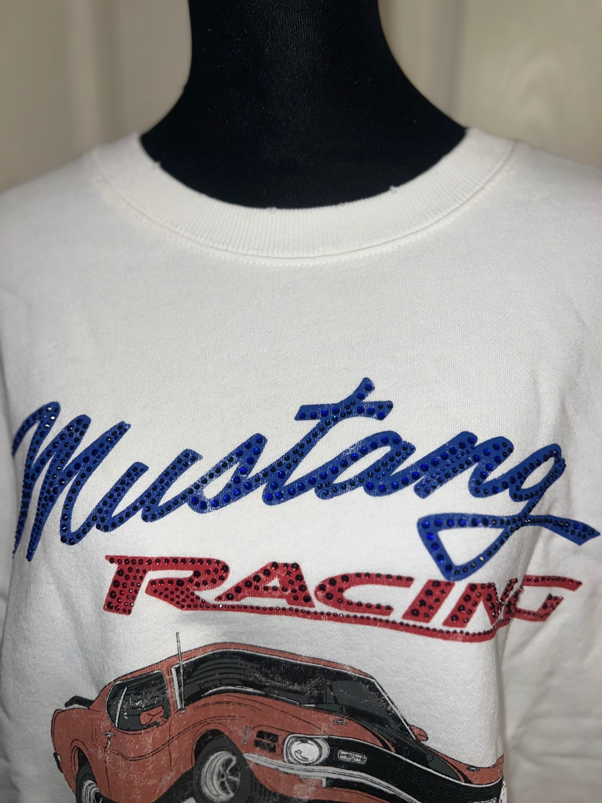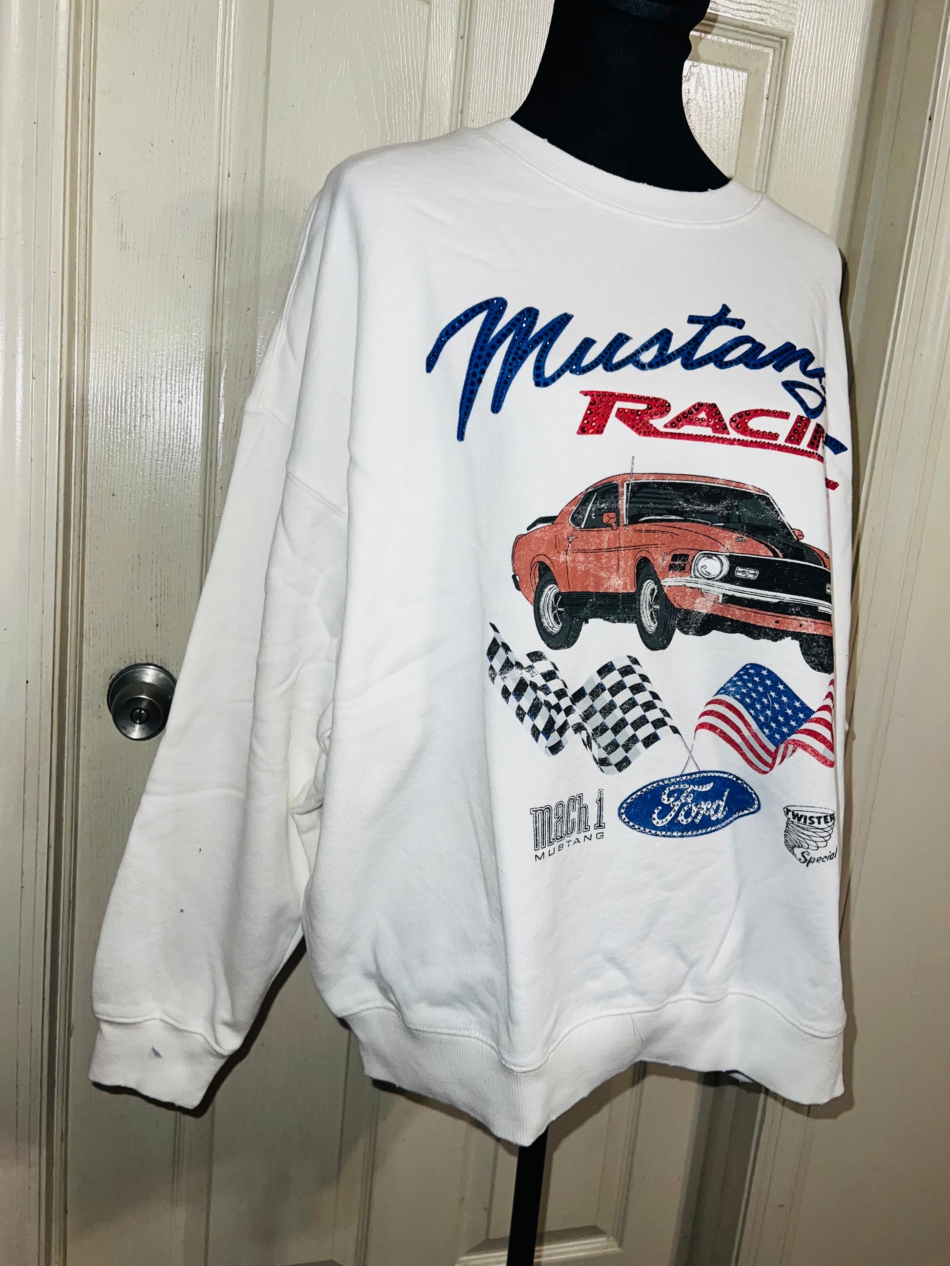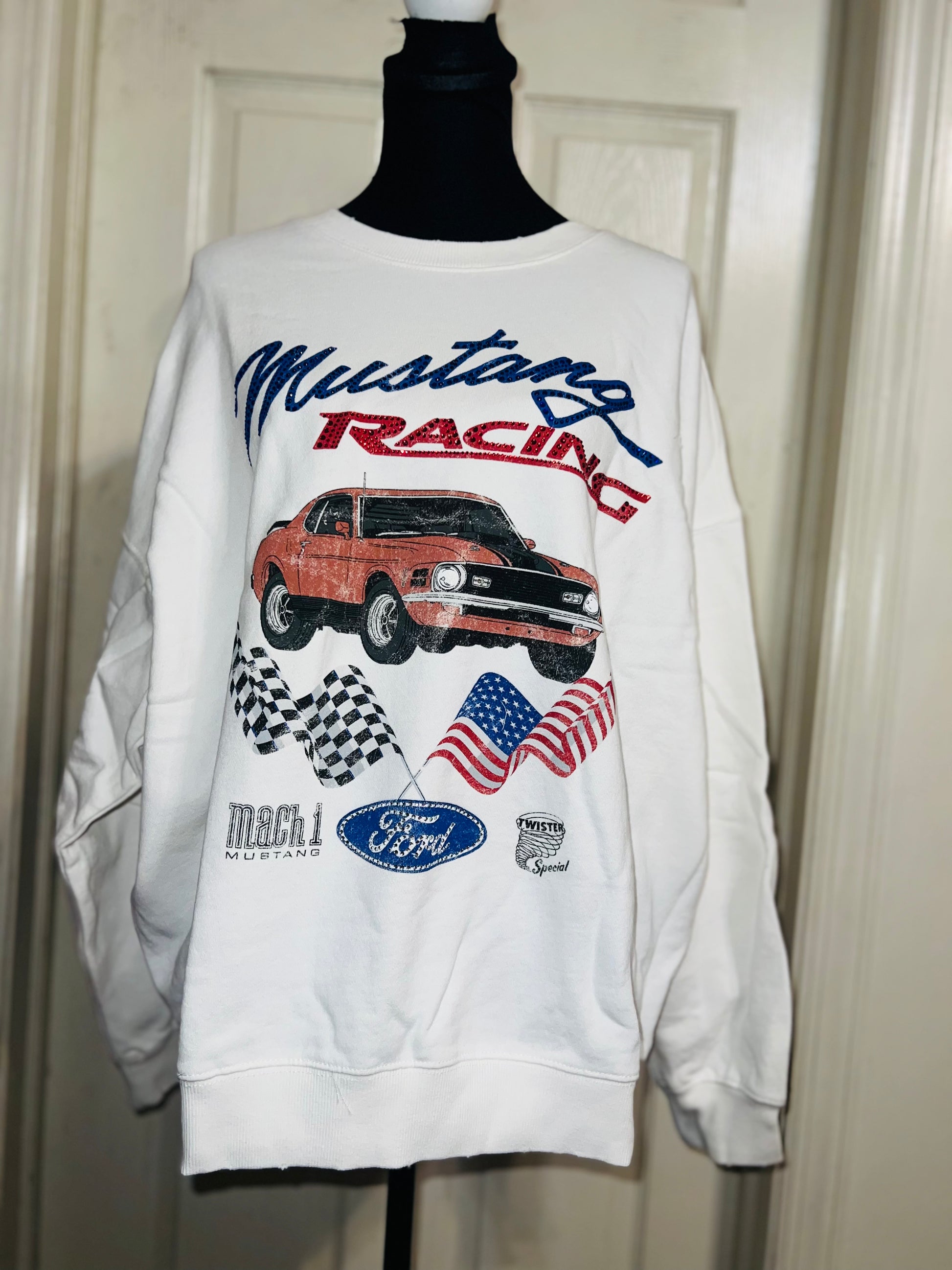 A white Ford Mustang oversized sweatshirt with very small gems around the small Ford symbol at the bottom. Super comfortable and so cute. Size XL, oversized.