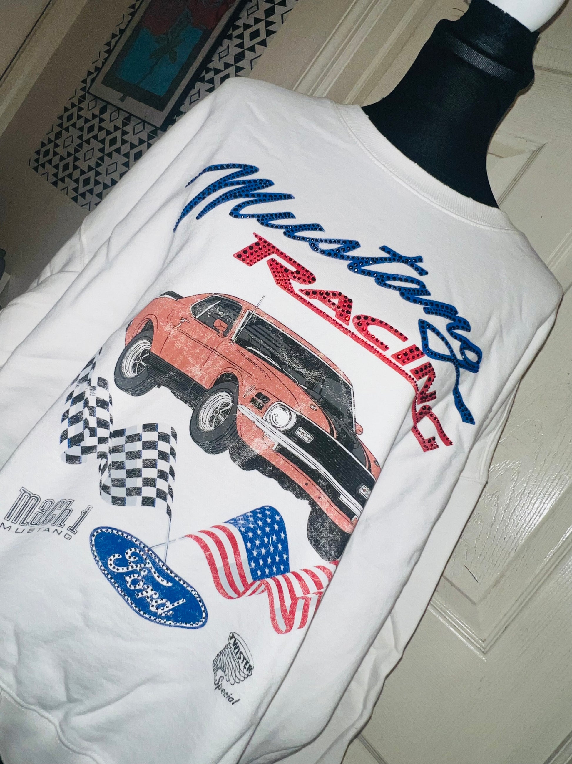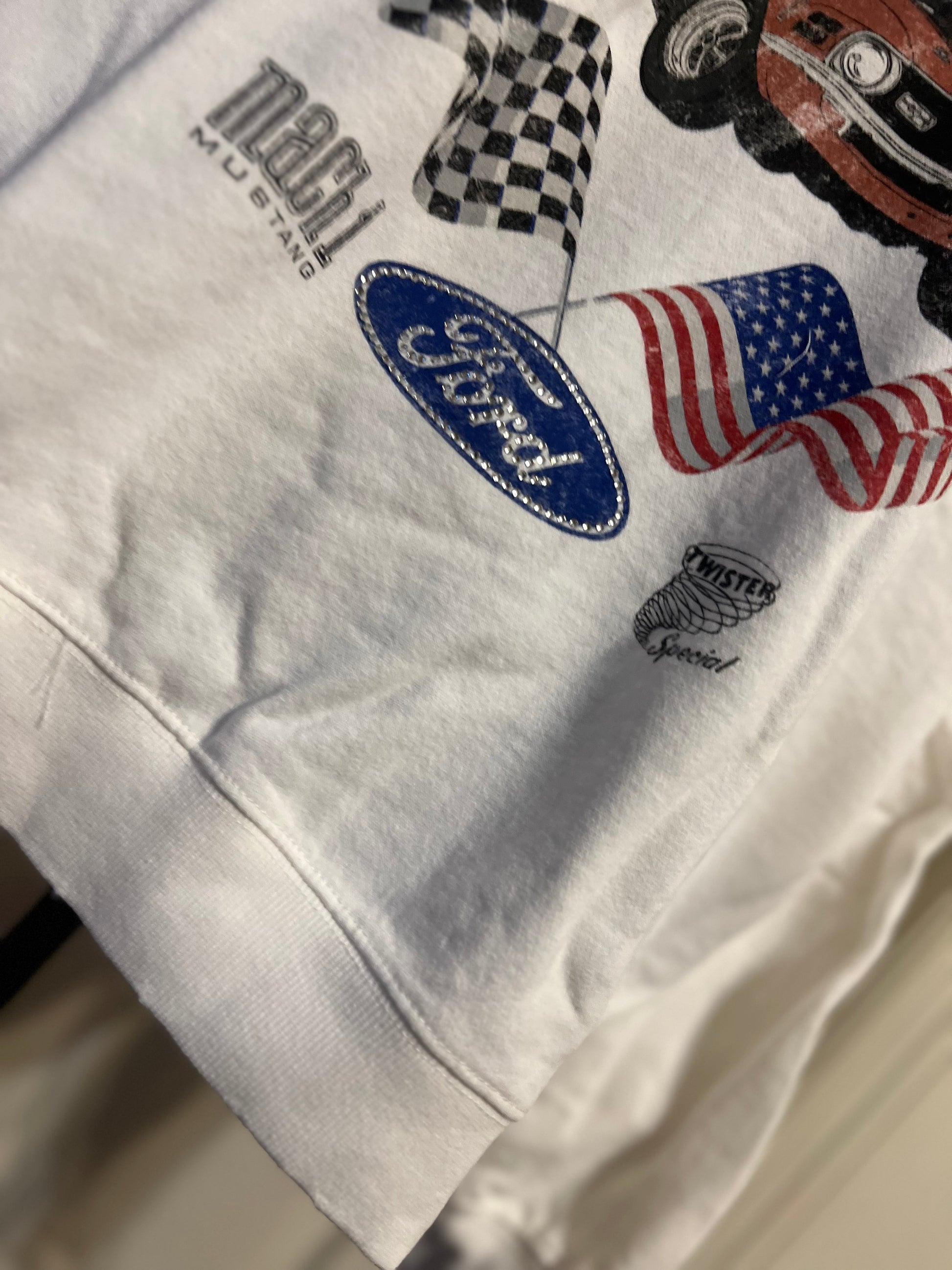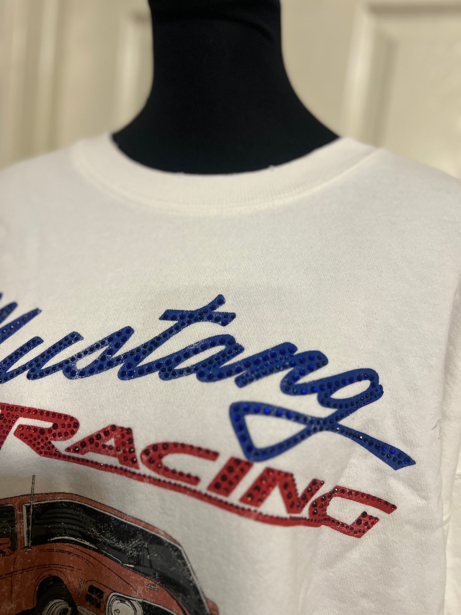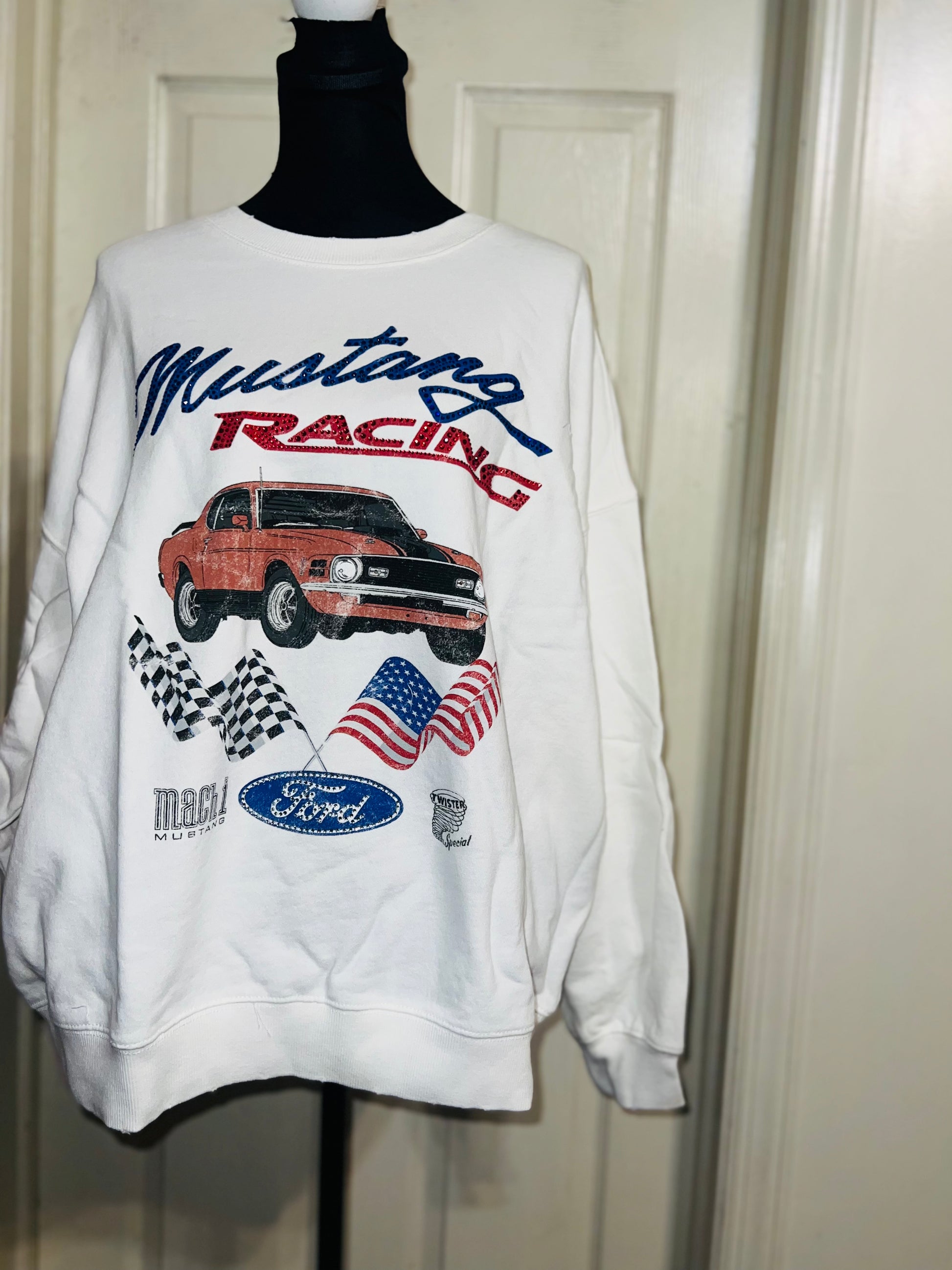 A white Ford Mustang oversized sweatshirt with very small gems around the small Ford symbol at the bottom. Super comfortable and so cute. Size XL, oversized.