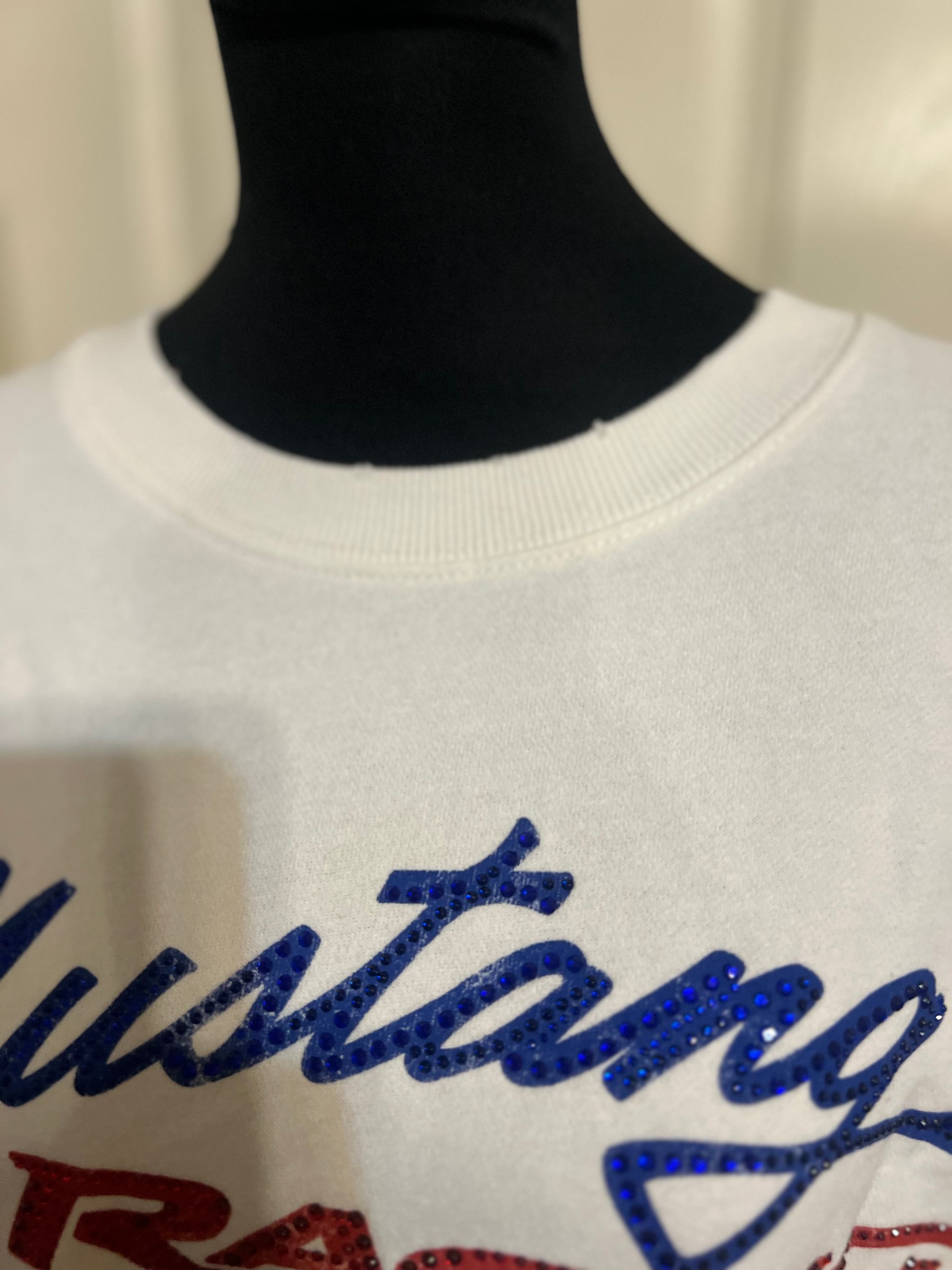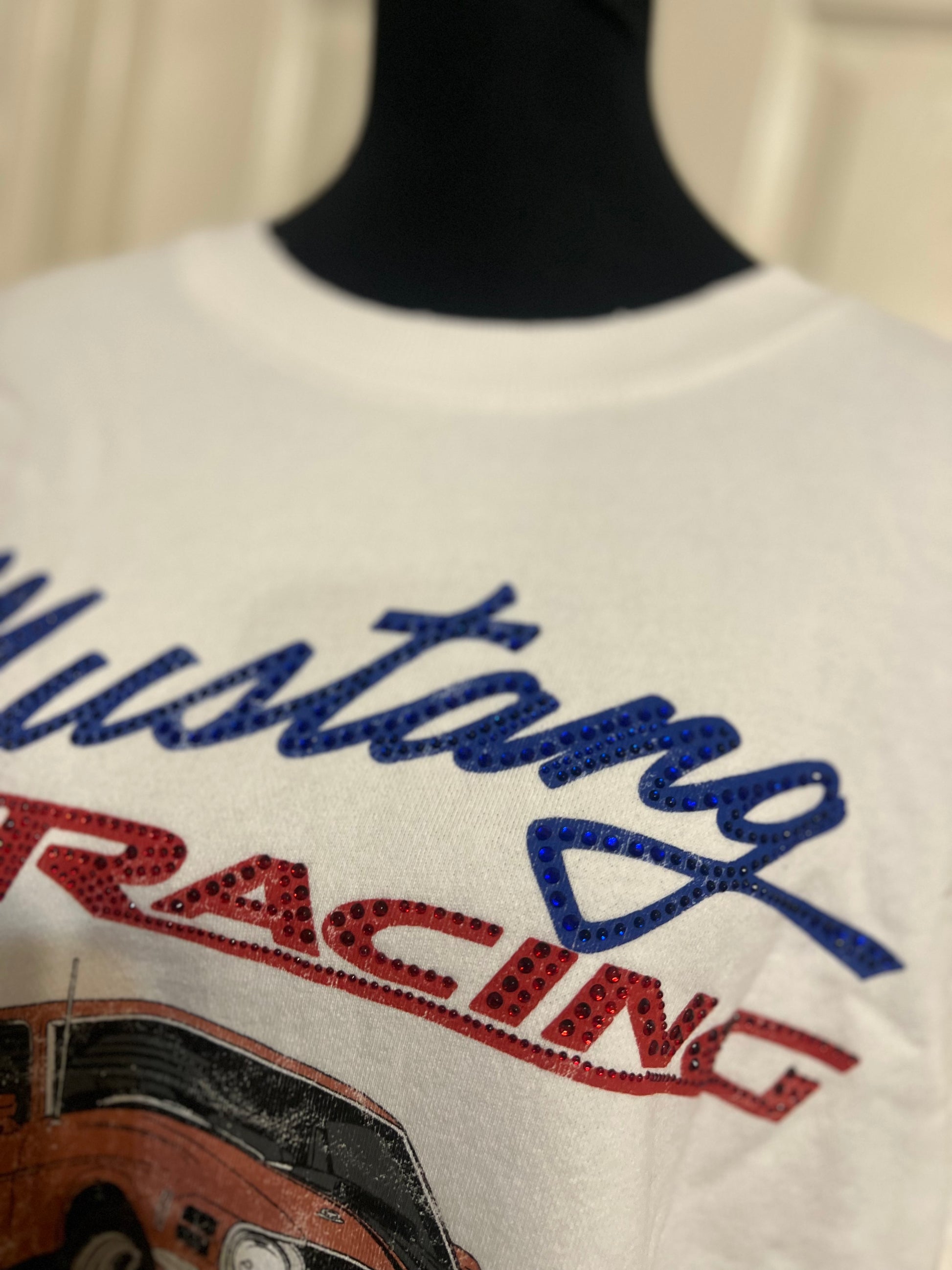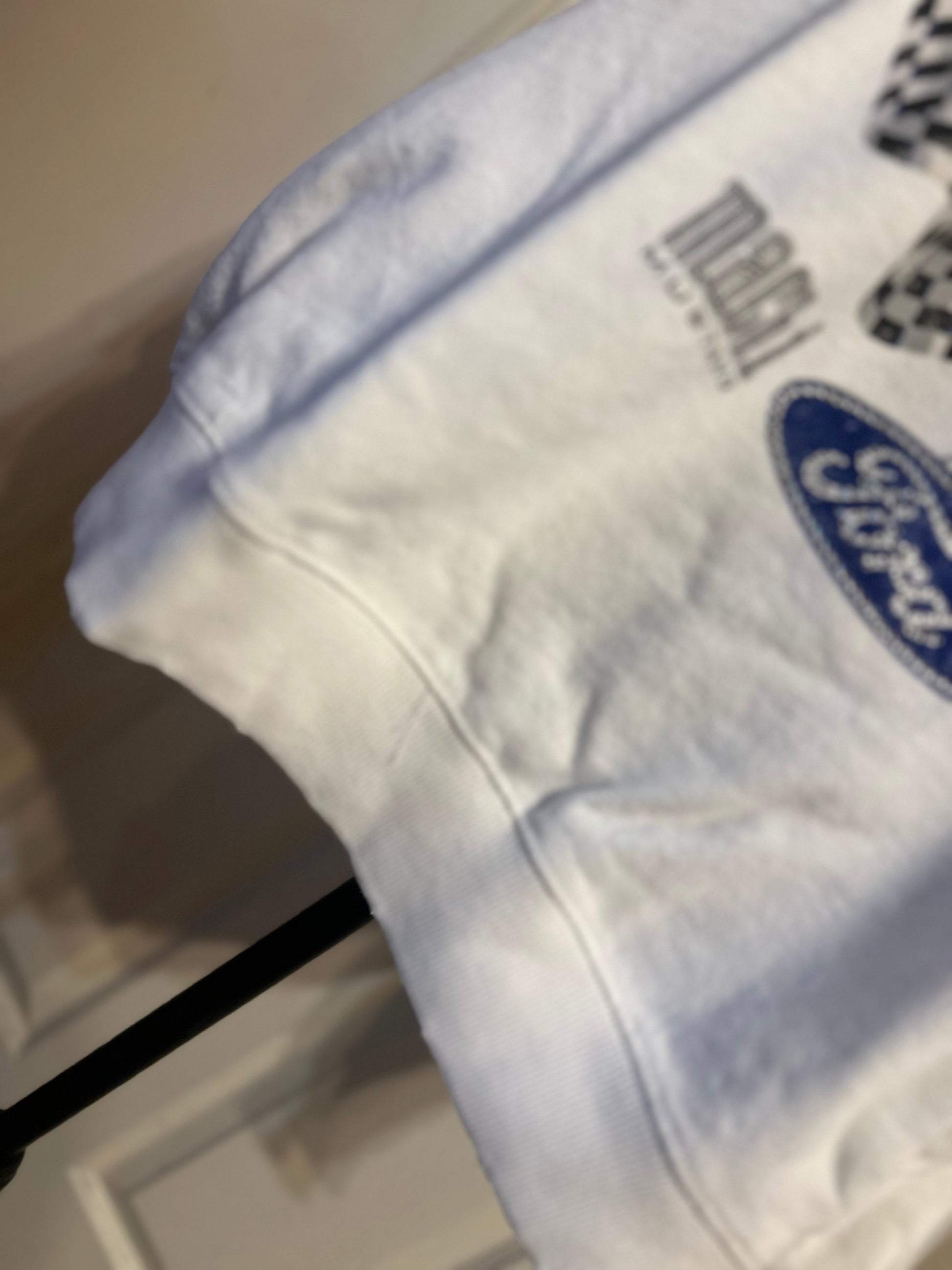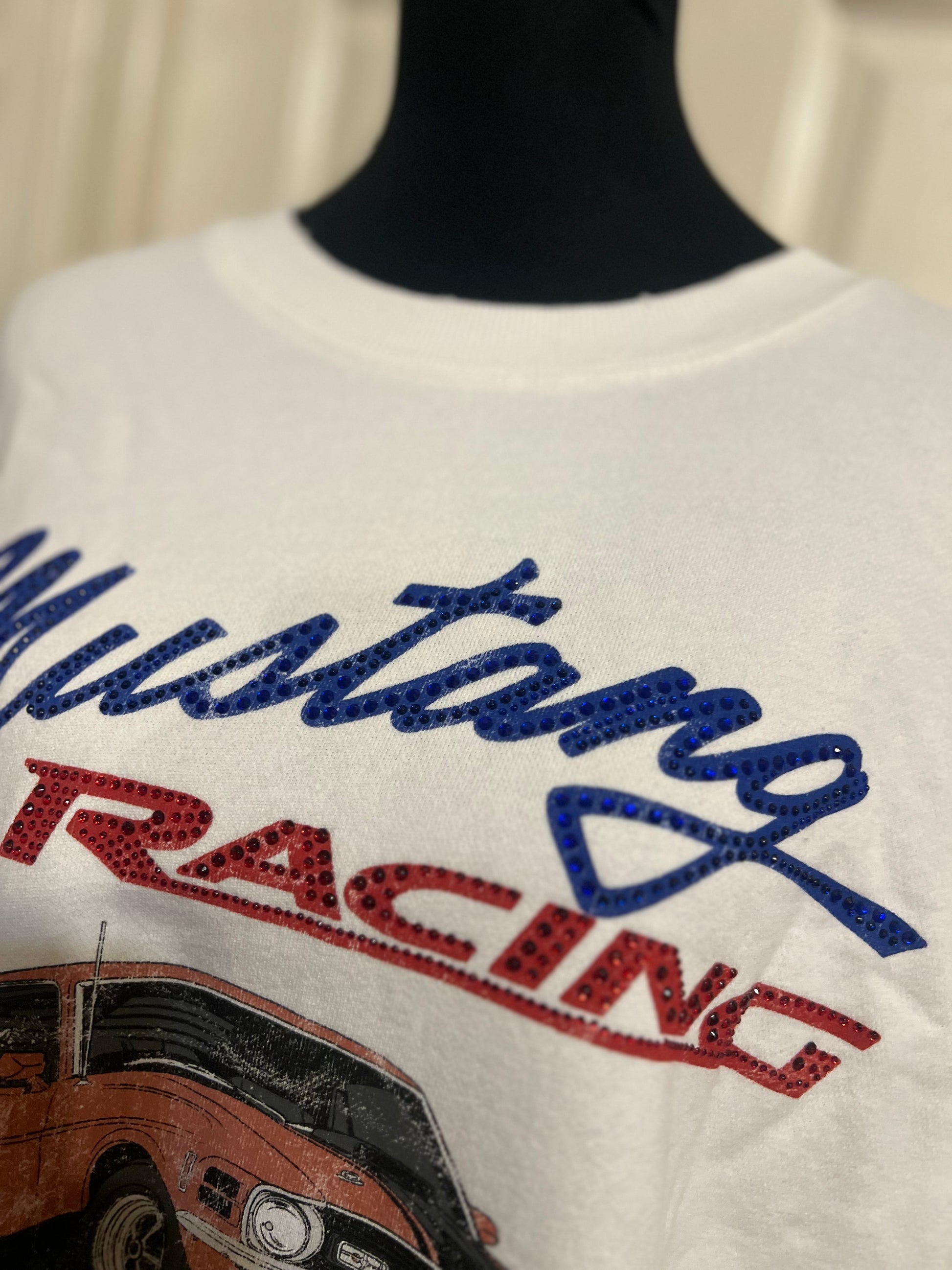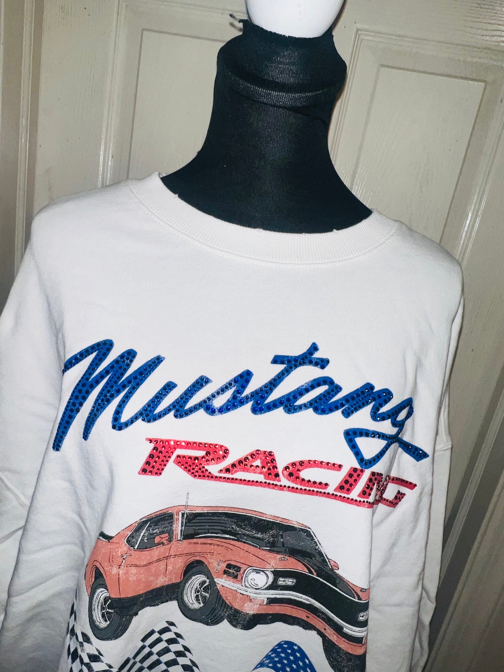 A white Ford Mustang oversized sweatshirt with very small gems around the small Ford symbol at the bottom. Super comfortable and so cute. Size XL, oversized.