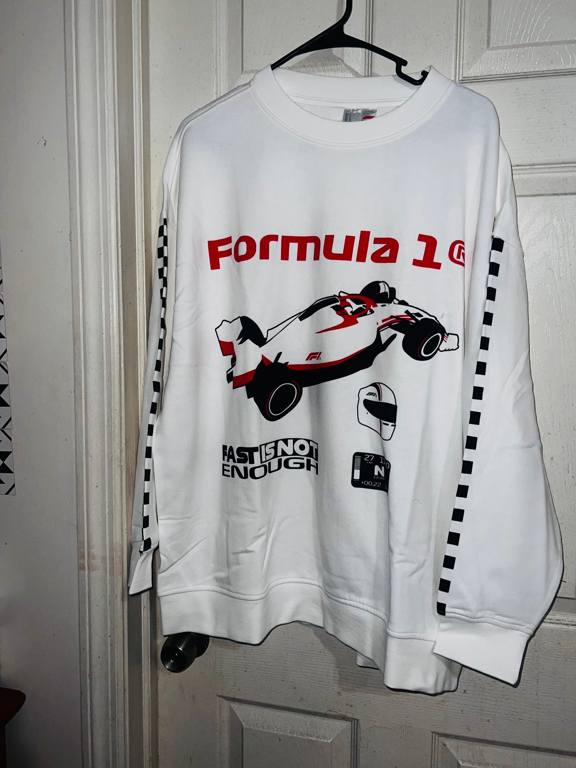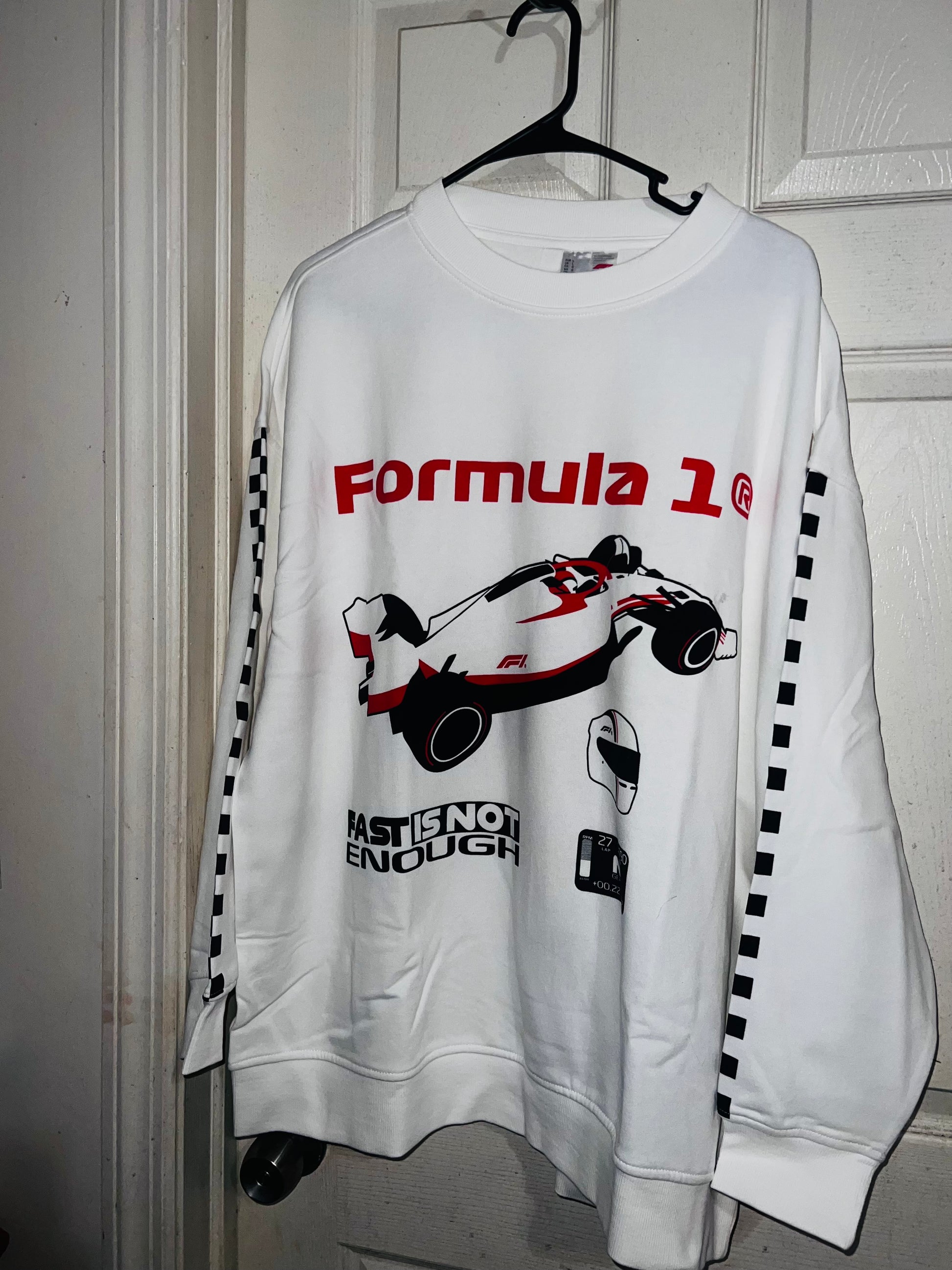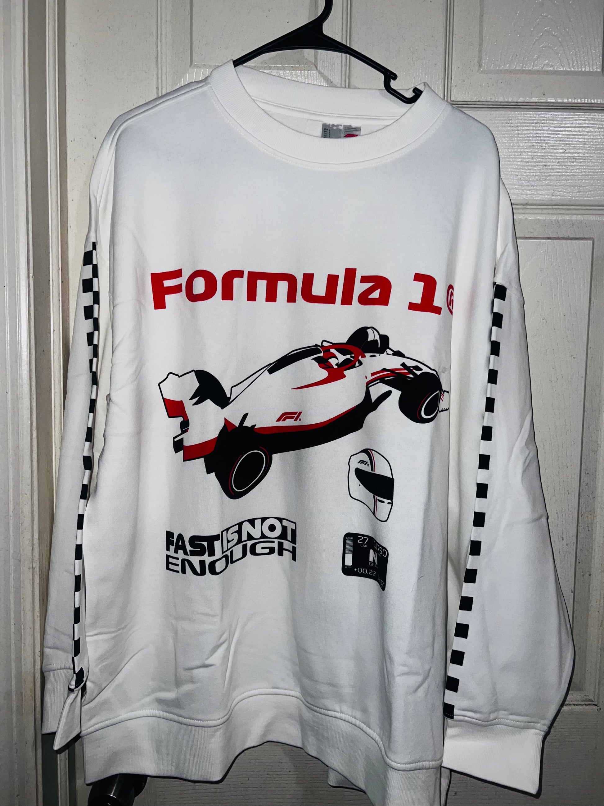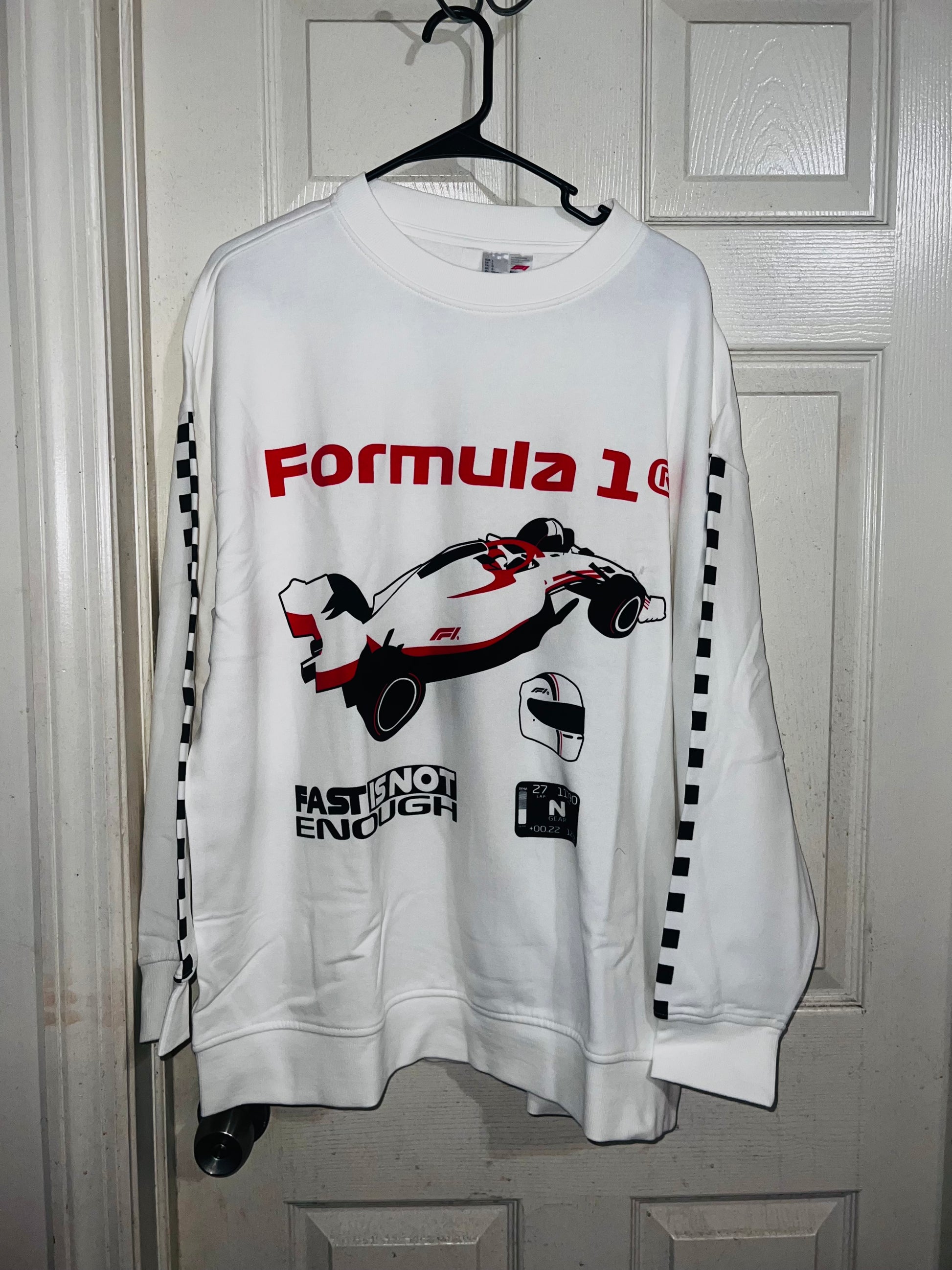 This is a preorder. Please allow extra processing time for shipping. A super cute white oversized Formula 1 racing sweatshirt with checkers down the sleeves. I kept one for myself, so comfortable, cute, and oversized! Size S/M.