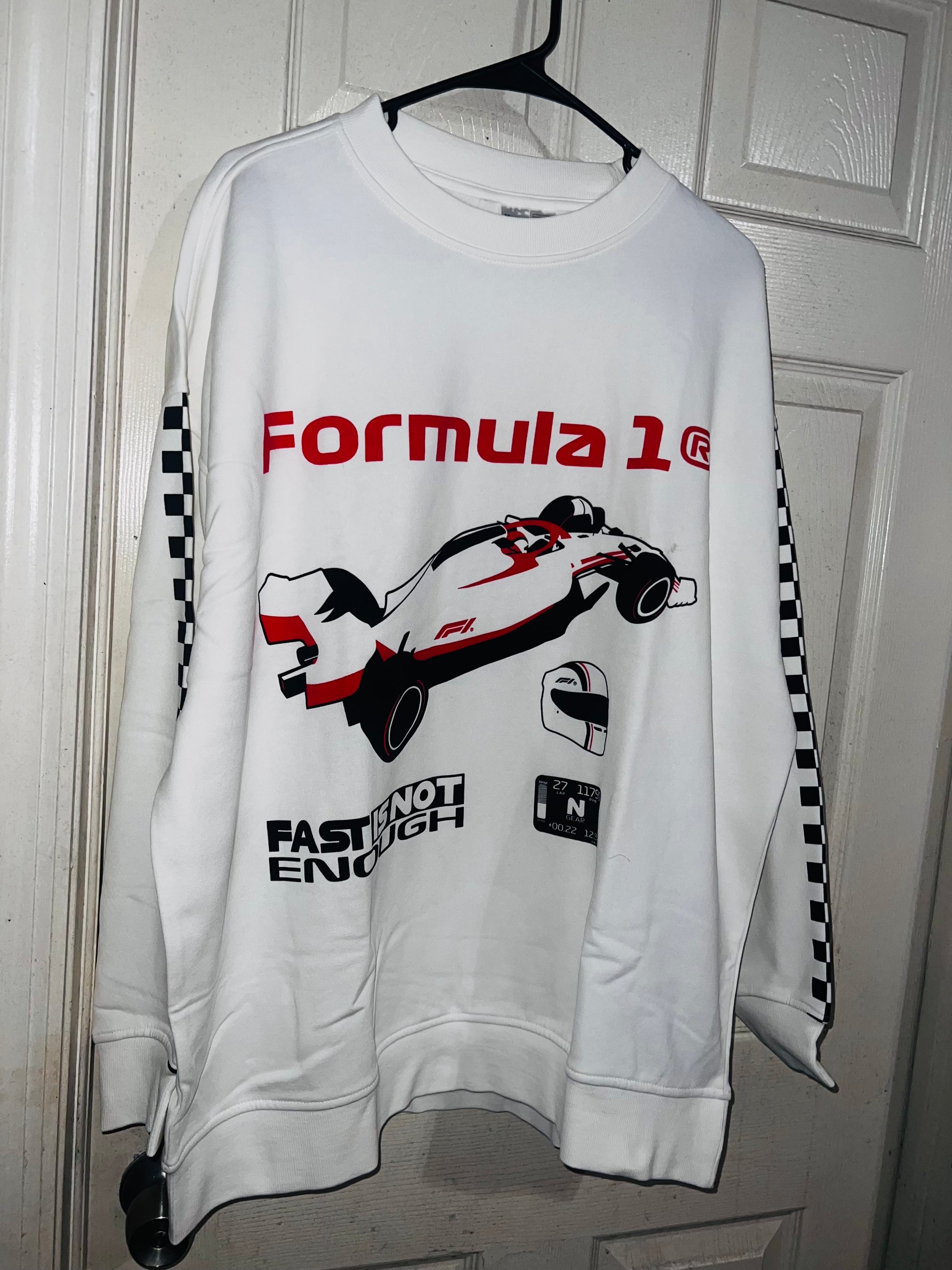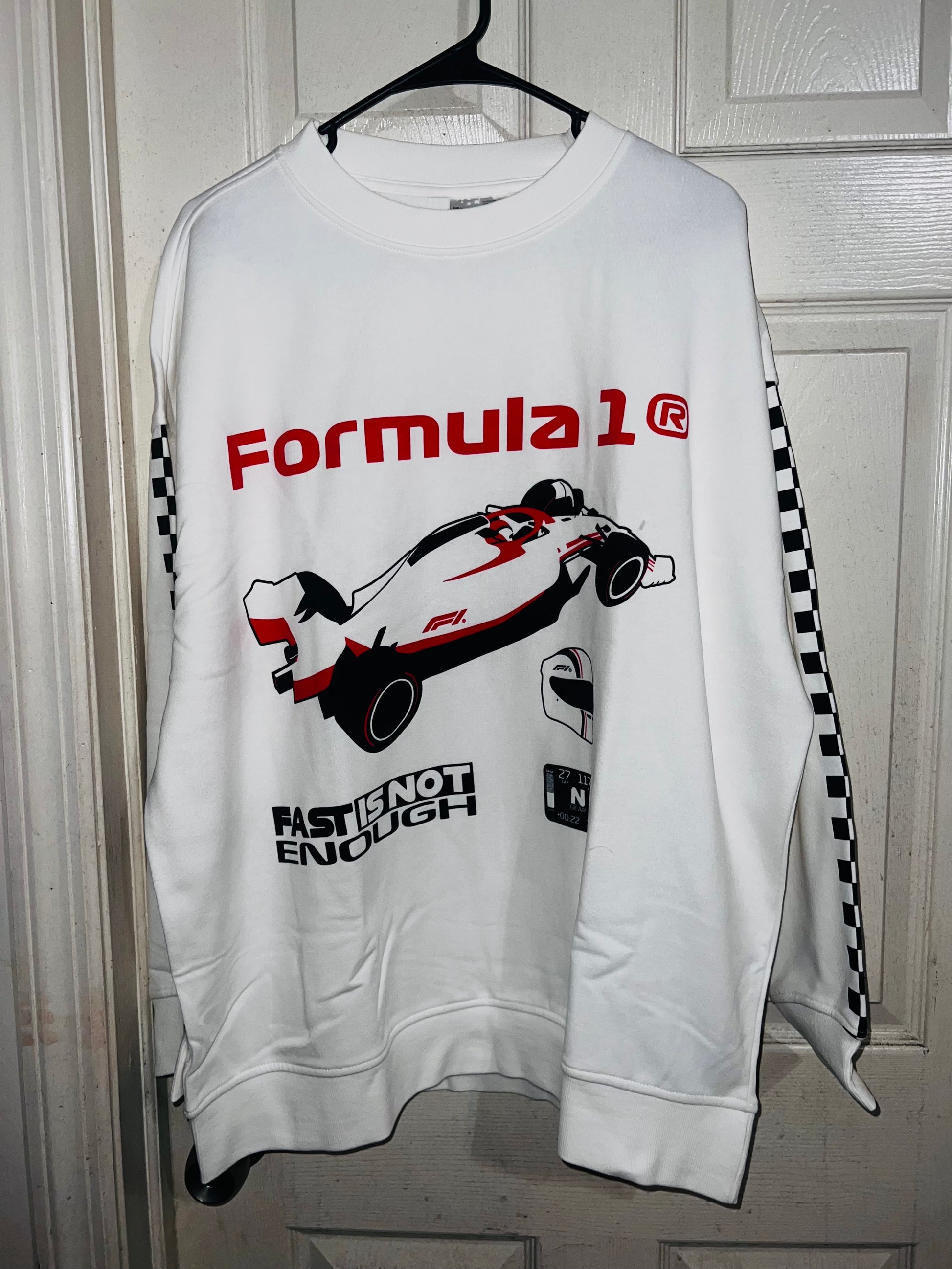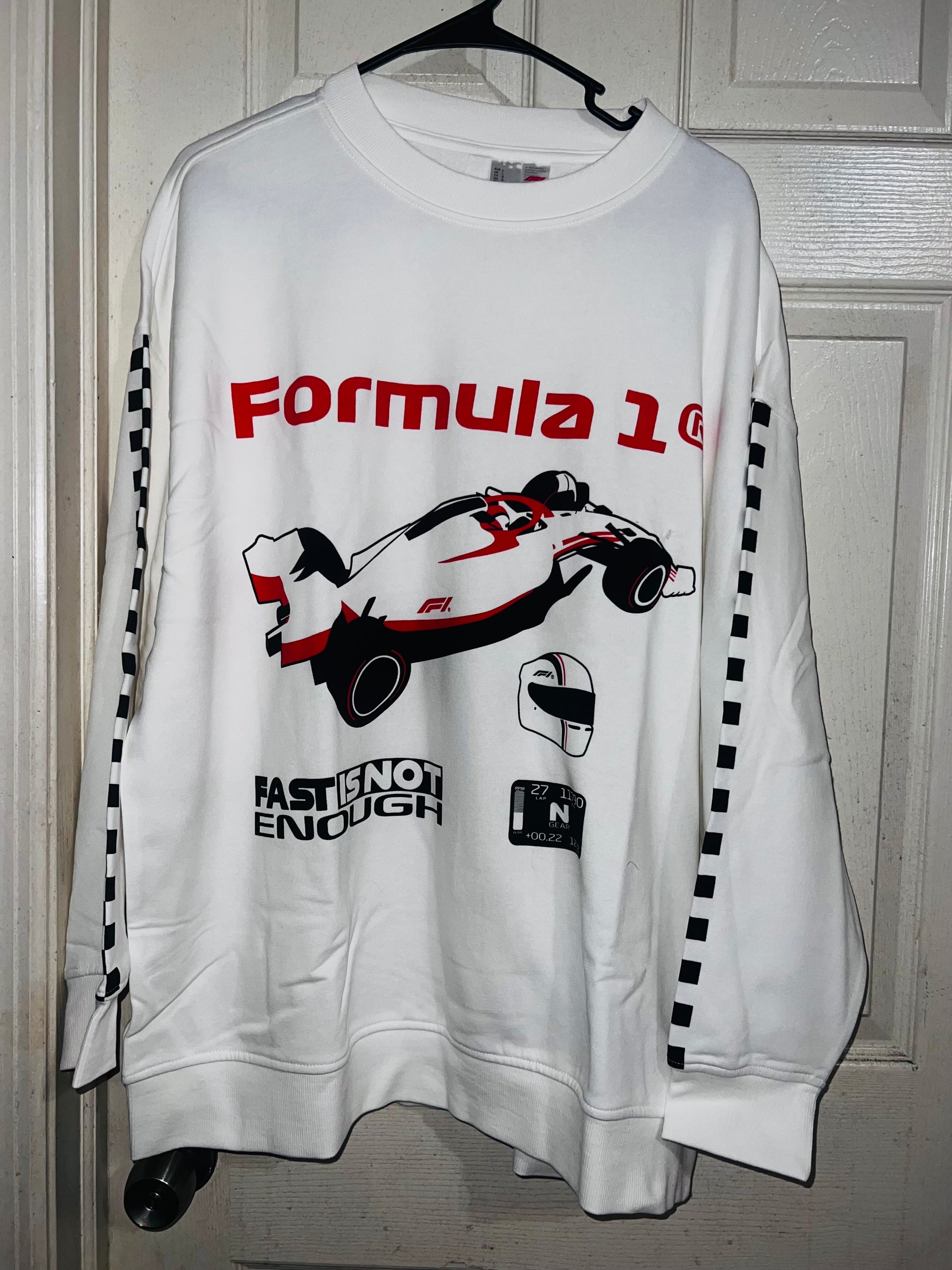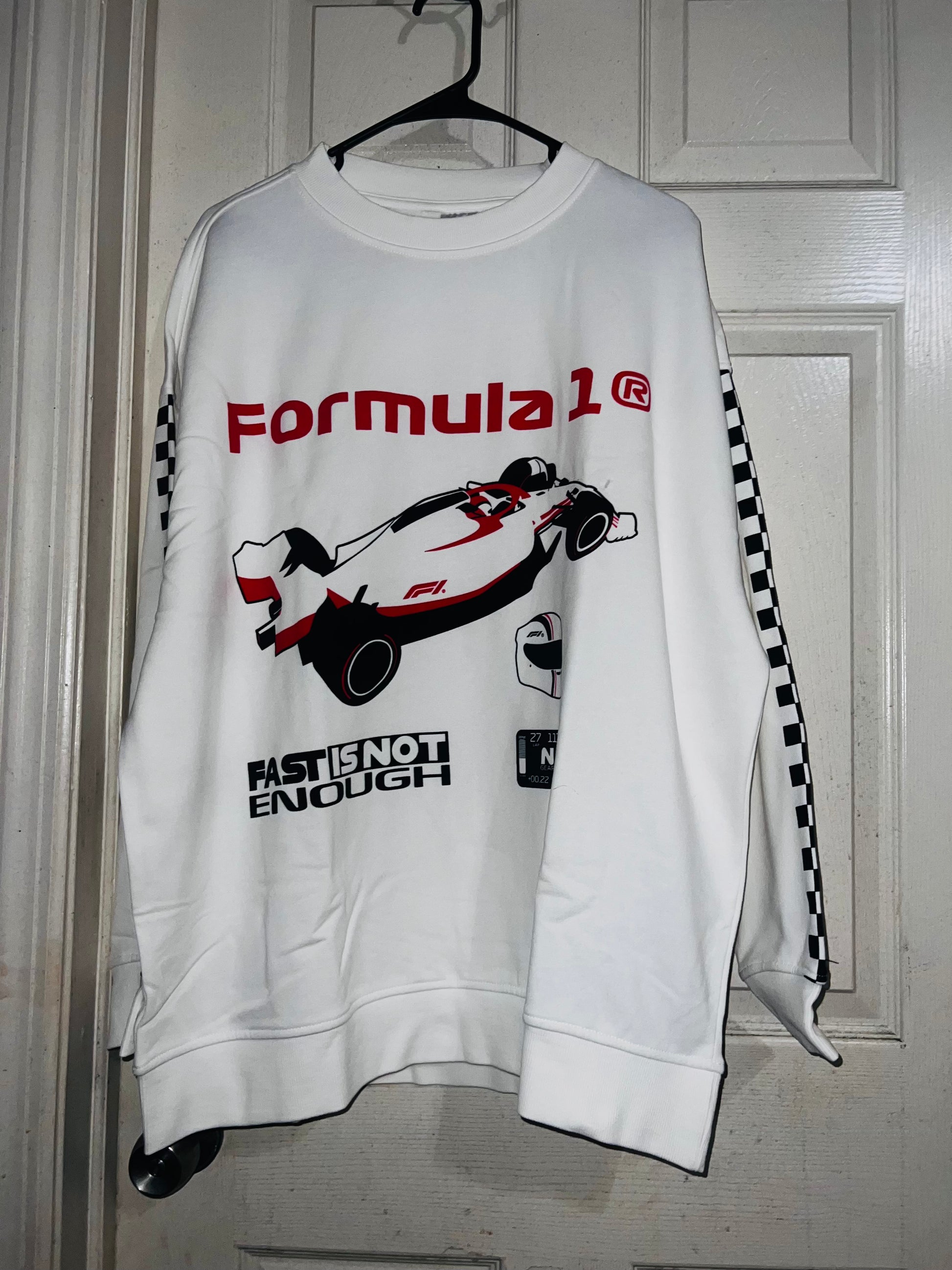 This is a preorder. Please allow extra processing time for shipping. A super cute white oversized Formula 1 racing sweatshirt with checkers down the sleeves. I kept one for myself, so comfortable, cute, and oversized! Size S/M.