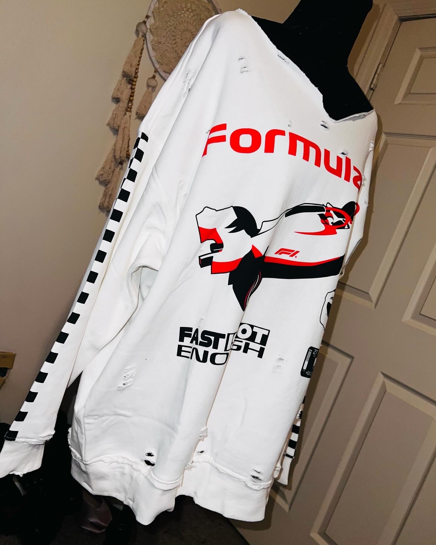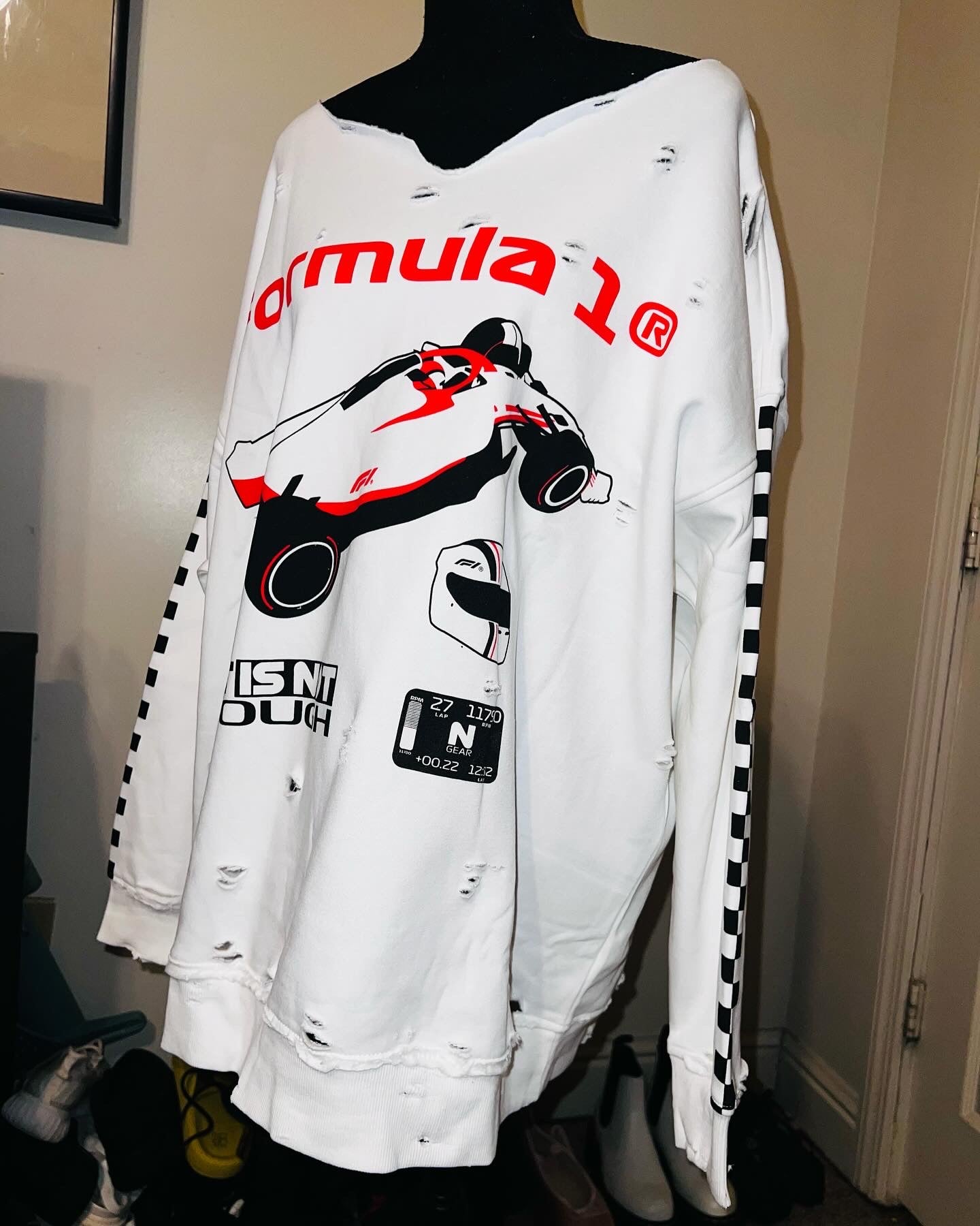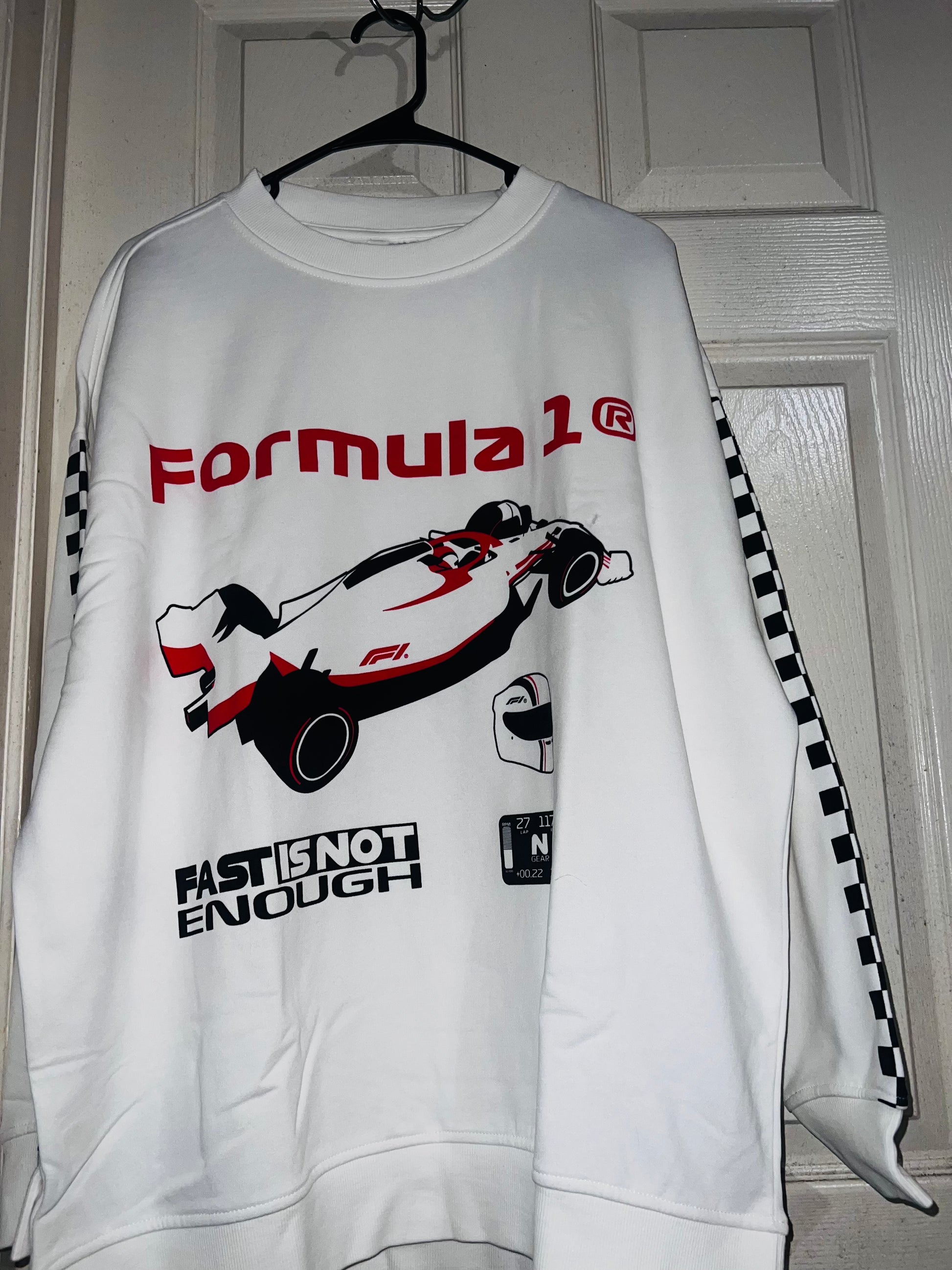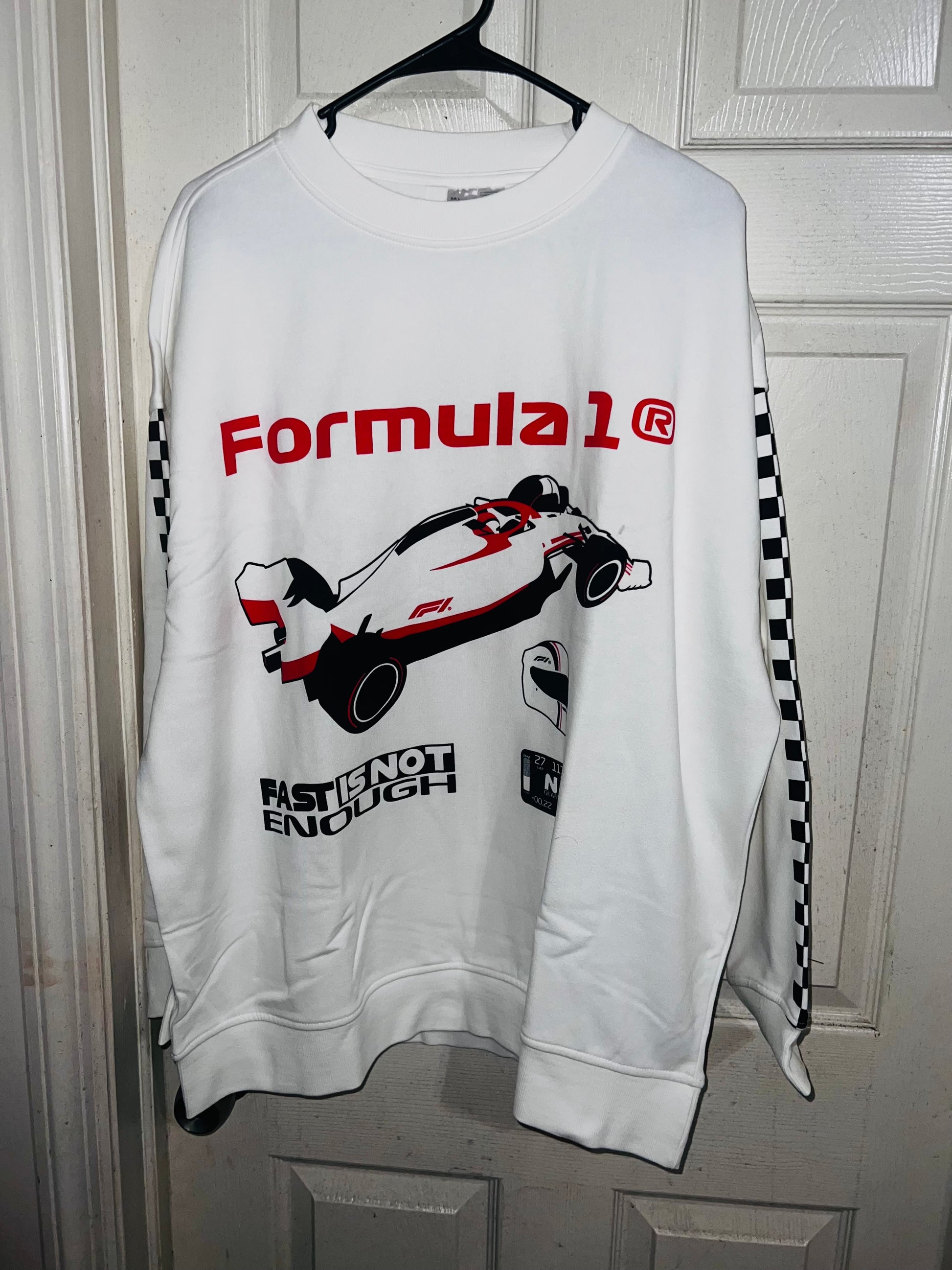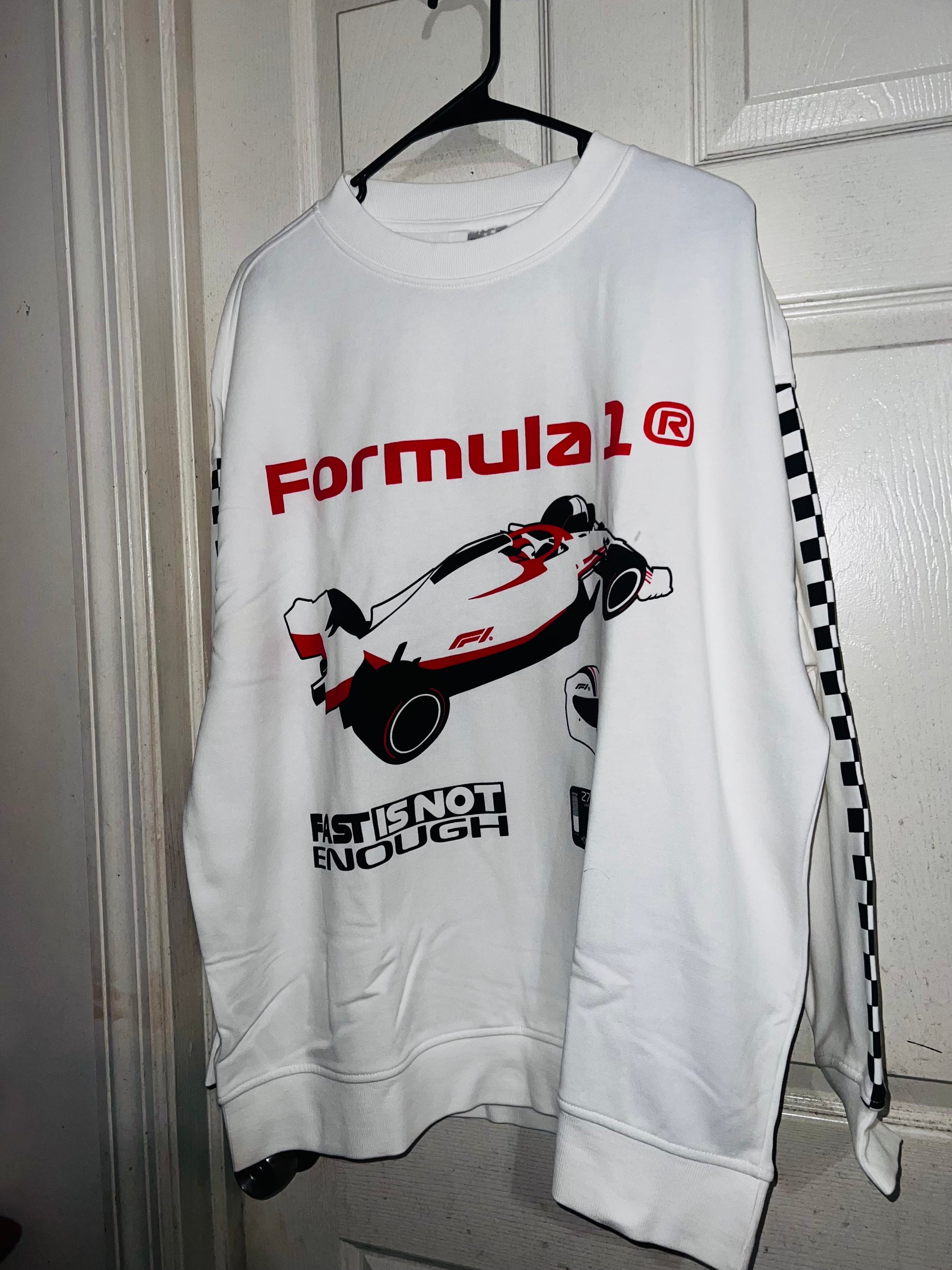 This is a preorder. Please allow extra processing time for shipping. A super cute white oversized Formula 1 racing sweatshirt with checkers down the sleeves. I kept one for myself, so comfortable, cute, and oversized! Size S/M.