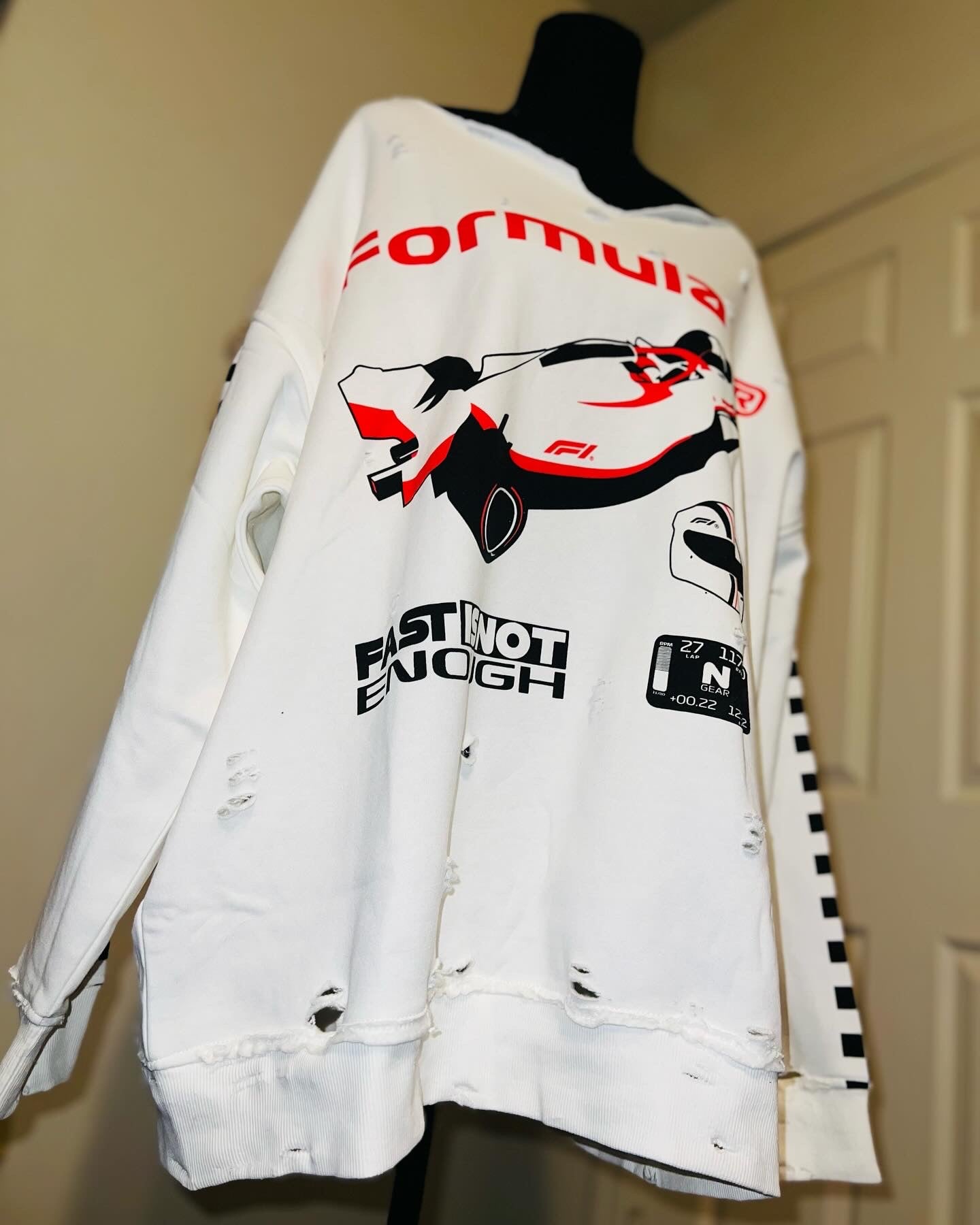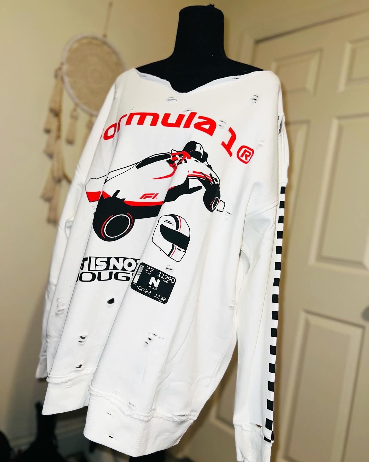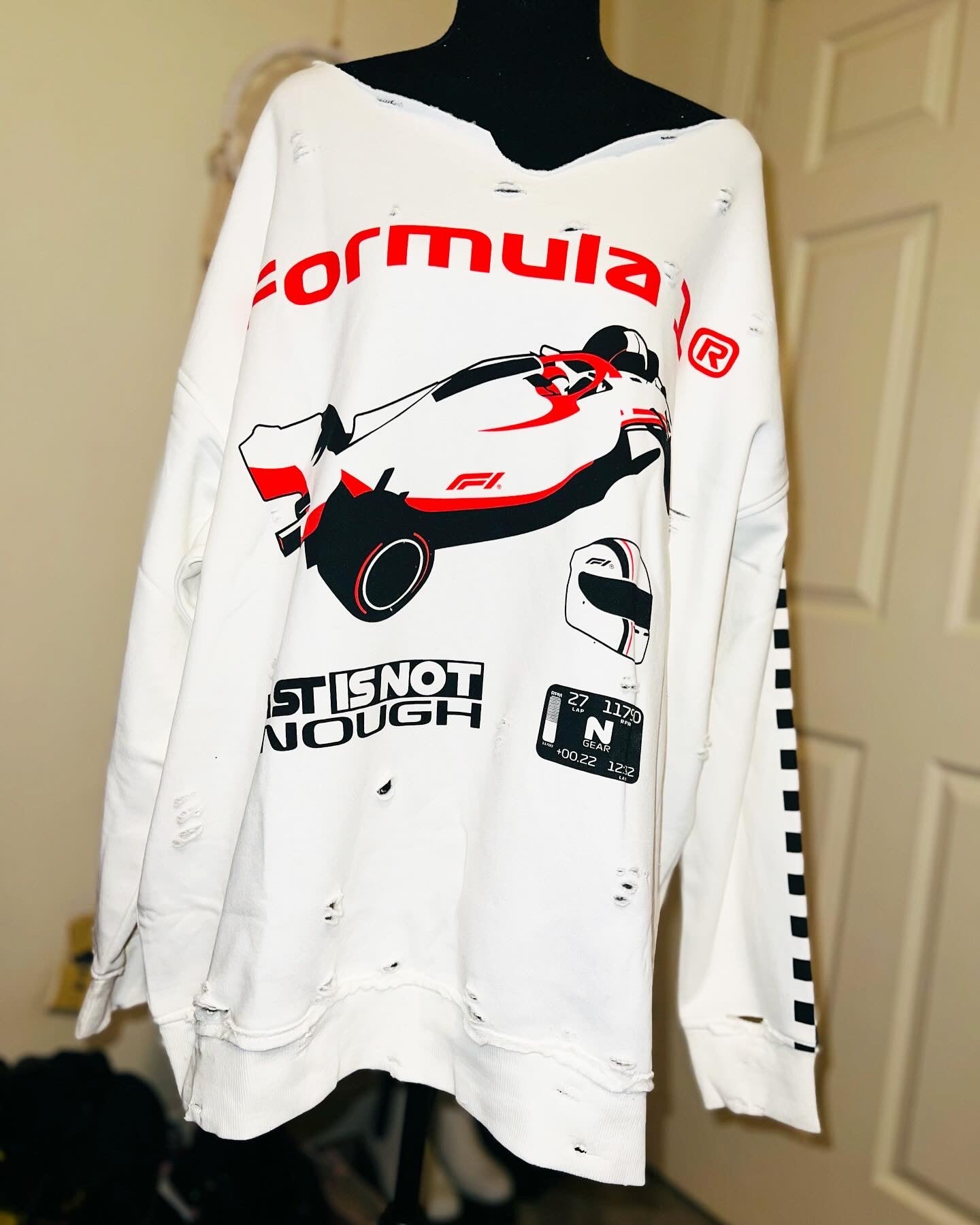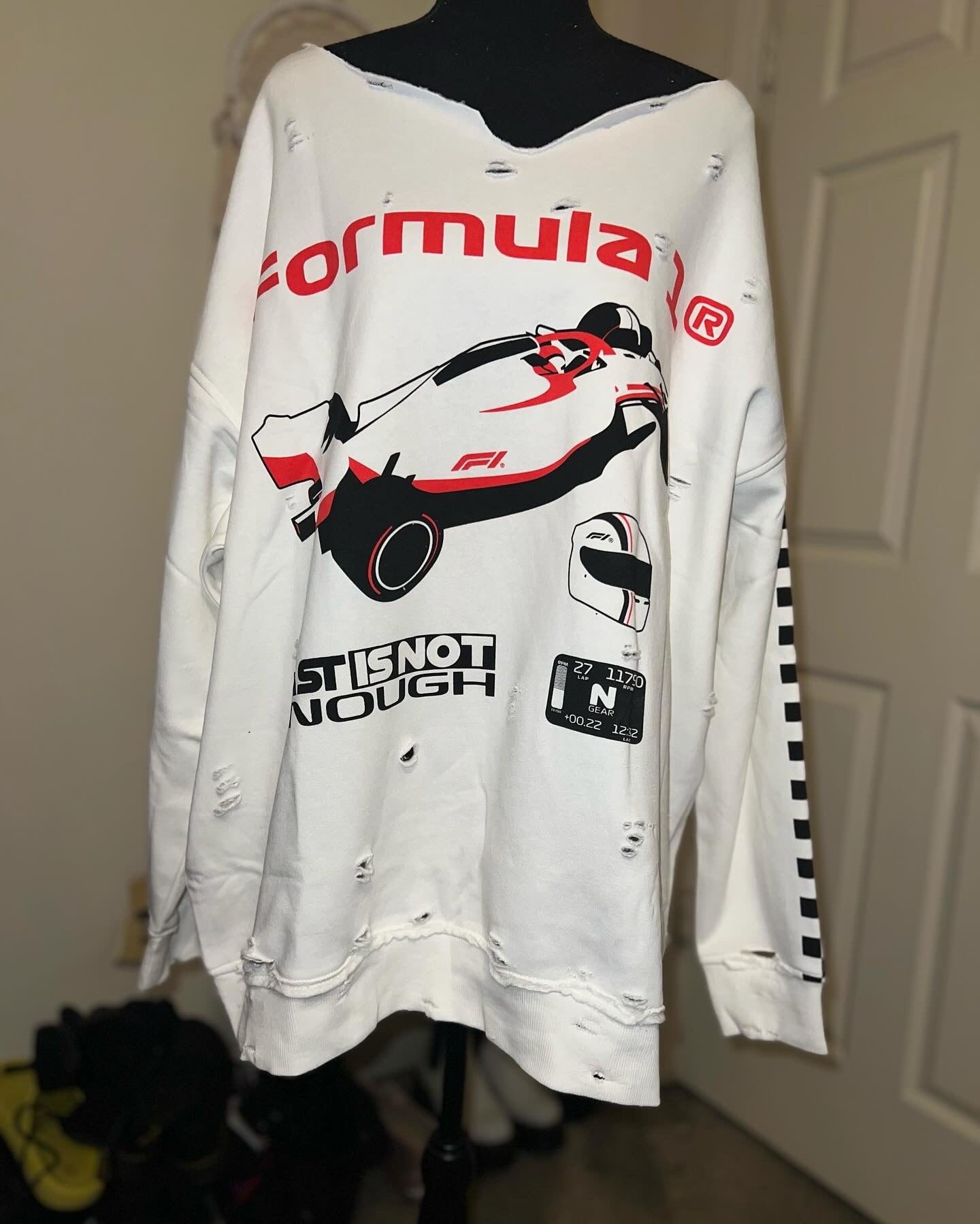 This is a preorder. Please allow extra processing time for shipping. A super cute white oversized Formula 1 racing sweatshirt with checkers down the sleeves. I kept one for myself, so comfortable, cute, and oversized! Size S/M.