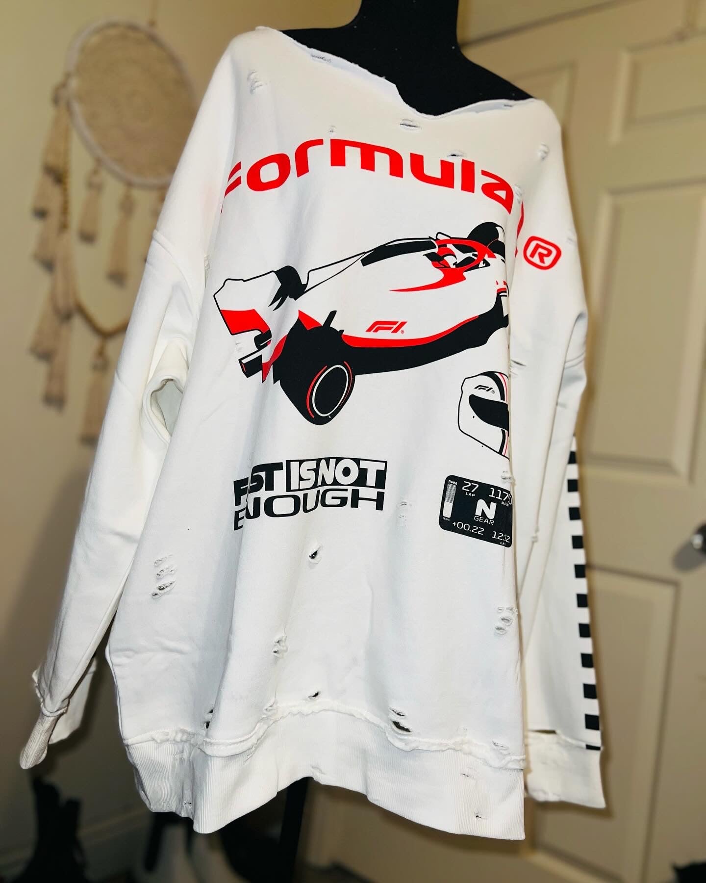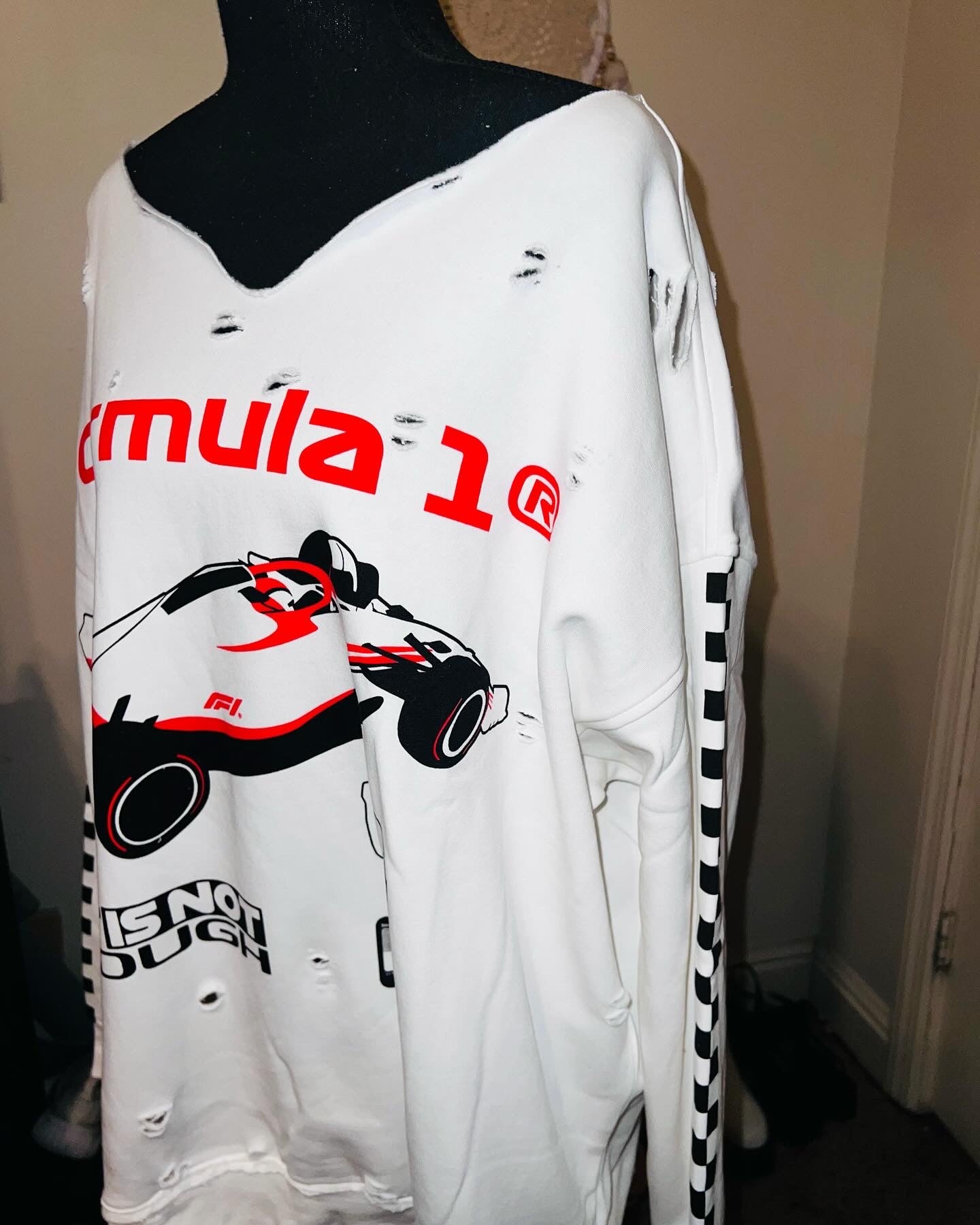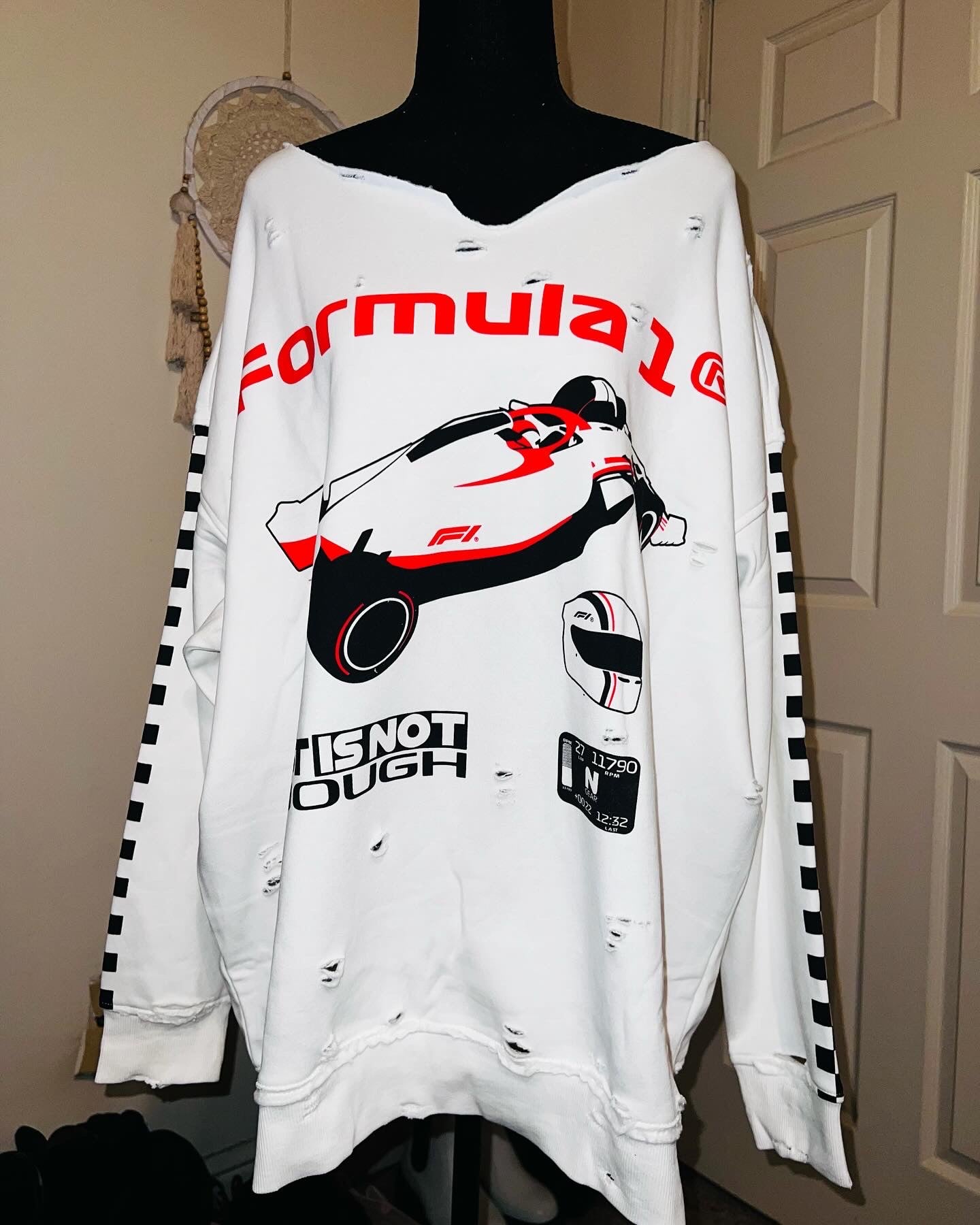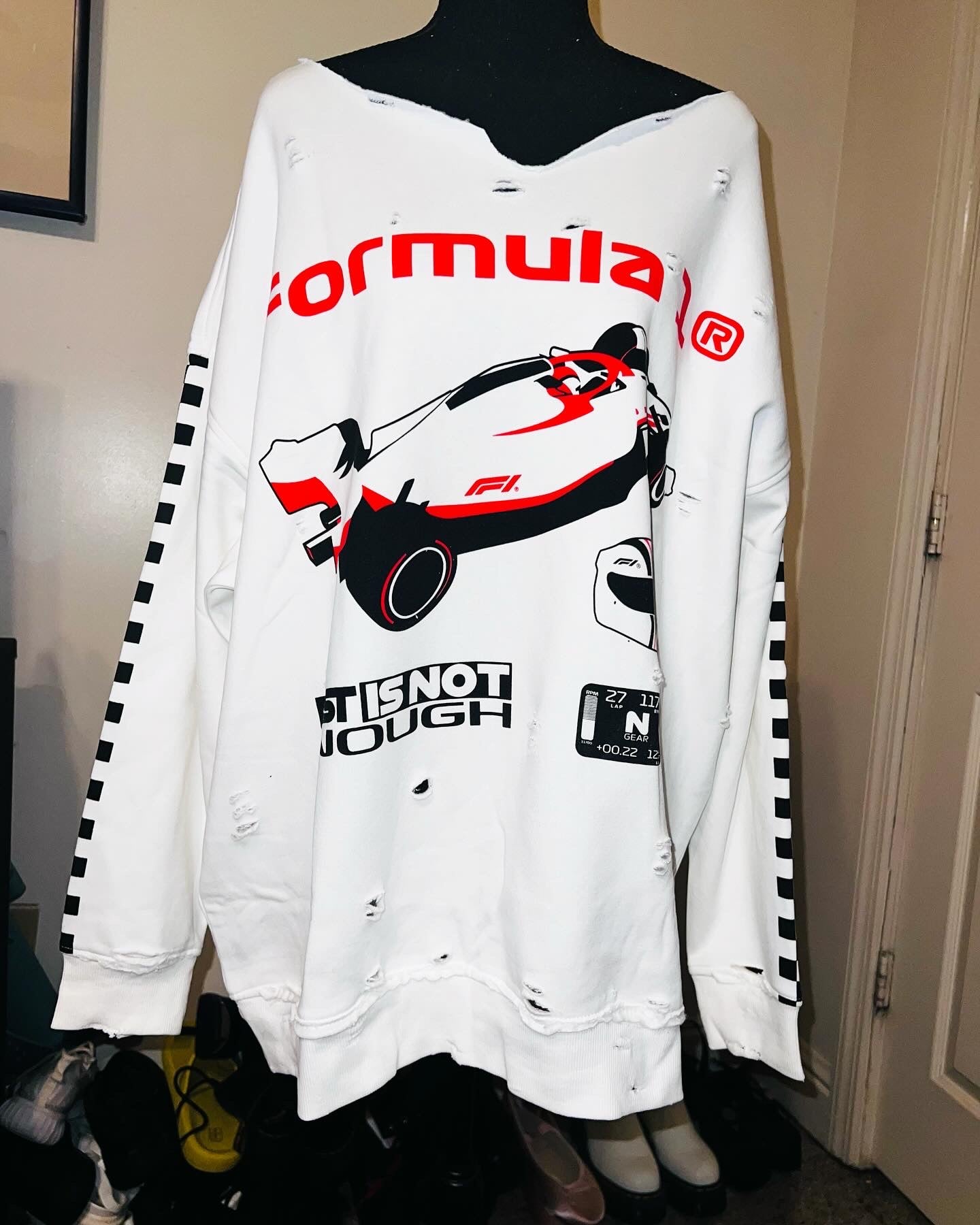 This is a preorder. Please allow extra processing time for shipping. A super cute white oversized Formula 1 racing sweatshirt with checkers down the sleeves. I kept one for myself, so comfortable, cute, and oversized! Size S/M.