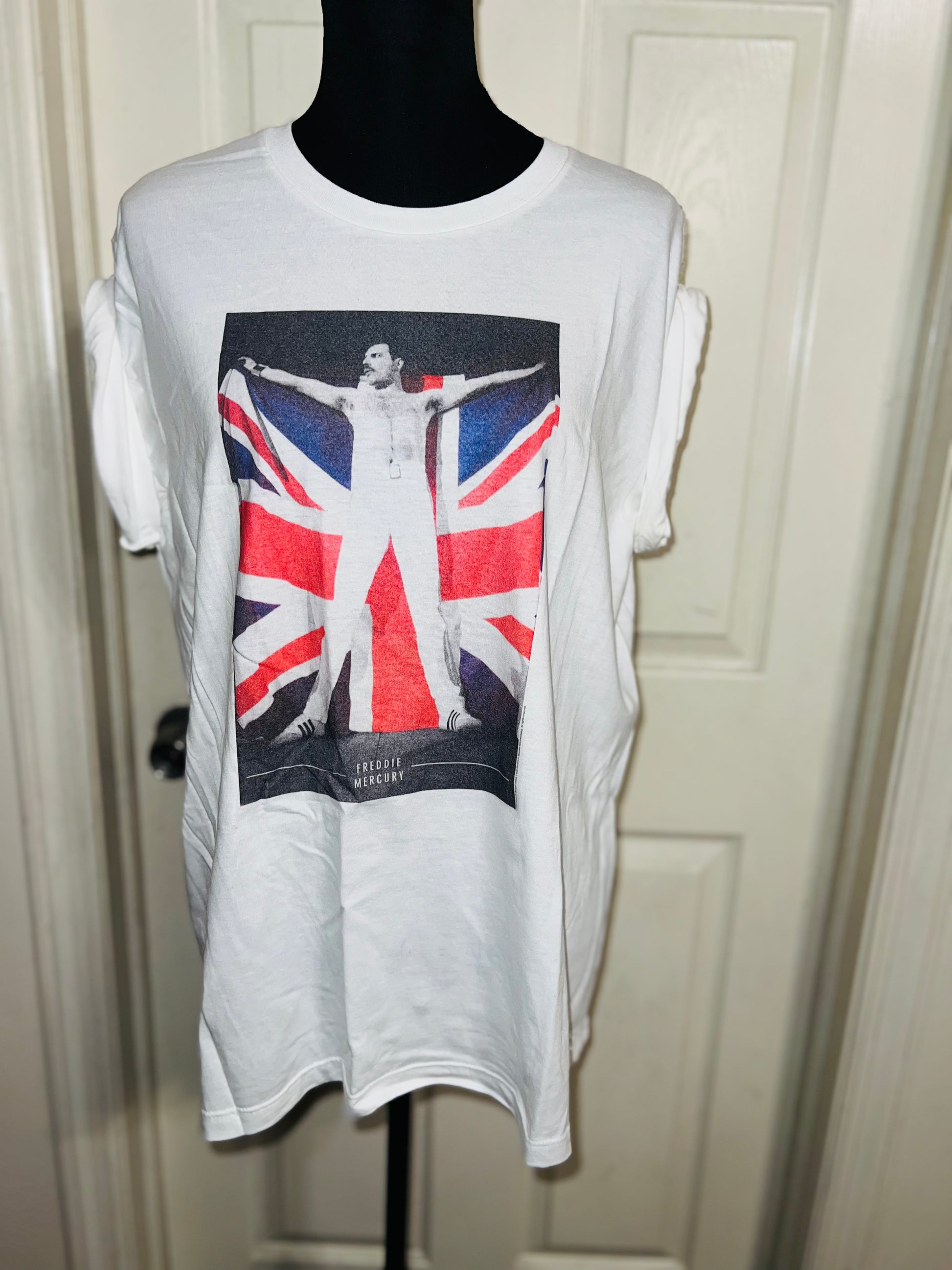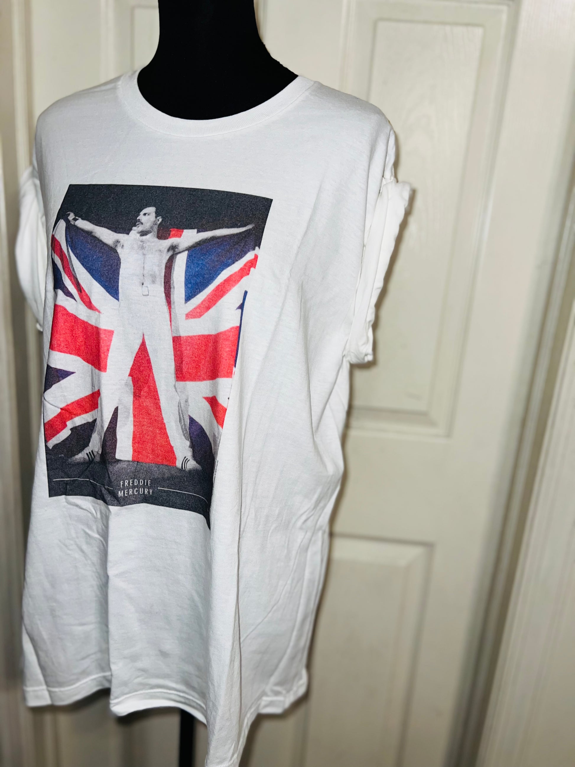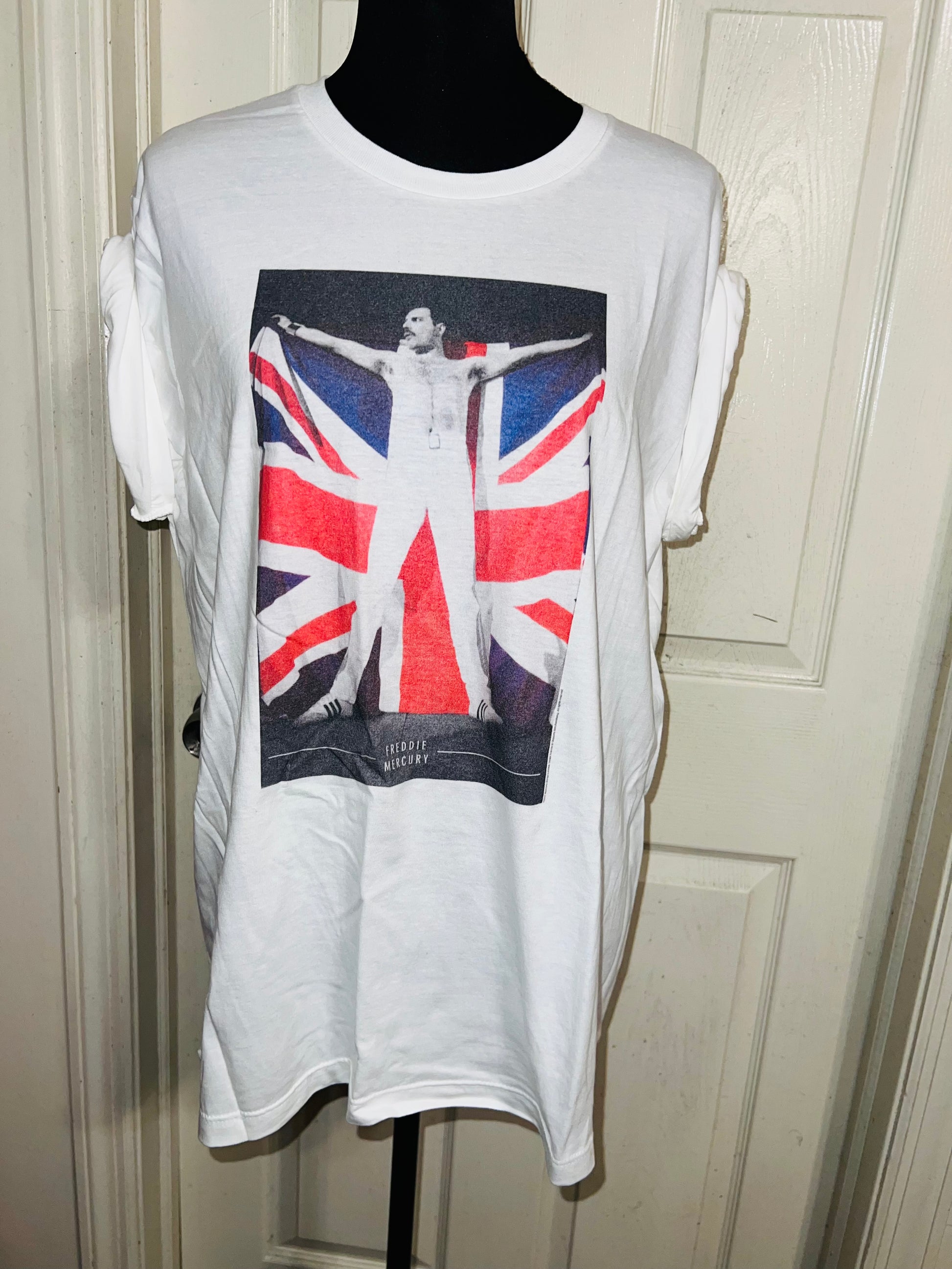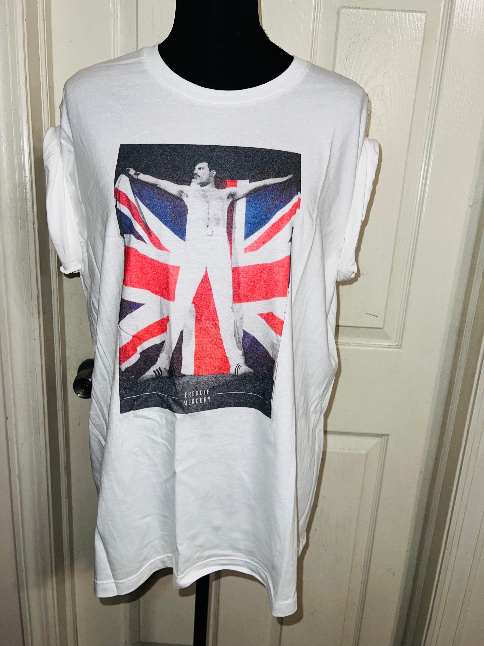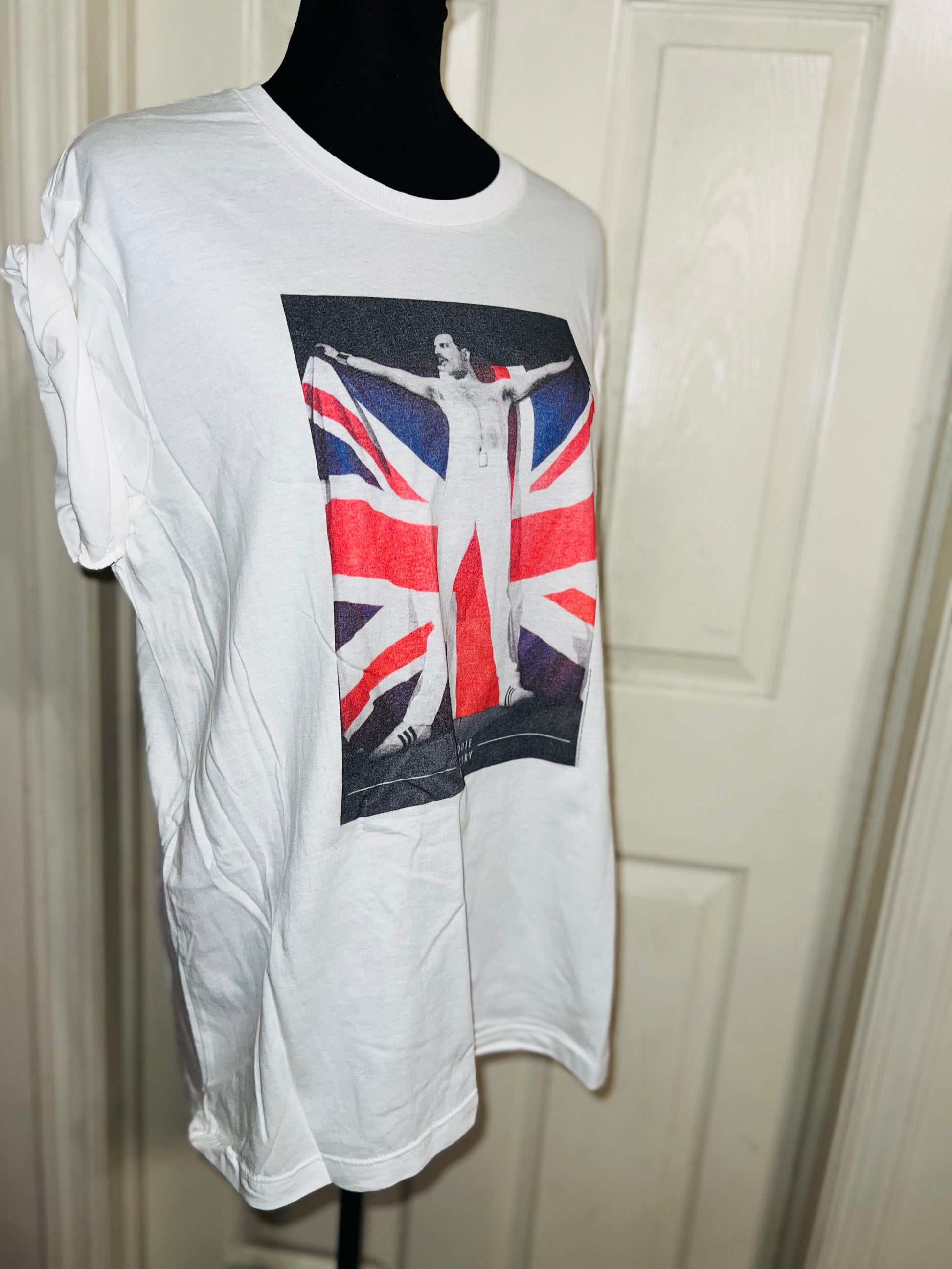 This is now a preorder. A white Freddie Mercury tee with the United Kingdom flag, found at the vintage shop. Size large, oversized.