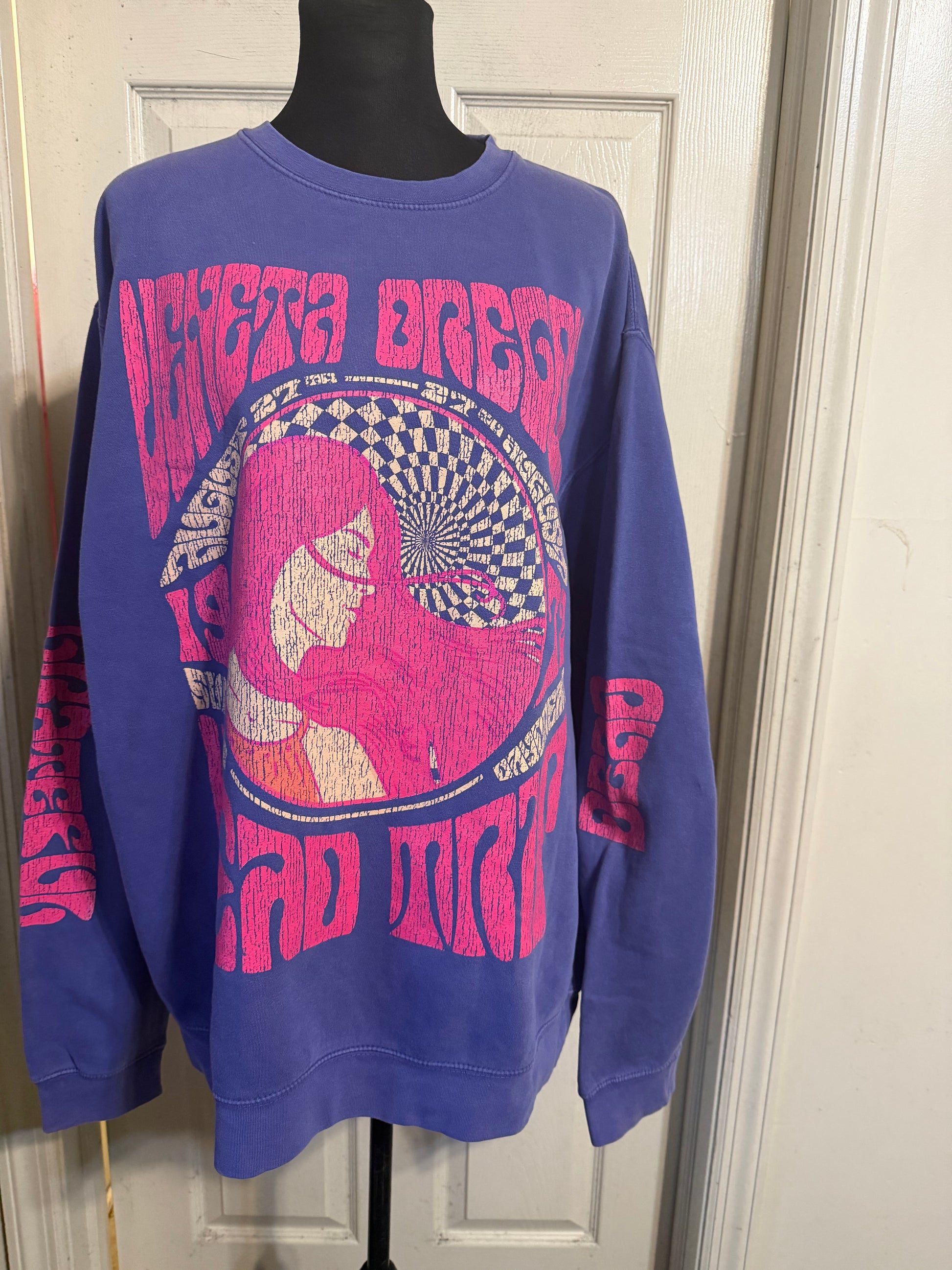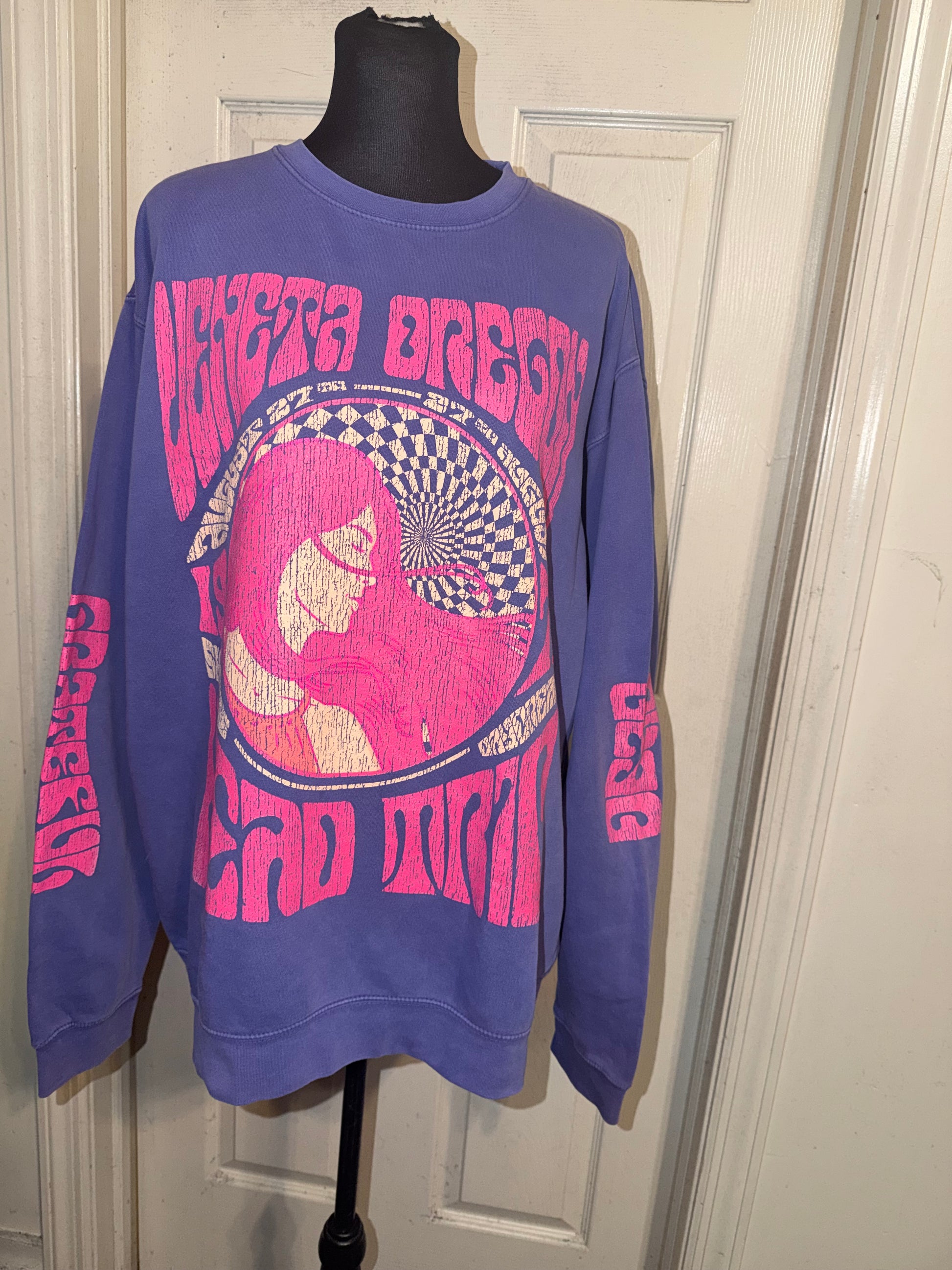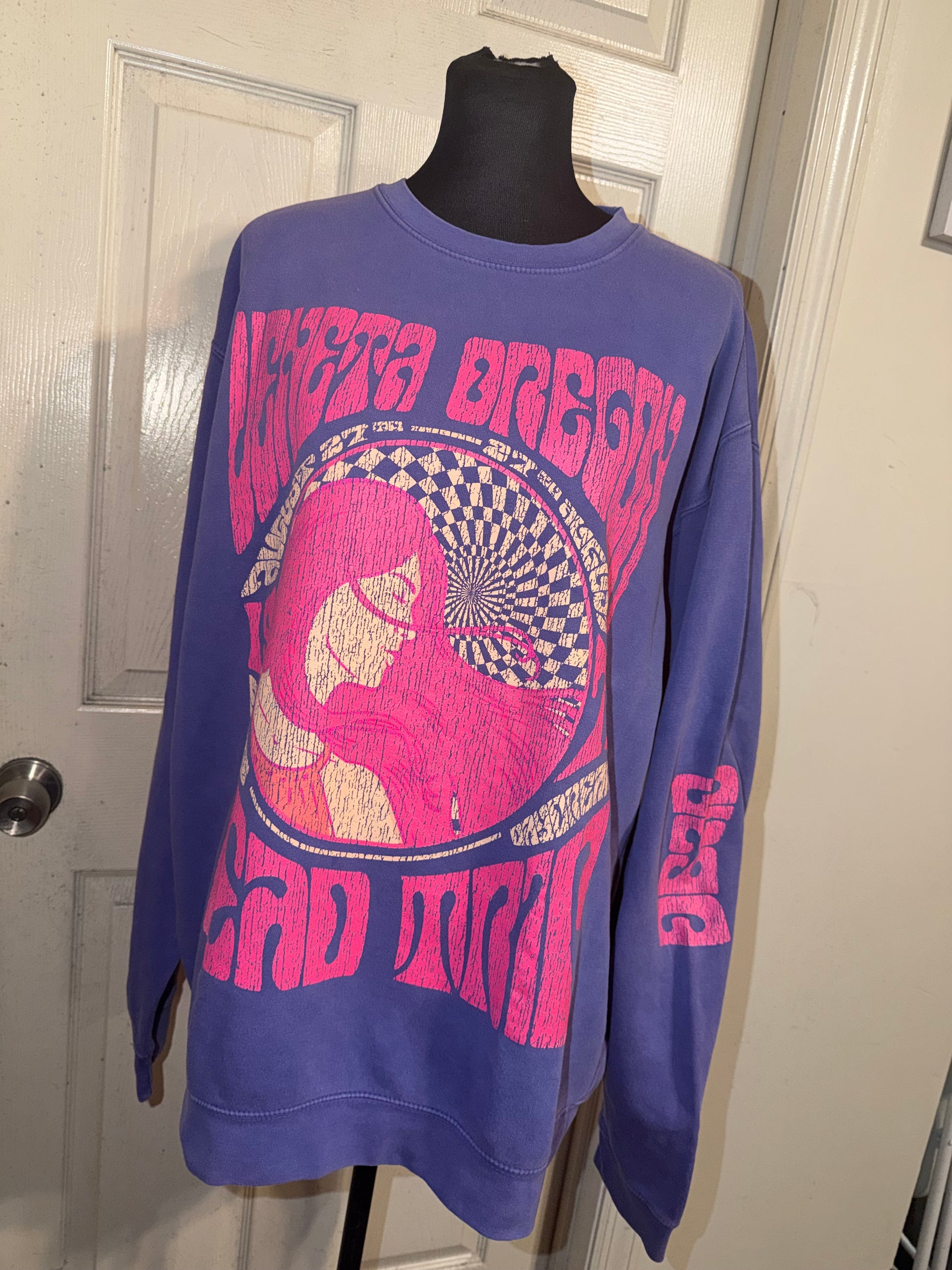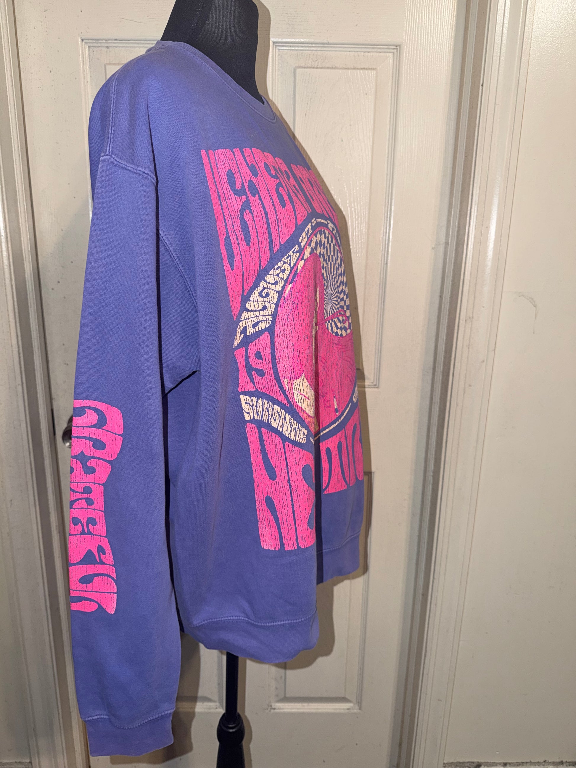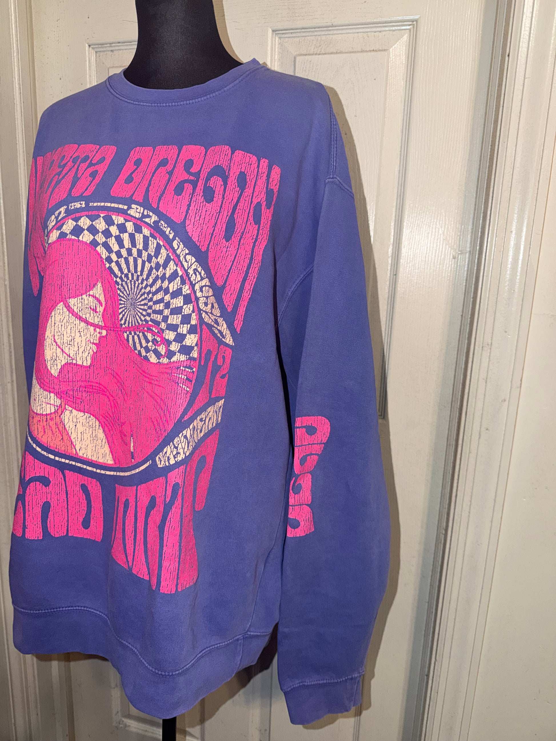 A purple Grateful Dear sweatshirt with the name down the sleeves. Oversized.