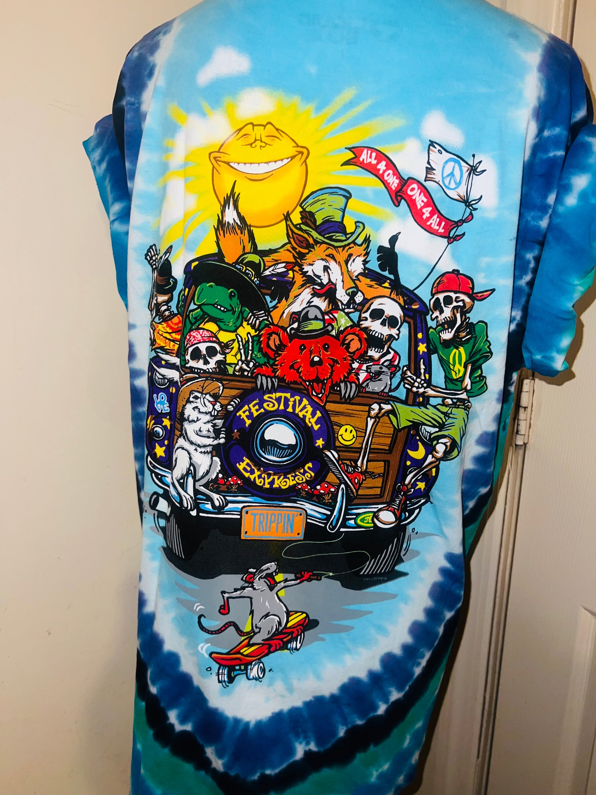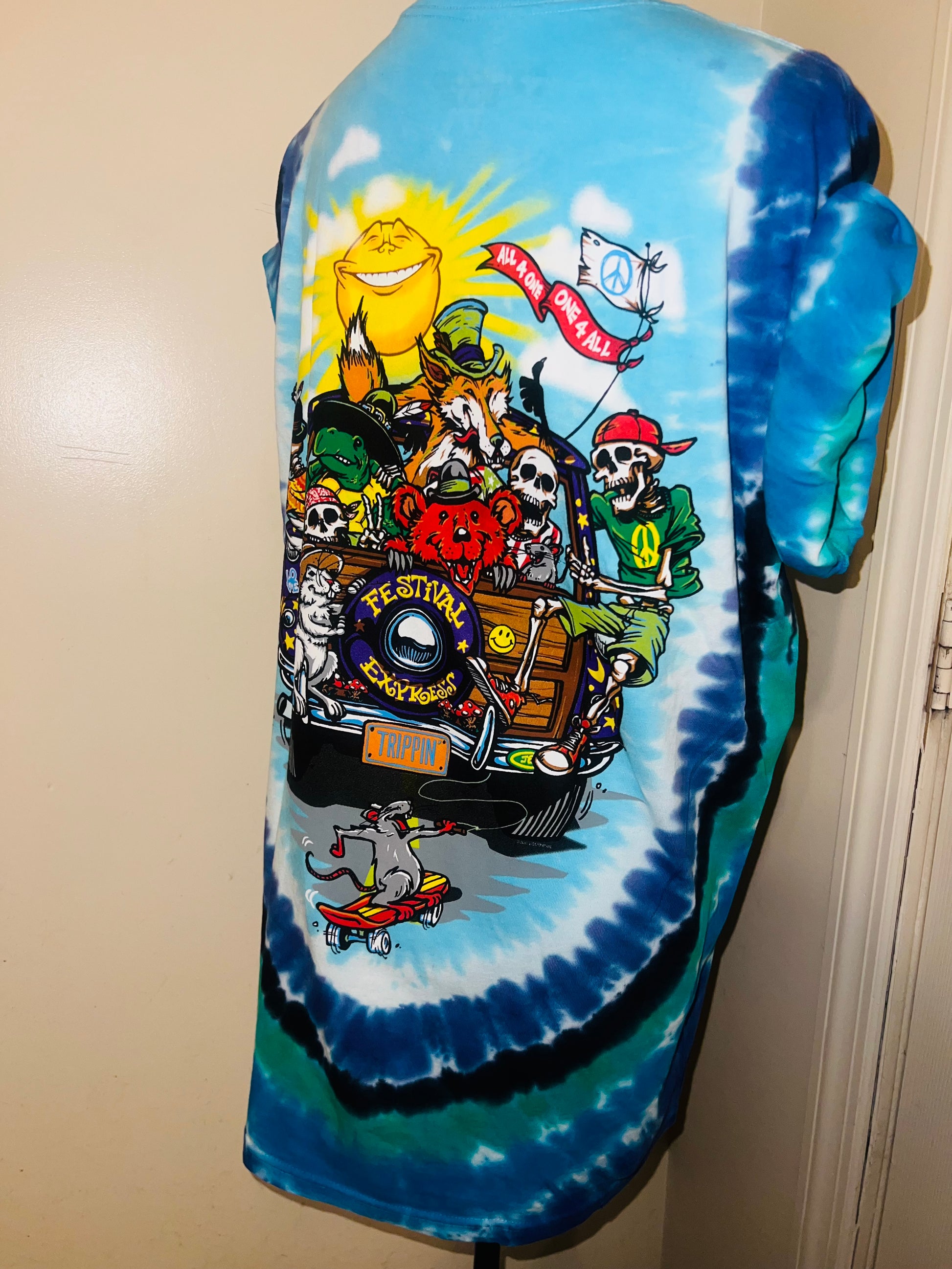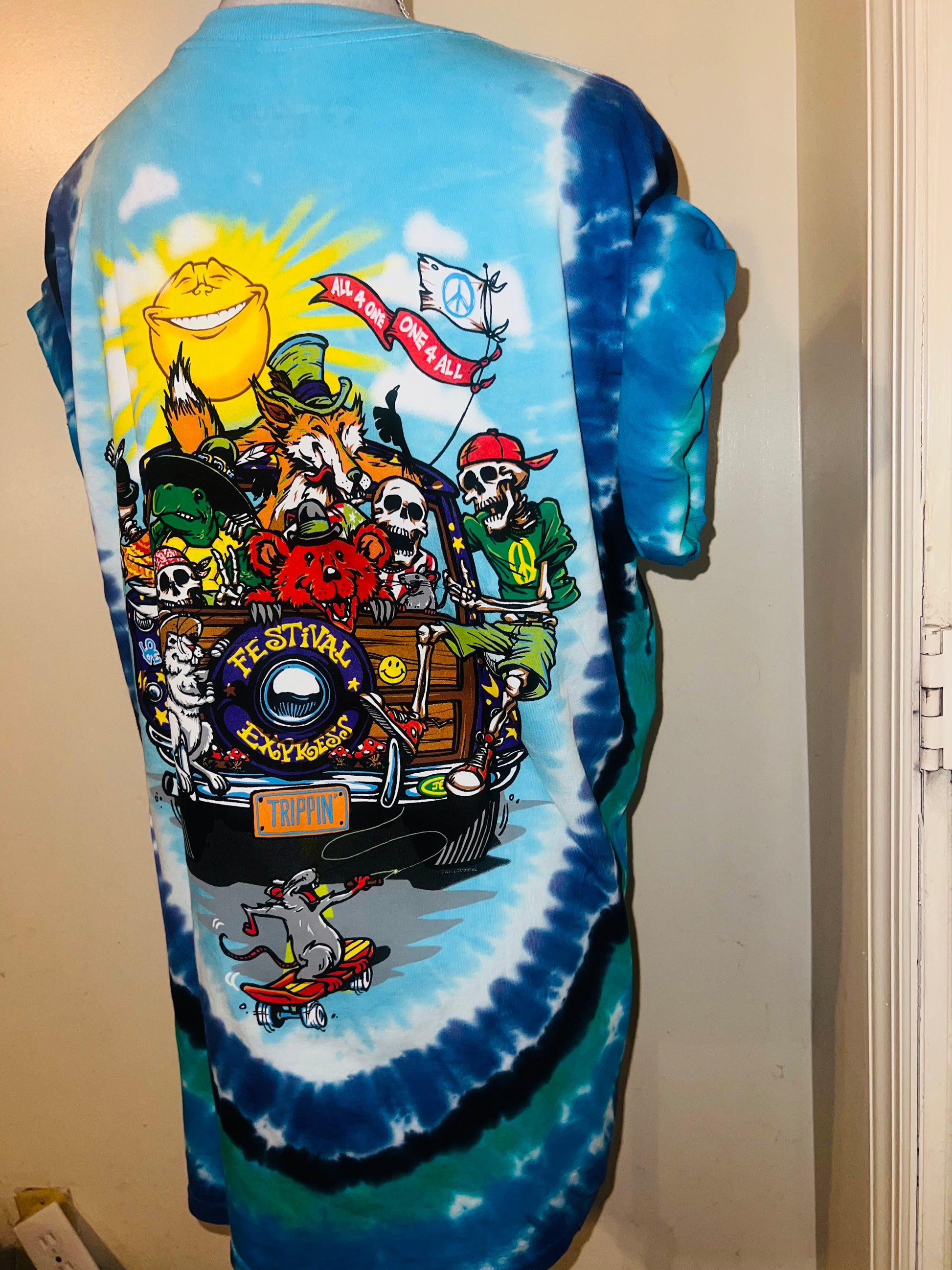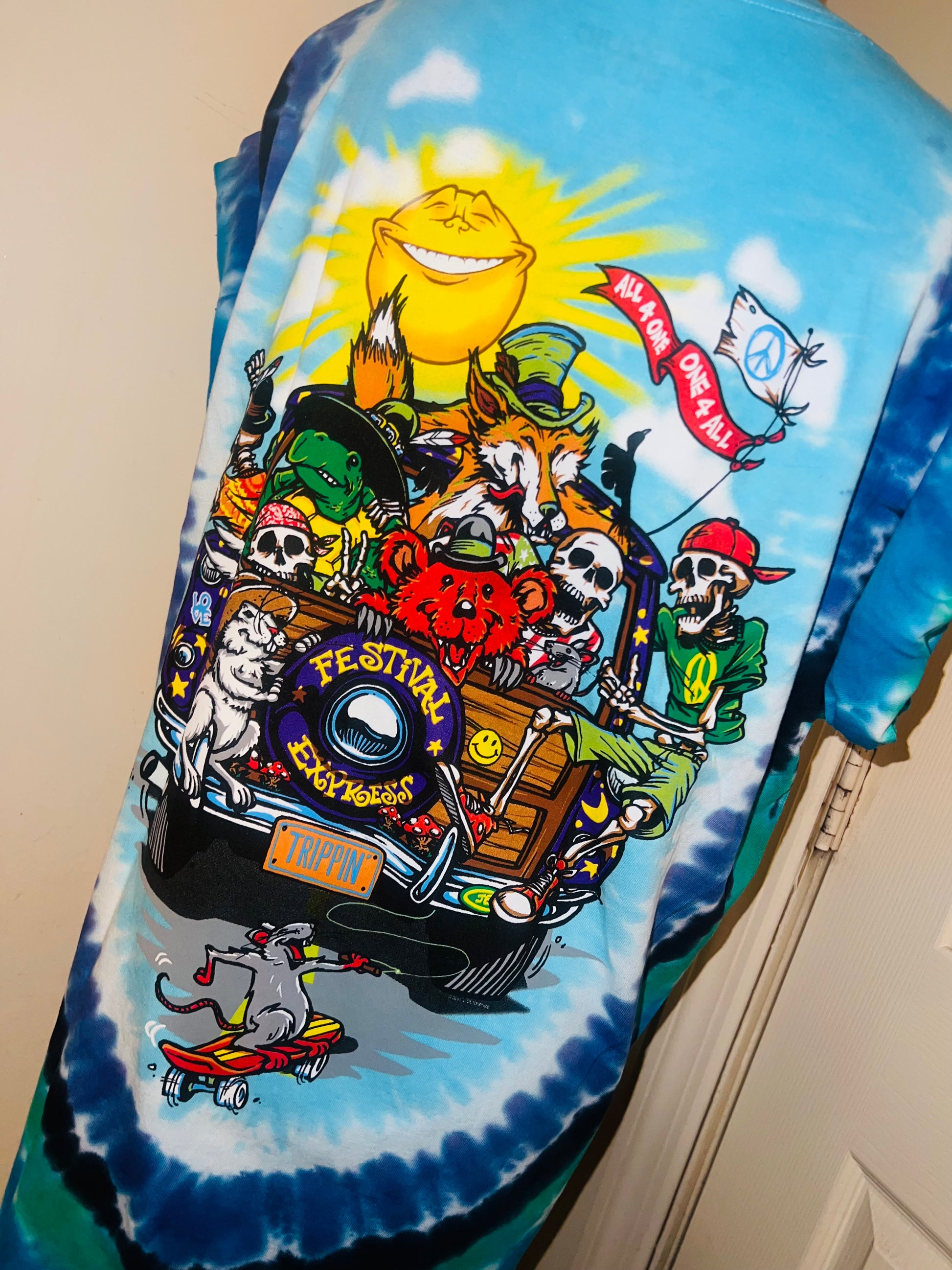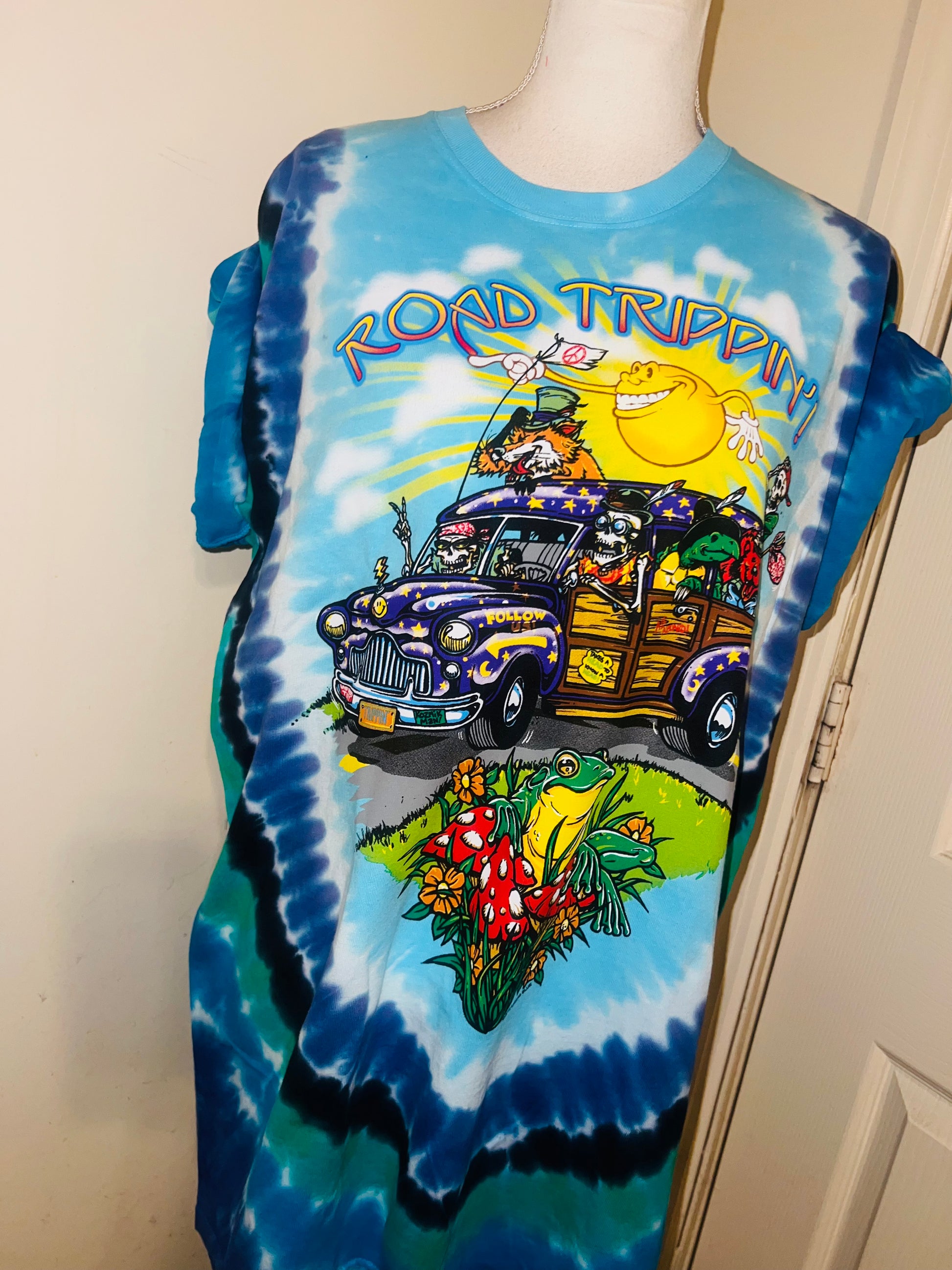 This is now a preorder. Please allow extra processing. A tie dye double sided Road Trippin’ Grateful Dead tee with an amazing graphic of all the GD characters trippin on the van. Size large, oversized.