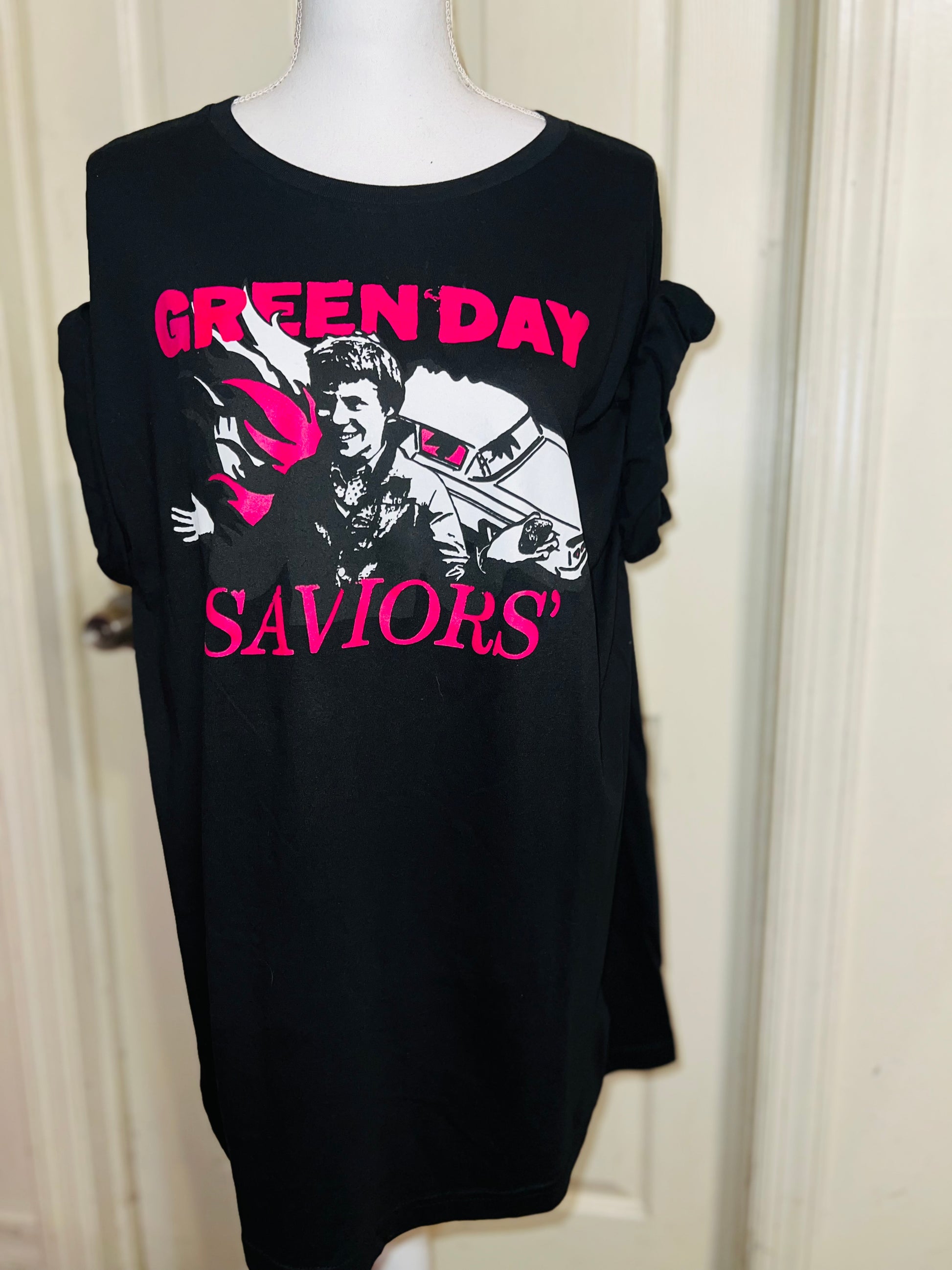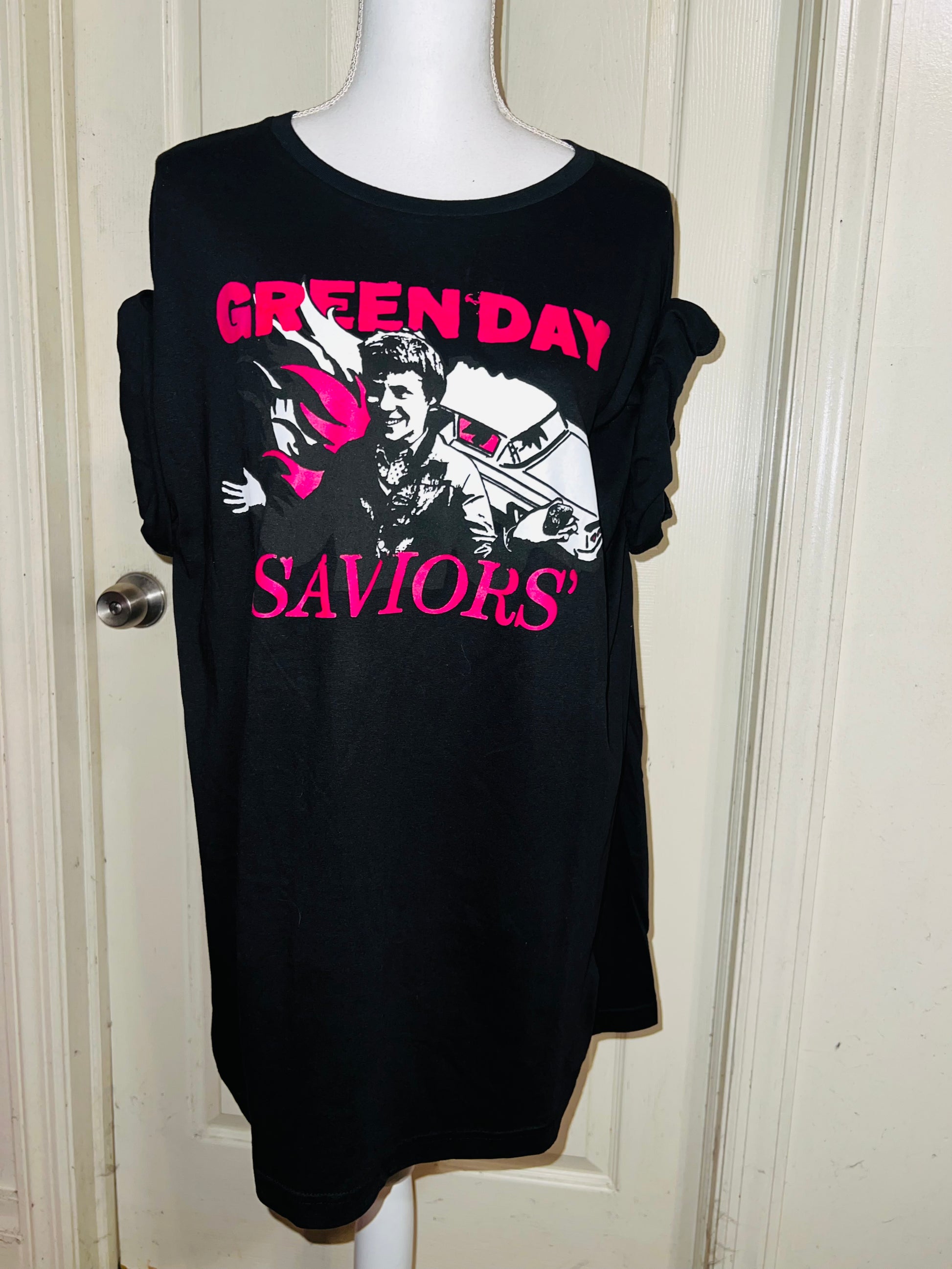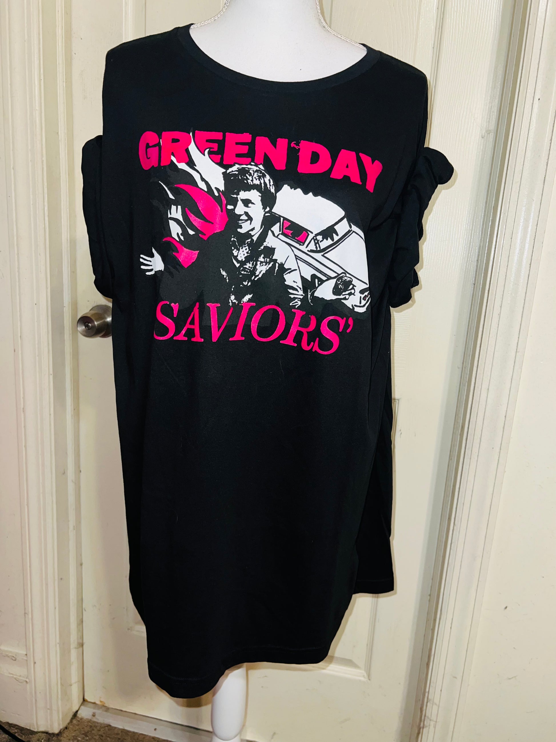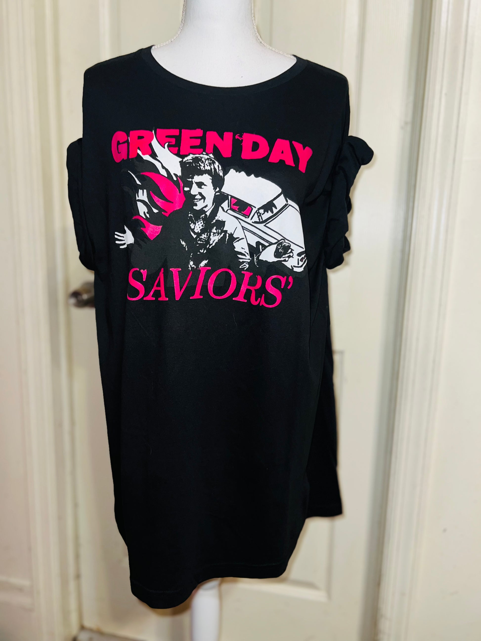 A black Green Day Saviors tee with hot pink detail. Super unique. Size L/XL, oversized.