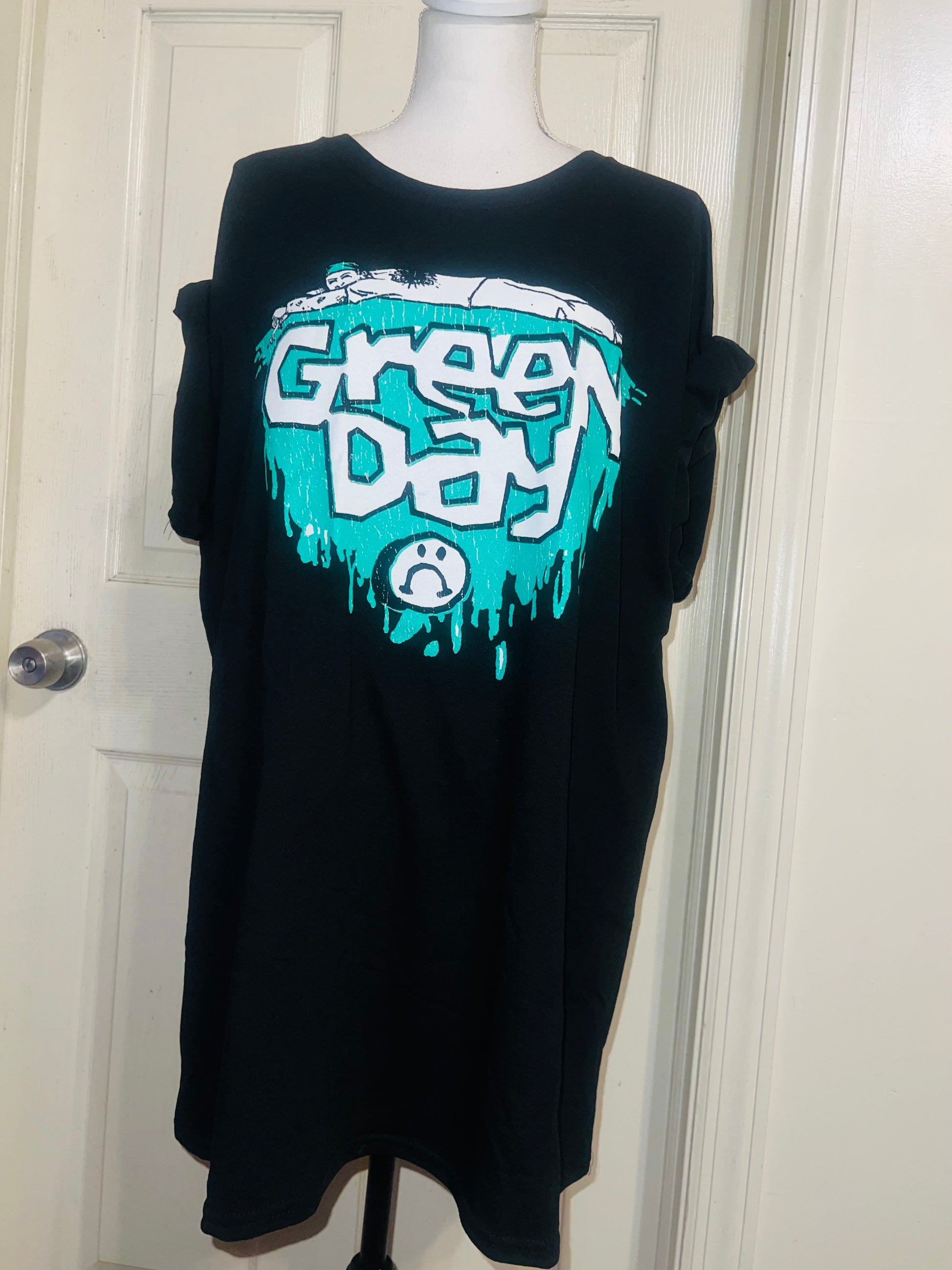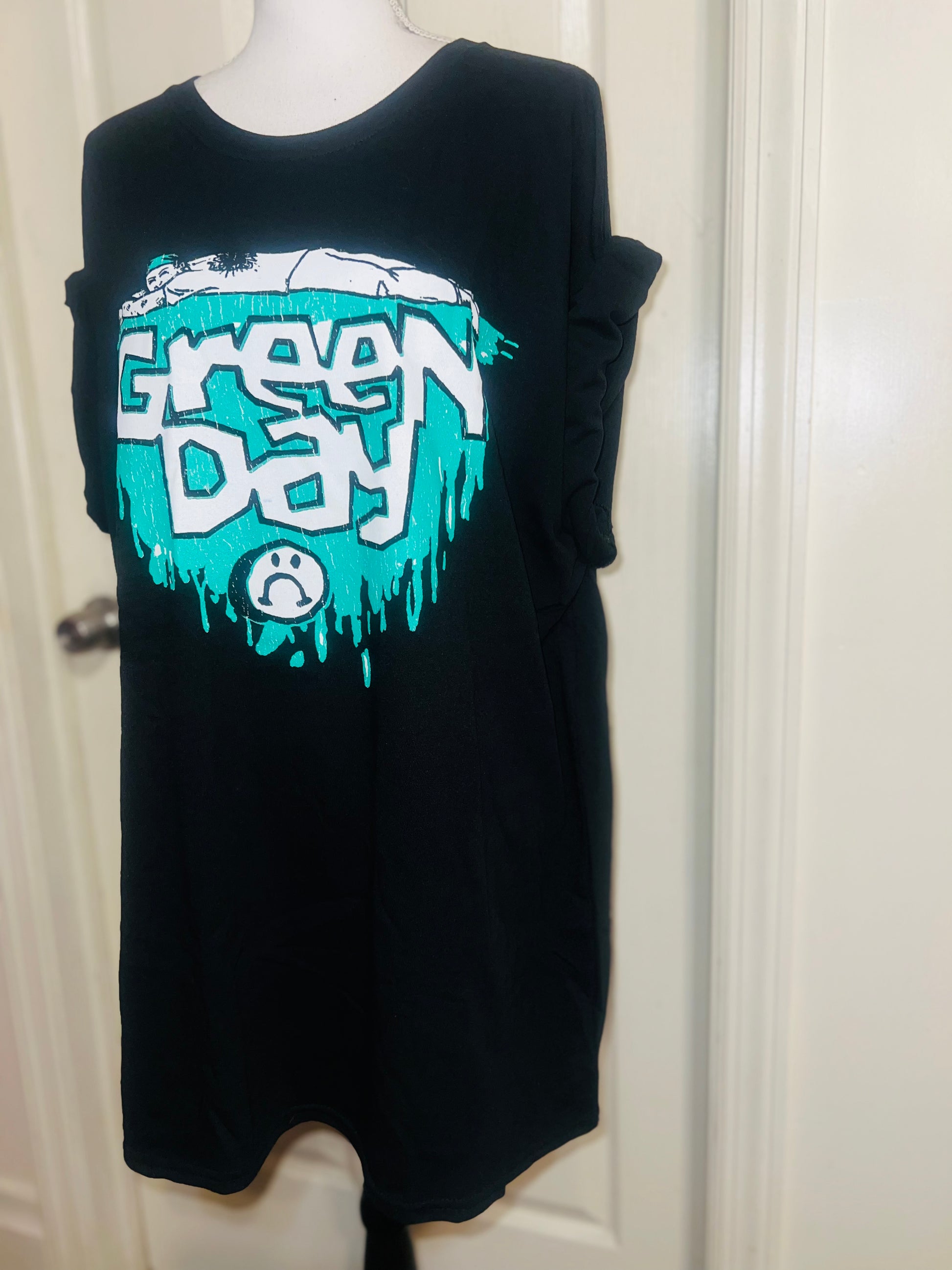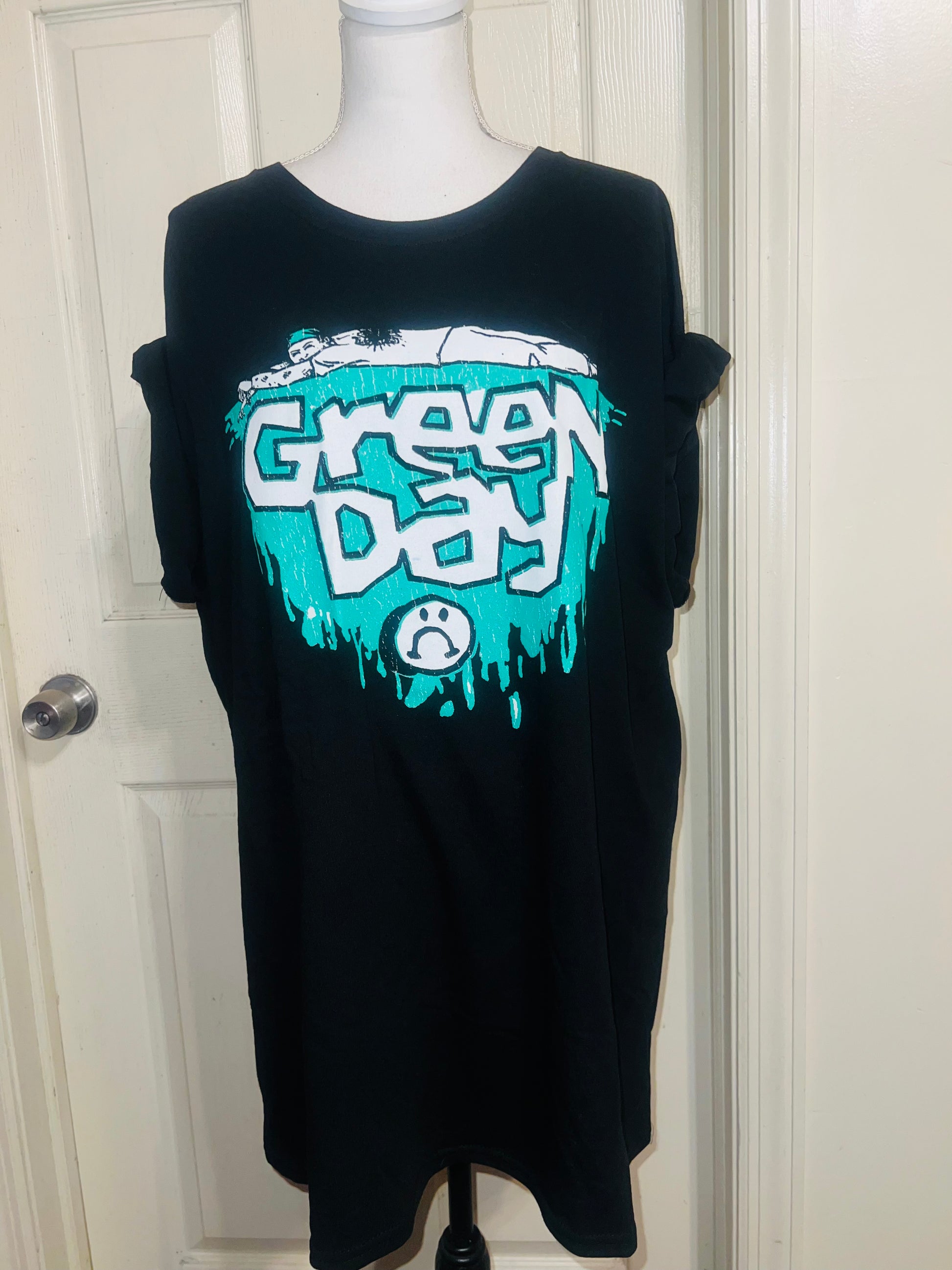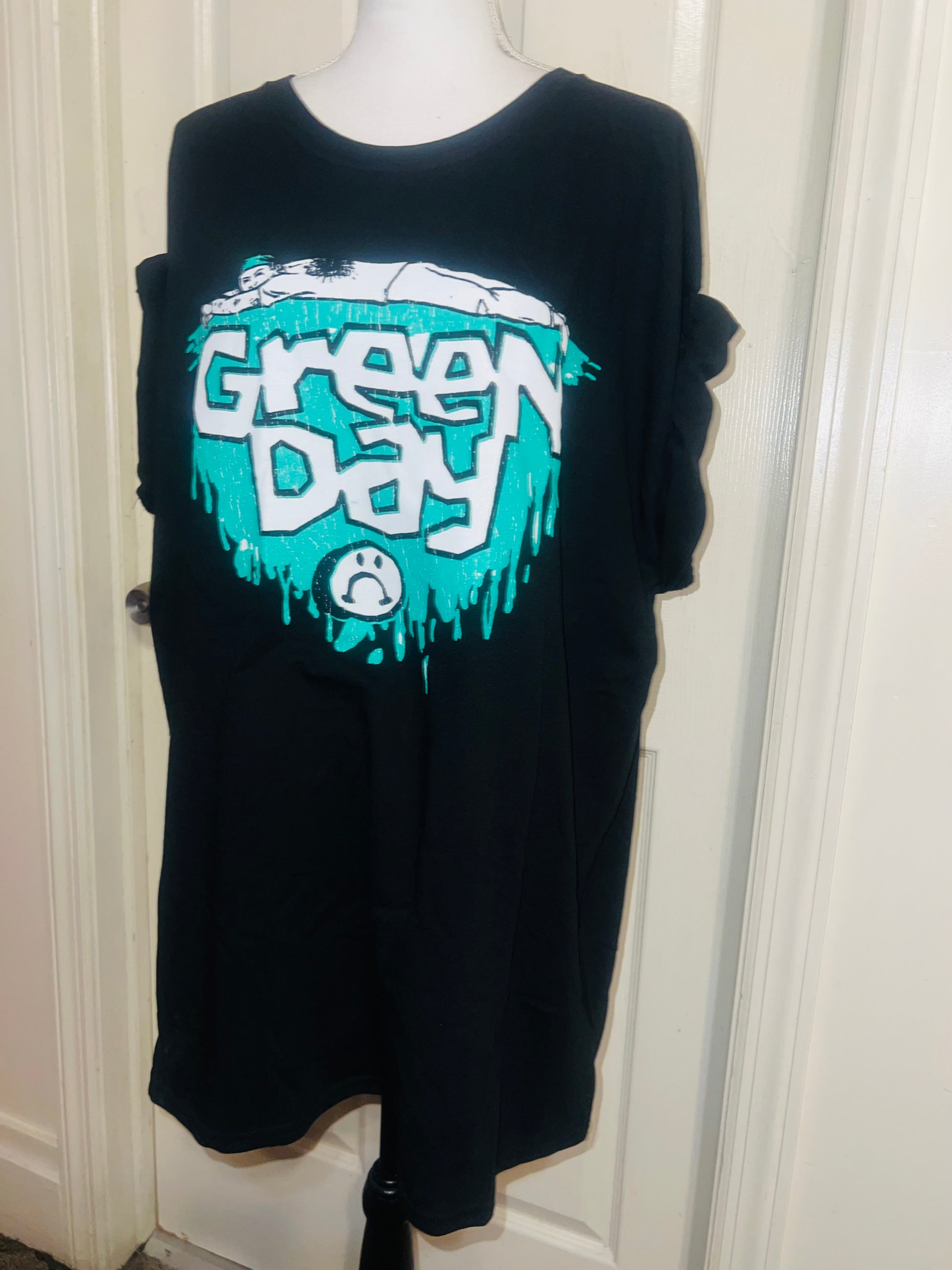 This is a preorder. Please allow extra processing time A black Green Day tee with a cool graphic with the green slime and sad smiley. It’s soft and an oversized XXL. Could work like a dress for those who love that depending on height.