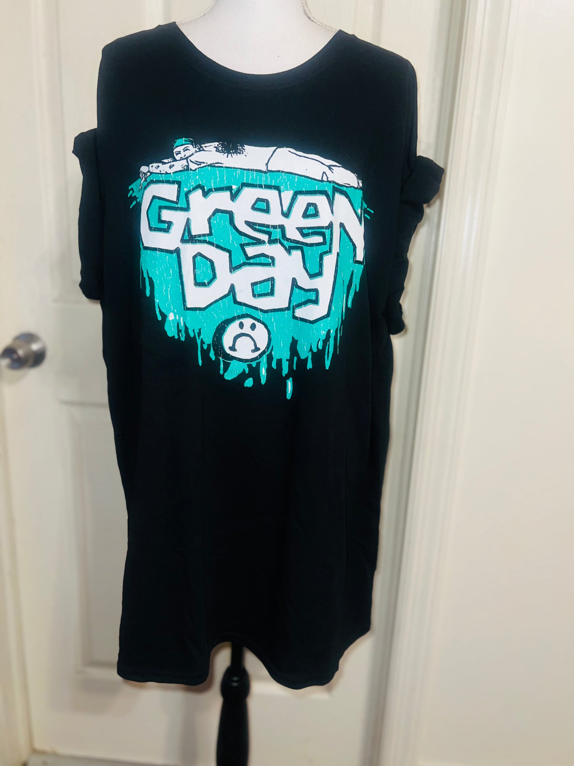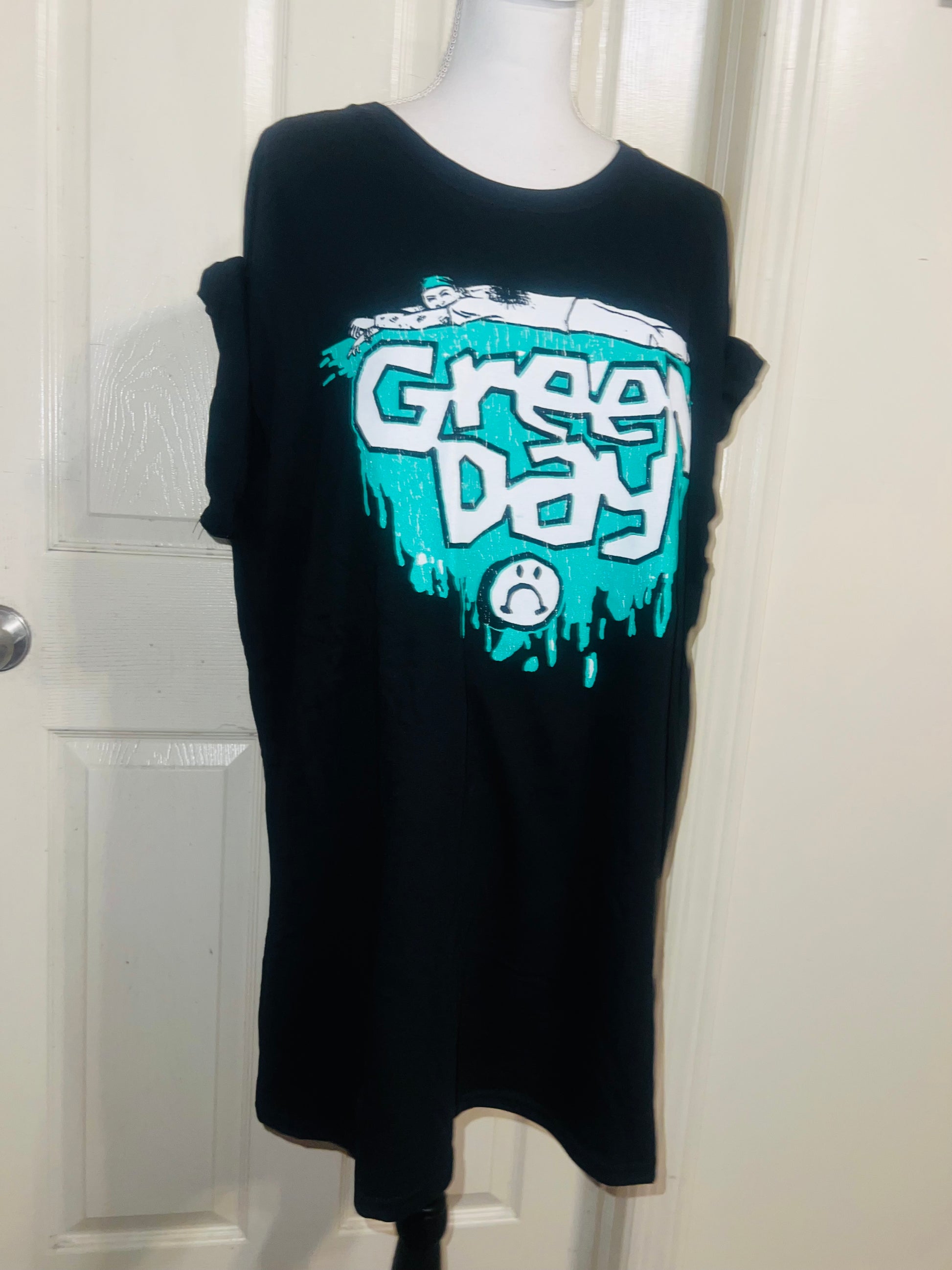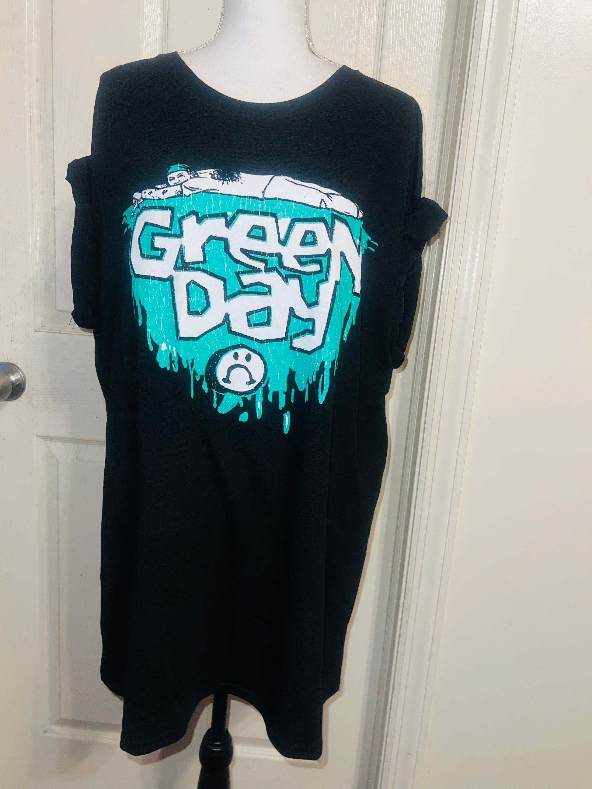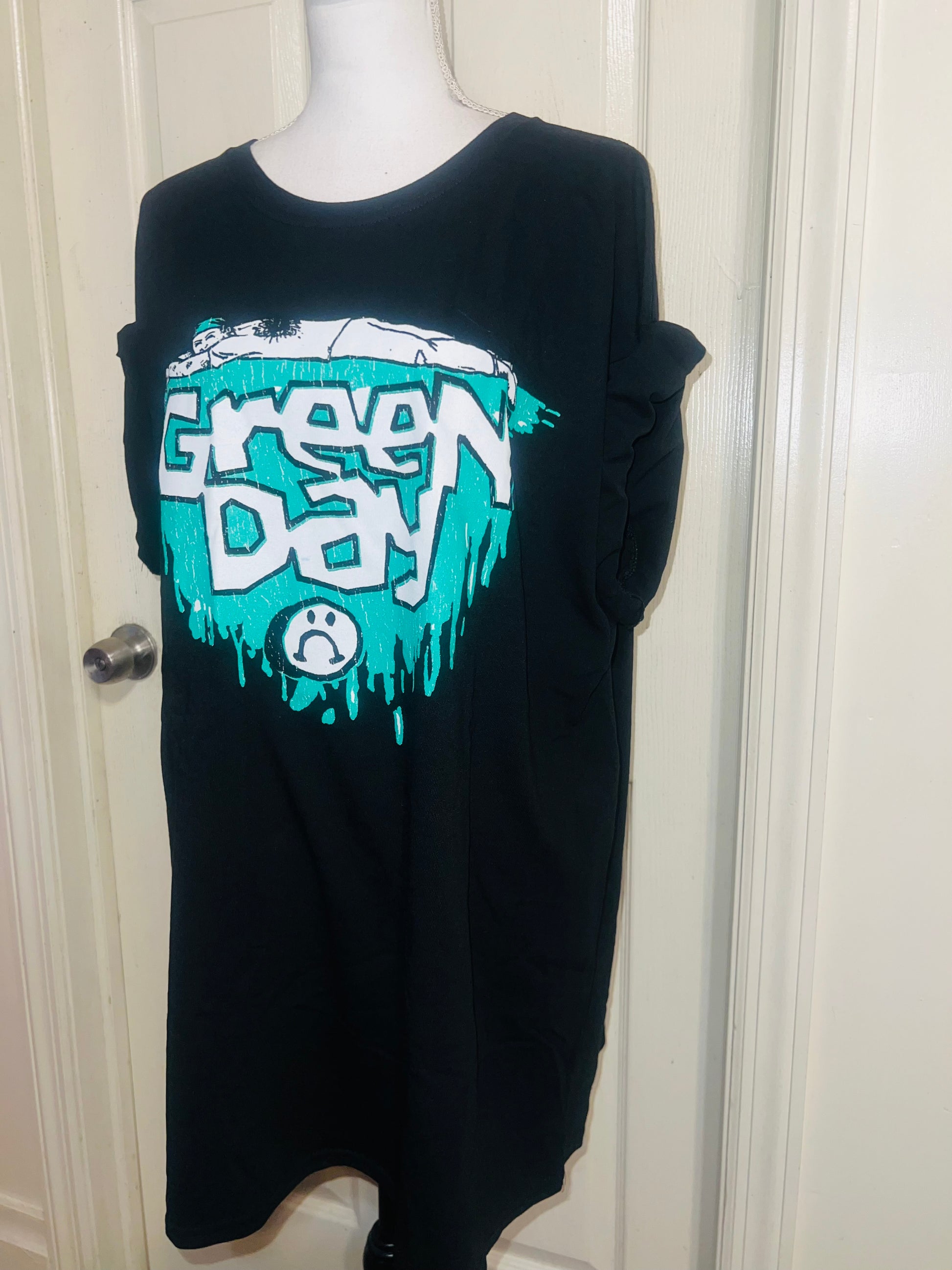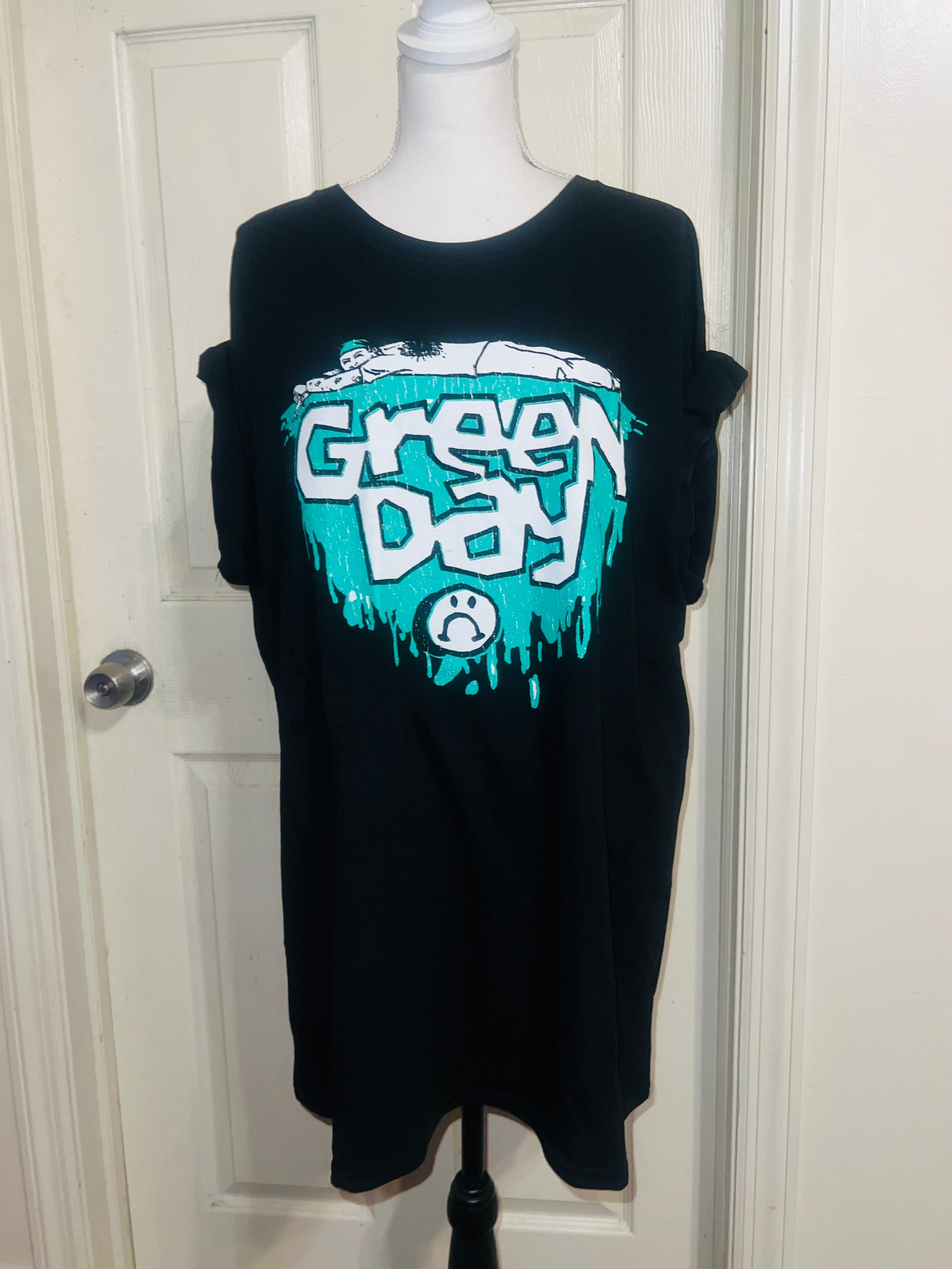 This is a preorder. Please allow extra processing time A black Green Day tee with a cool graphic with the green slime and sad smiley. It’s soft and an oversized XXL. Could work like a dress for those who love that depending on height.