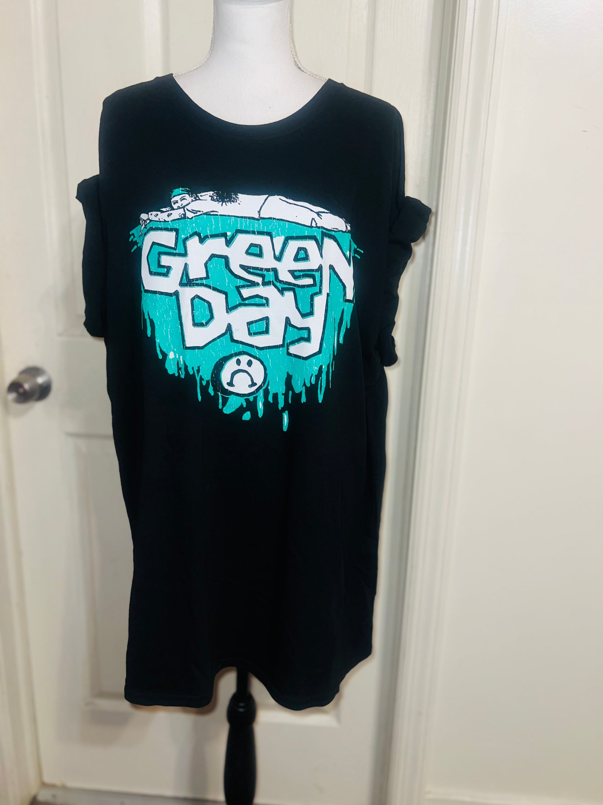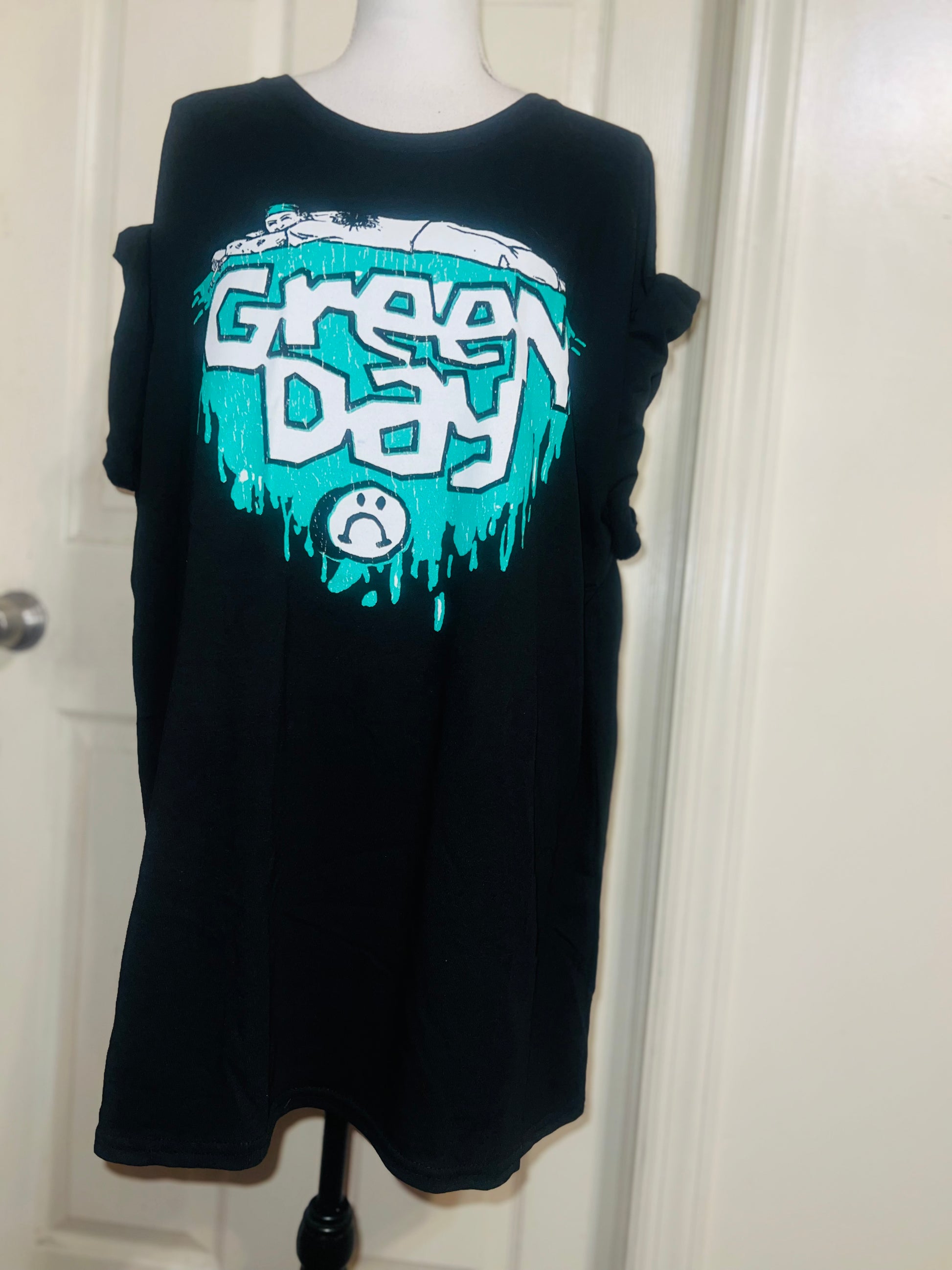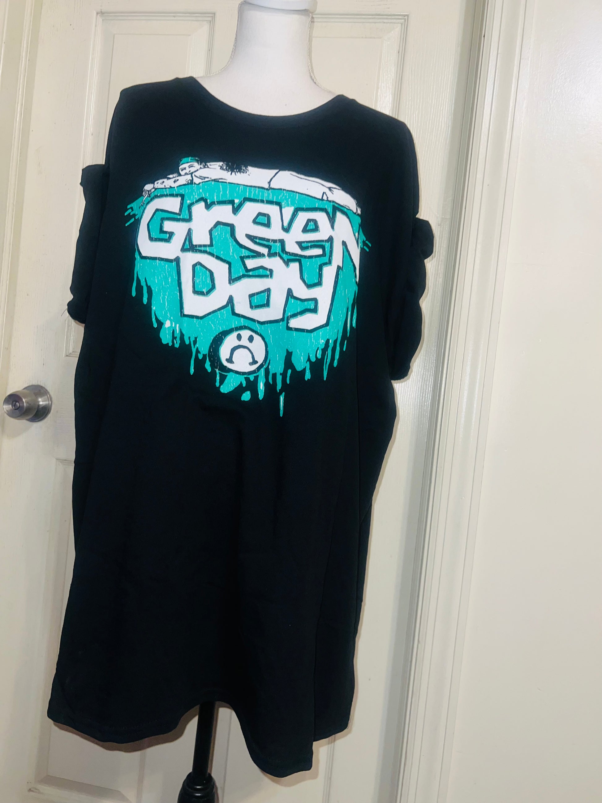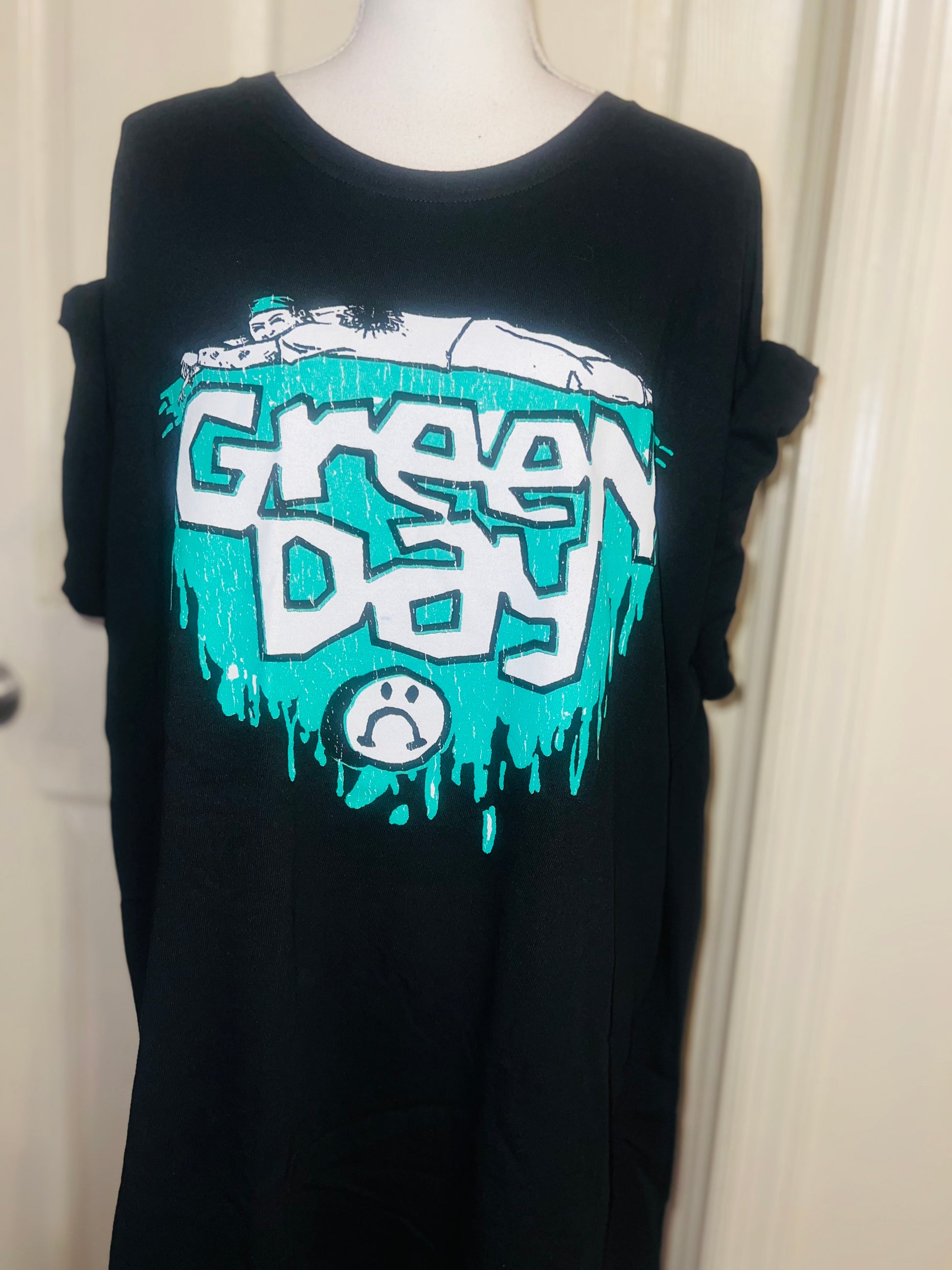 This is a preorder. Please allow extra processing time A black Green Day tee with a cool graphic with the green slime and sad smiley. It’s soft and an oversized XXL. Could work like a dress for those who love that depending on height.