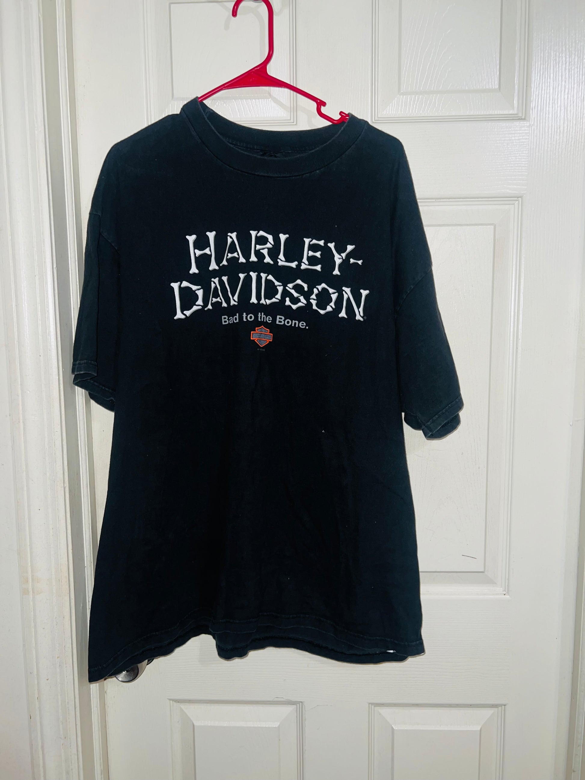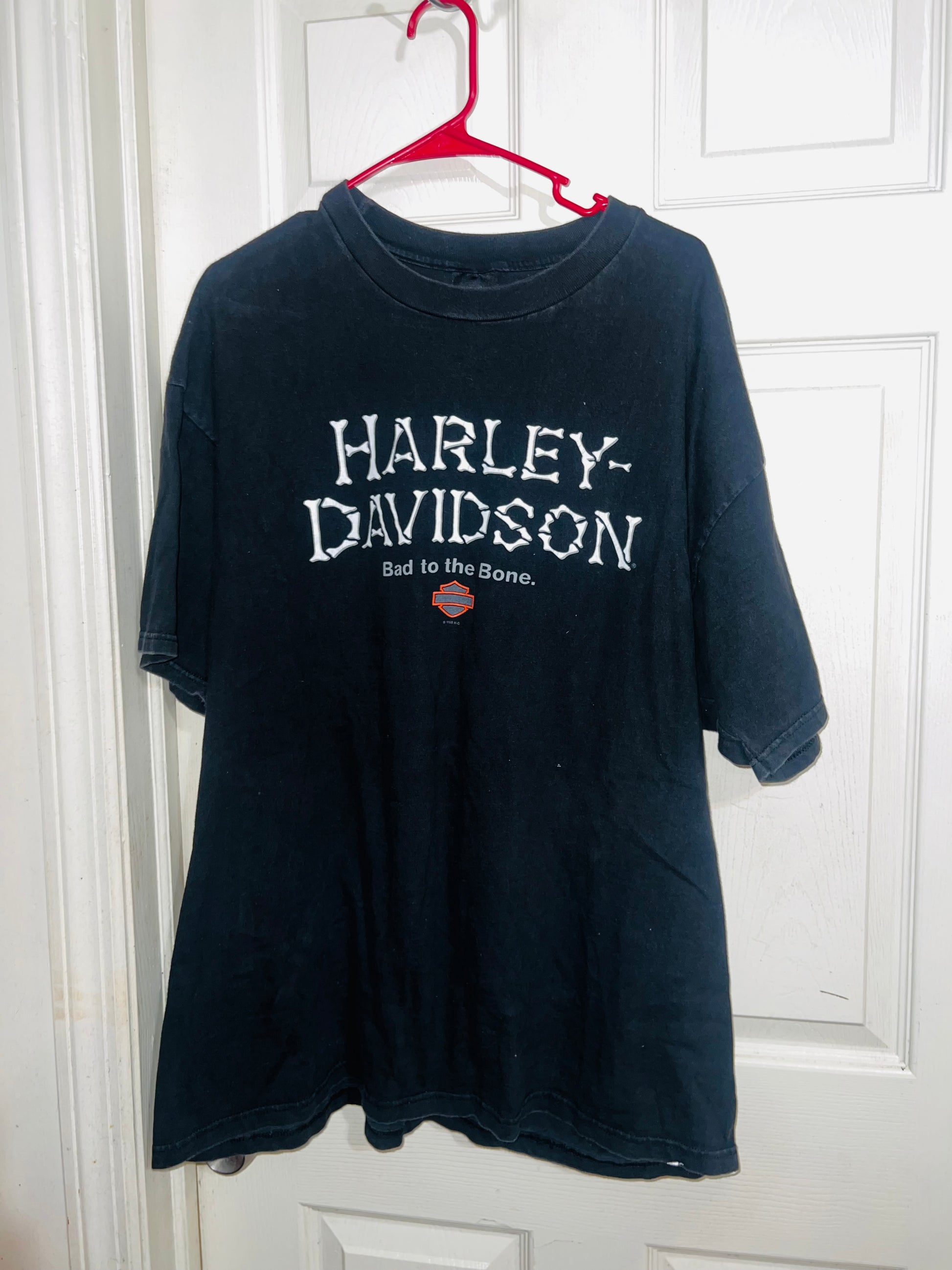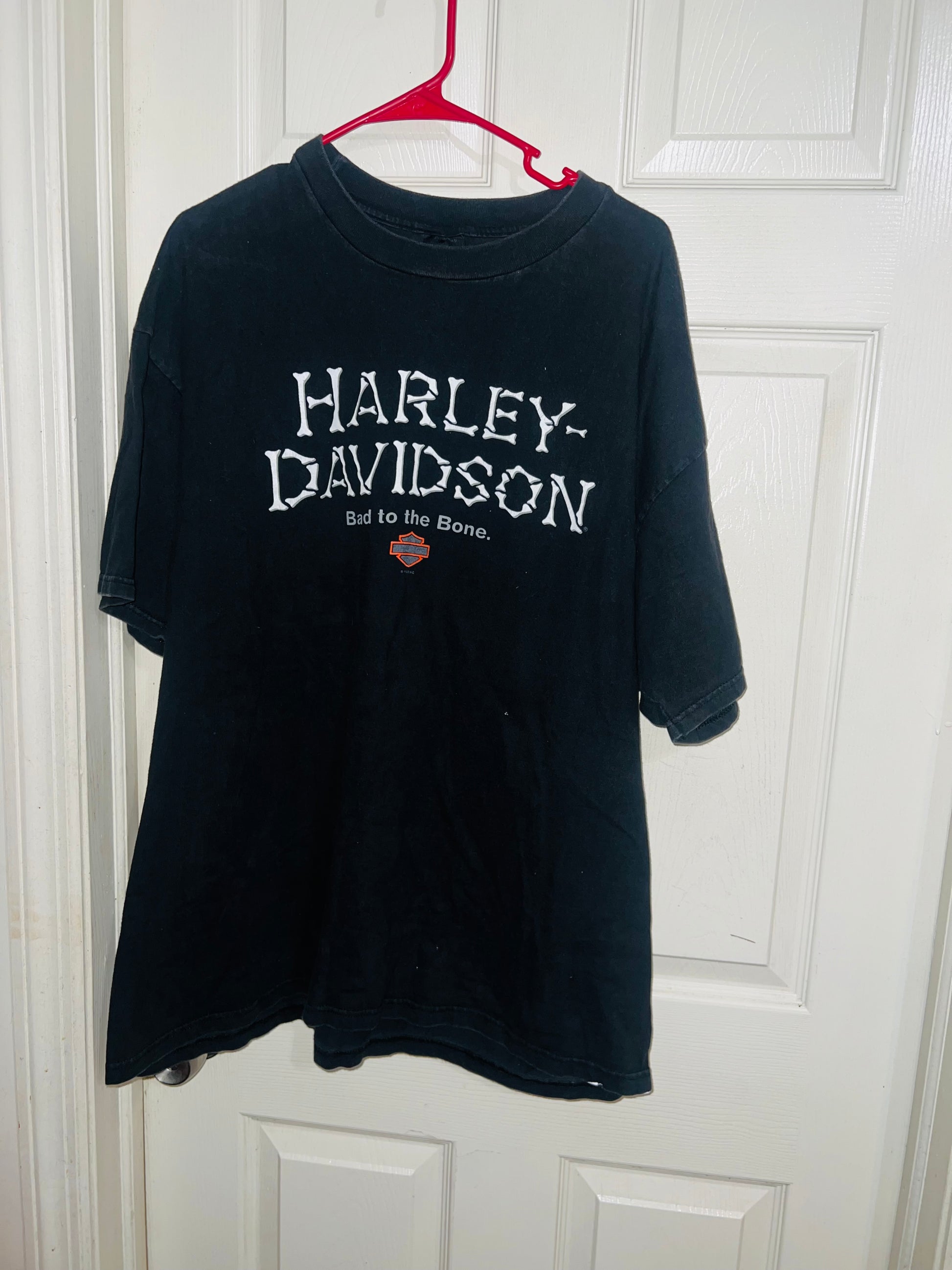 A vintage black double sided Harley Davidson “bad to the bone” with bone writing oversized tee from Charlotte, North Carolina. I LOVE this one! Size XL, oversized.