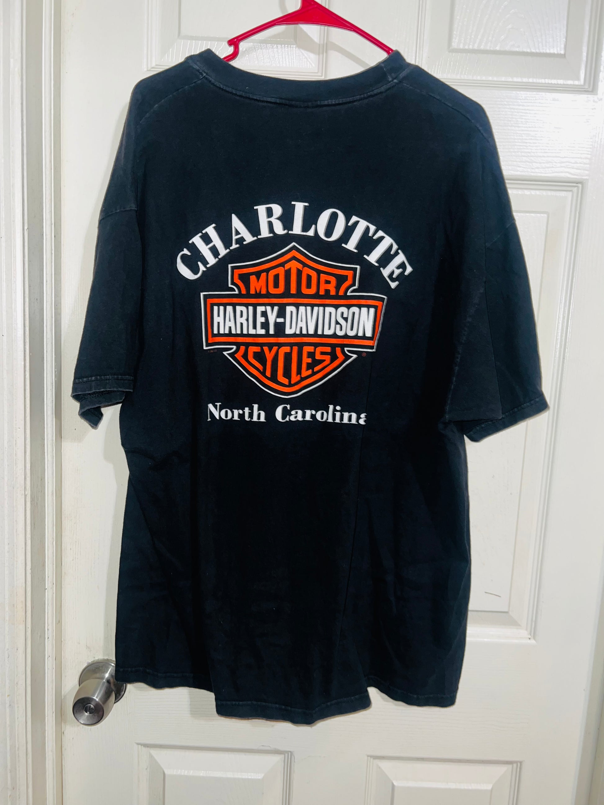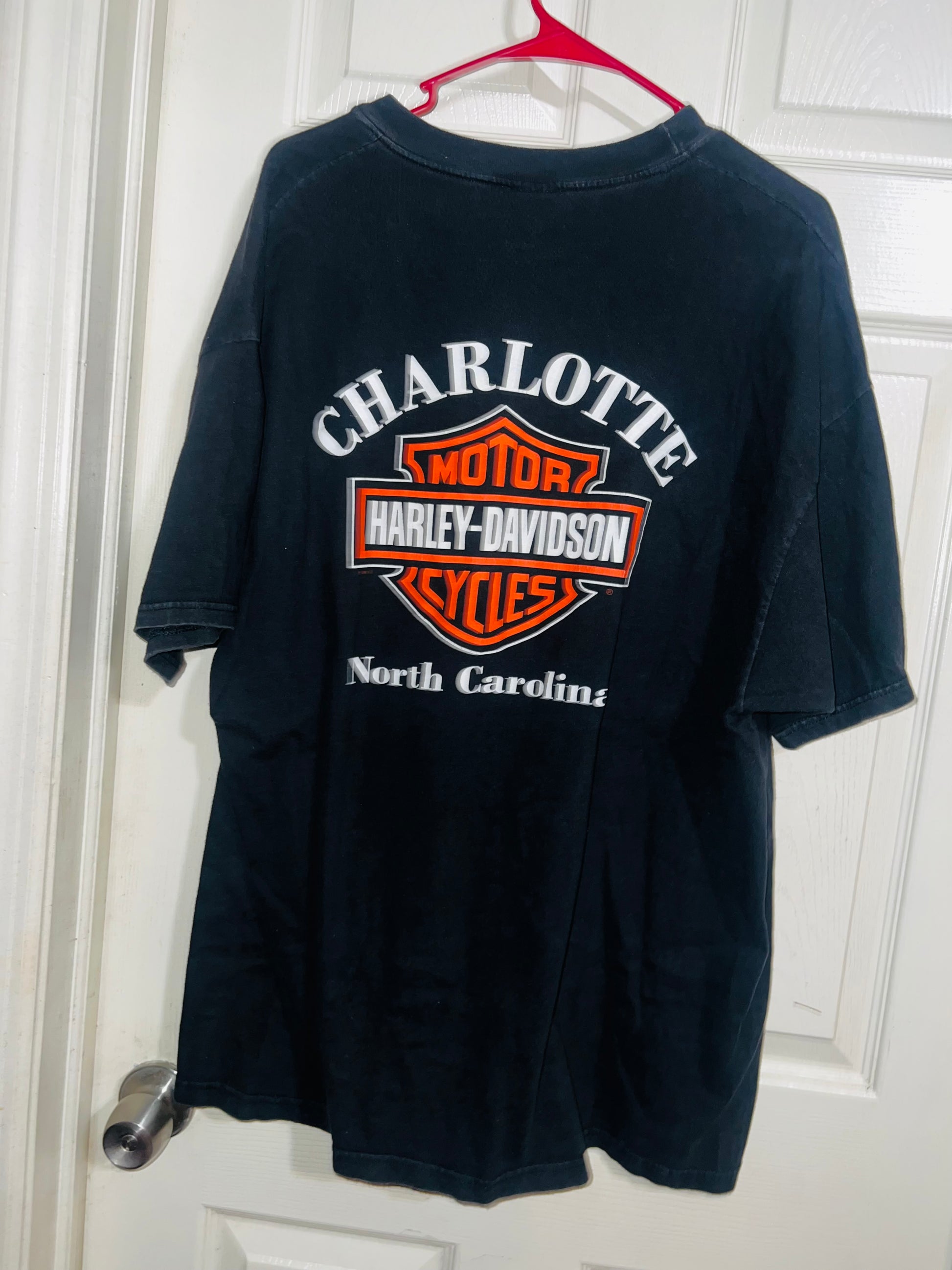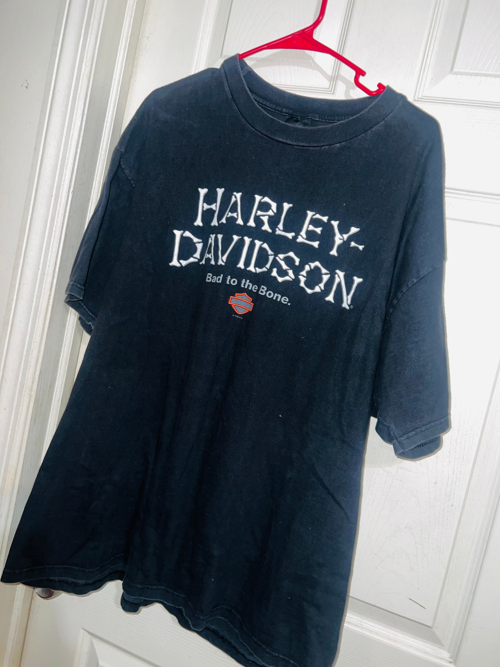 A vintage black double sided Harley Davidson “bad to the bone” with bone writing oversized tee from Charlotte, North Carolina. I LOVE this one! Size XL, oversized.