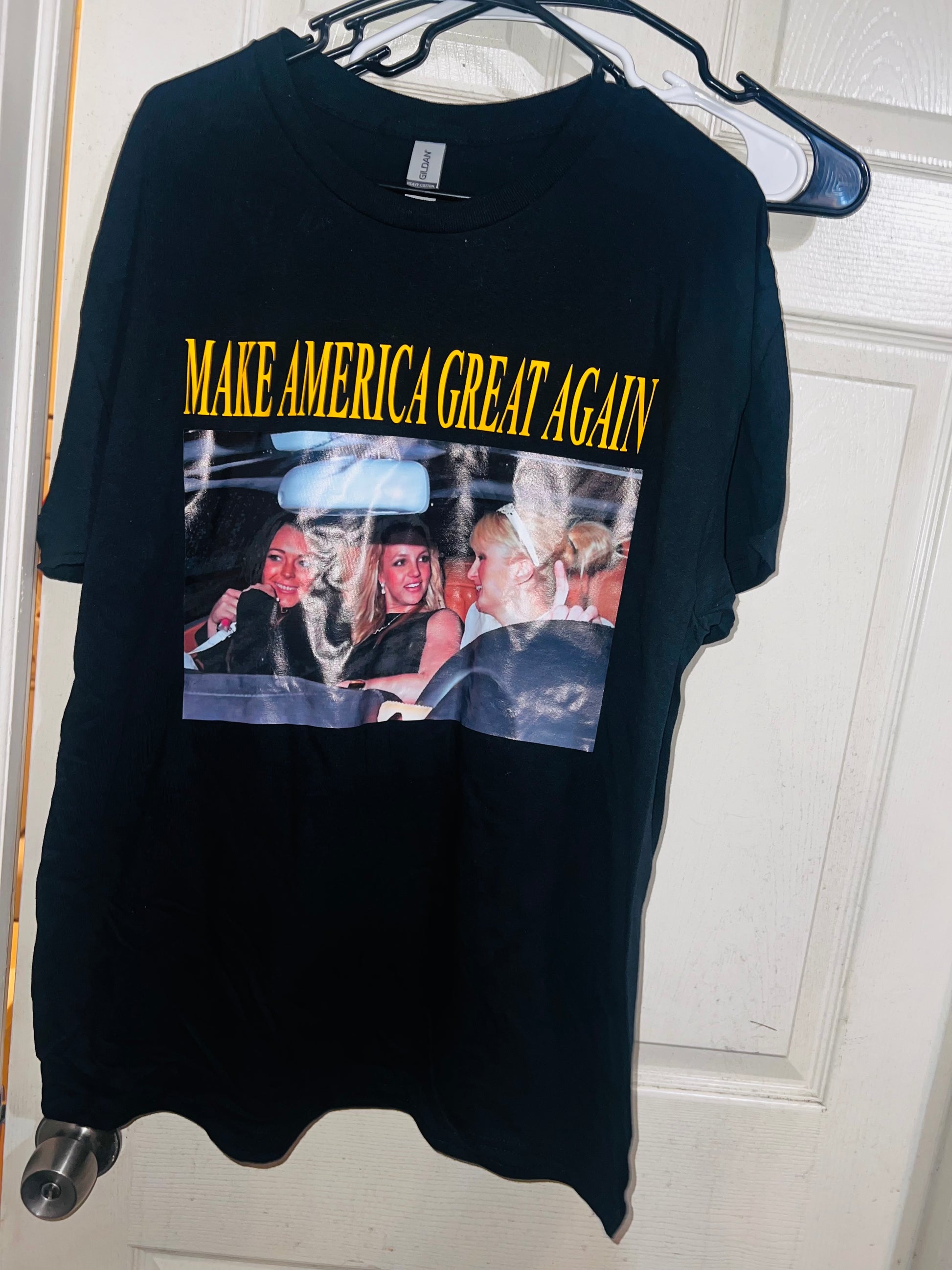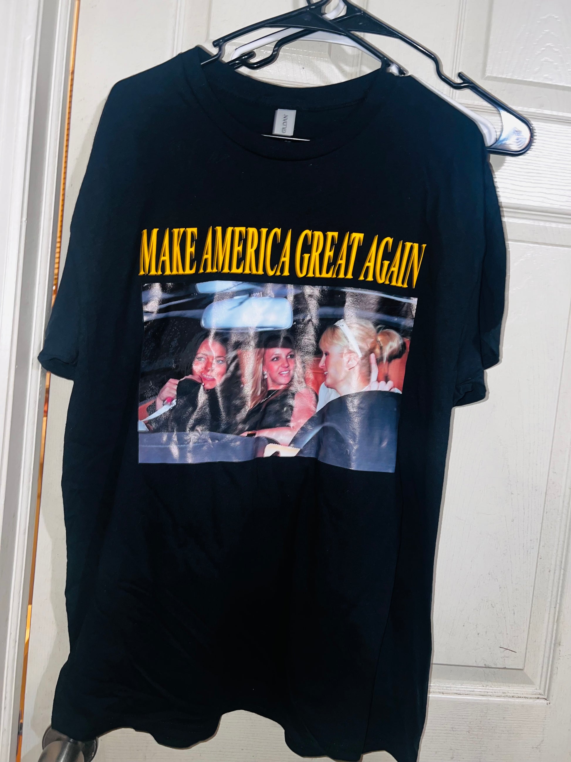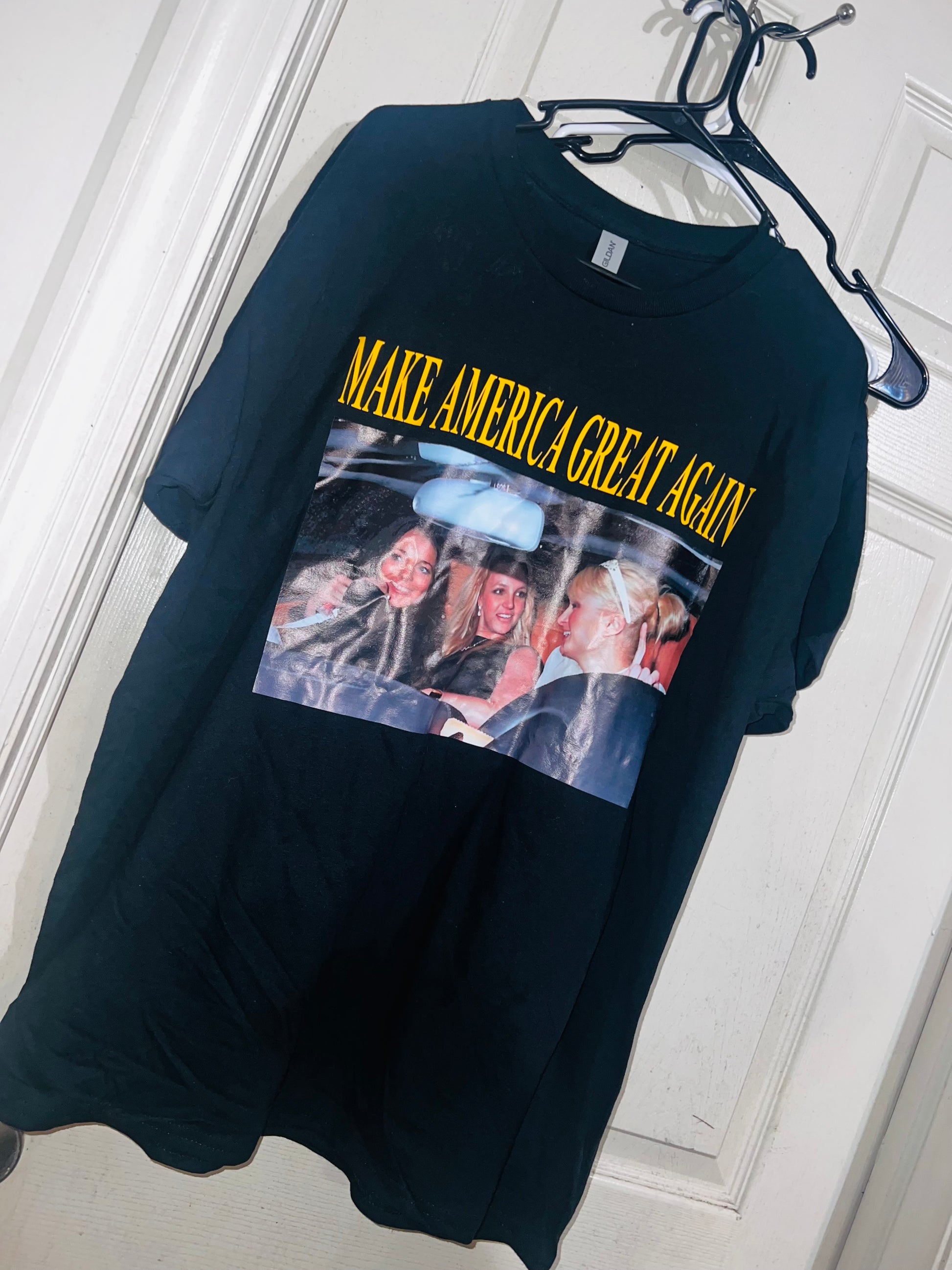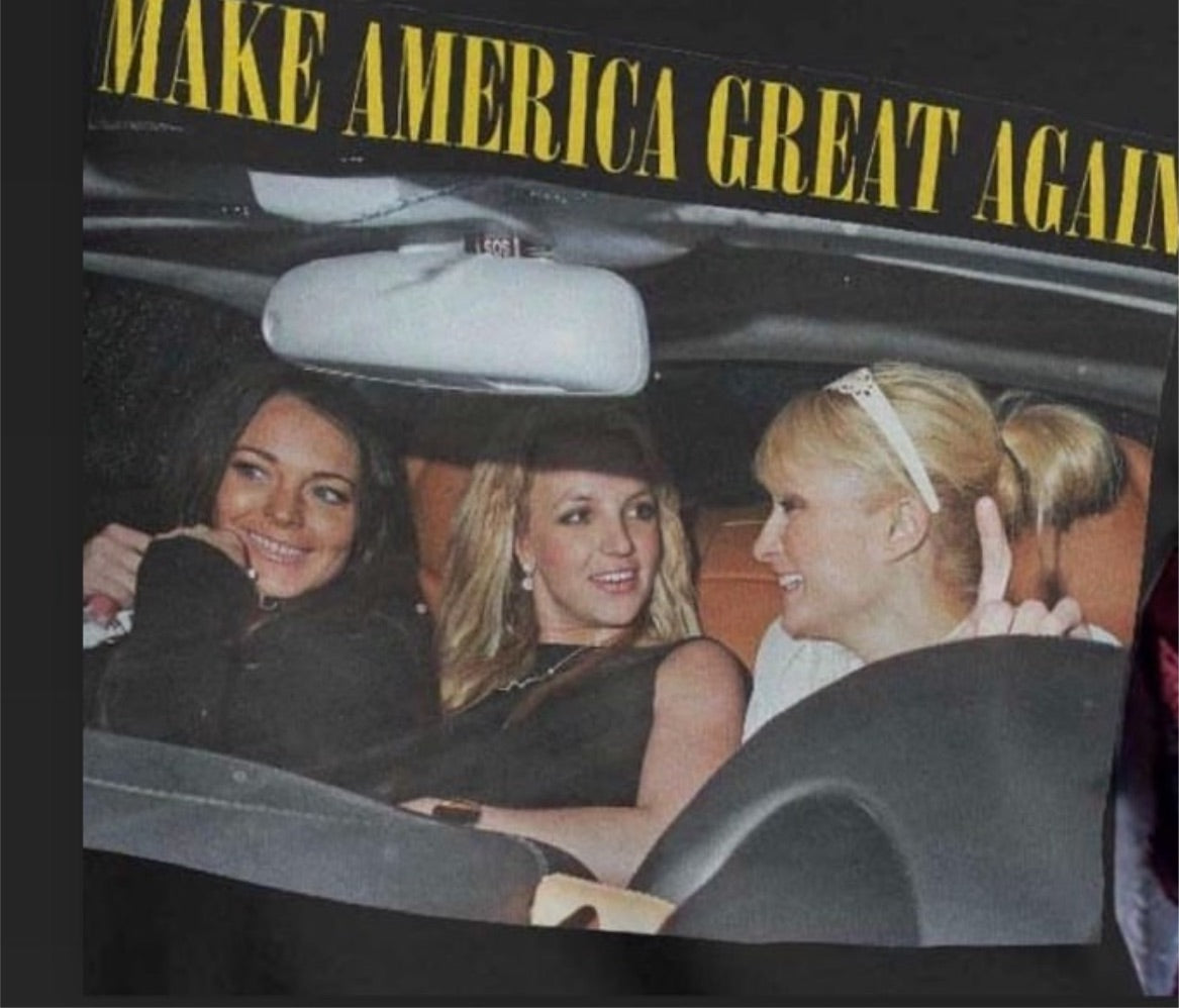 They’re back! This shirt has the holy Trinity - Britney Spears, Lindsay Logan, and Paris Hilton - with the phrase “Make America Great Again.” I sold so many of these and it’s perfect for my pop culture site and lovers!