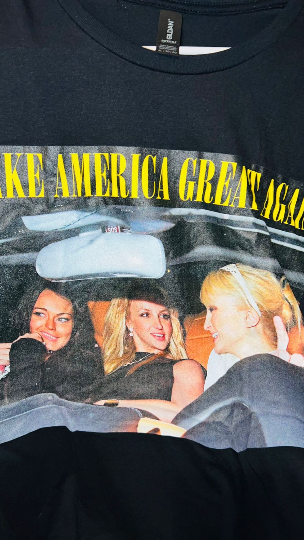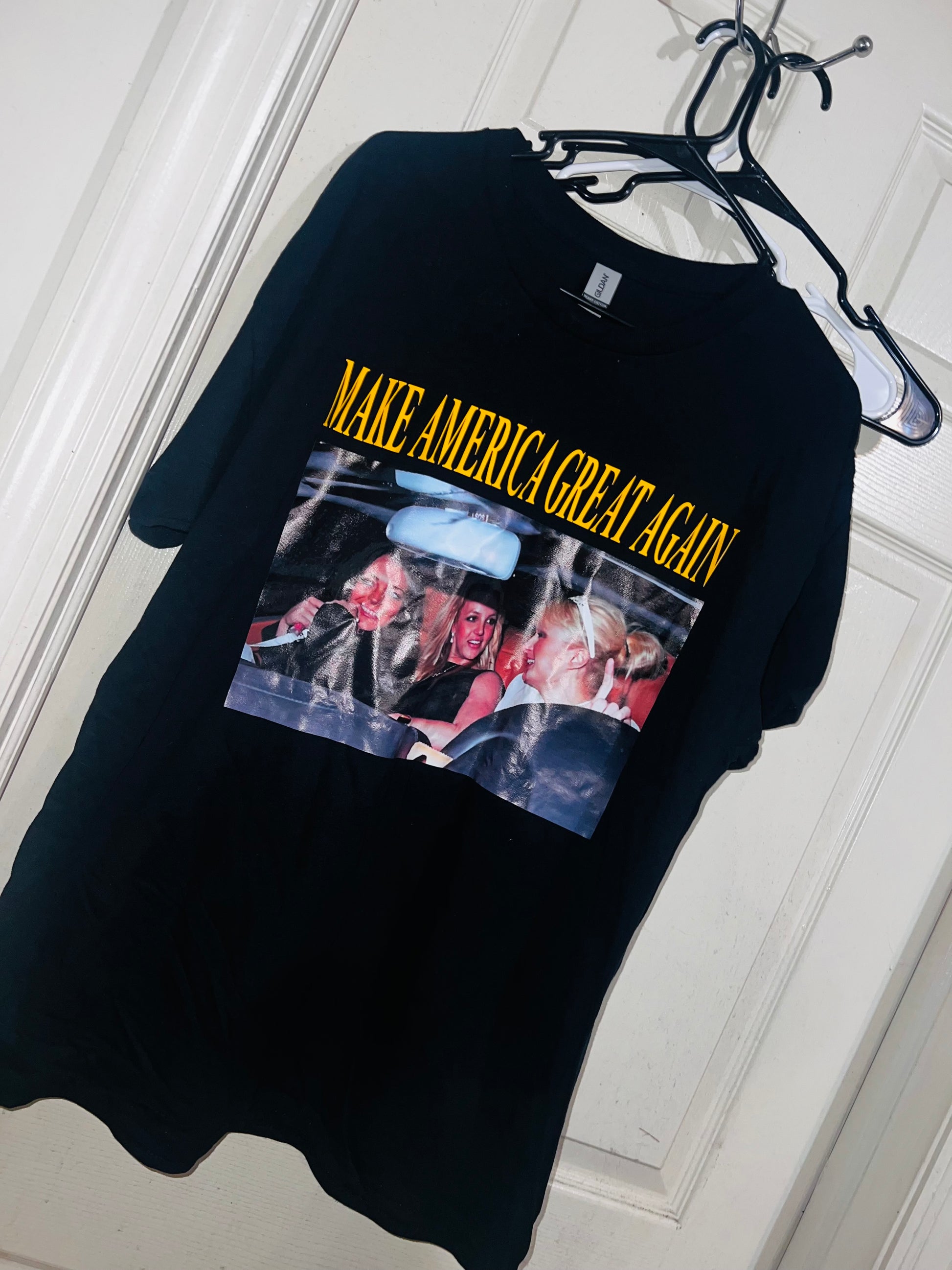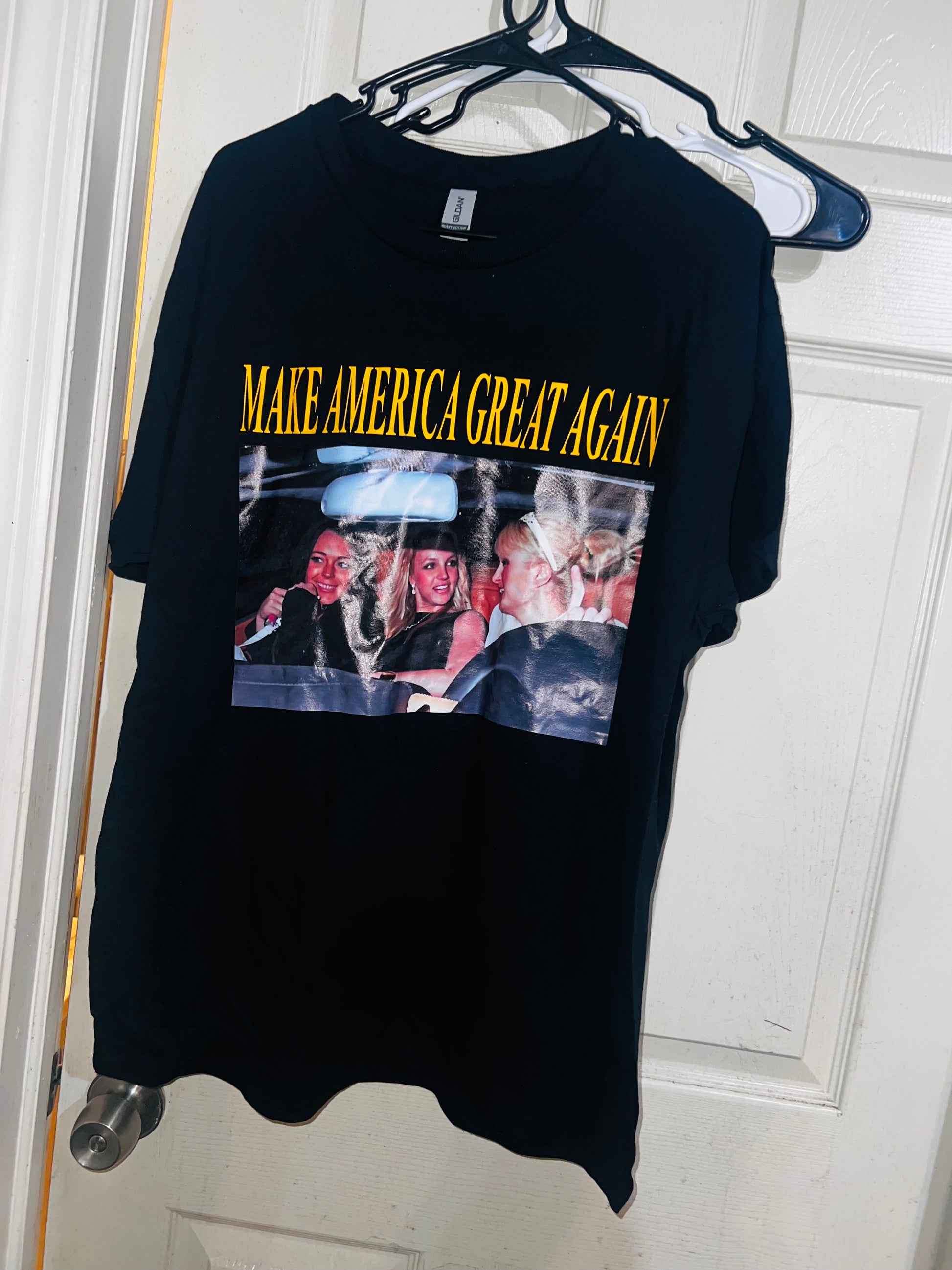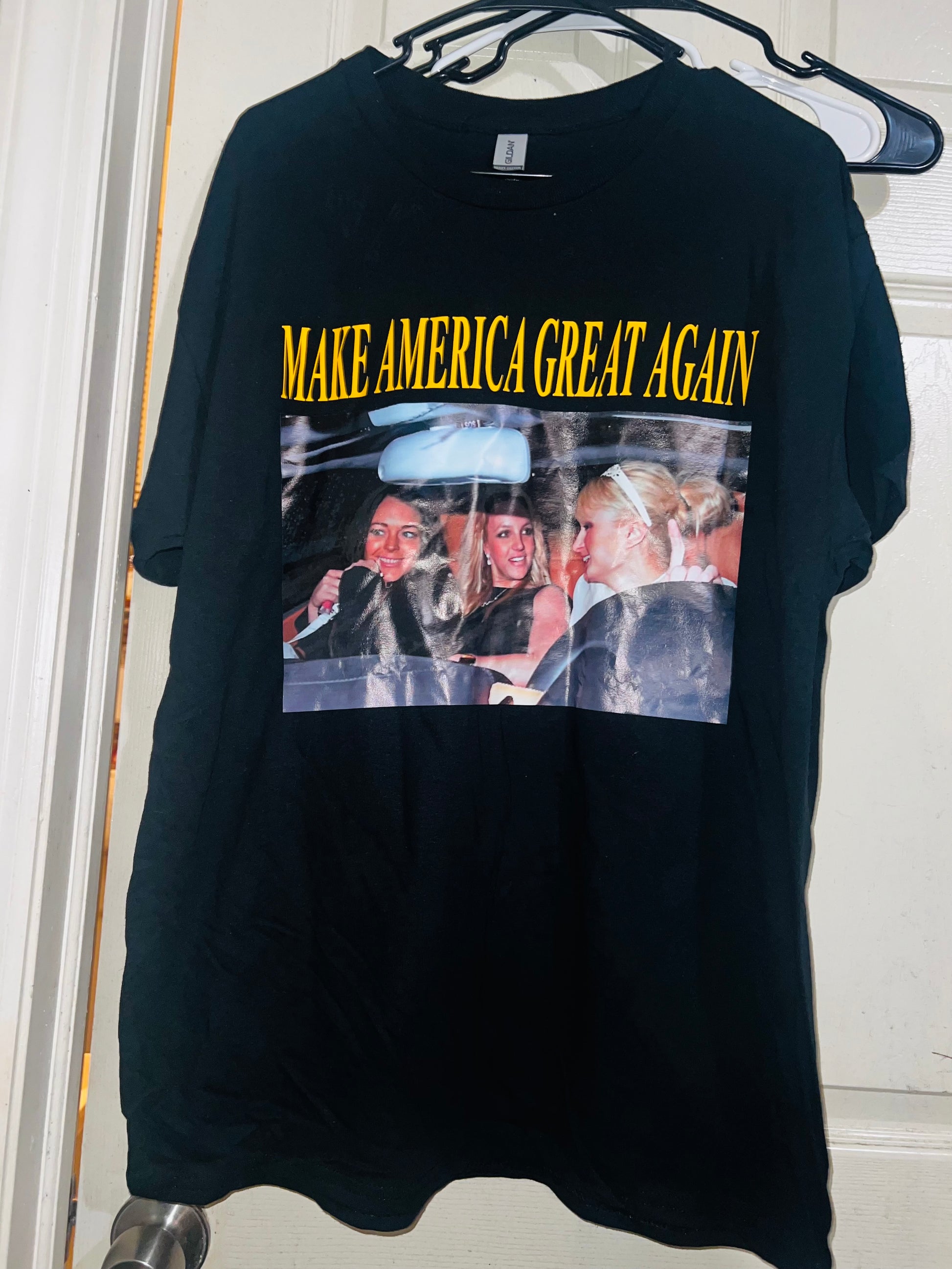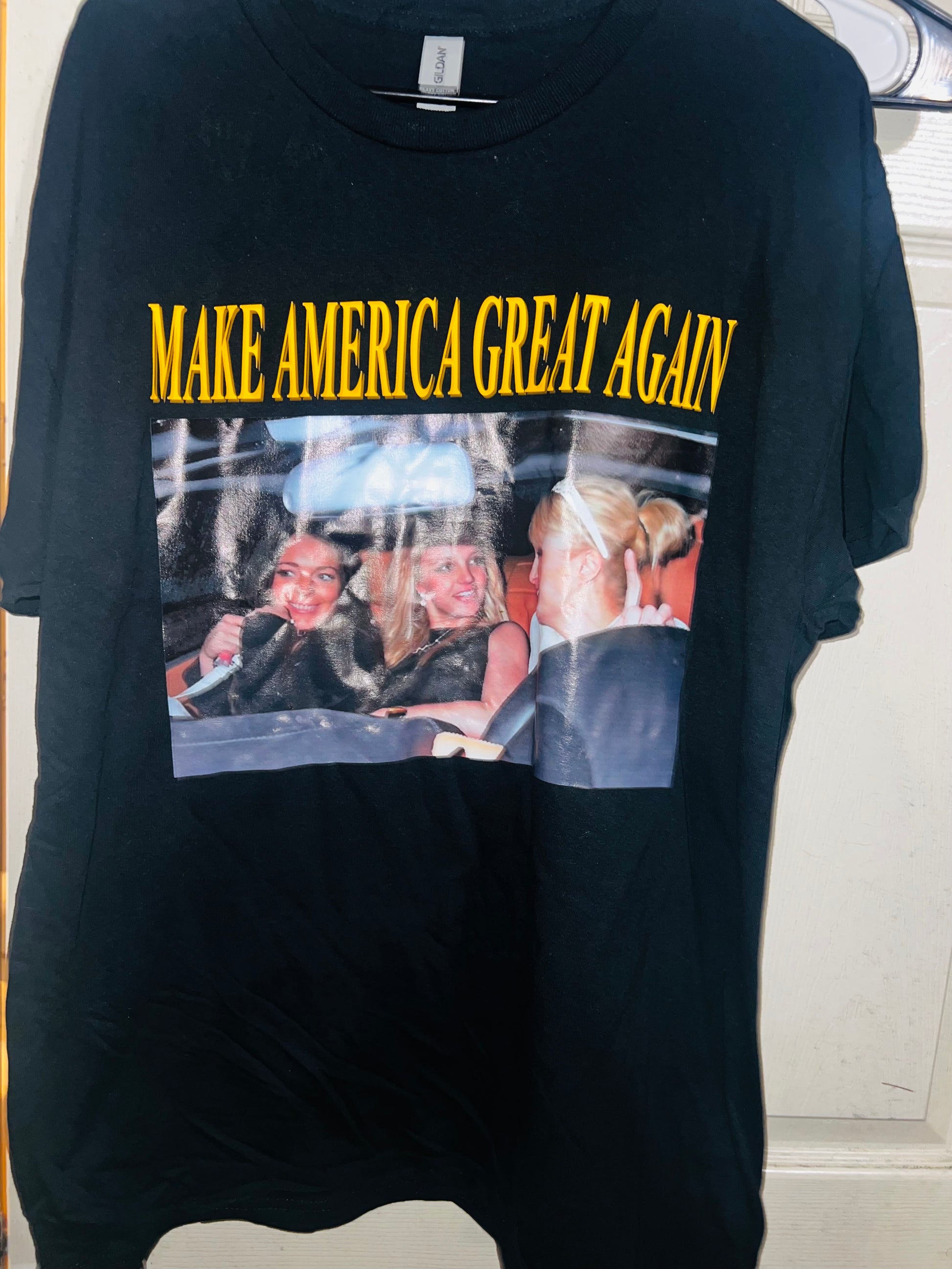 They’re back! This shirt has the holy Trinity - Britney Spears, Lindsay Logan, and Paris Hilton - with the phrase “Make America Great Again.” I sold so many of these and it’s perfect for my pop culture site and lovers!