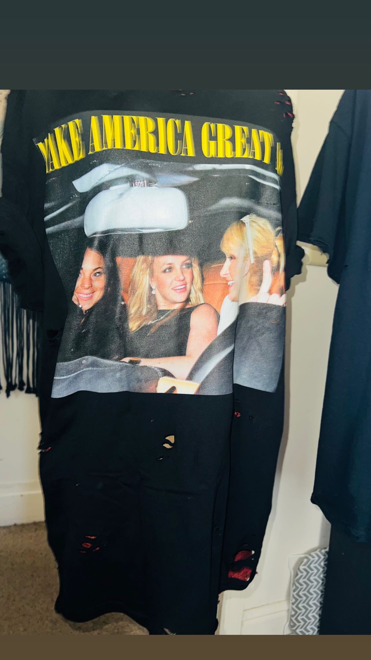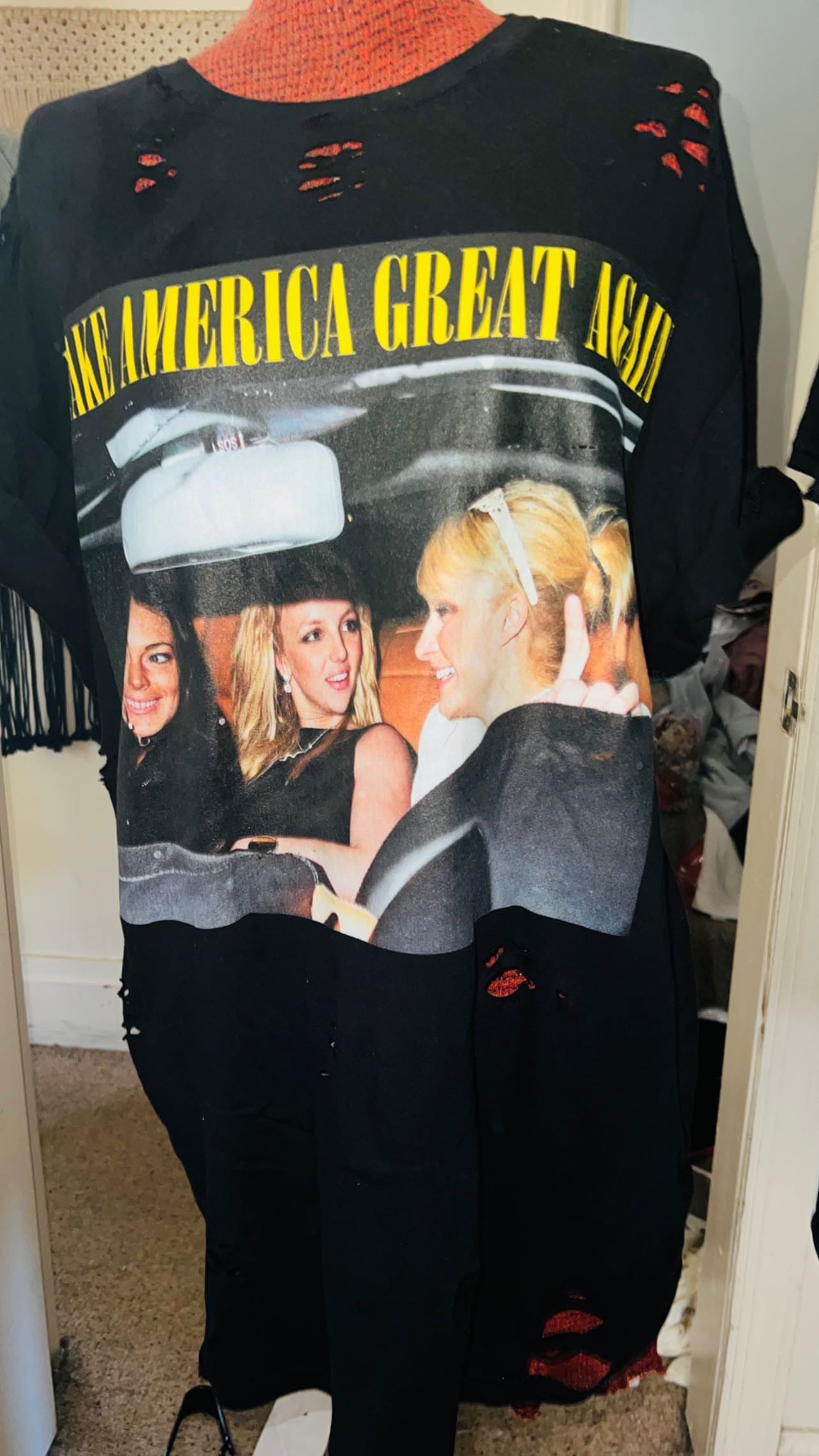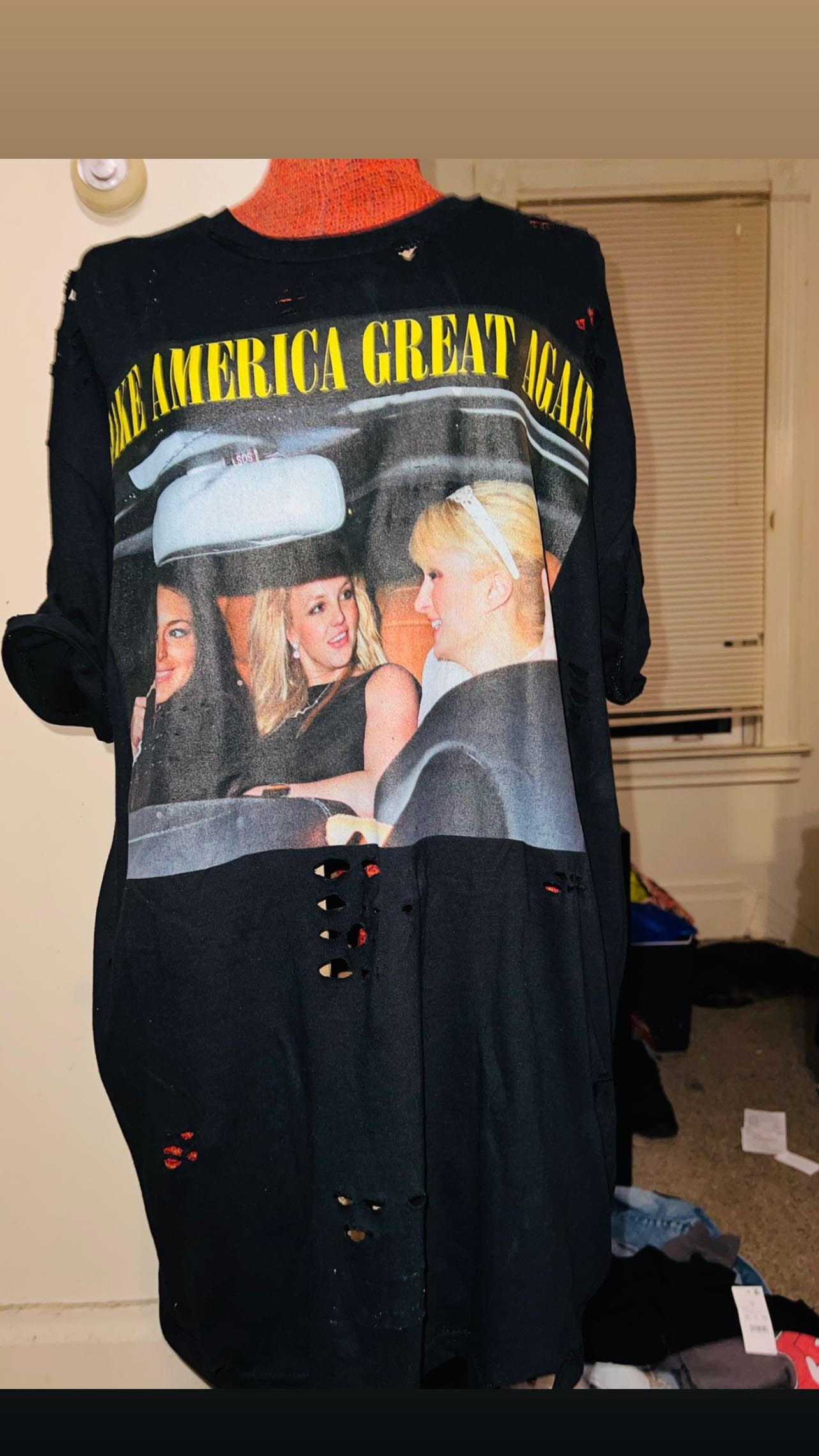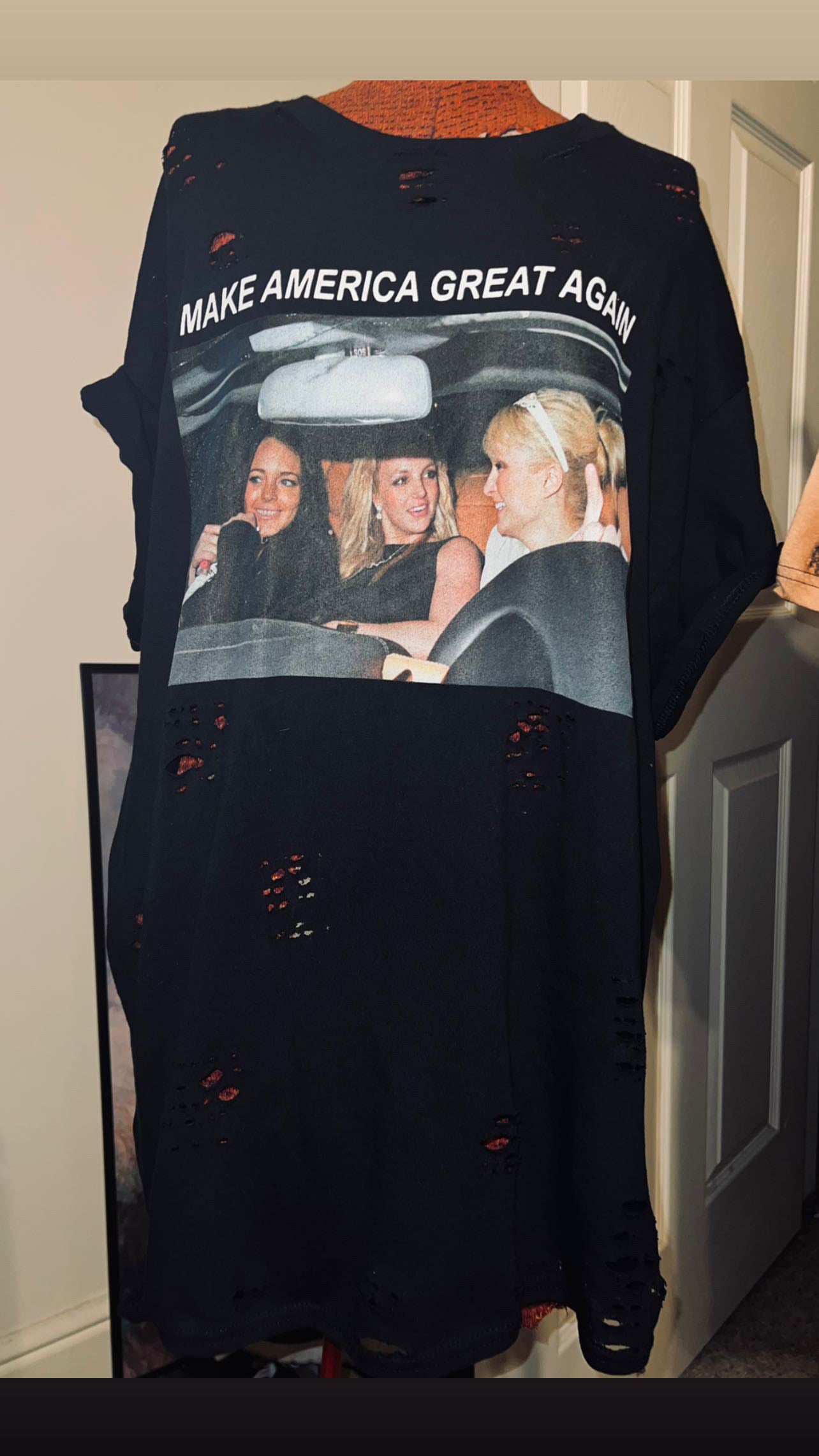 They’re back! This shirt has the holy Trinity - Britney Spears, Lindsay Logan, and Paris Hilton - with the phrase “Make America Great Again.” I sold so many of these and it’s perfect for my pop culture site and lovers!