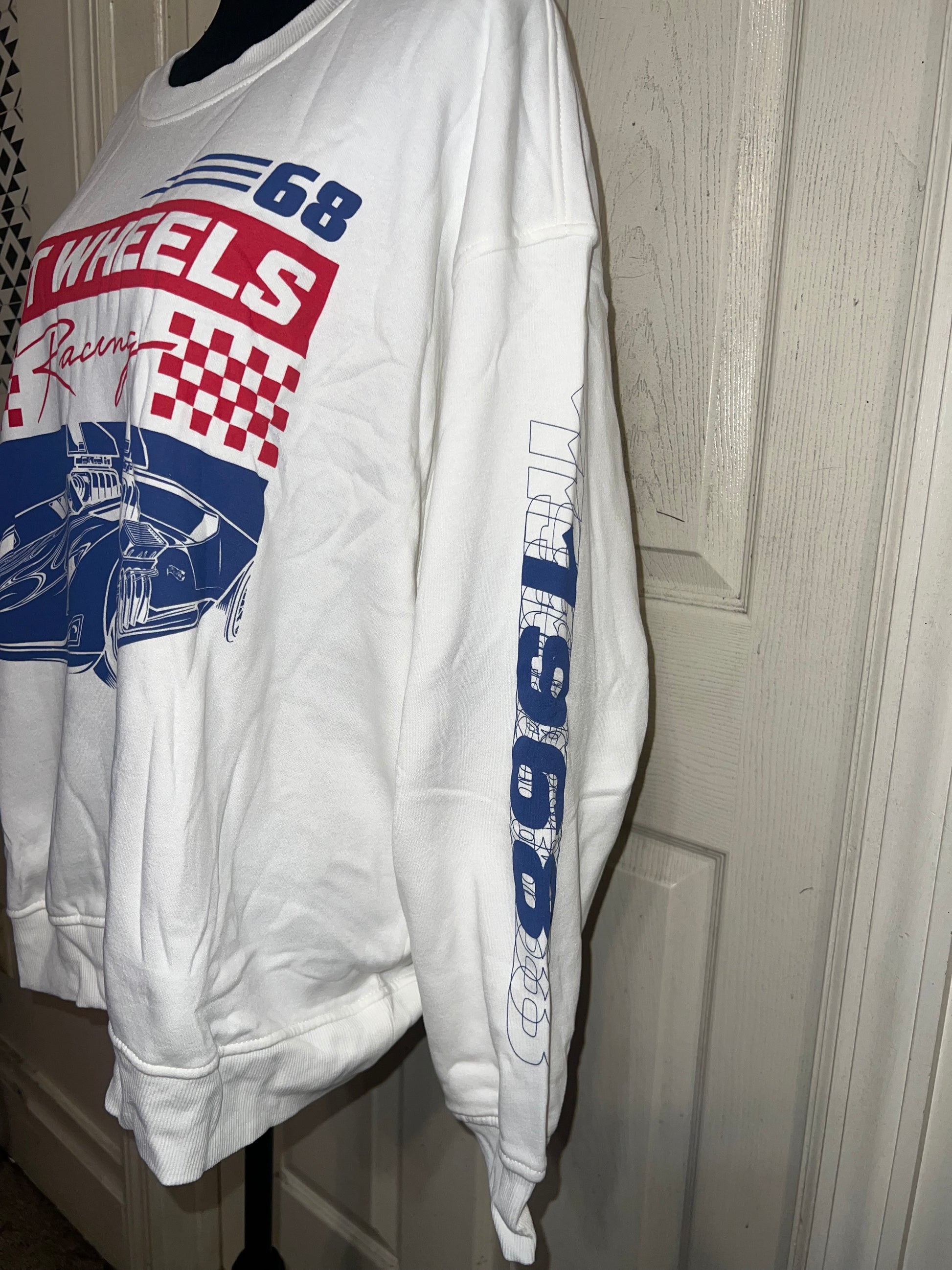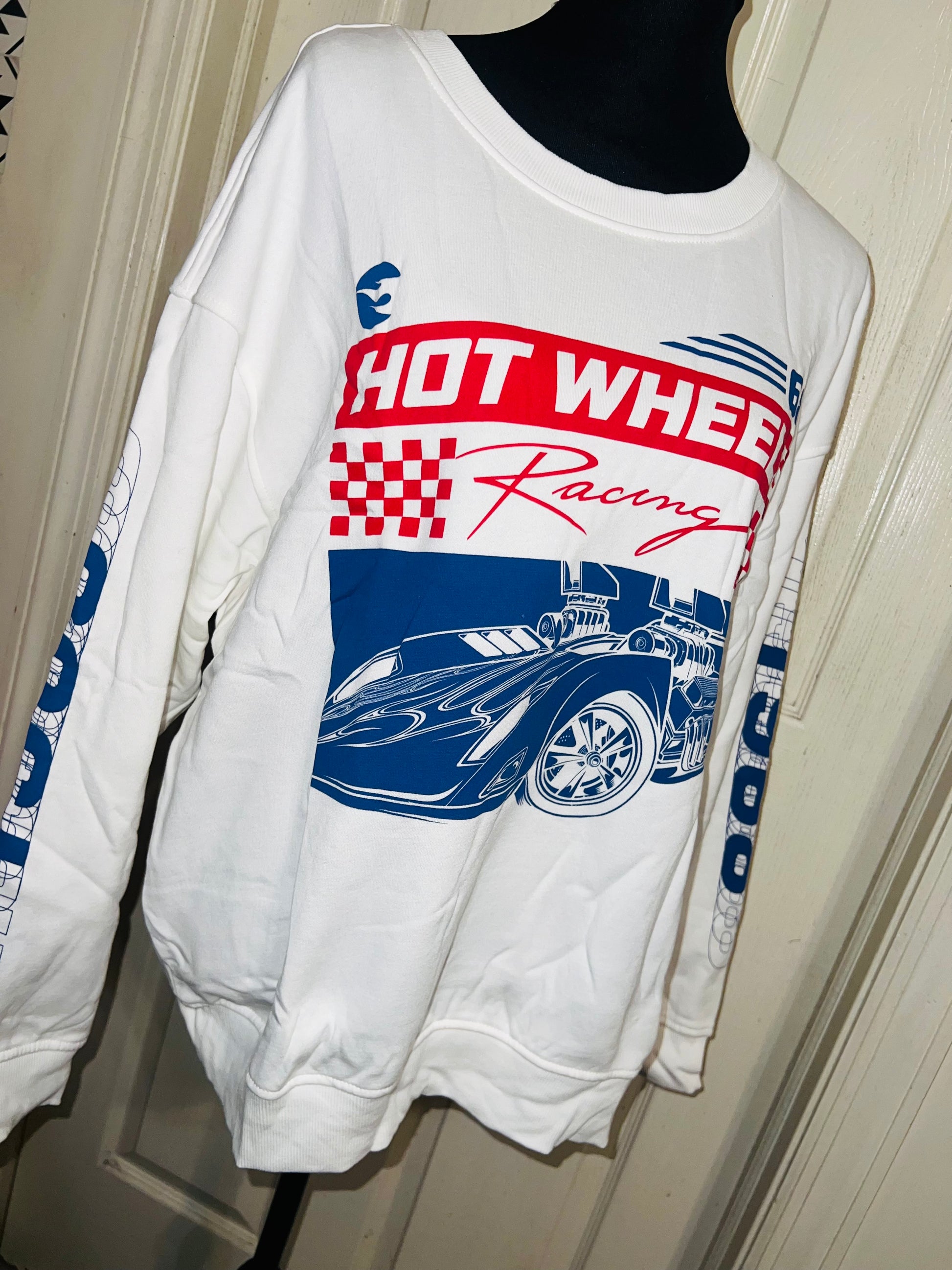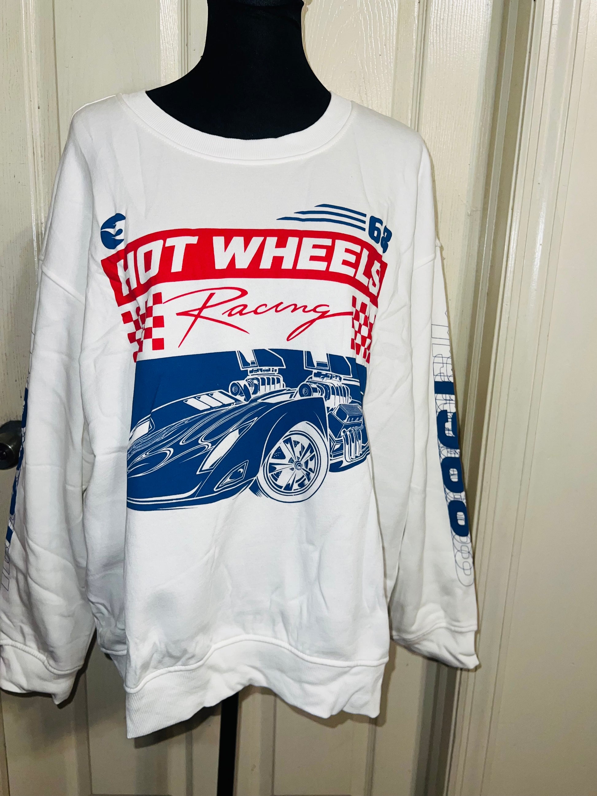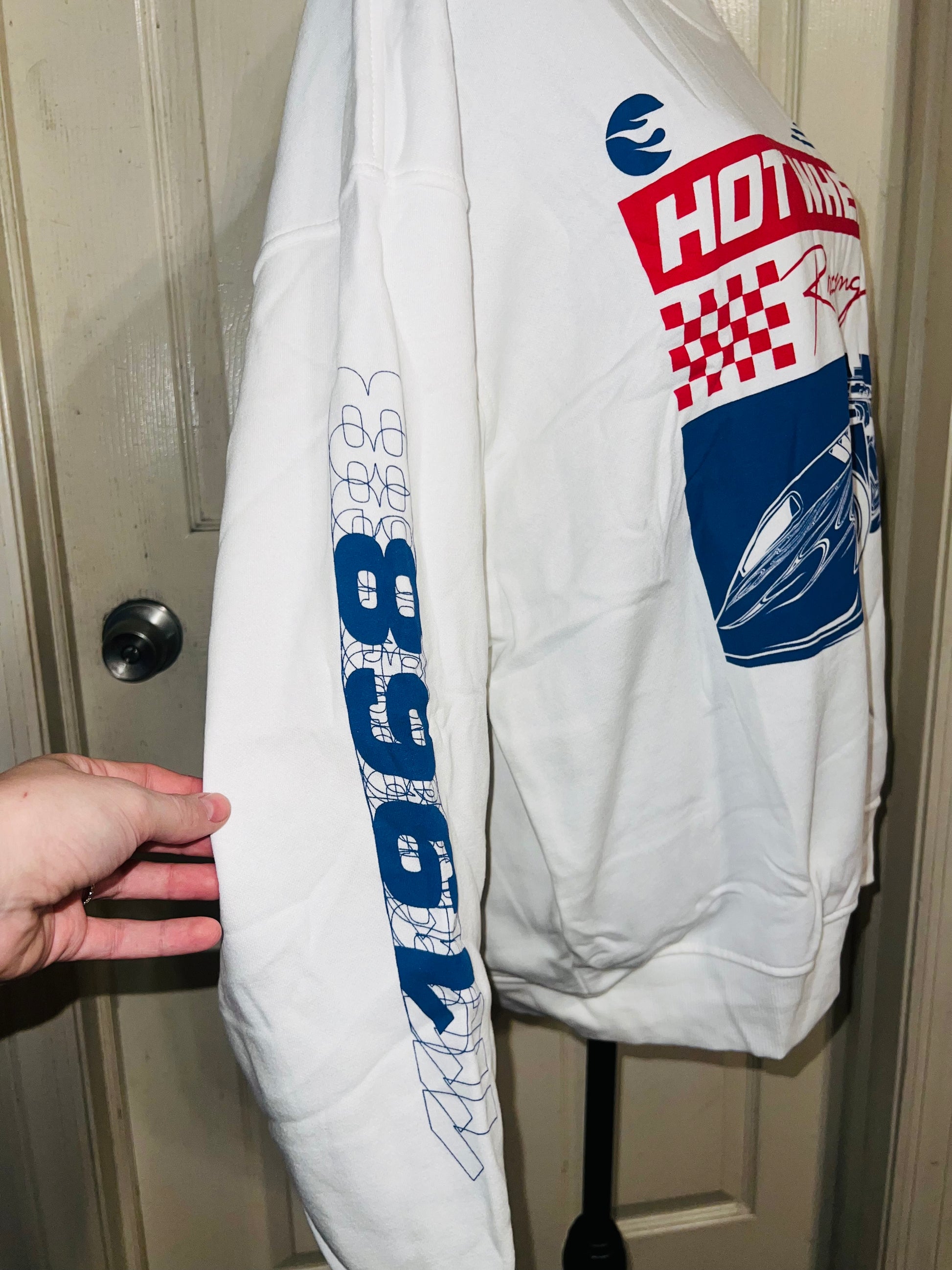 A white Hot Wheel sweatshirt with cool detailing on the sleeve. Super super soft and comfortable. Size XL, oversized.