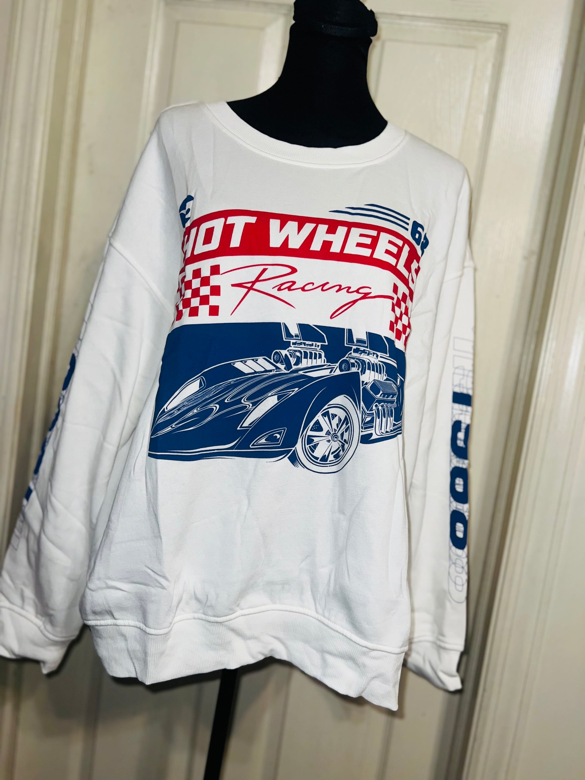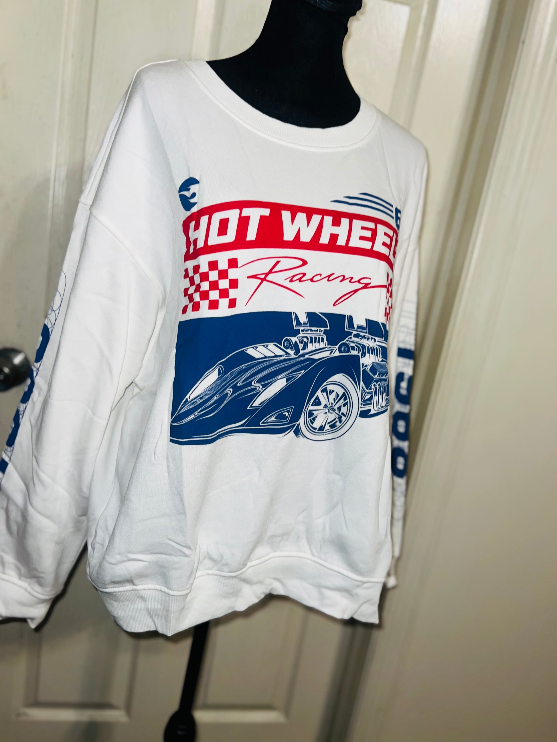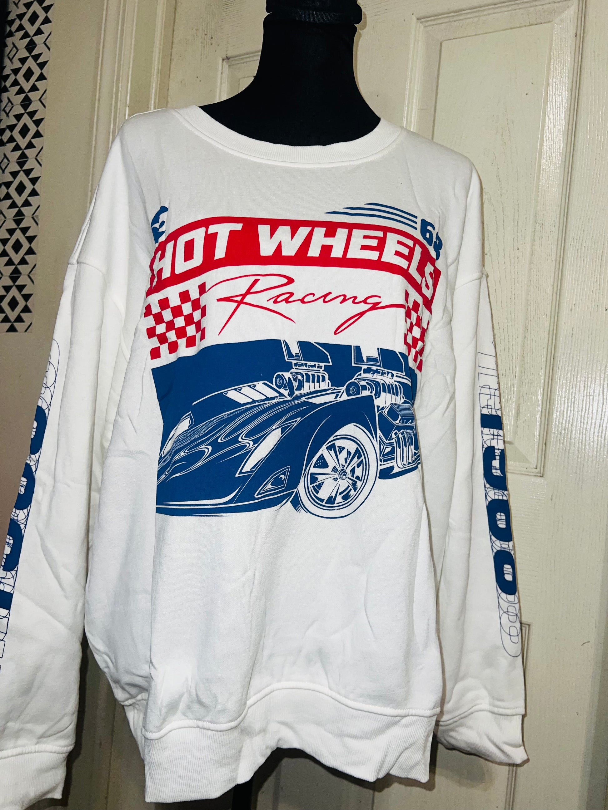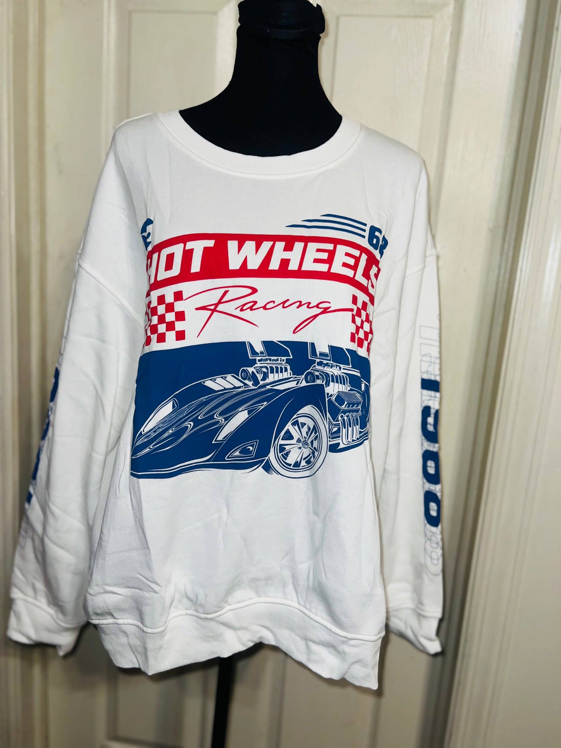 A white Hot Wheel sweatshirt with cool detailing on the sleeve. Super super soft and comfortable. Size XL, oversized.