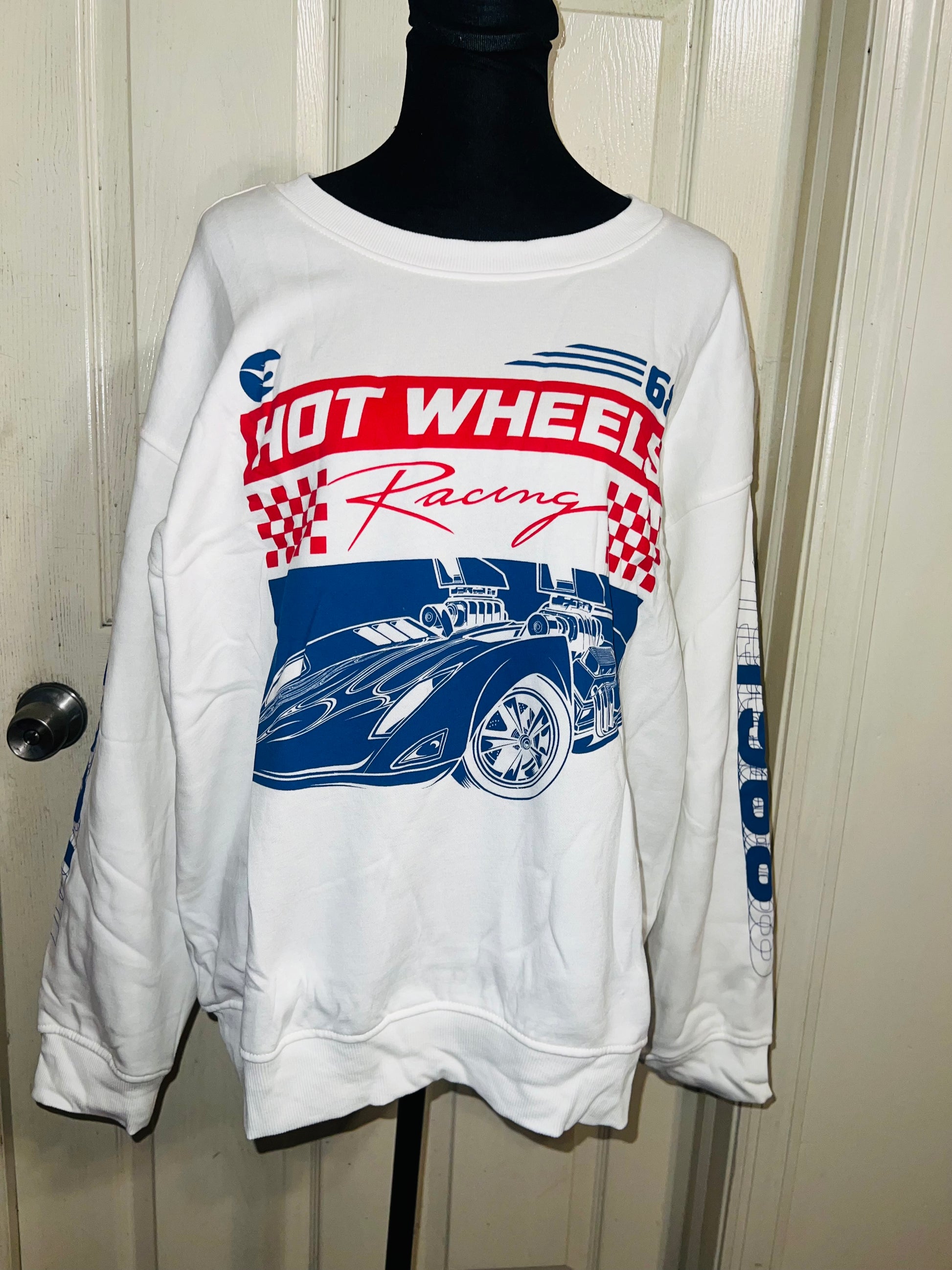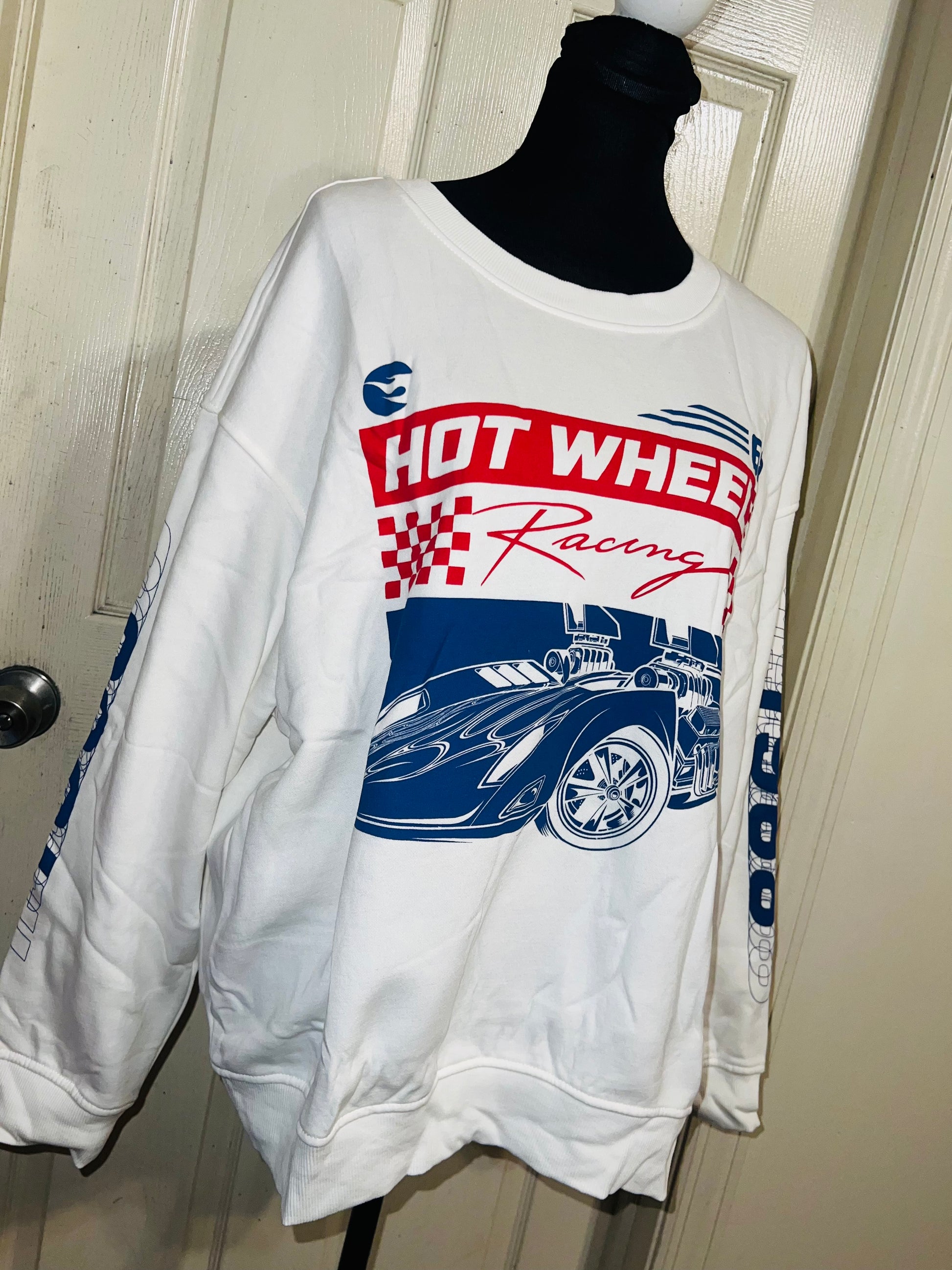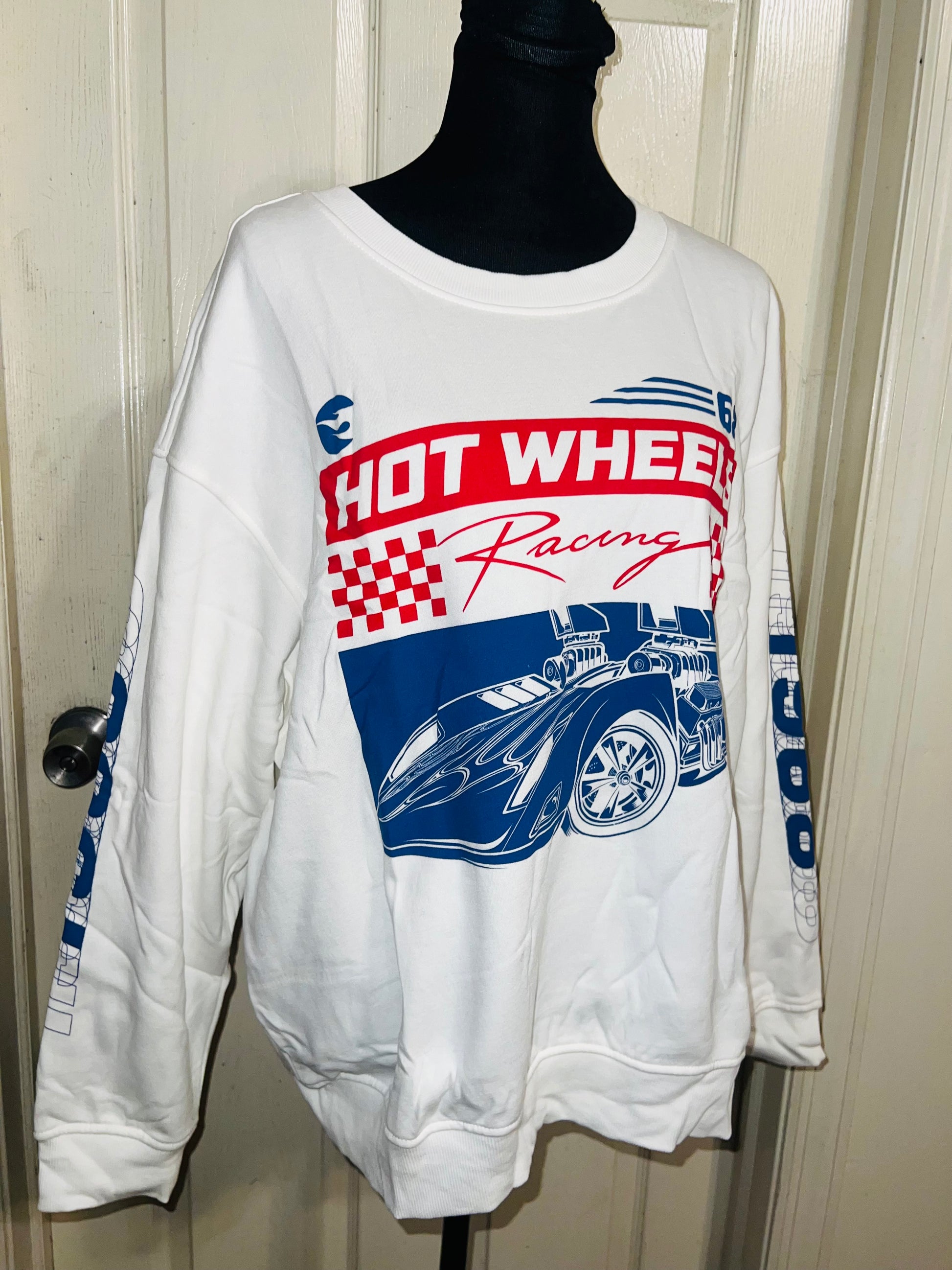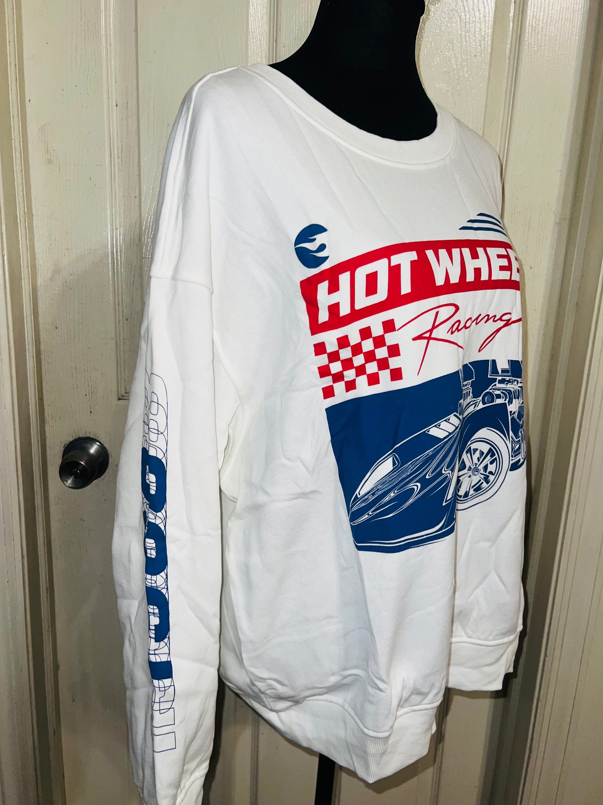 A white Hot Wheel sweatshirt with cool detailing on the sleeve. Super super soft and comfortable. Size XL, oversized.