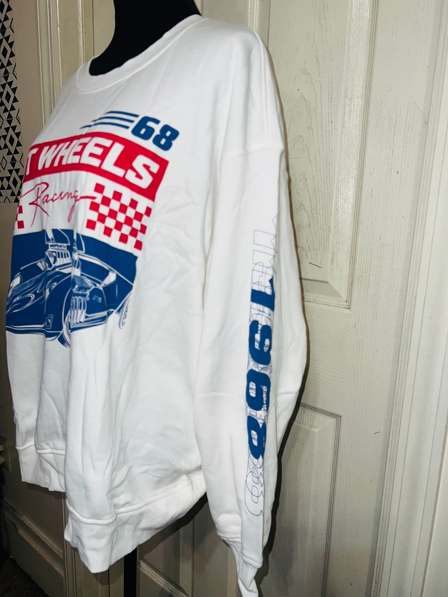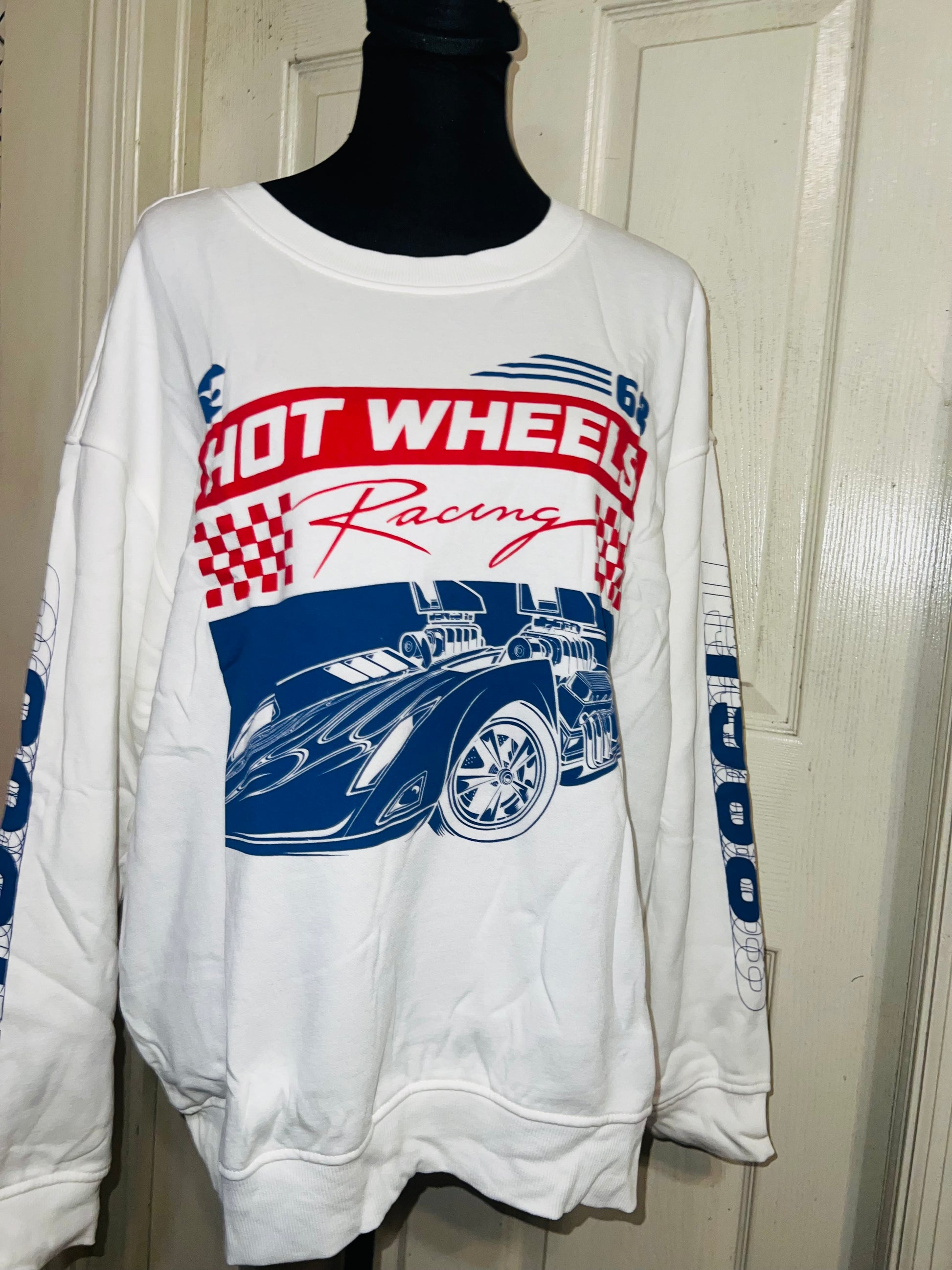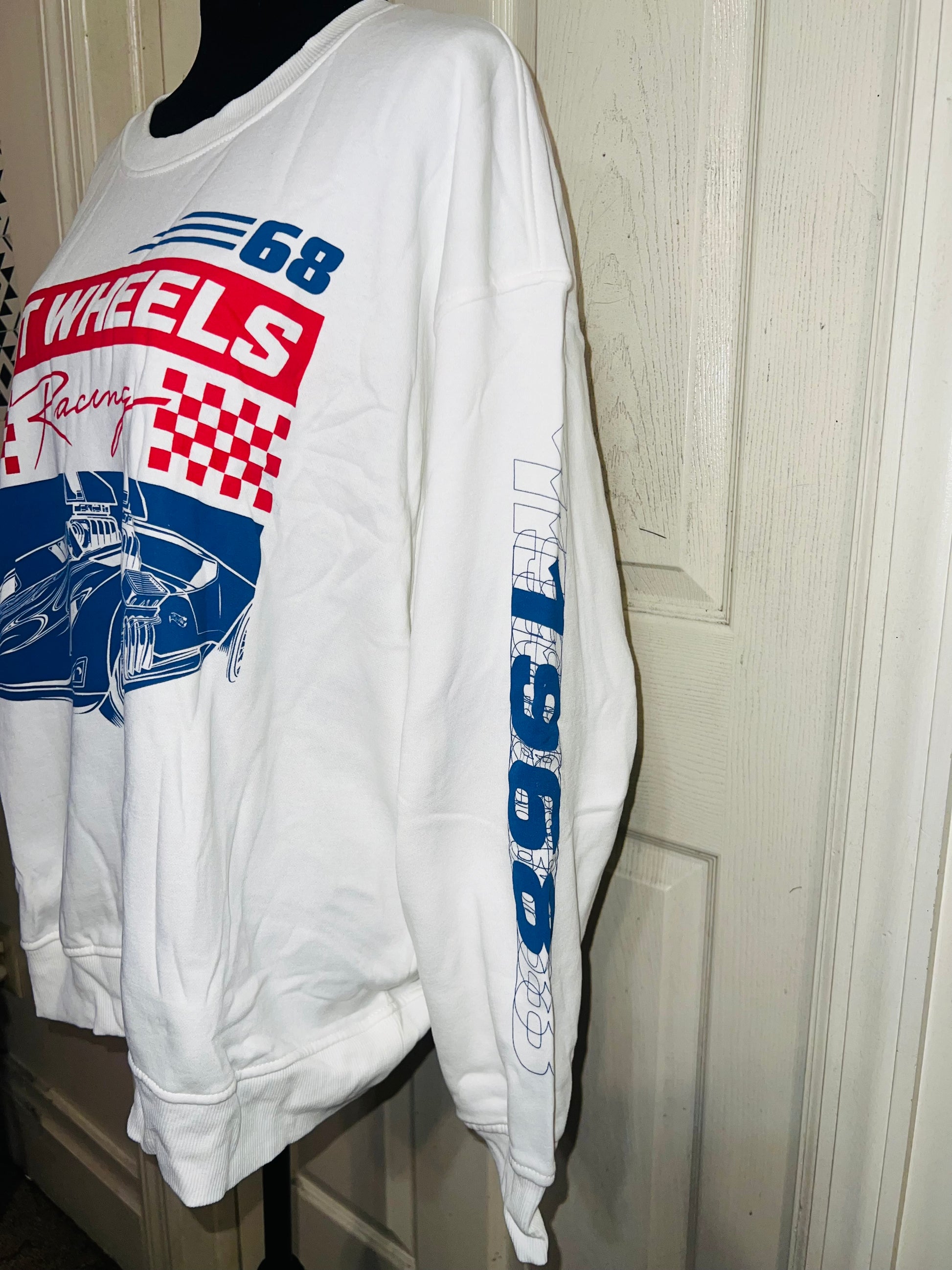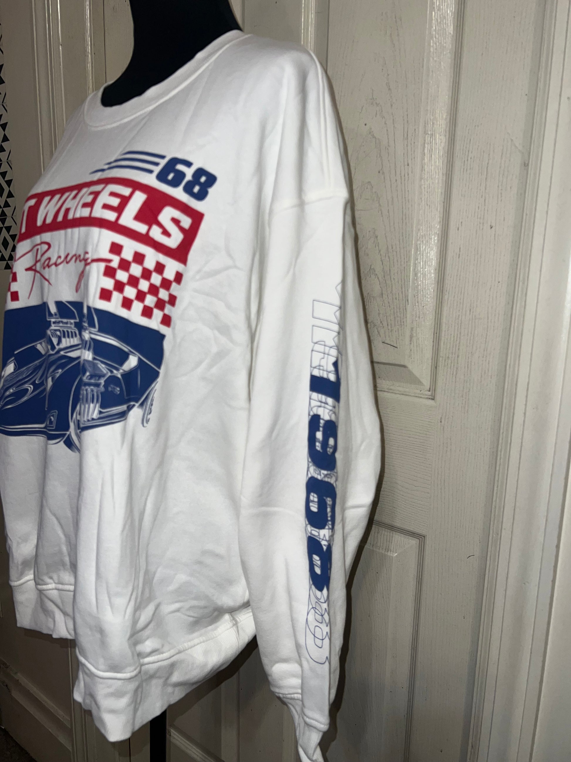 A white Hot Wheel sweatshirt with cool detailing on the sleeve. Super super soft and comfortable. Size XL, oversized.
