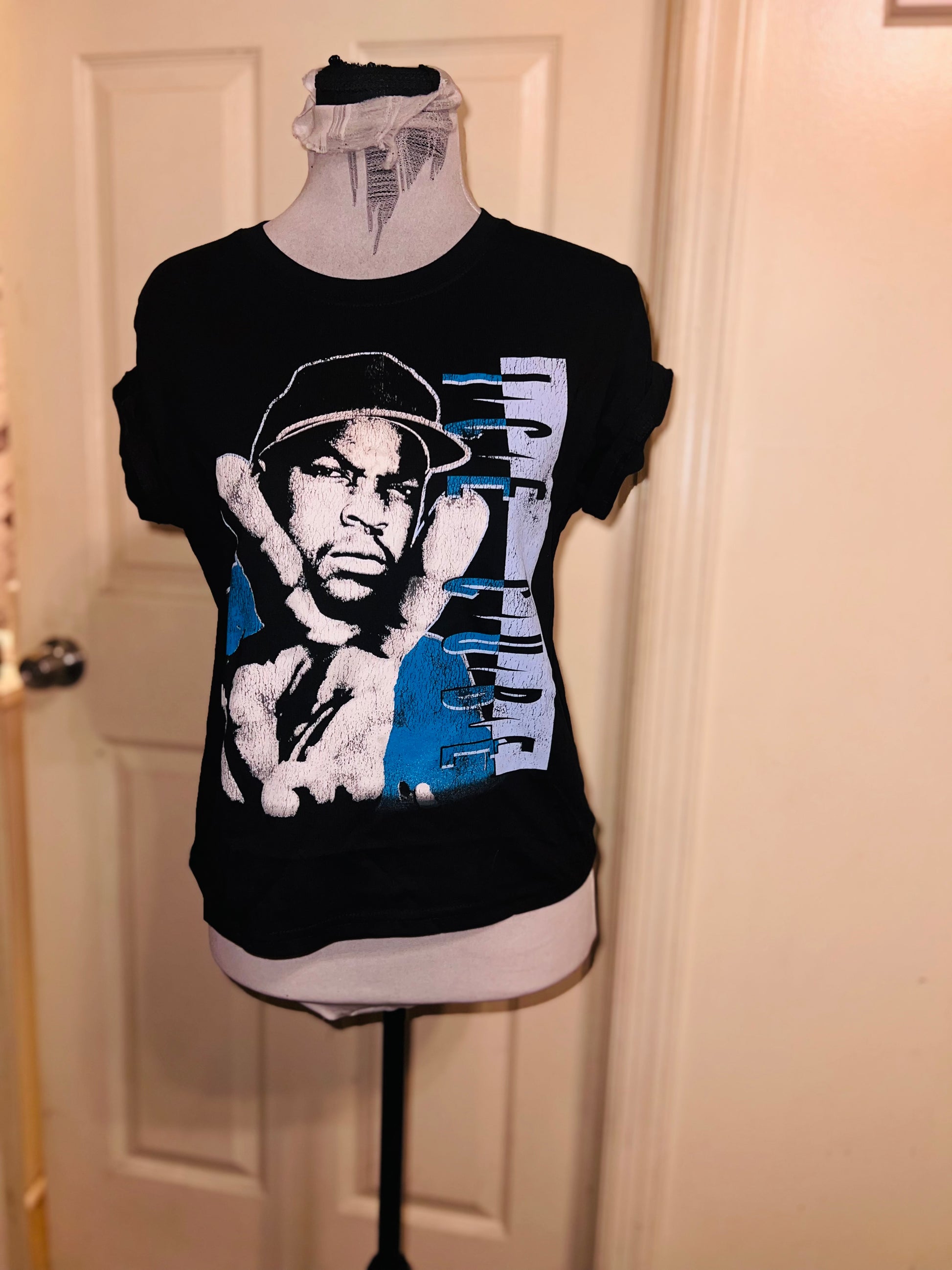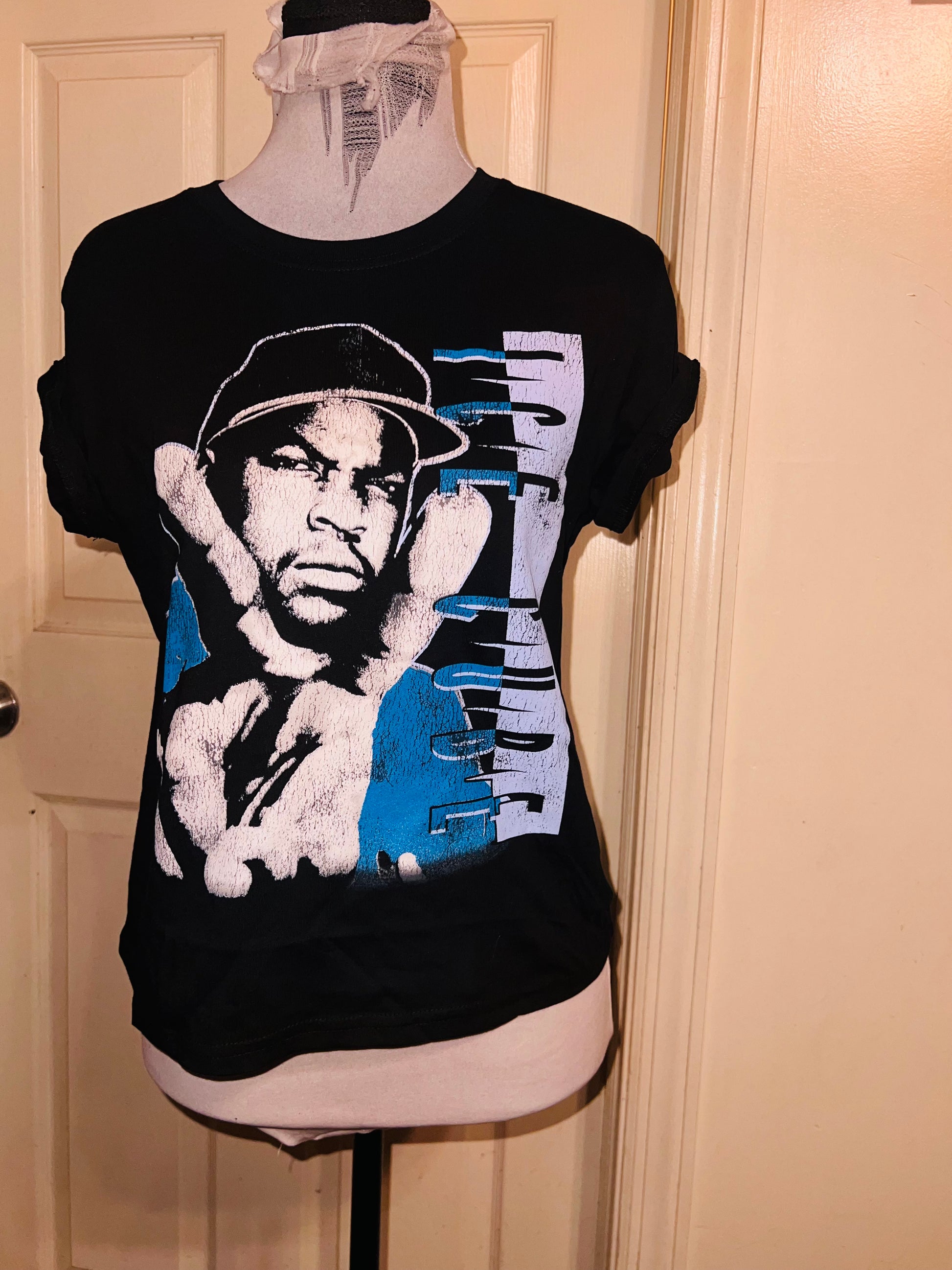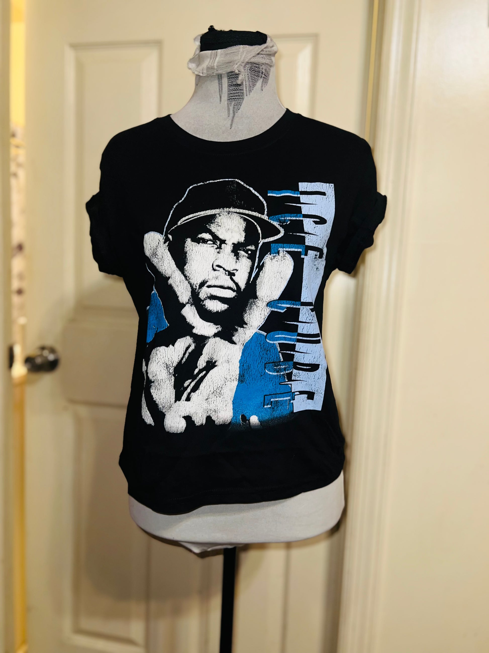 A super cute black baby tee, a bit longer than cropped, with Ice Cube in blue on the front with a peace sign. Size XL.