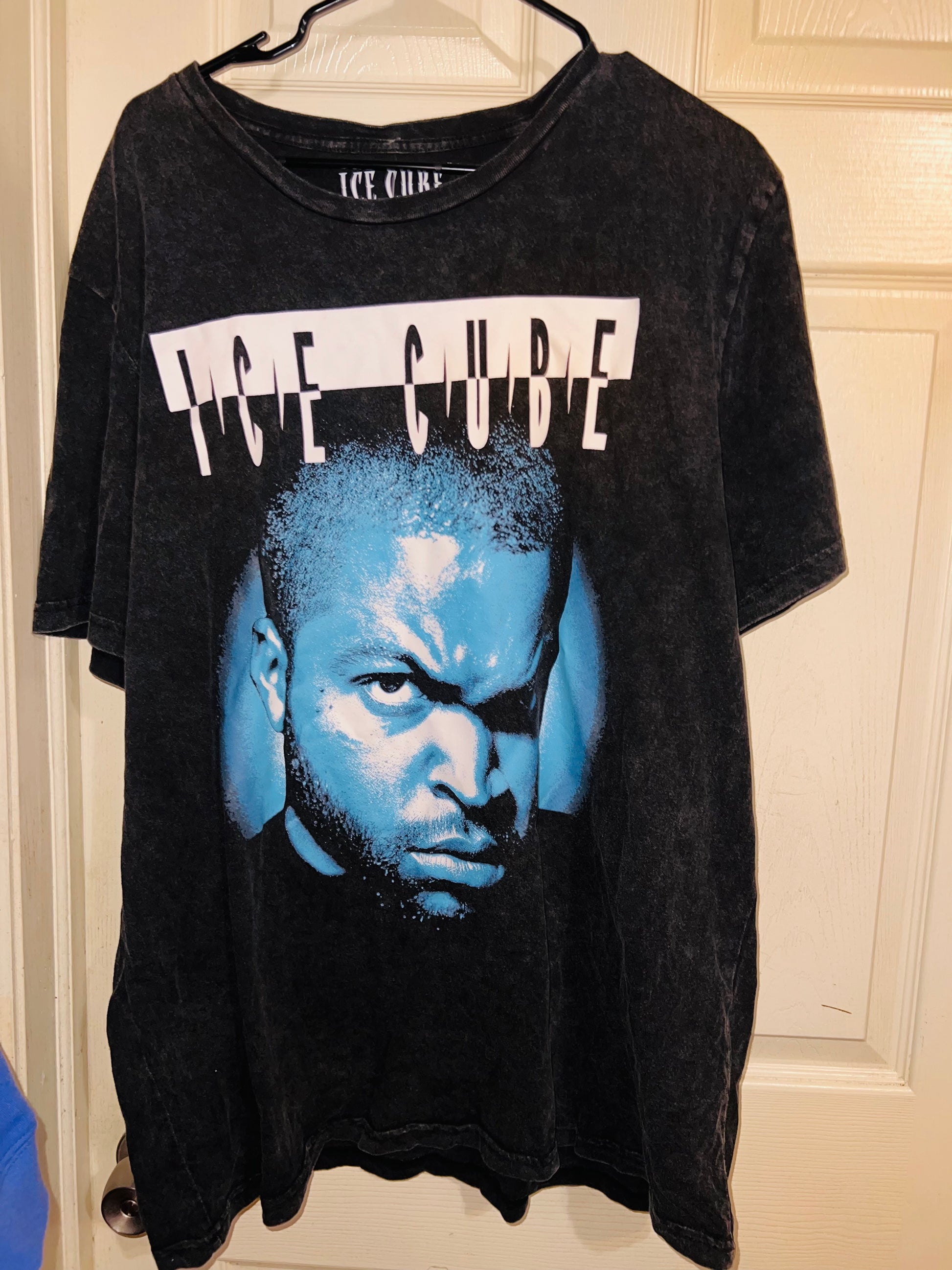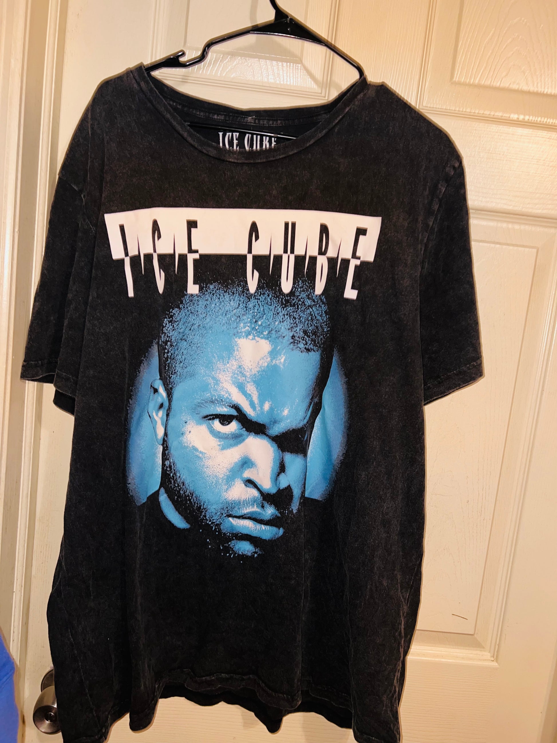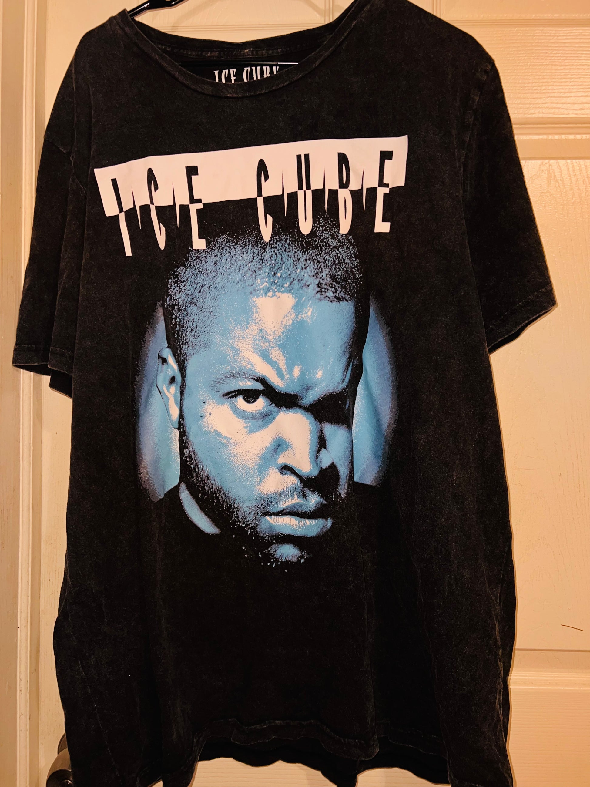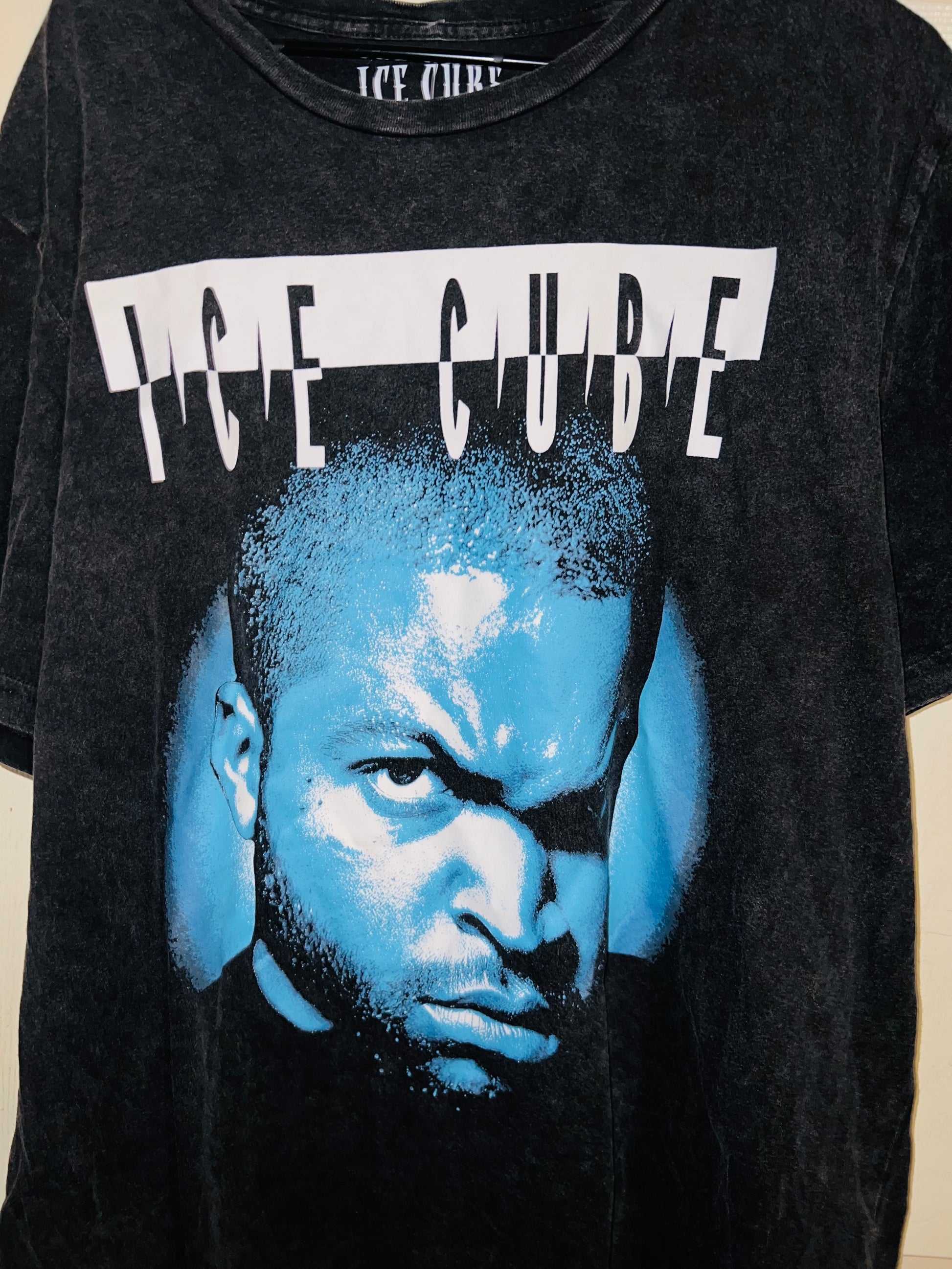 A dark charcoal grey/black mineral washed Ice Cube tee with a pretty blue contrast. Super comfortable. Oversized L/XL.