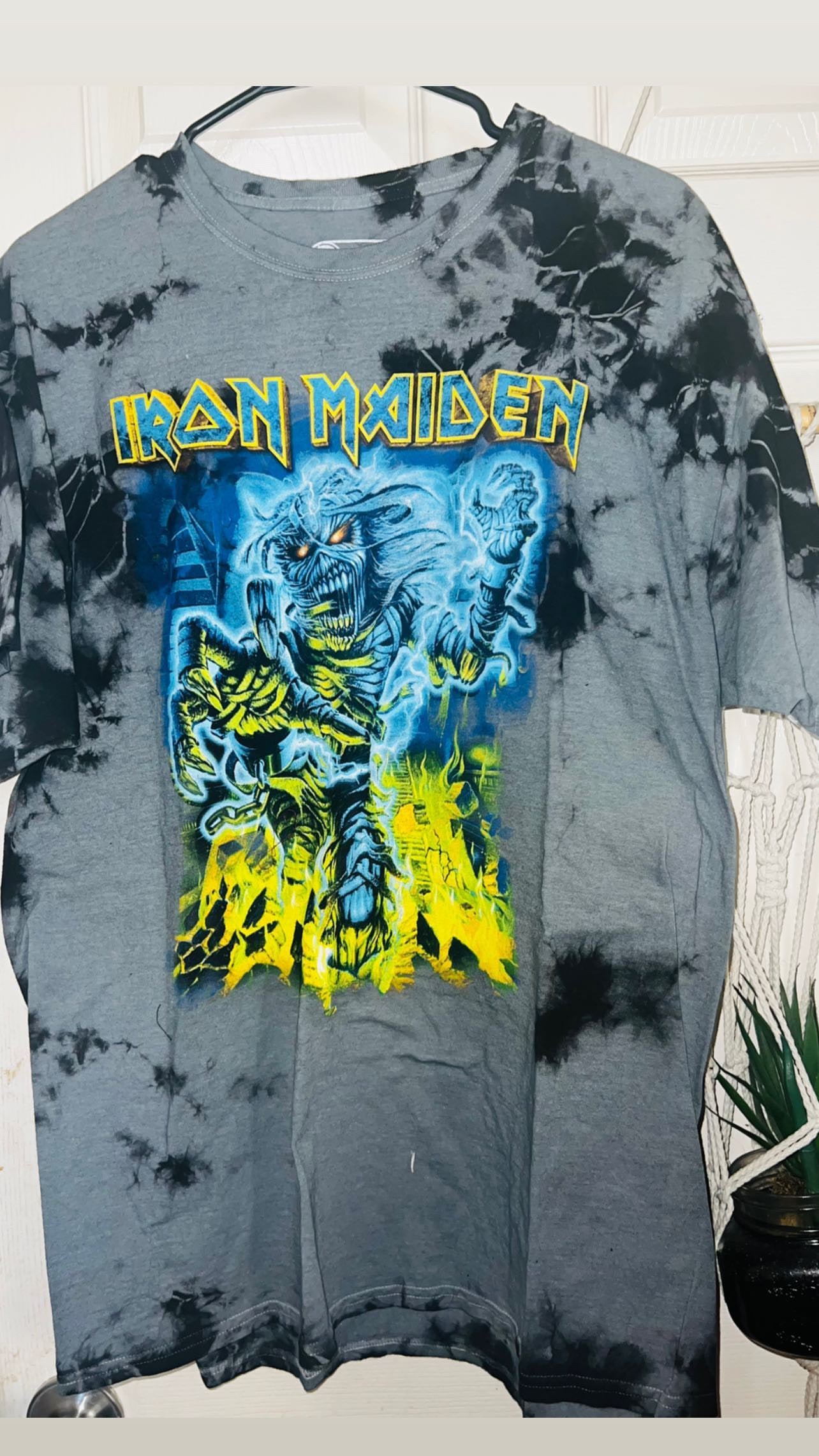 This is now a preorder. Please allow extra processing time. A black and grey tie dyed Iron Maiden t-shirt with the blue and yellow graphic and band name. Oversized, super unique. Size L/XL.