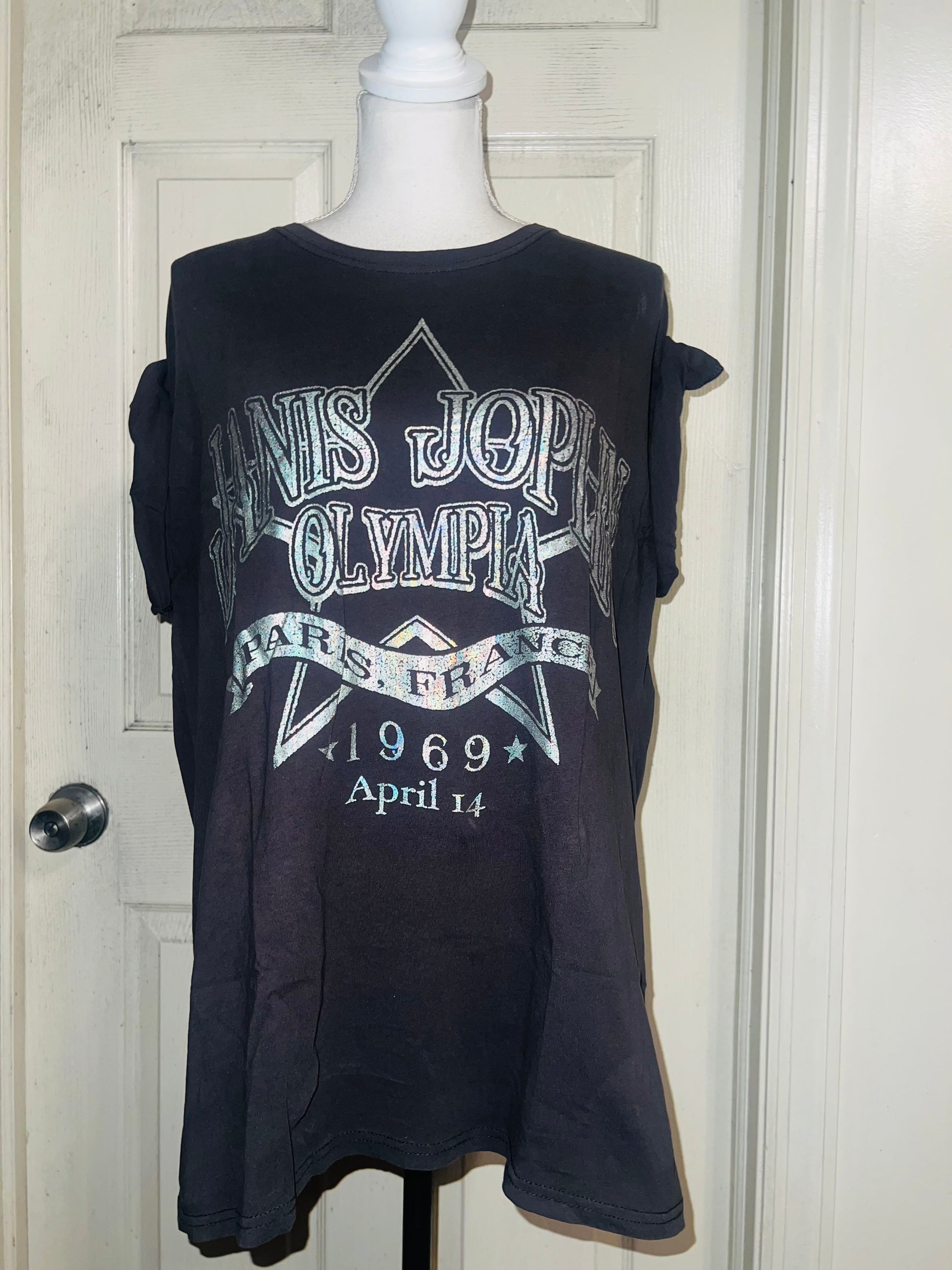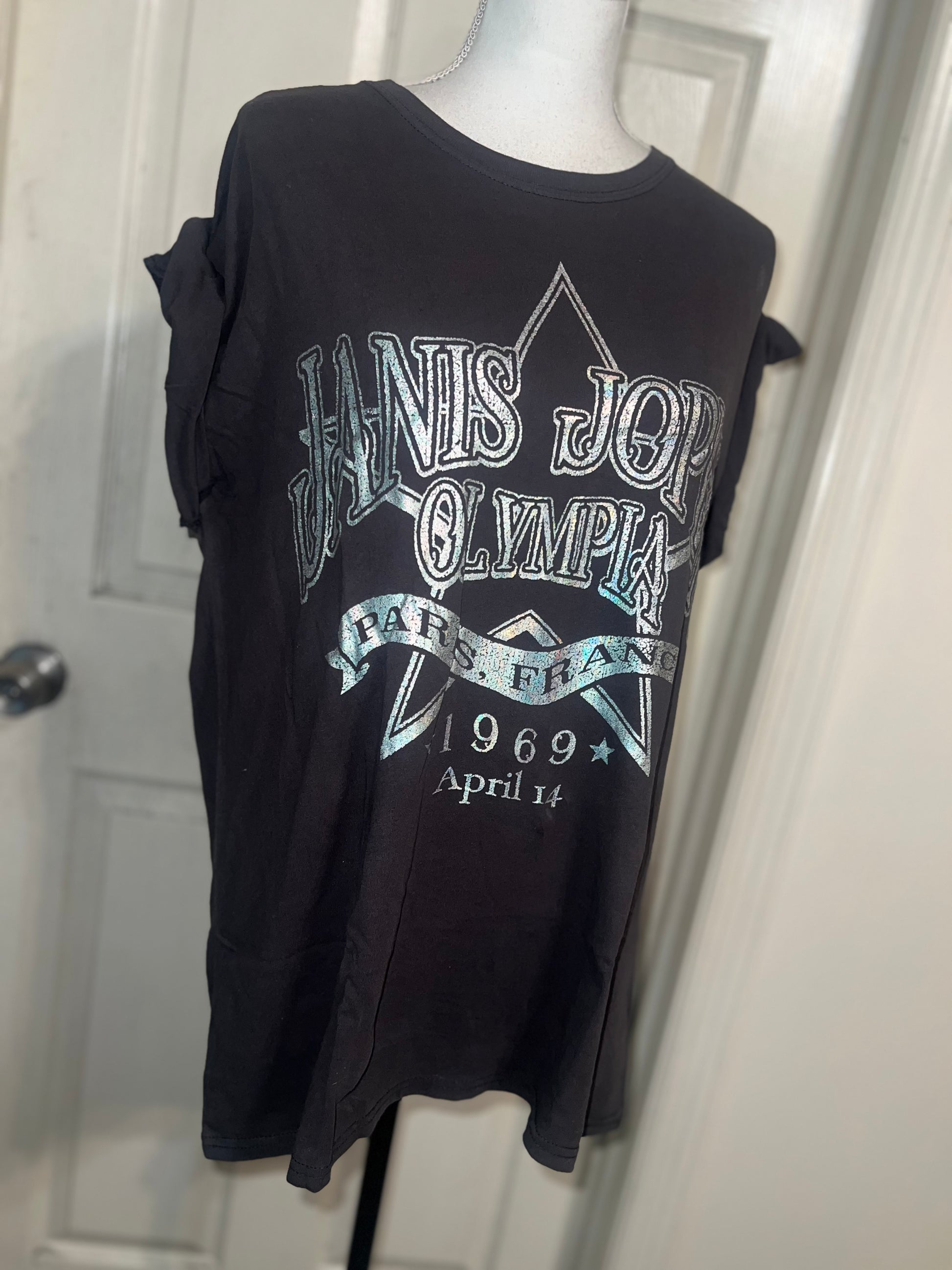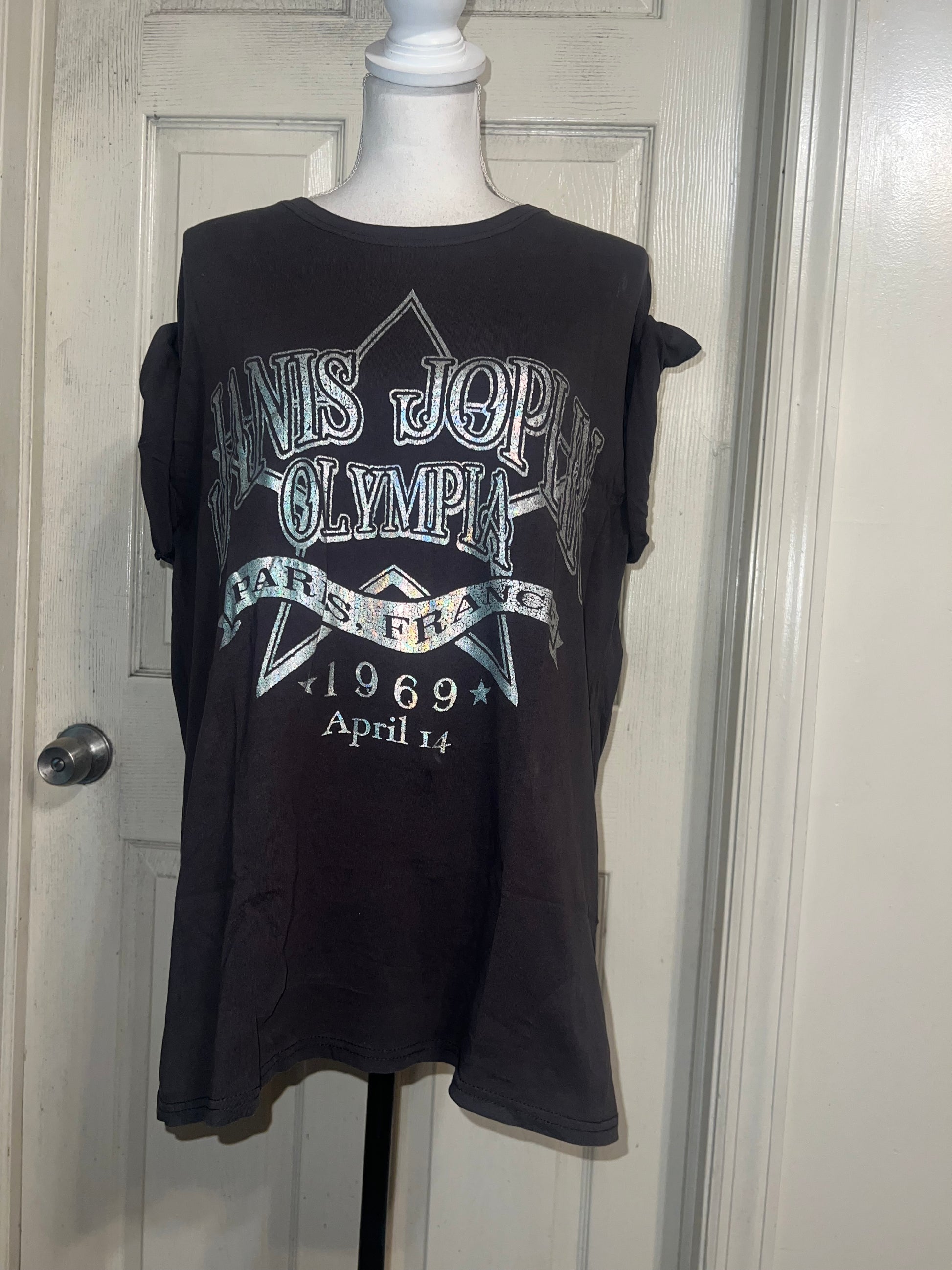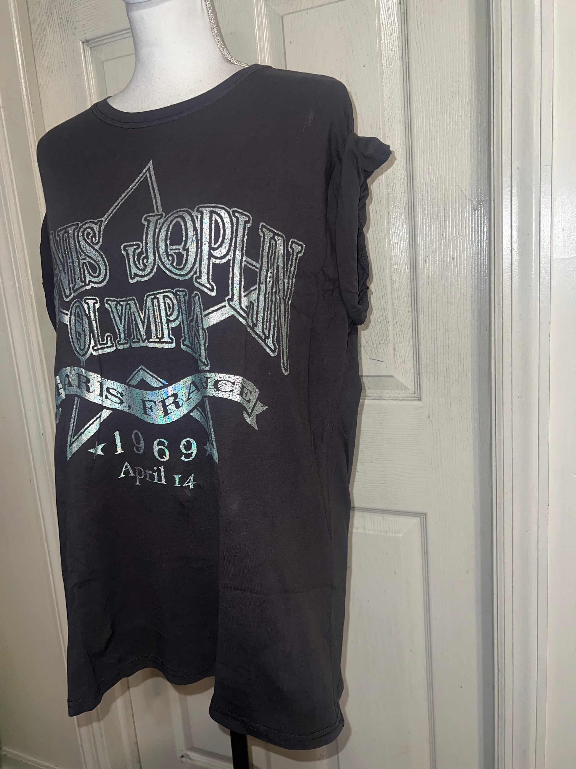 This is now a preorder. Please allow extra processing time. A dark charcoal grey Janis Joplin Olympia in Paris, France 1969. The graphic has a super cool metallic color that looks like a rainbow reflection. Size M/L, oversized.