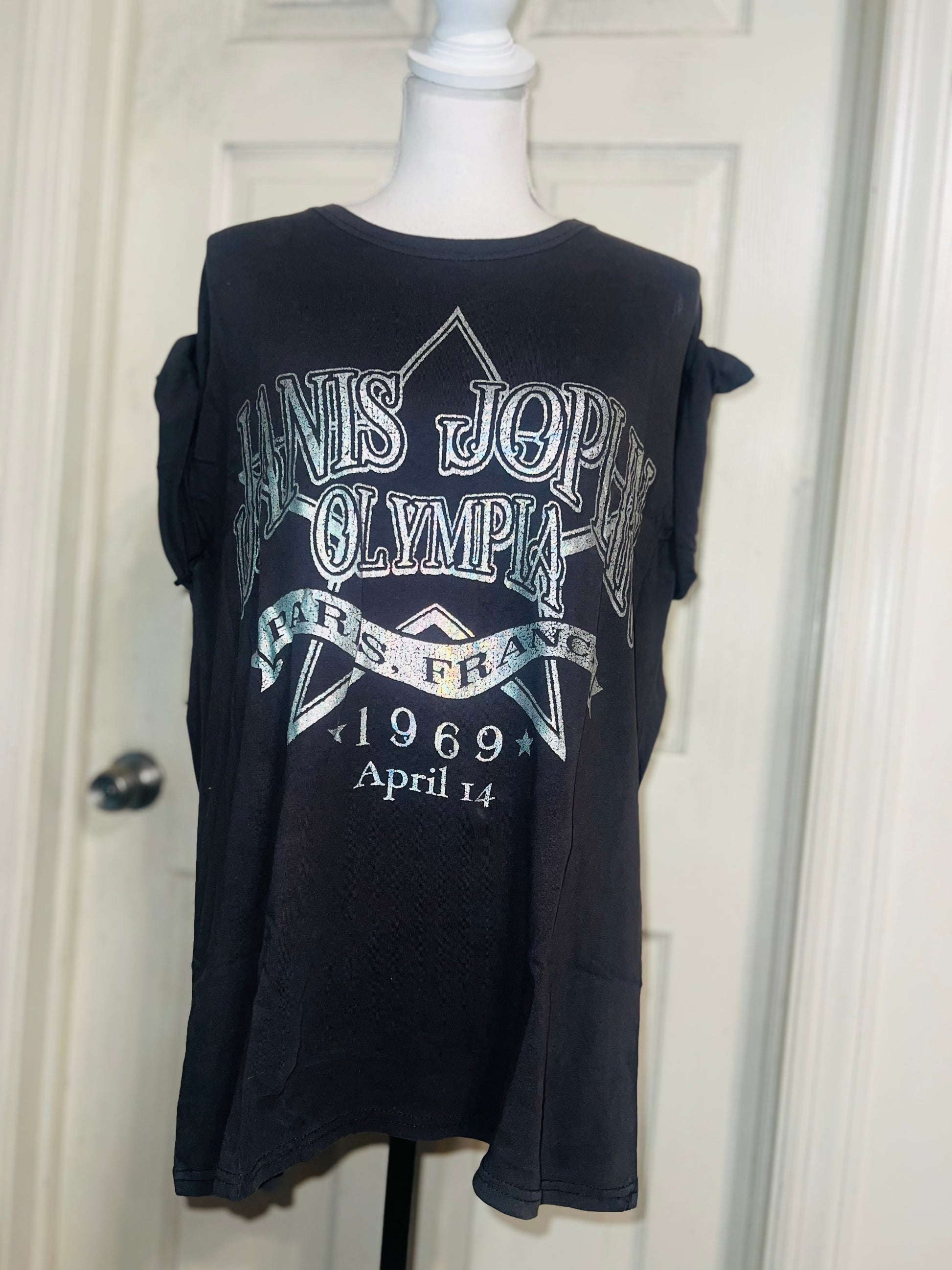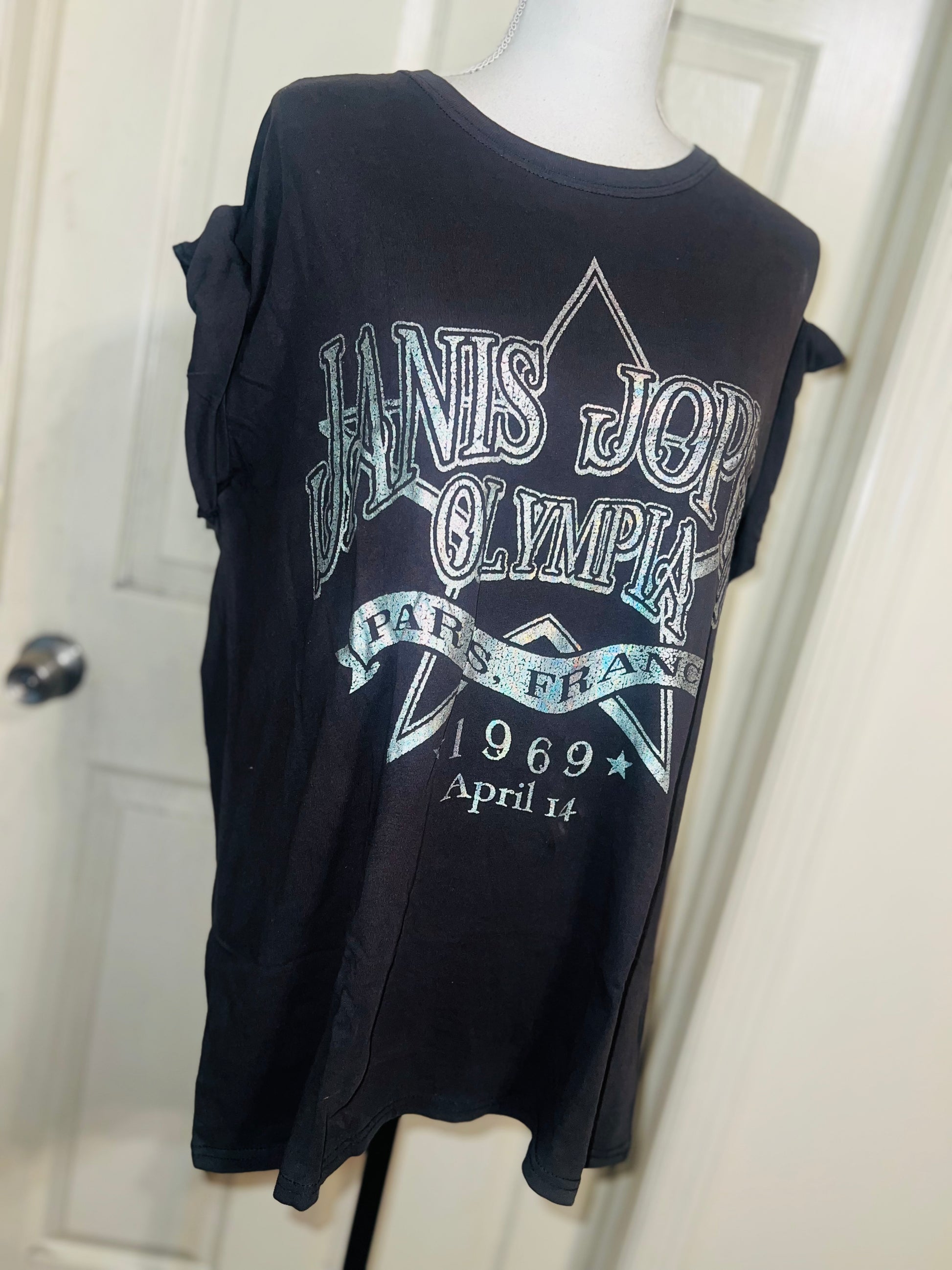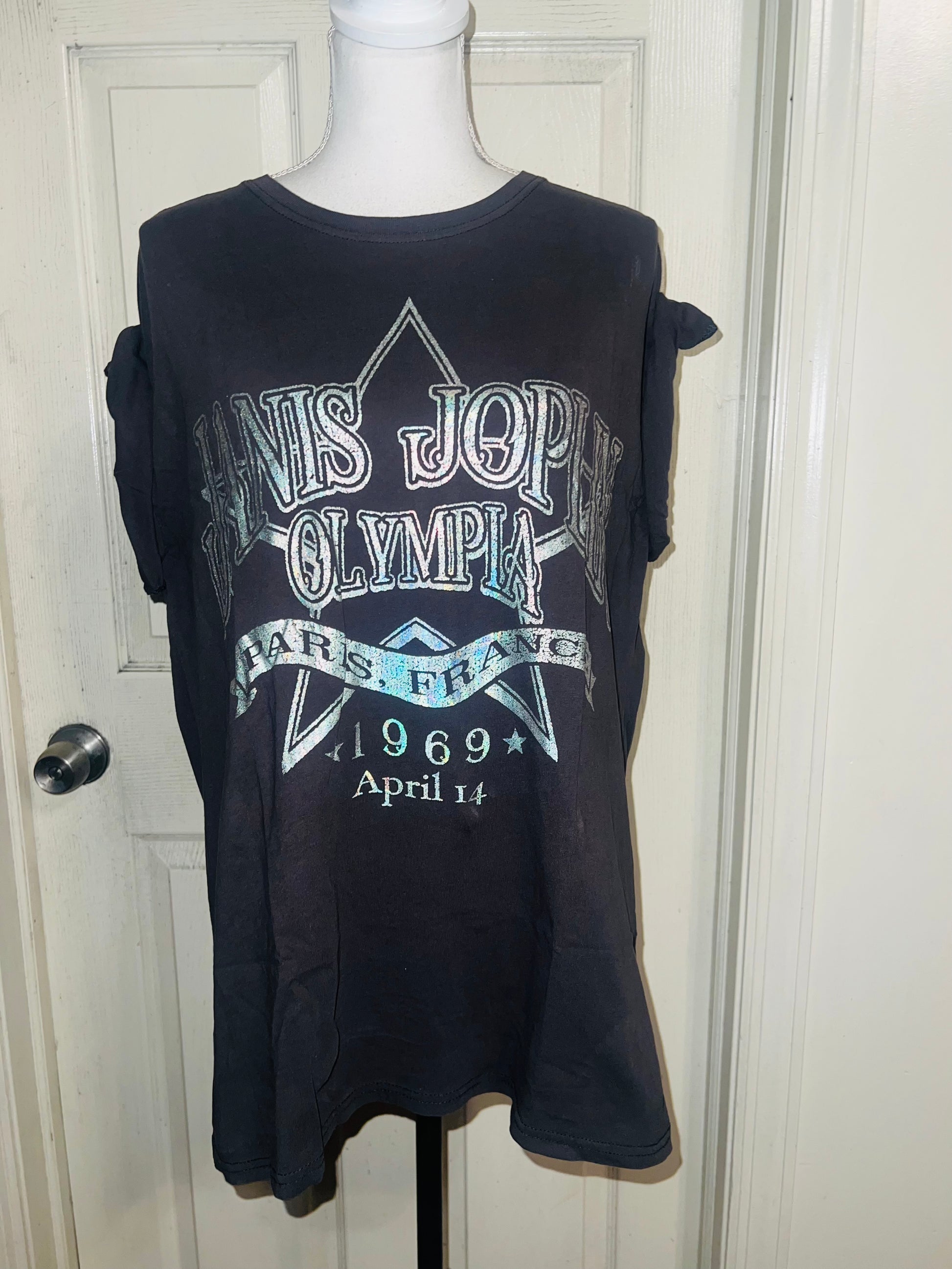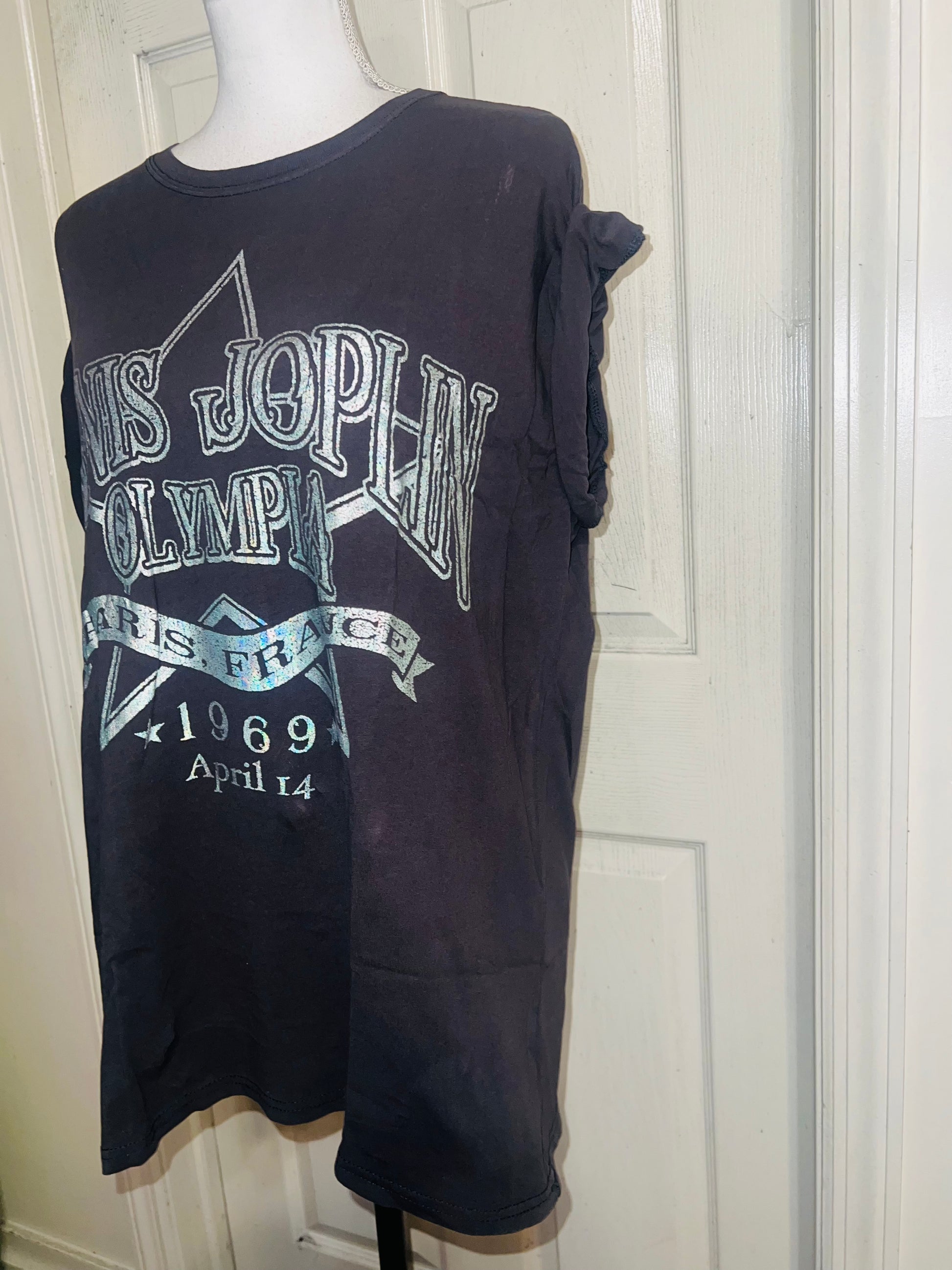 This is now a preorder. Please allow extra processing time. A dark charcoal grey Janis Joplin Olympia in Paris, France 1969. The graphic has a super cool metallic color that looks like a rainbow reflection. Size M/L, oversized.