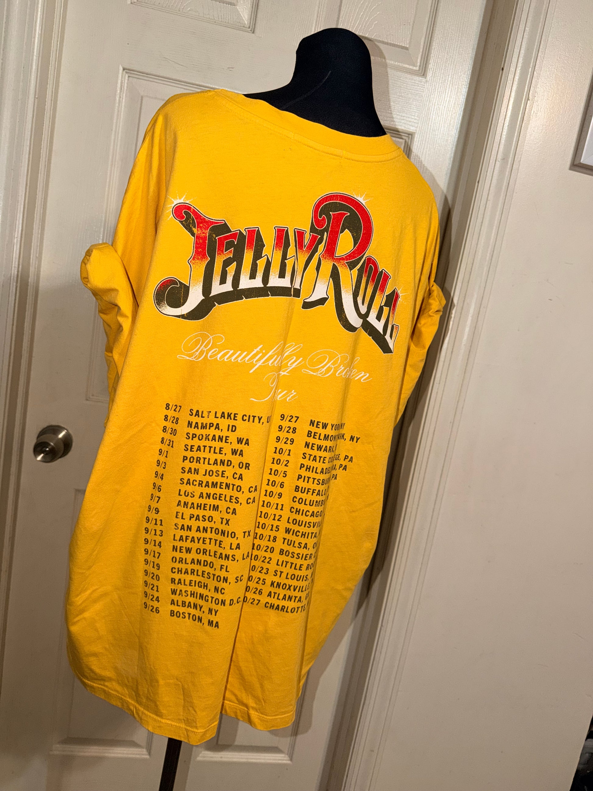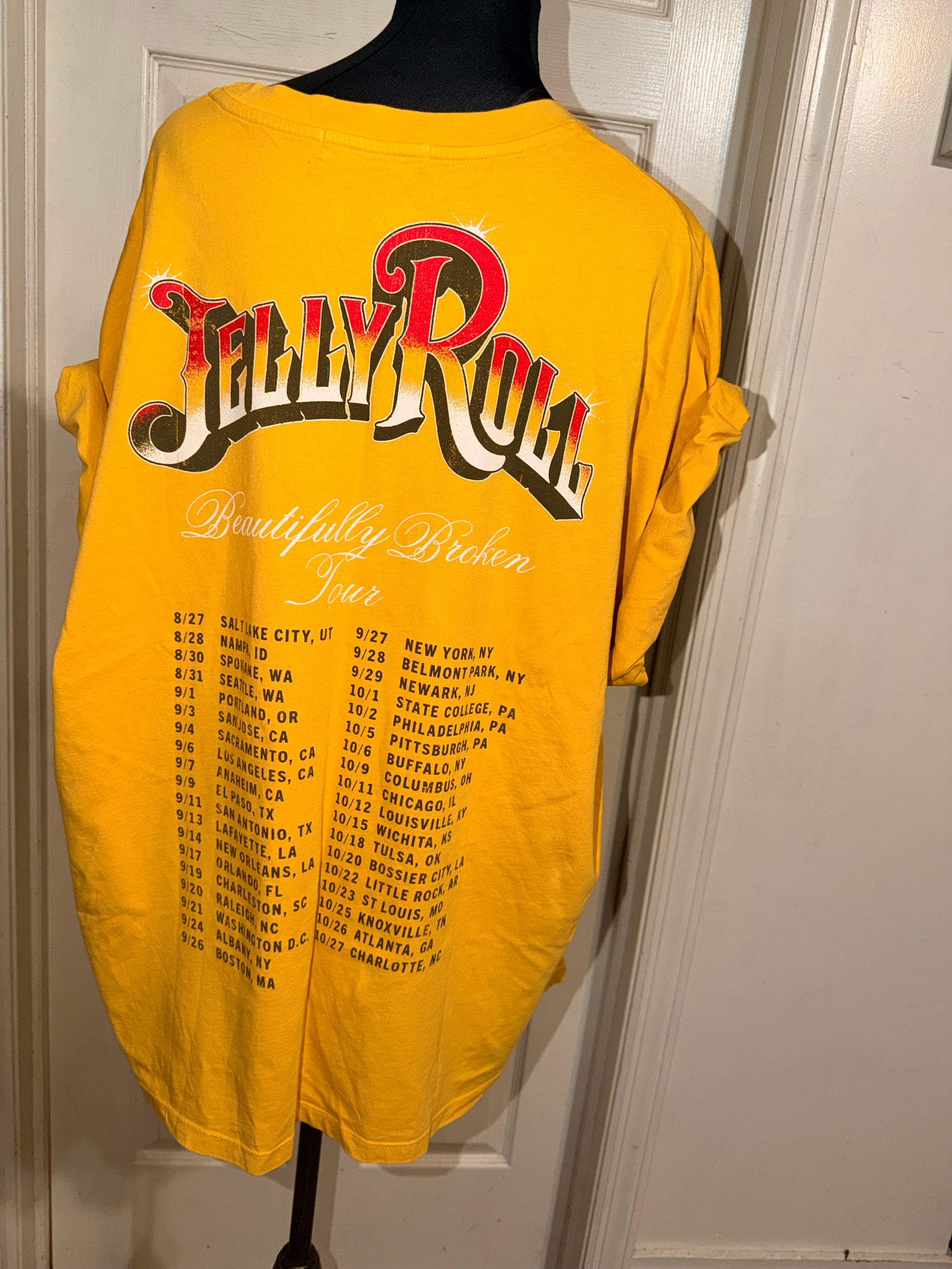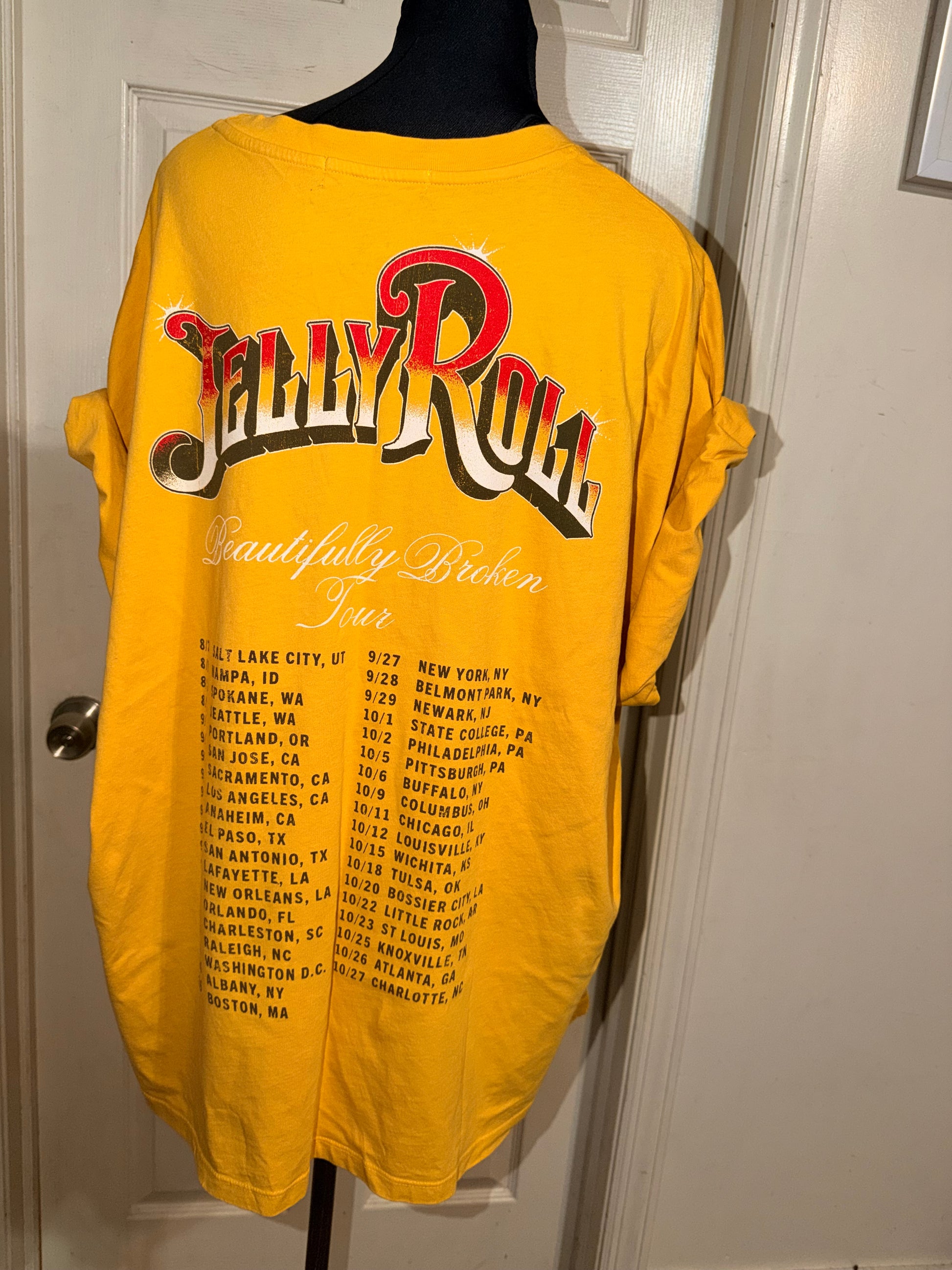 A gold Jelly Roll double sided Beautifully Broken tour tee with dates on the back. Oversized.