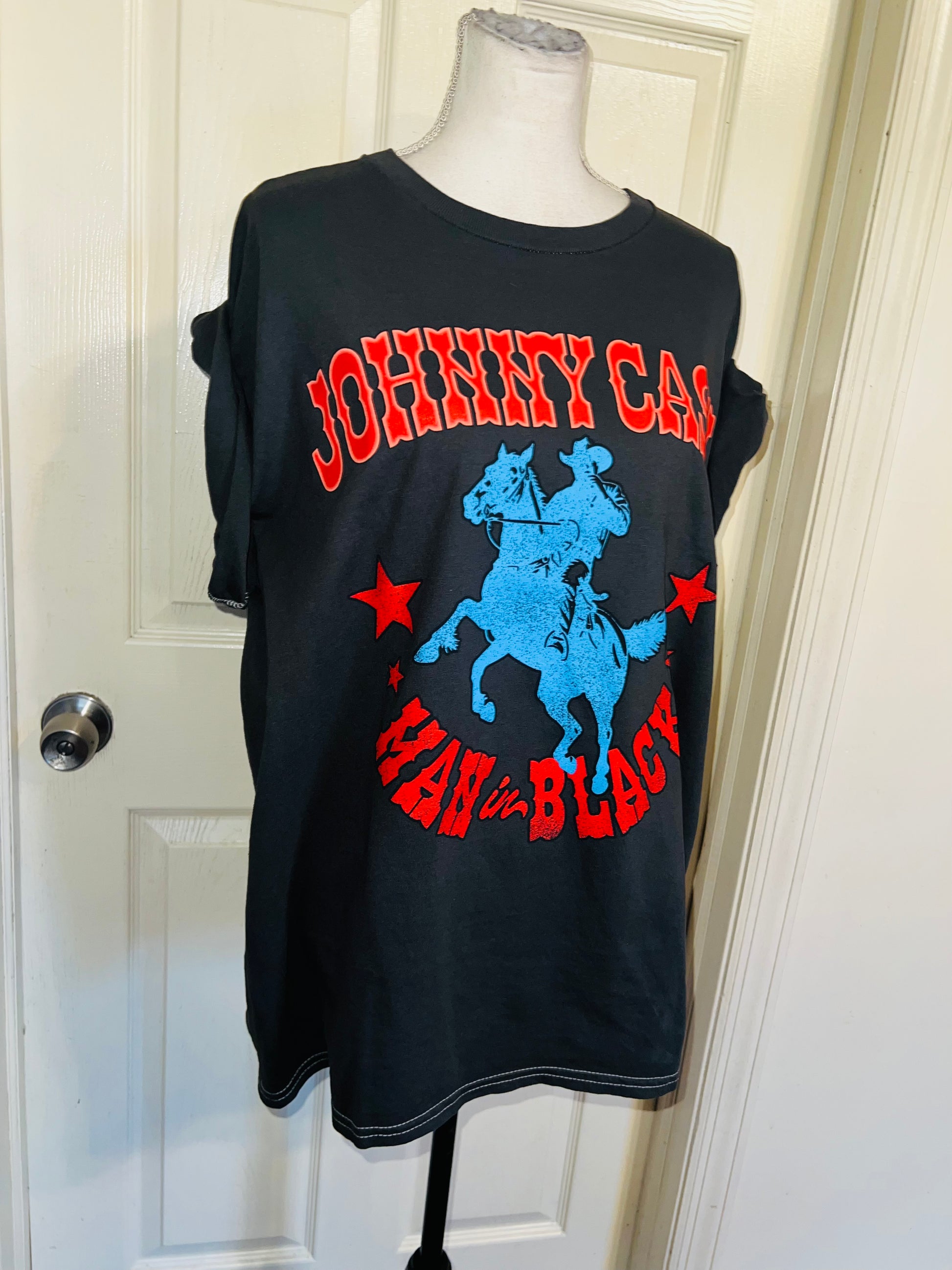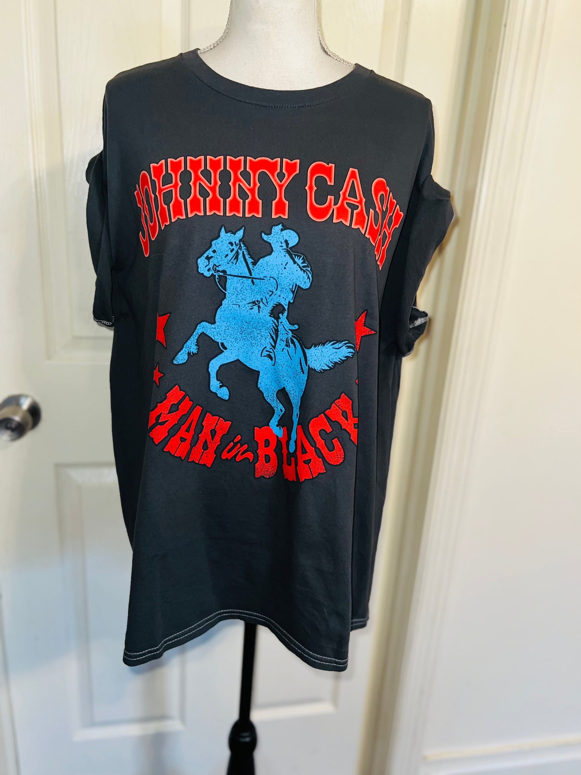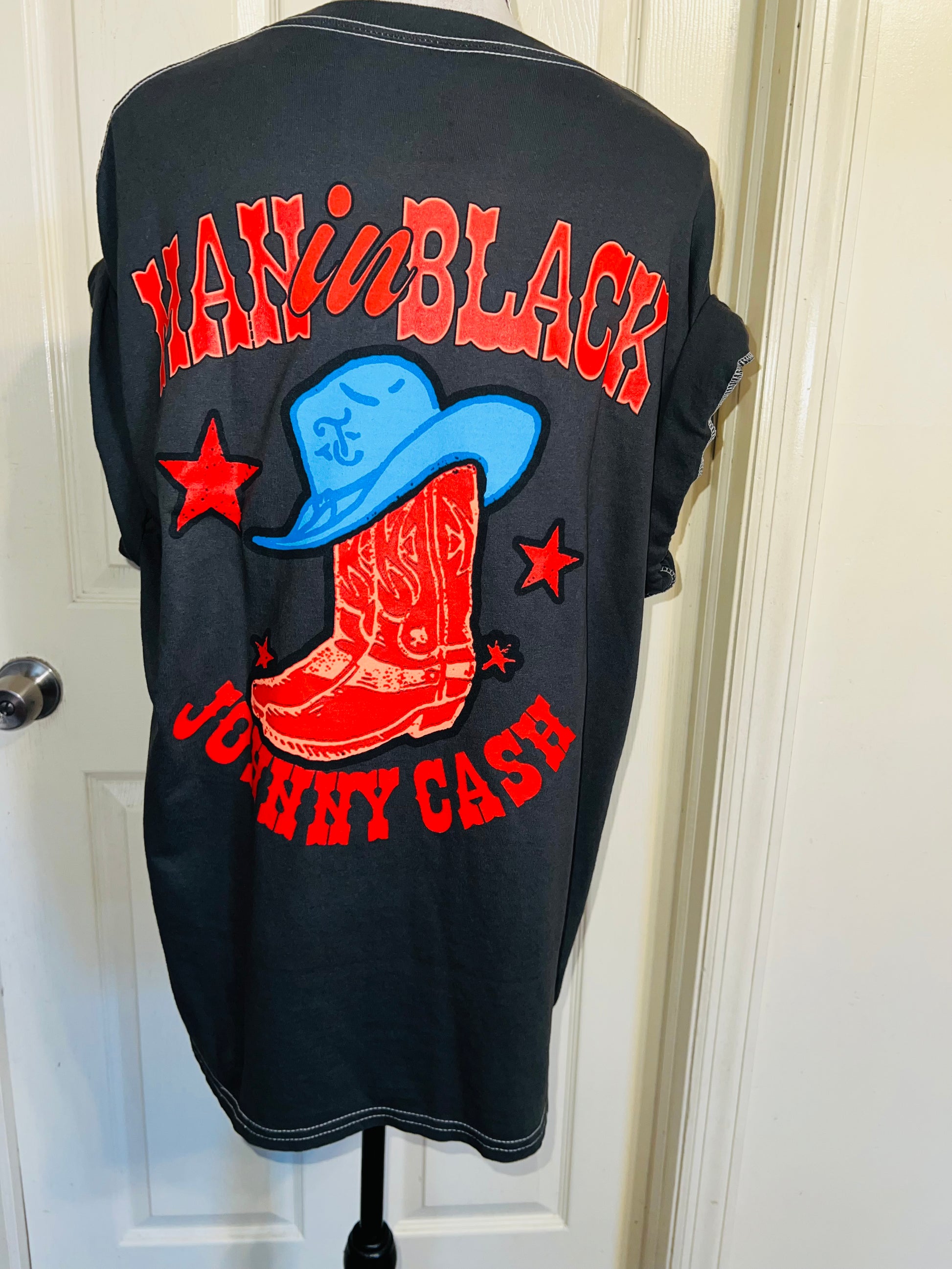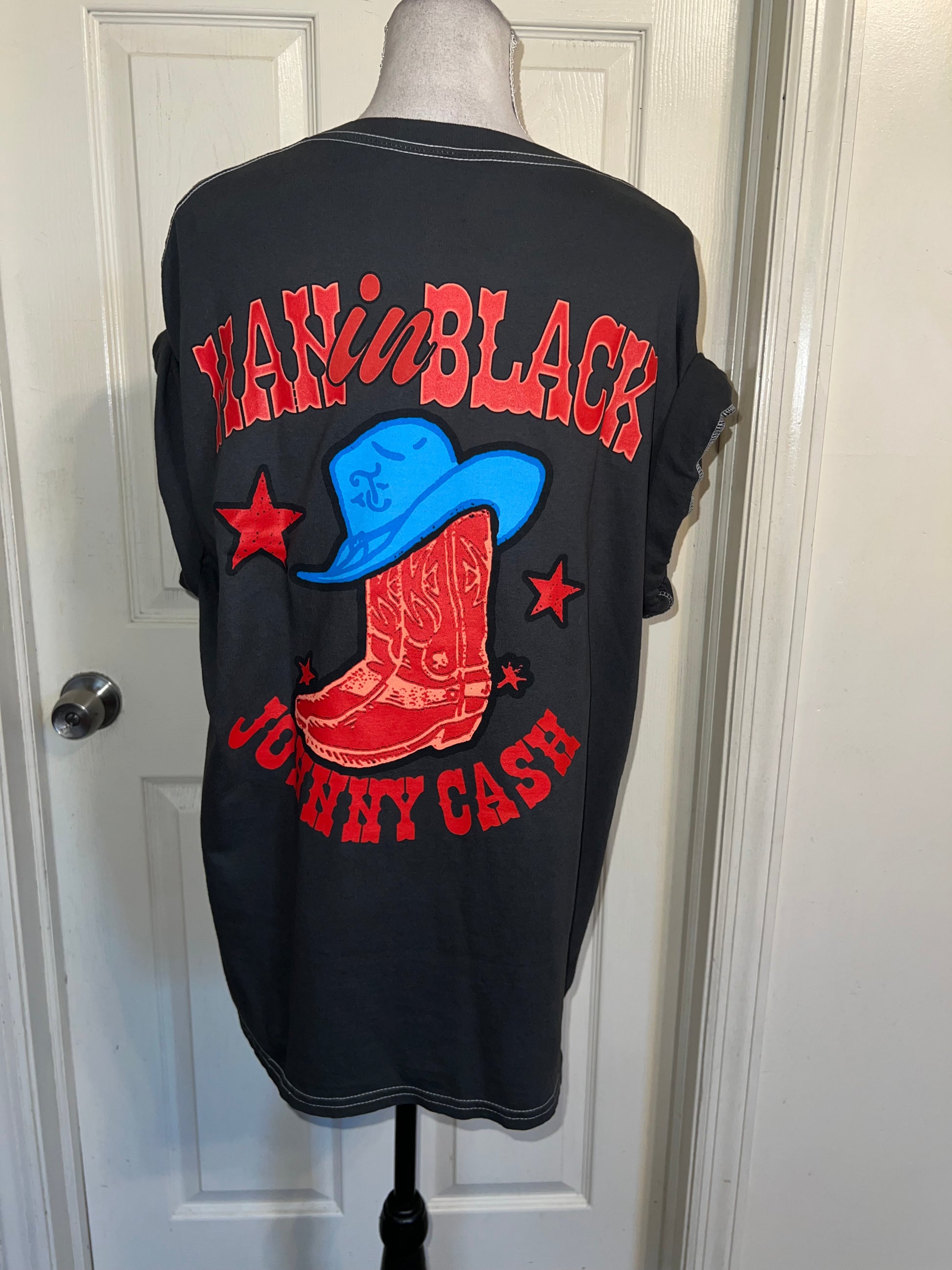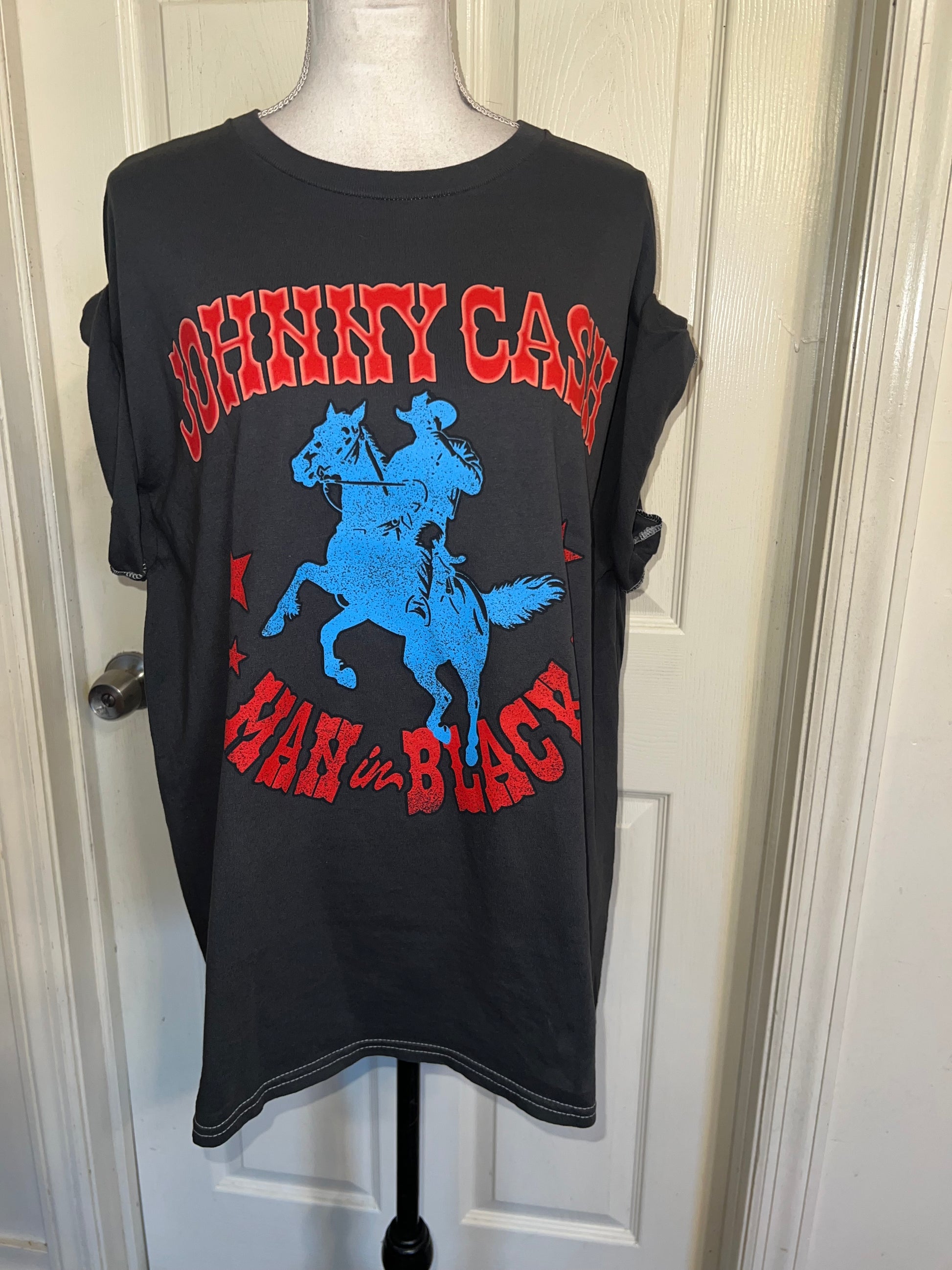A dark charcoal grey Johnny Cash Man in Black double sided tee with a sick graphic on the back. Size L/XL, oversized.