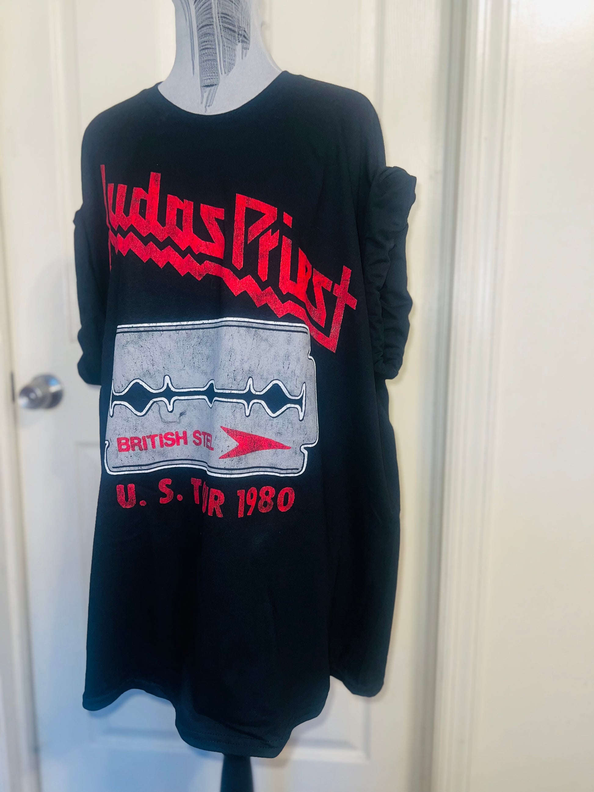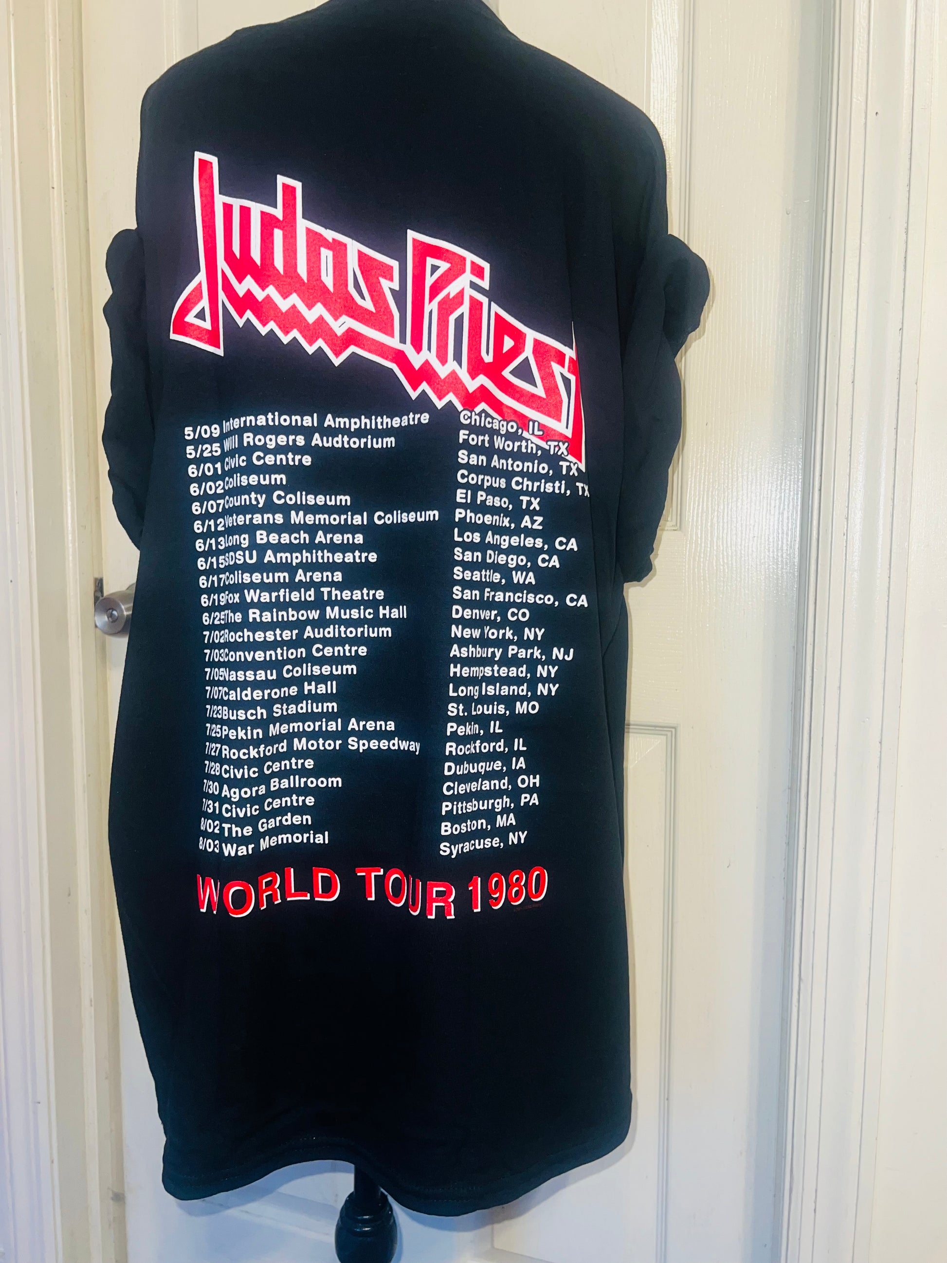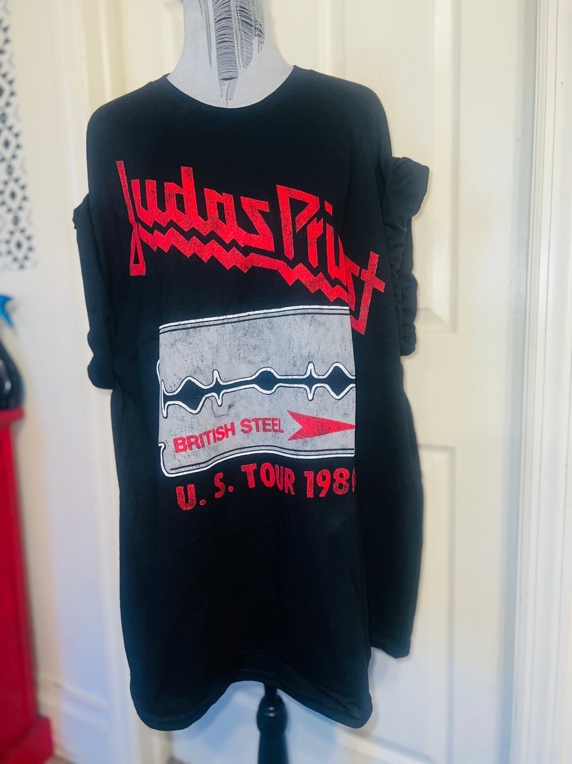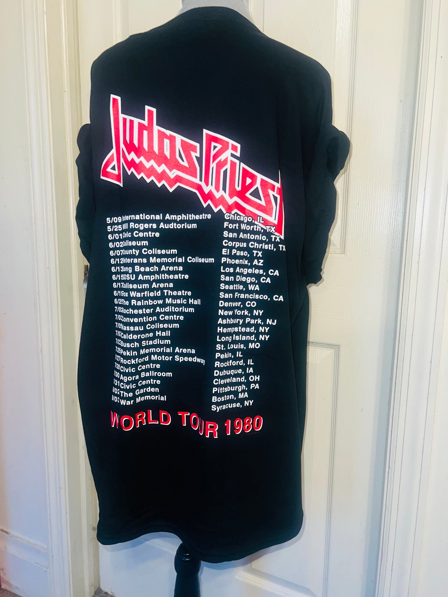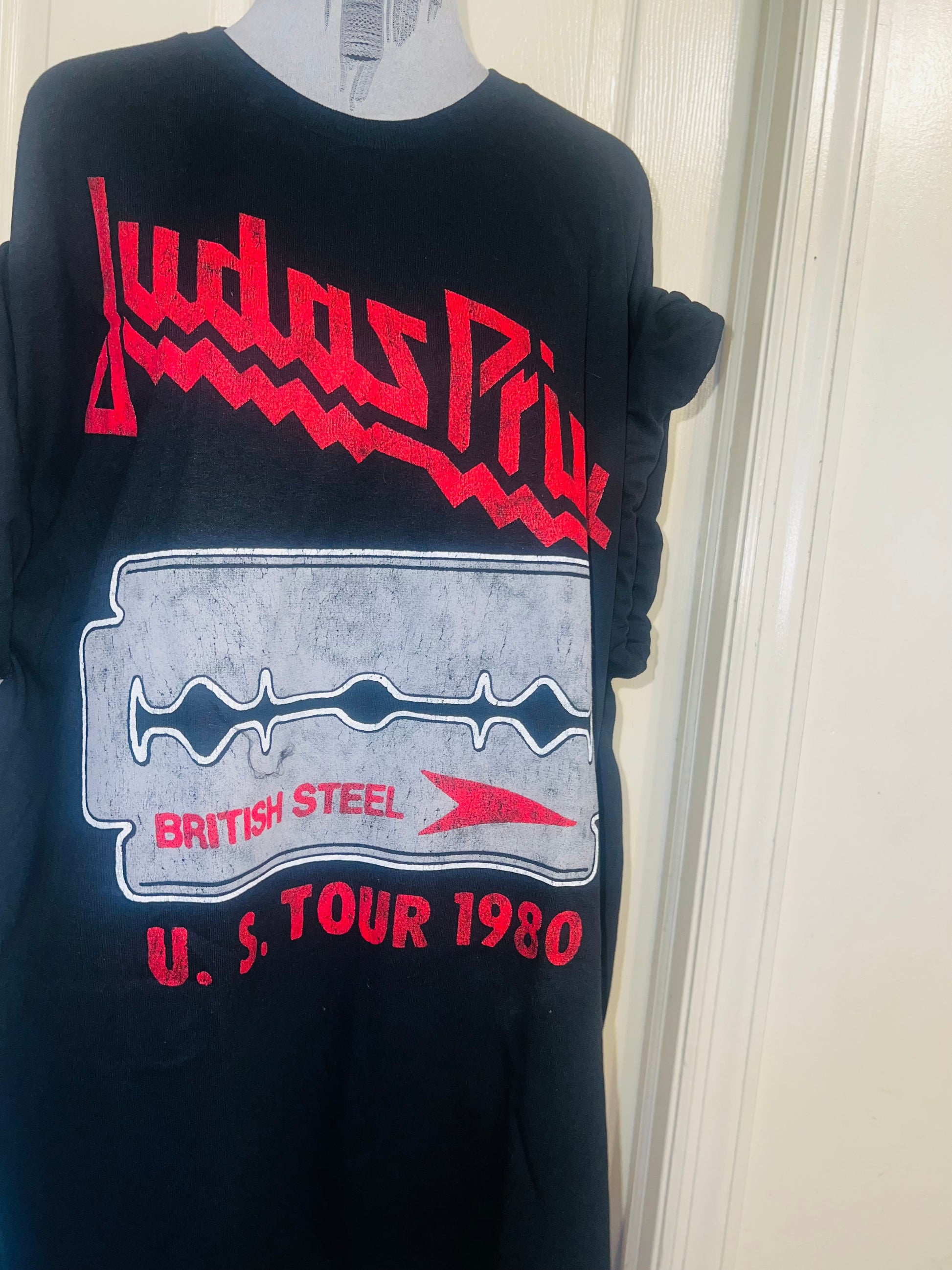 A black double sided Judas Priest British Steel US Tour 1980 tee. I haven’t seen this anywhere, and I think it’s so cool! The tour dates and the cities are on the back. Oversized large, fits like an XL.