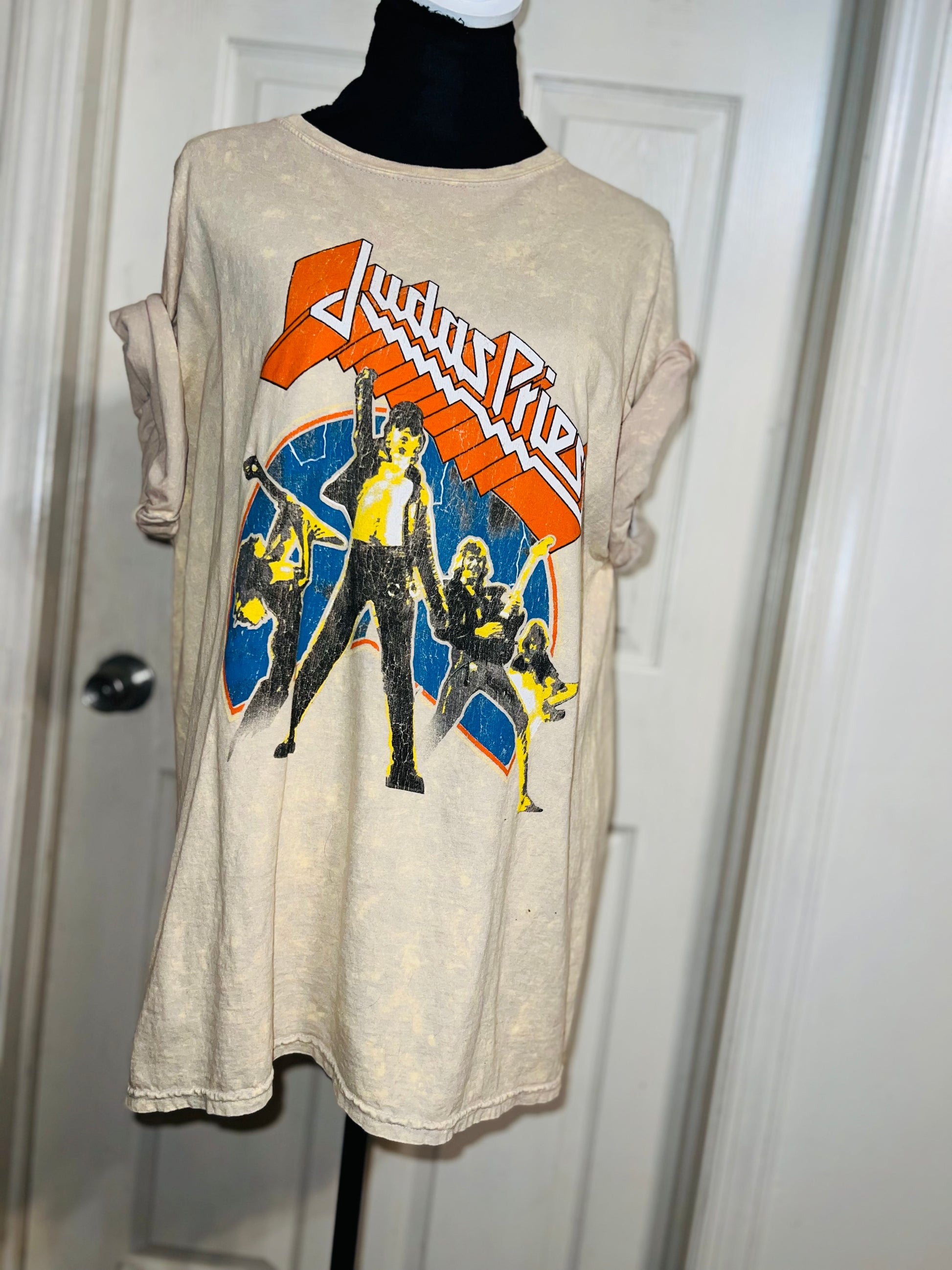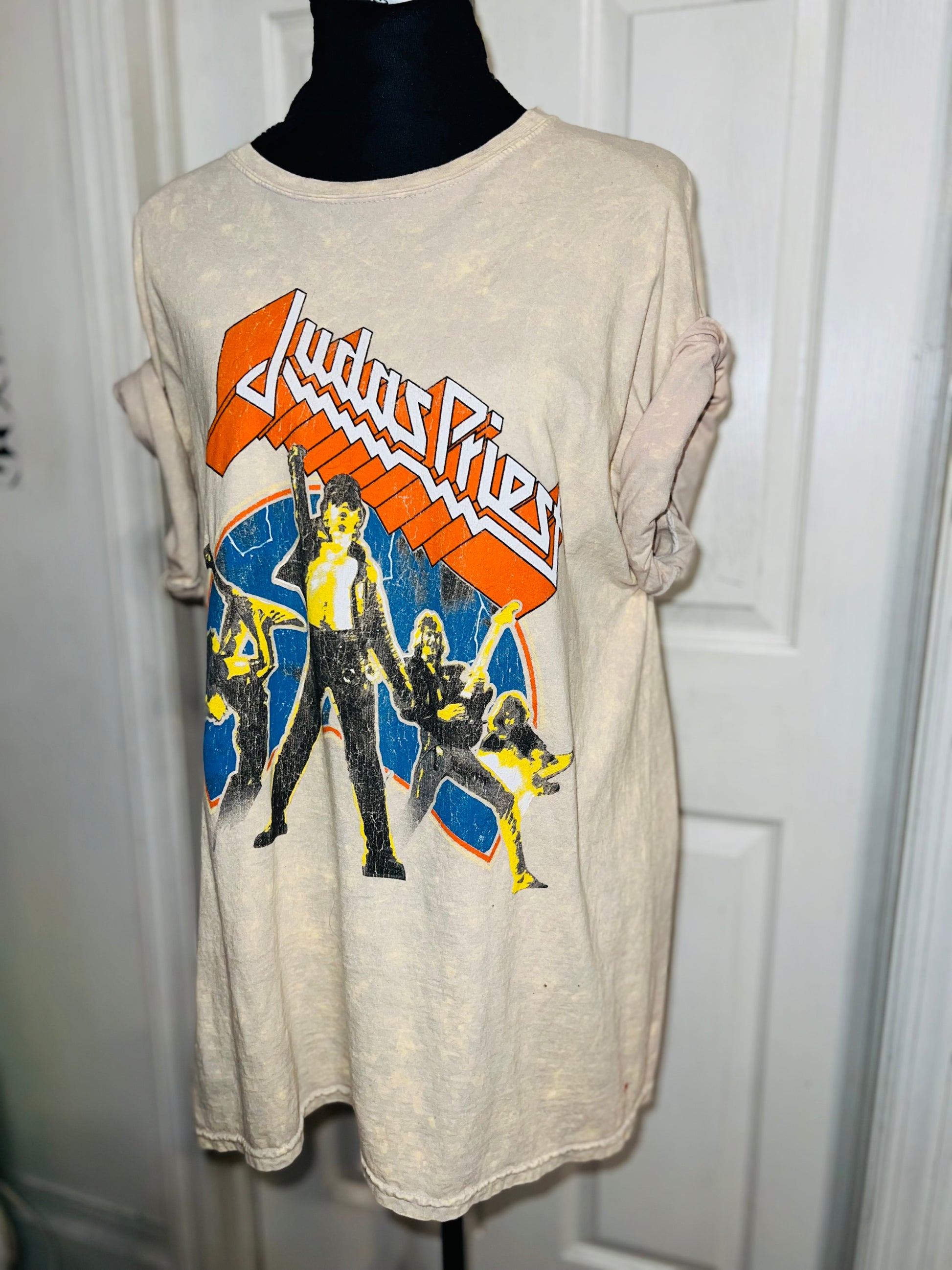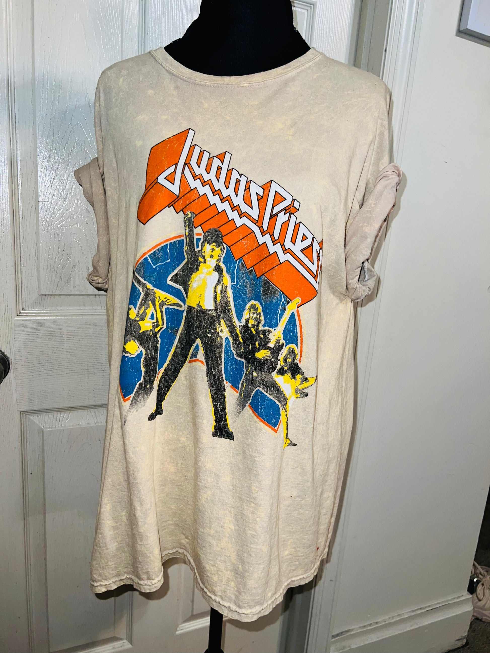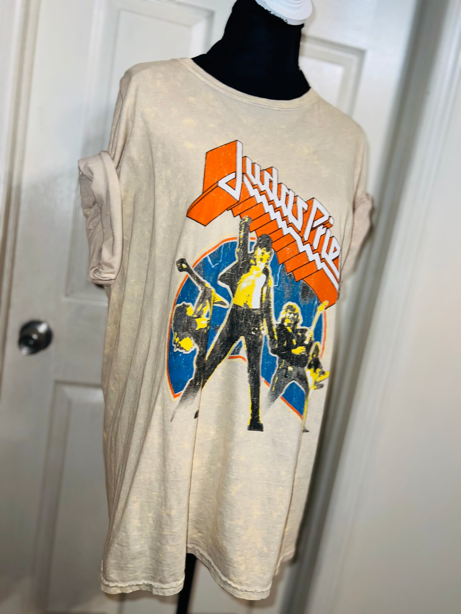 Beige mineral washed oversized tee with the Judas Priest graphic and logo. I don’t see these often! It’s very soft, comfortable, and size XL. This isn’t distressed yet, so please be sure to choose your level of distress