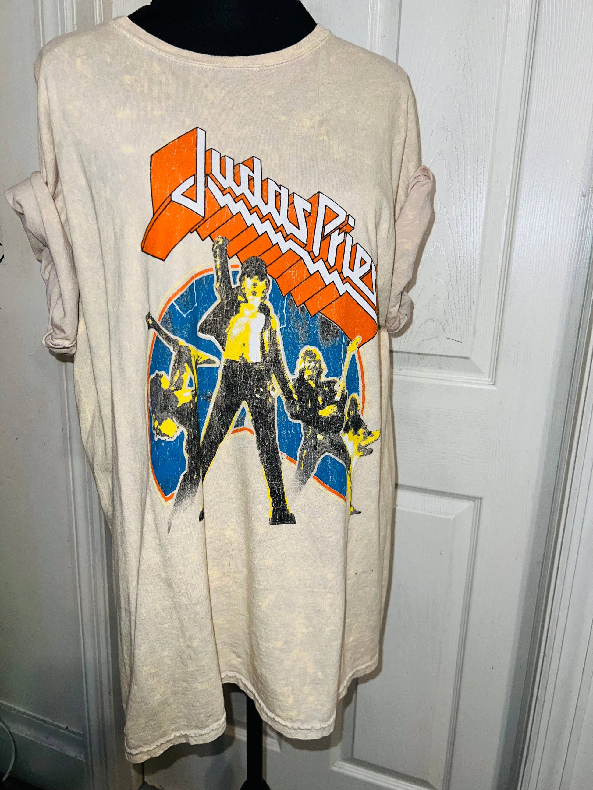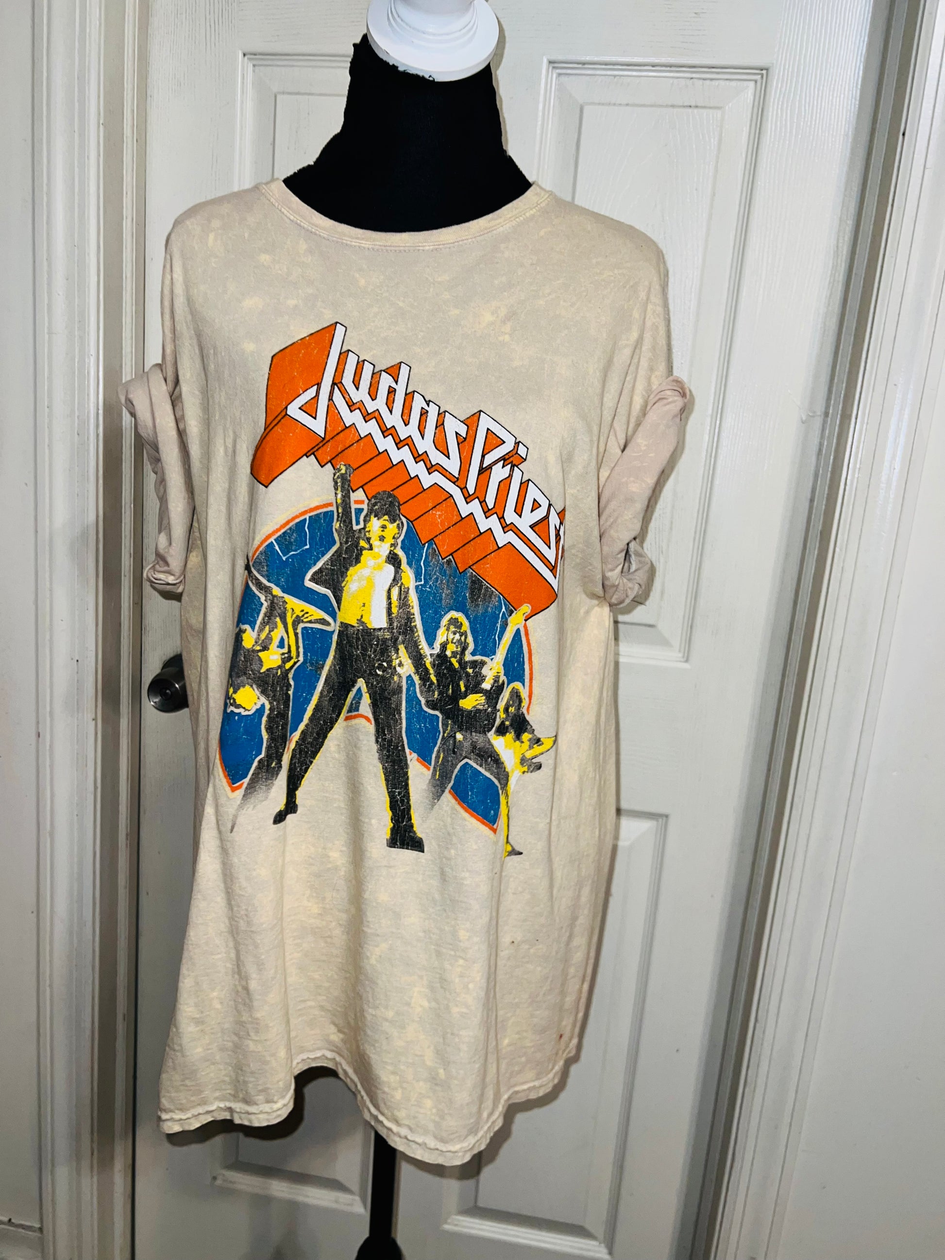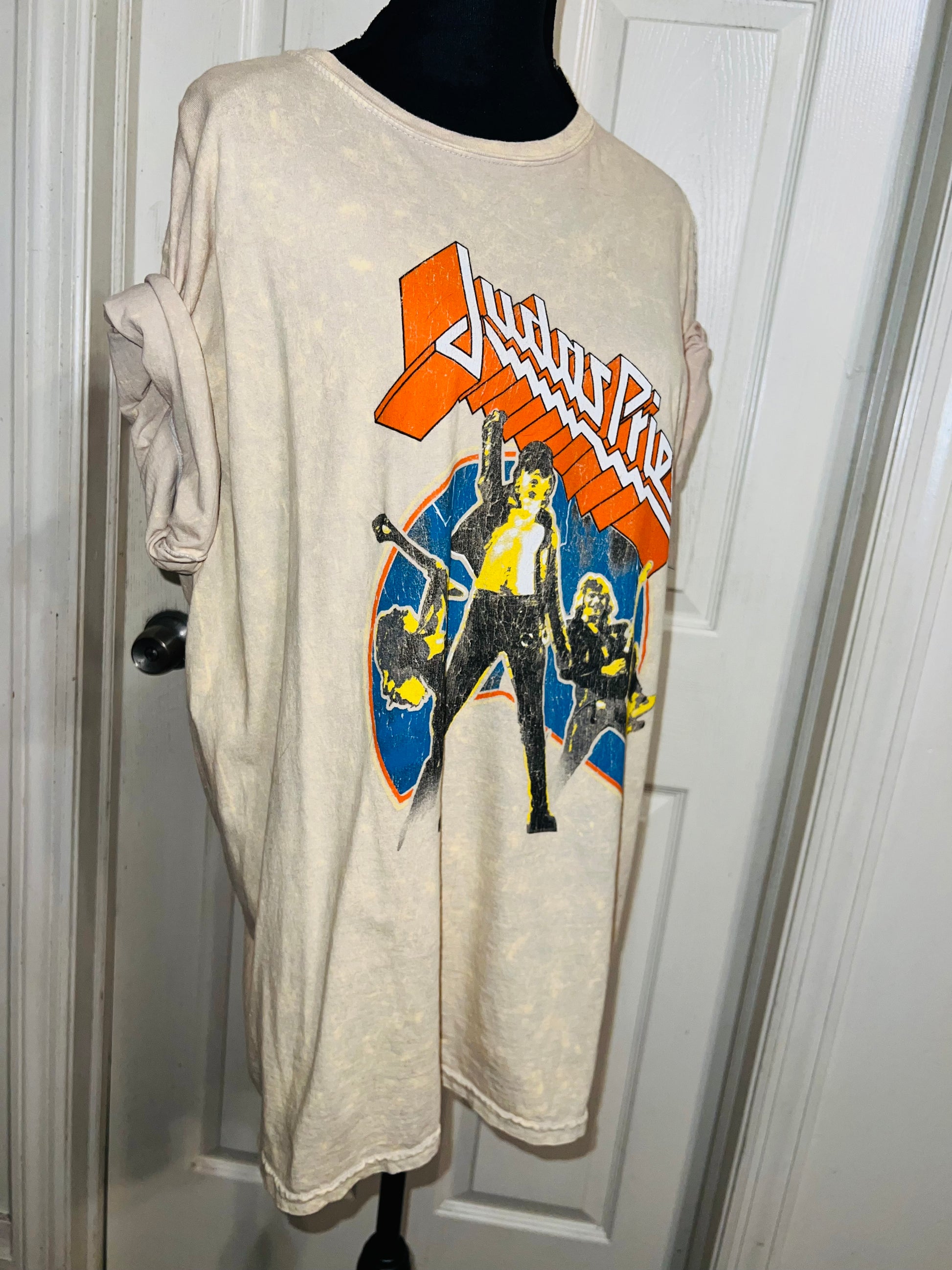 Beige mineral washed oversized tee with the Judas Priest graphic and logo. I don’t see these often! It’s very soft, comfortable, and size XL. This isn’t distressed yet, so please be sure to choose your level of distress