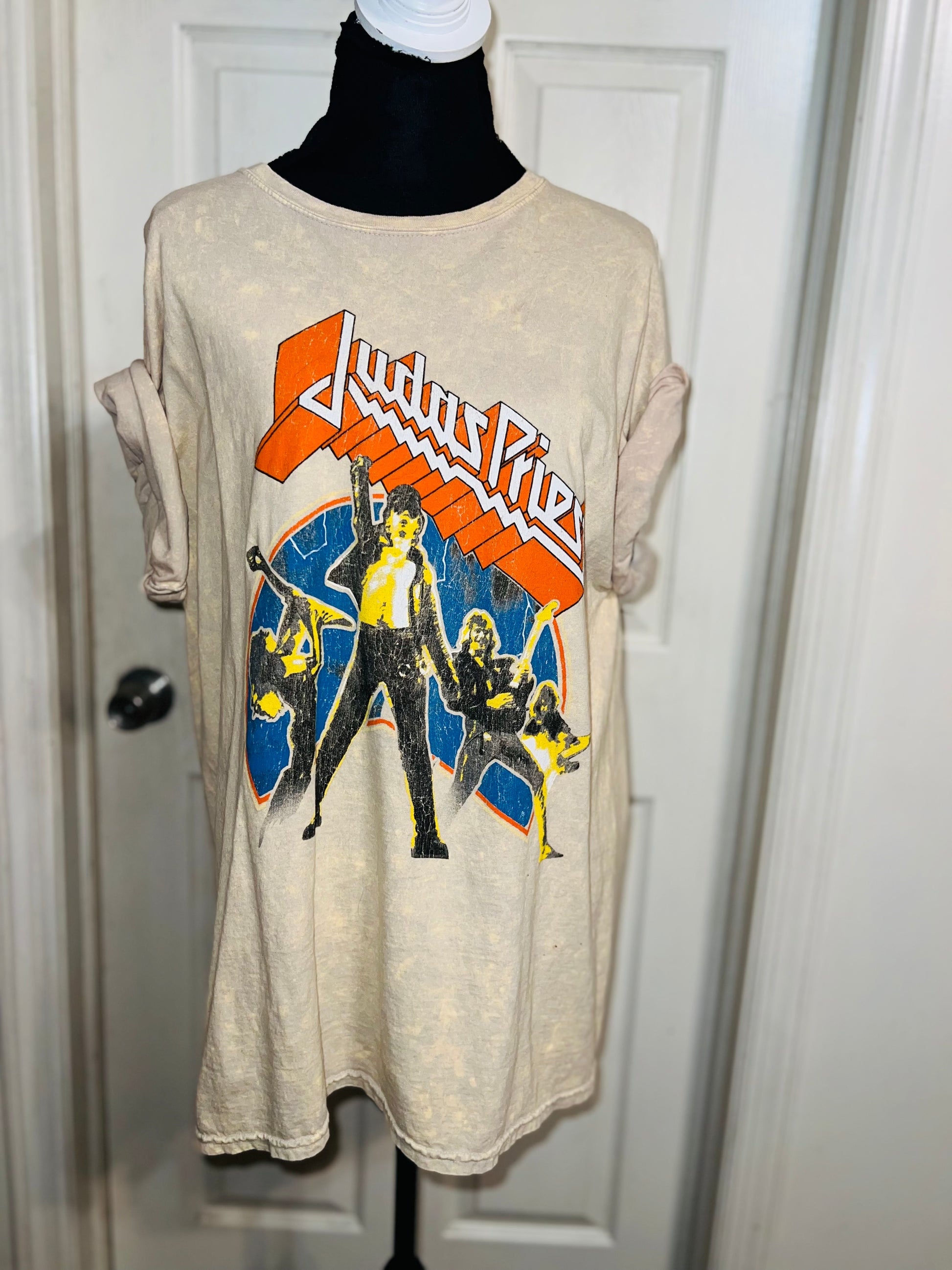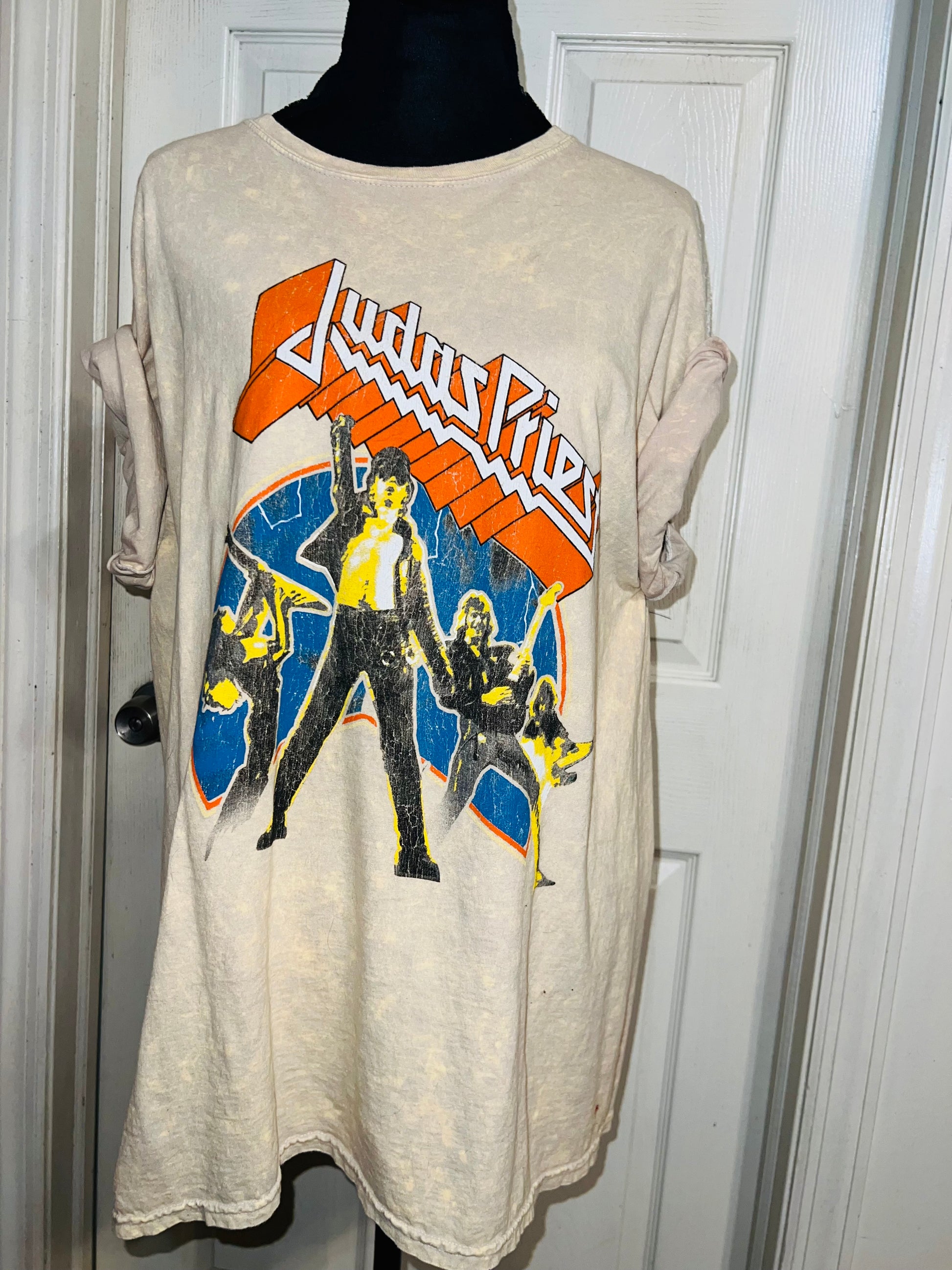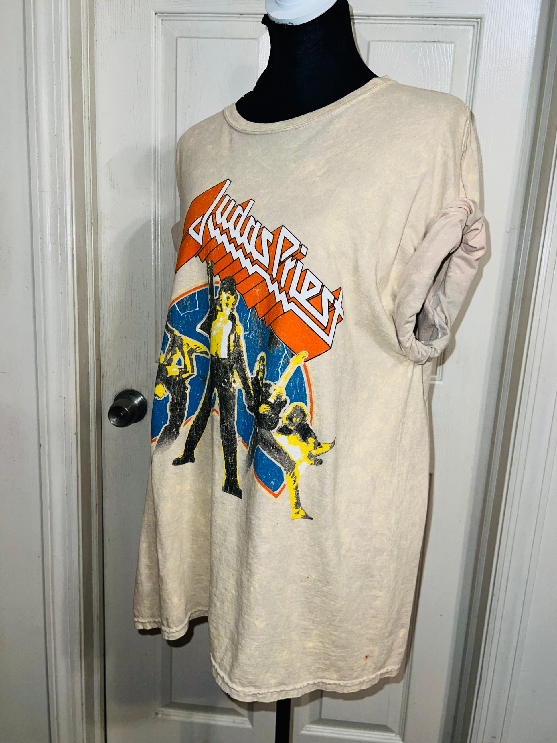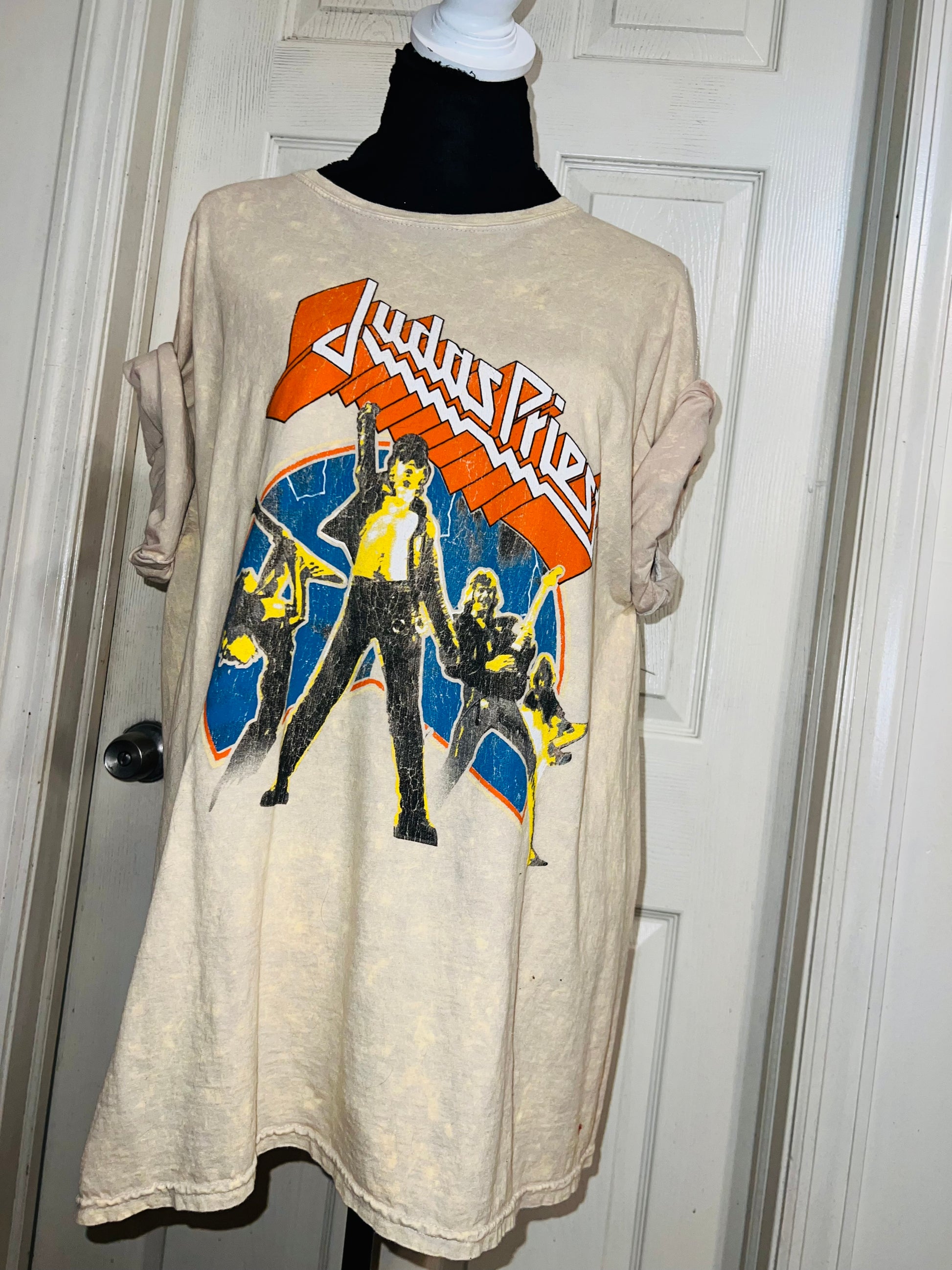 Beige mineral washed oversized tee with the Judas Priest graphic and logo. I don’t see these often! It’s very soft, comfortable, and size XL. This isn’t distressed yet, so please be sure to choose your level of distress