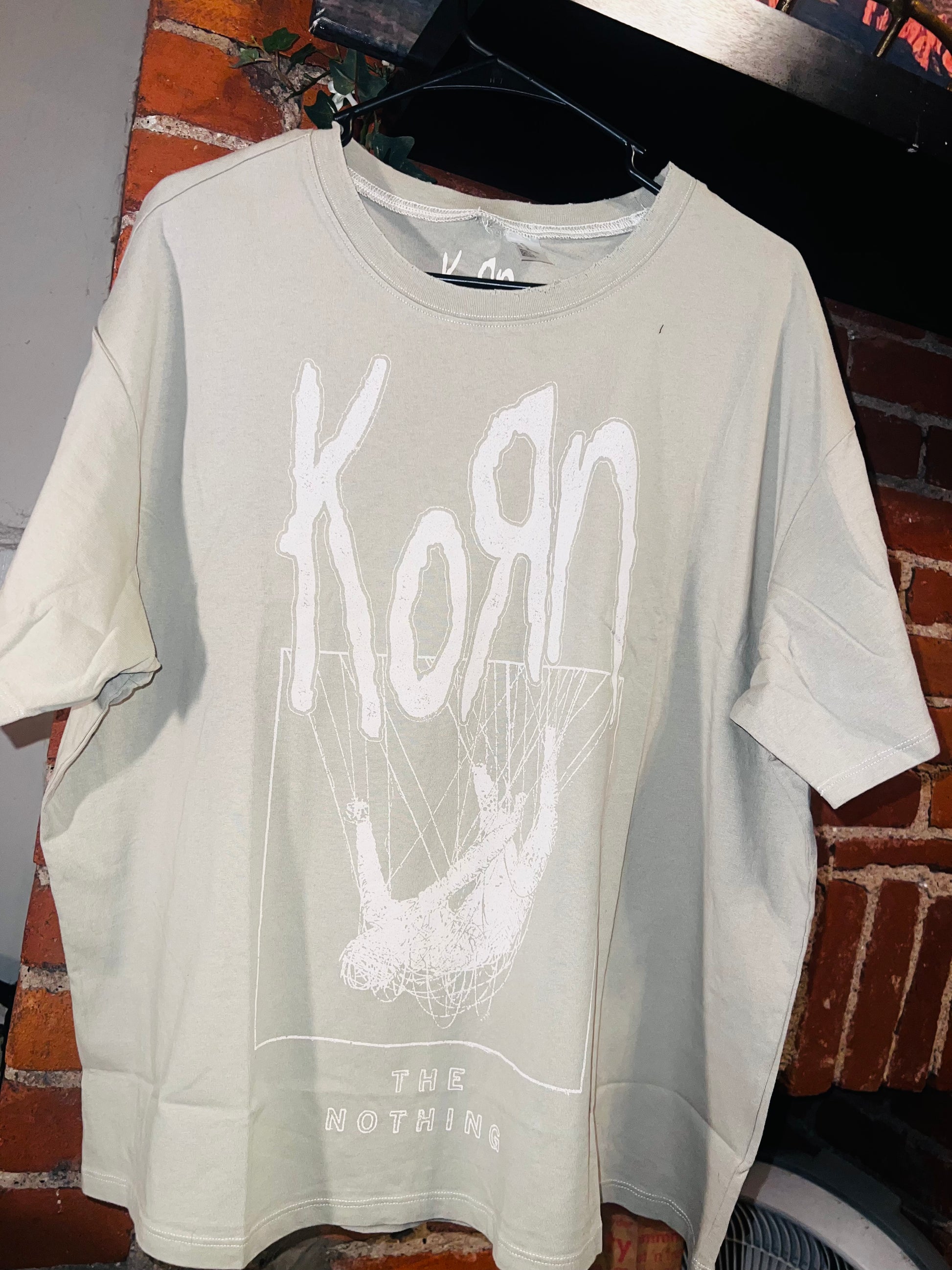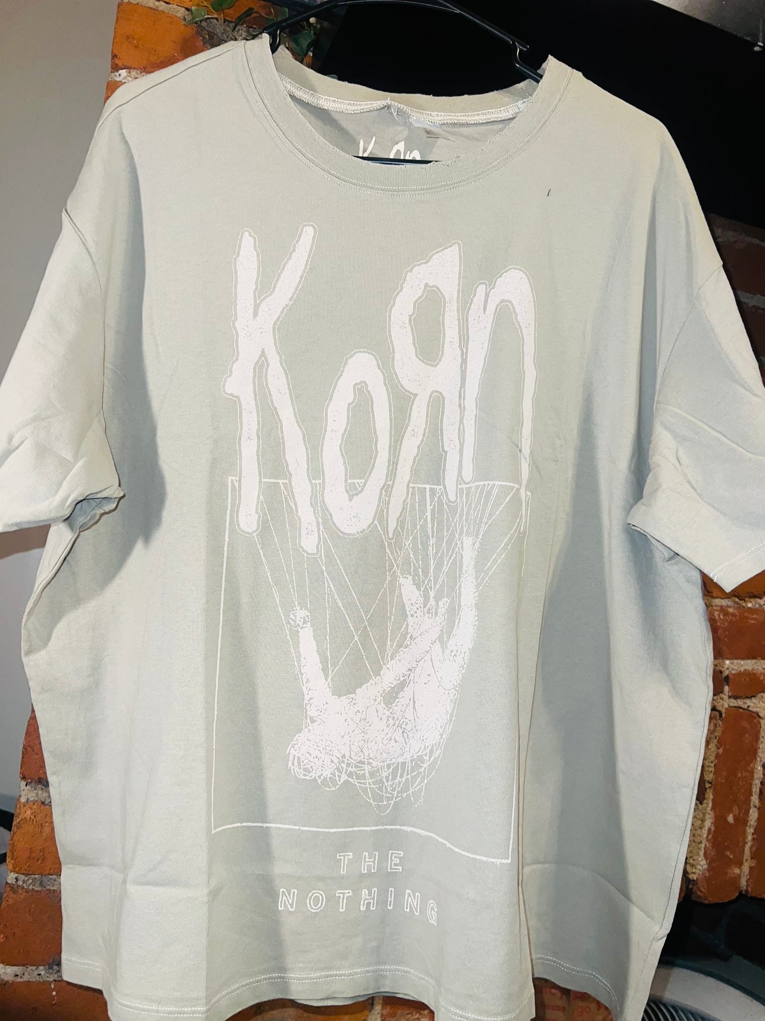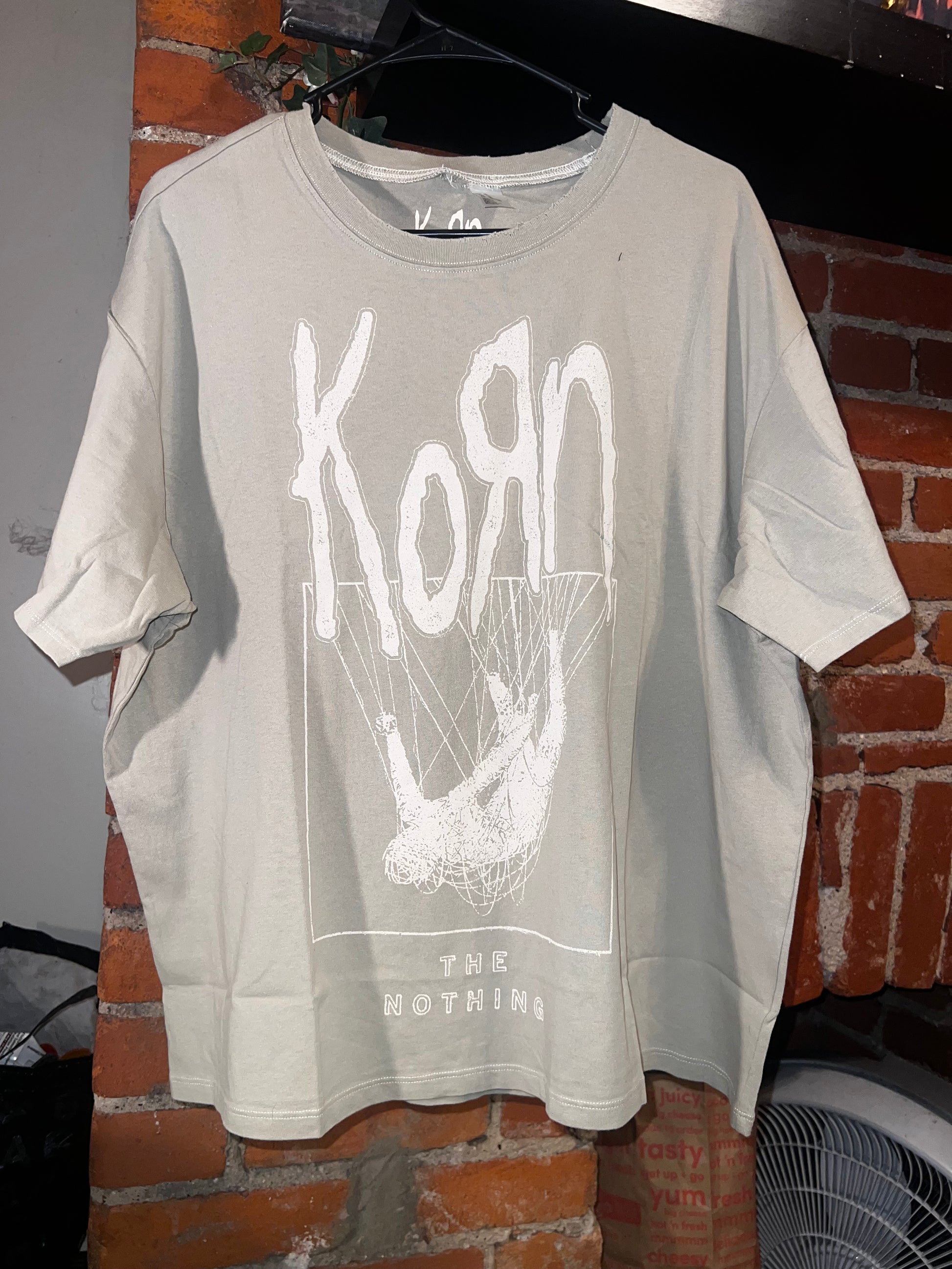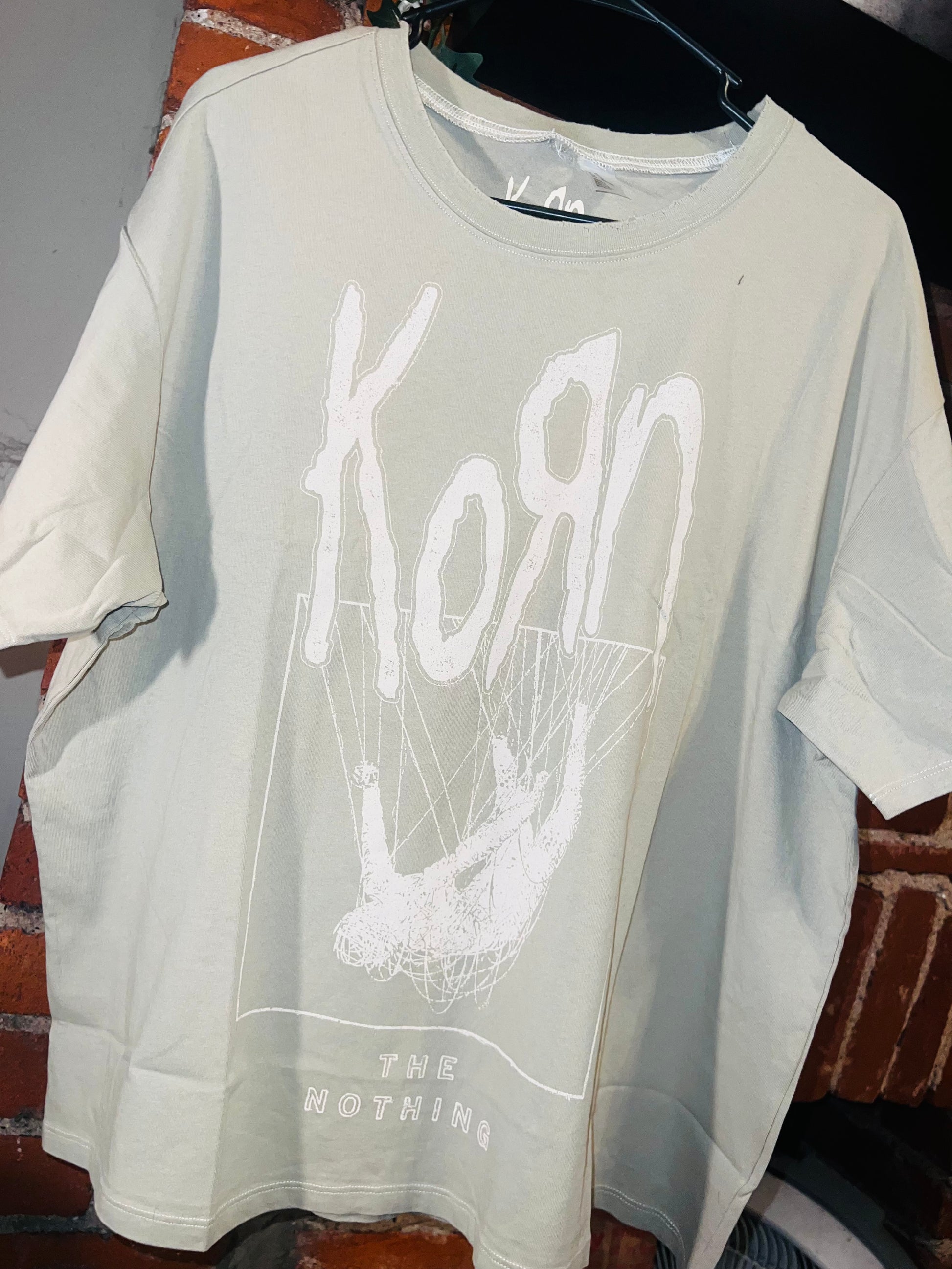 Such a pretty neutral light green tee with the iconic Korn font with a cool graphic and “Like Nothing” underneath. Fits so cute oversized, size XL.