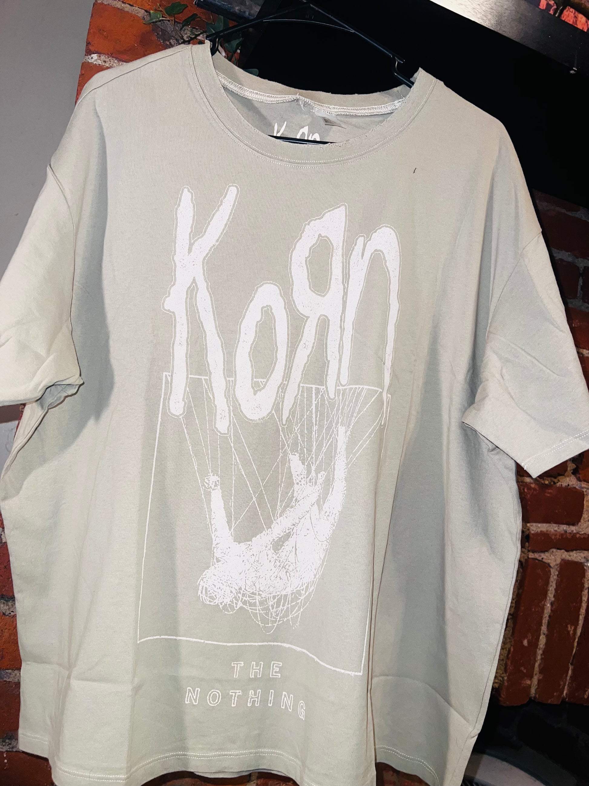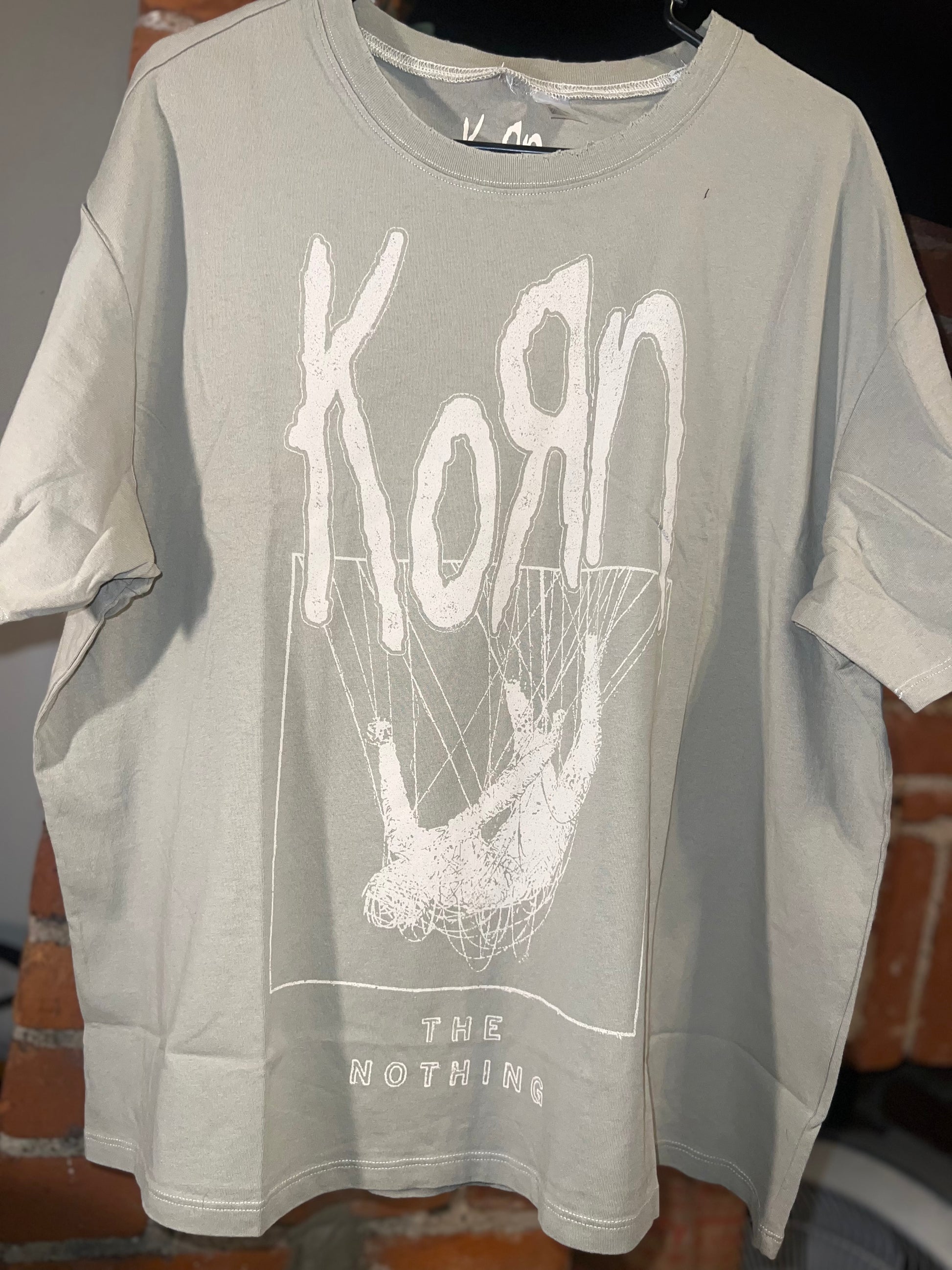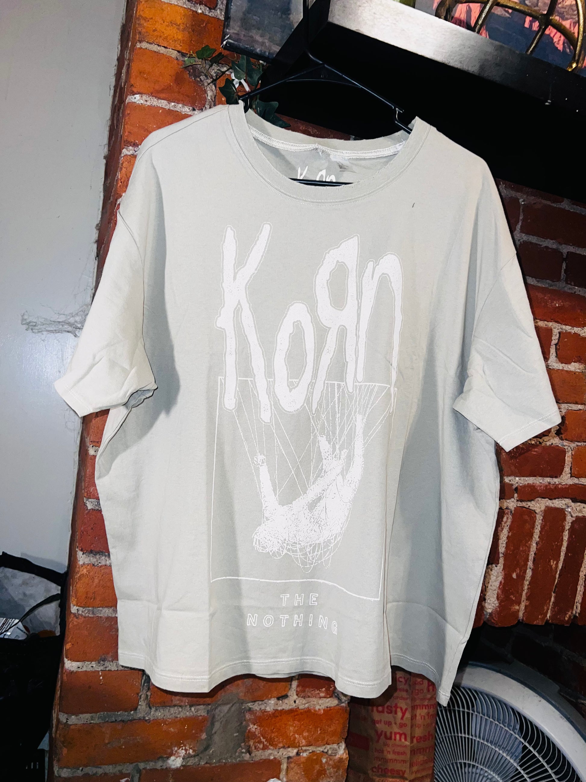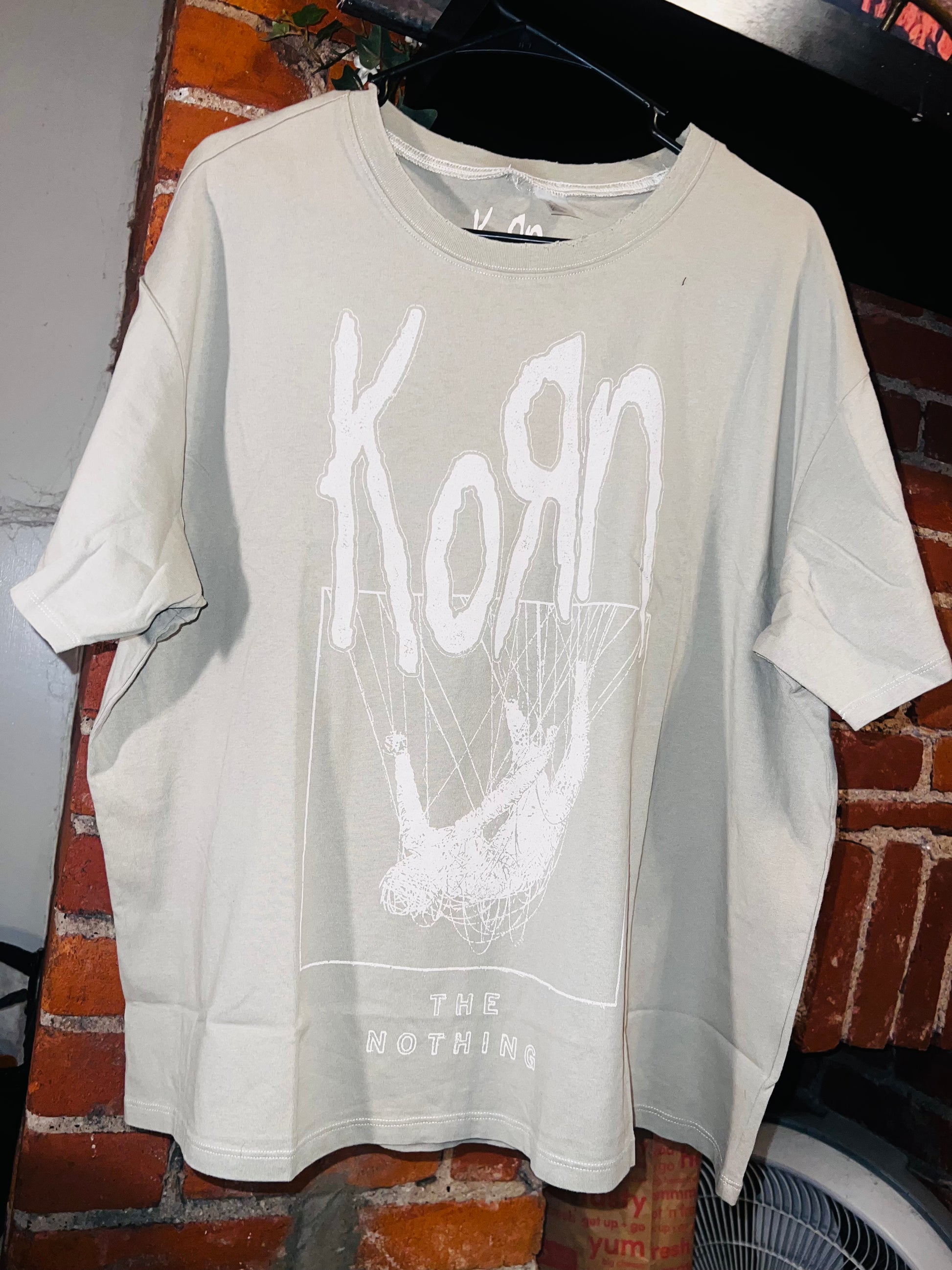 Such a pretty neutral light green tee with the iconic Korn font with a cool graphic and “Like Nothing” underneath. Fits so cute oversized, size XL.