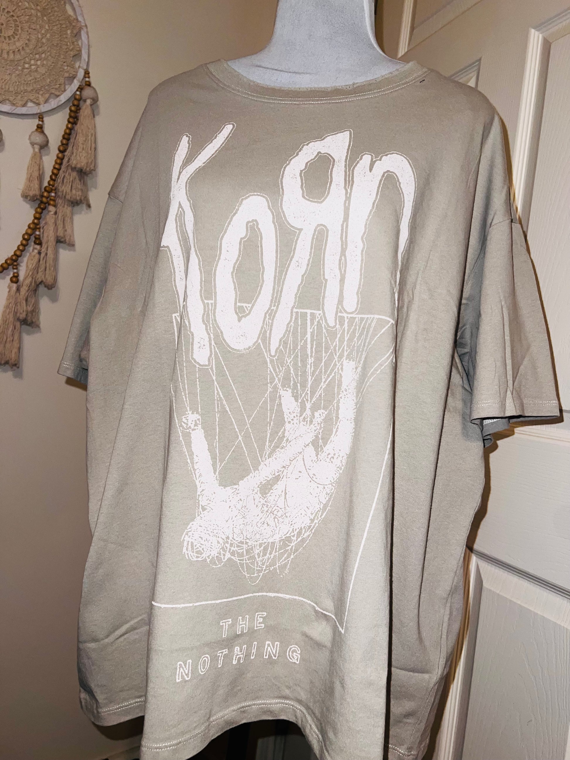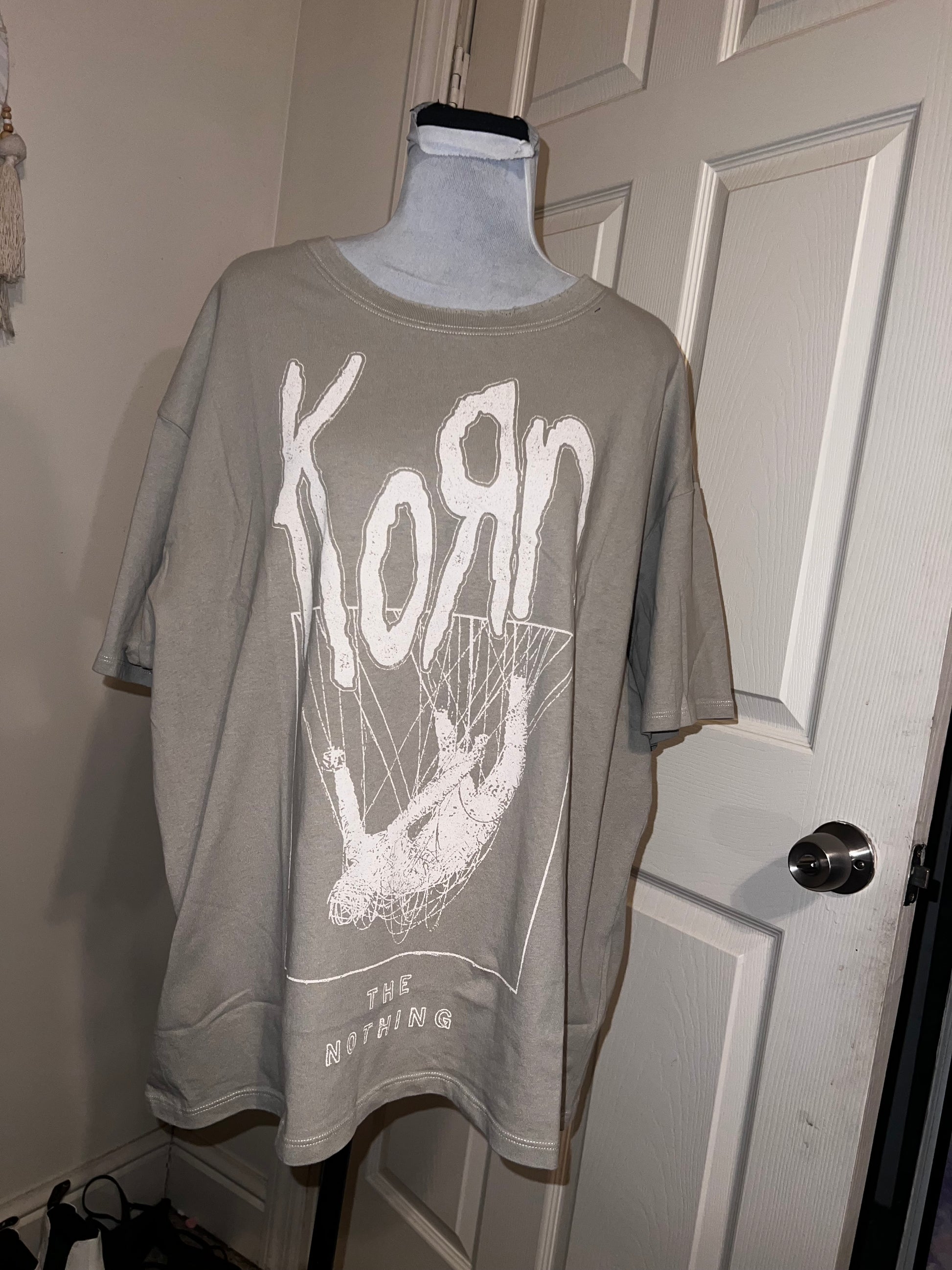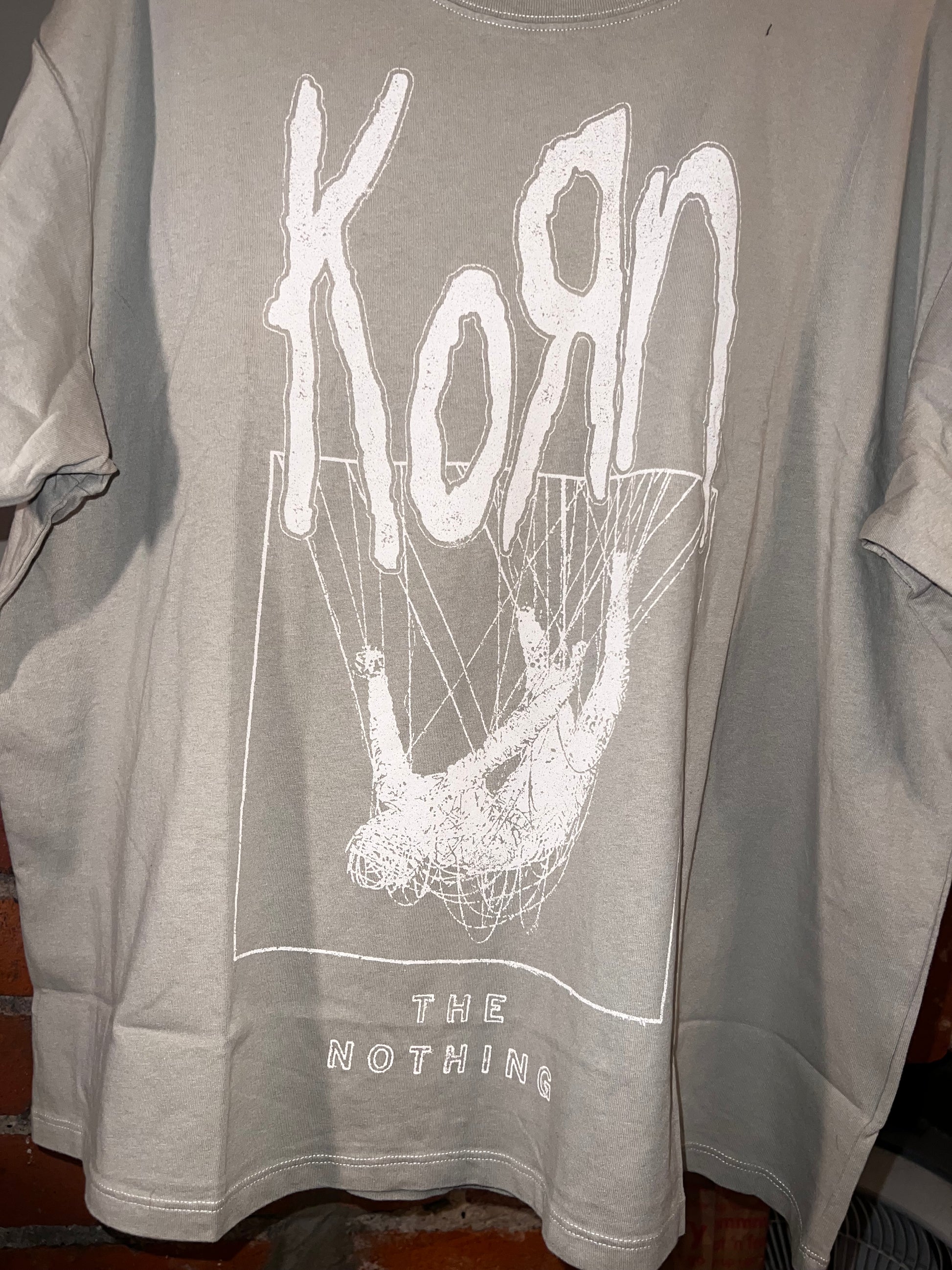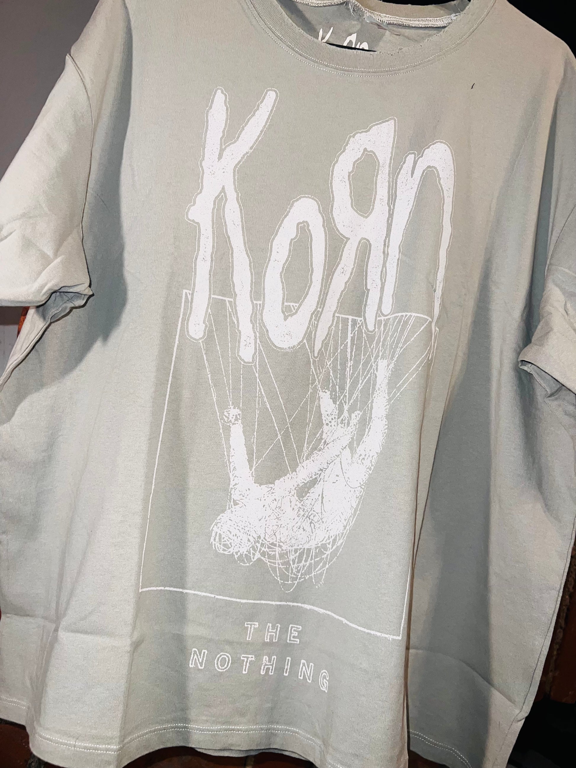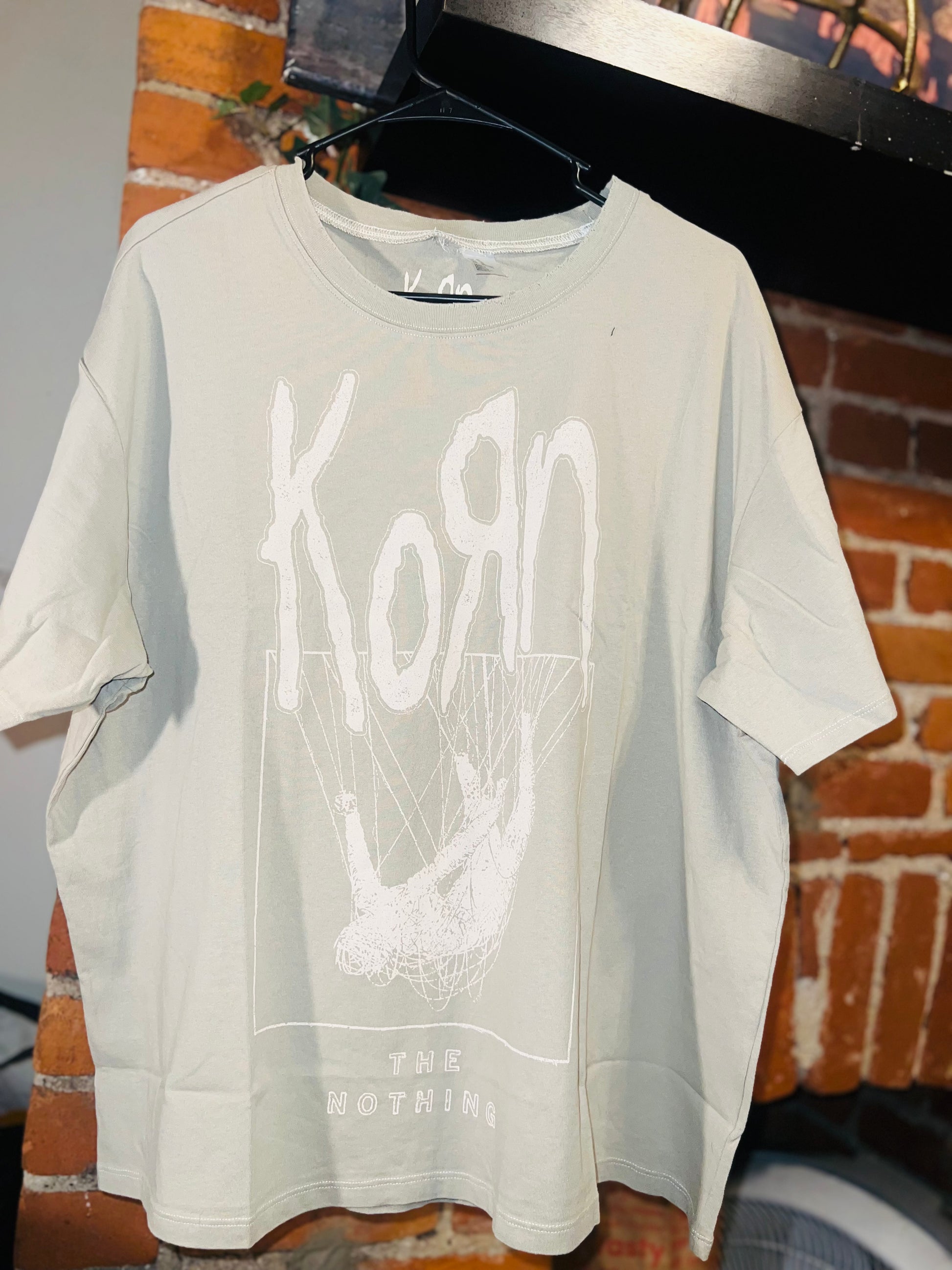Such a pretty neutral light green tee with the iconic Korn font with a cool graphic and “Like Nothing” underneath. Fits so cute oversized, size XL.