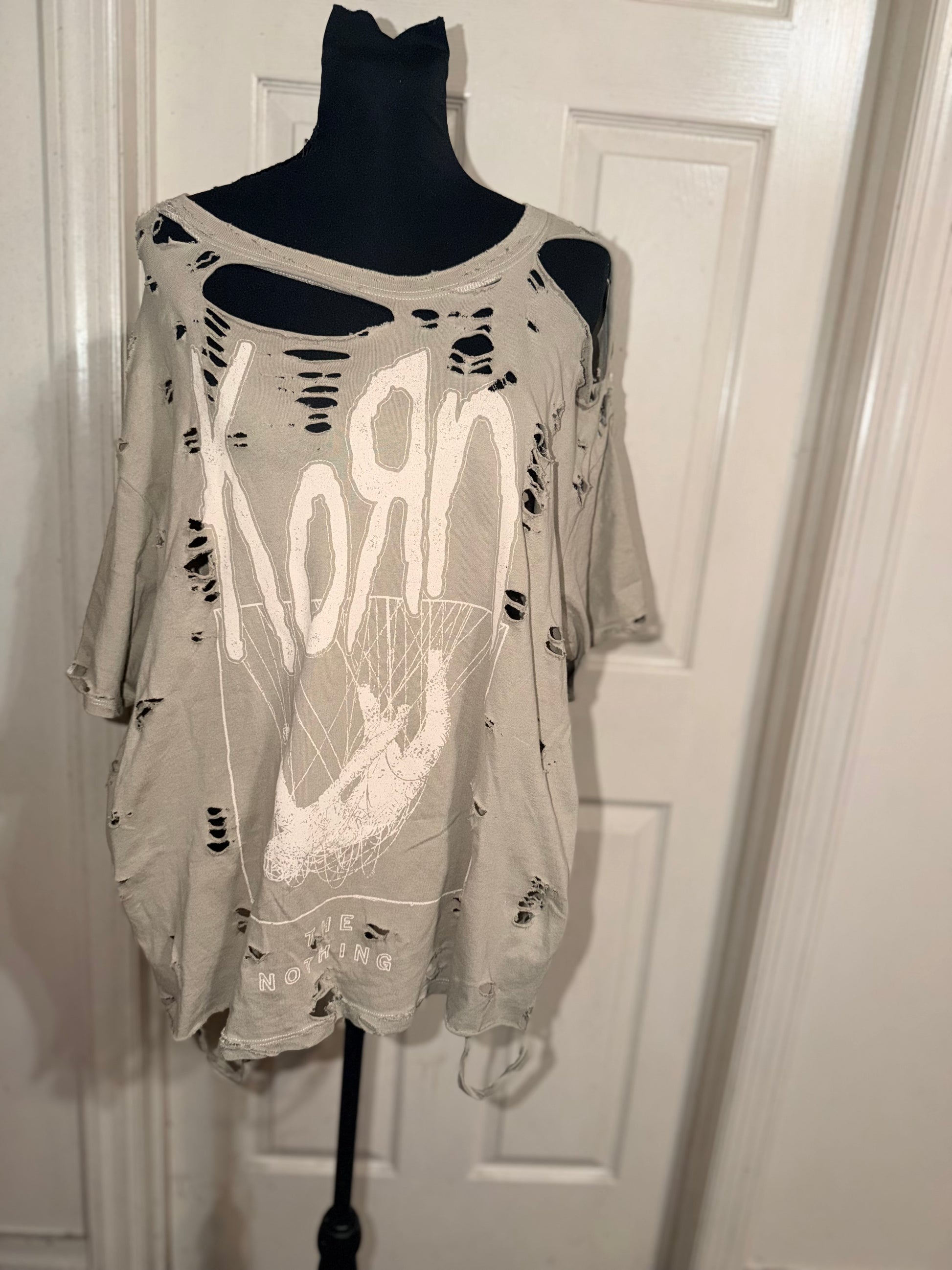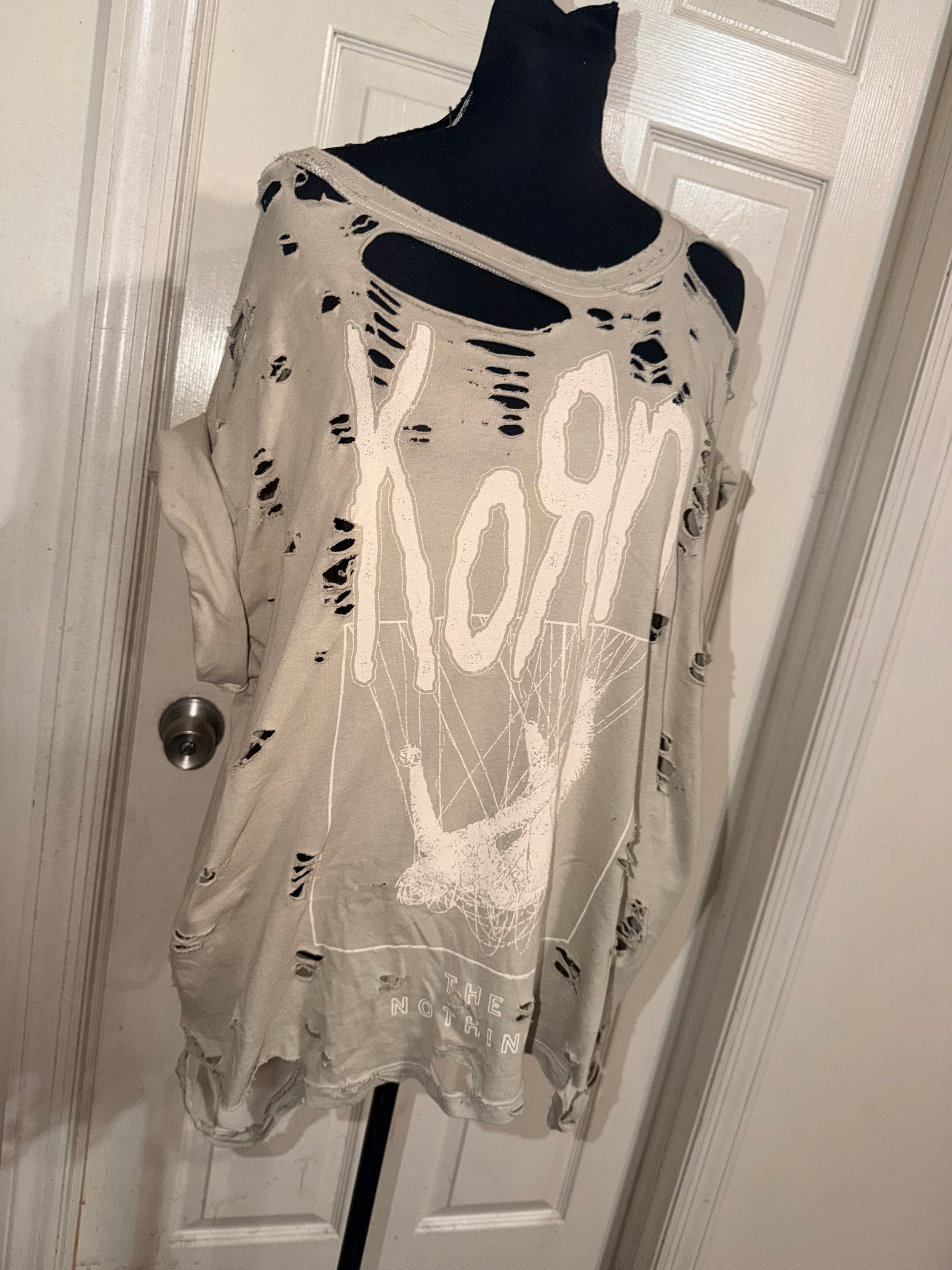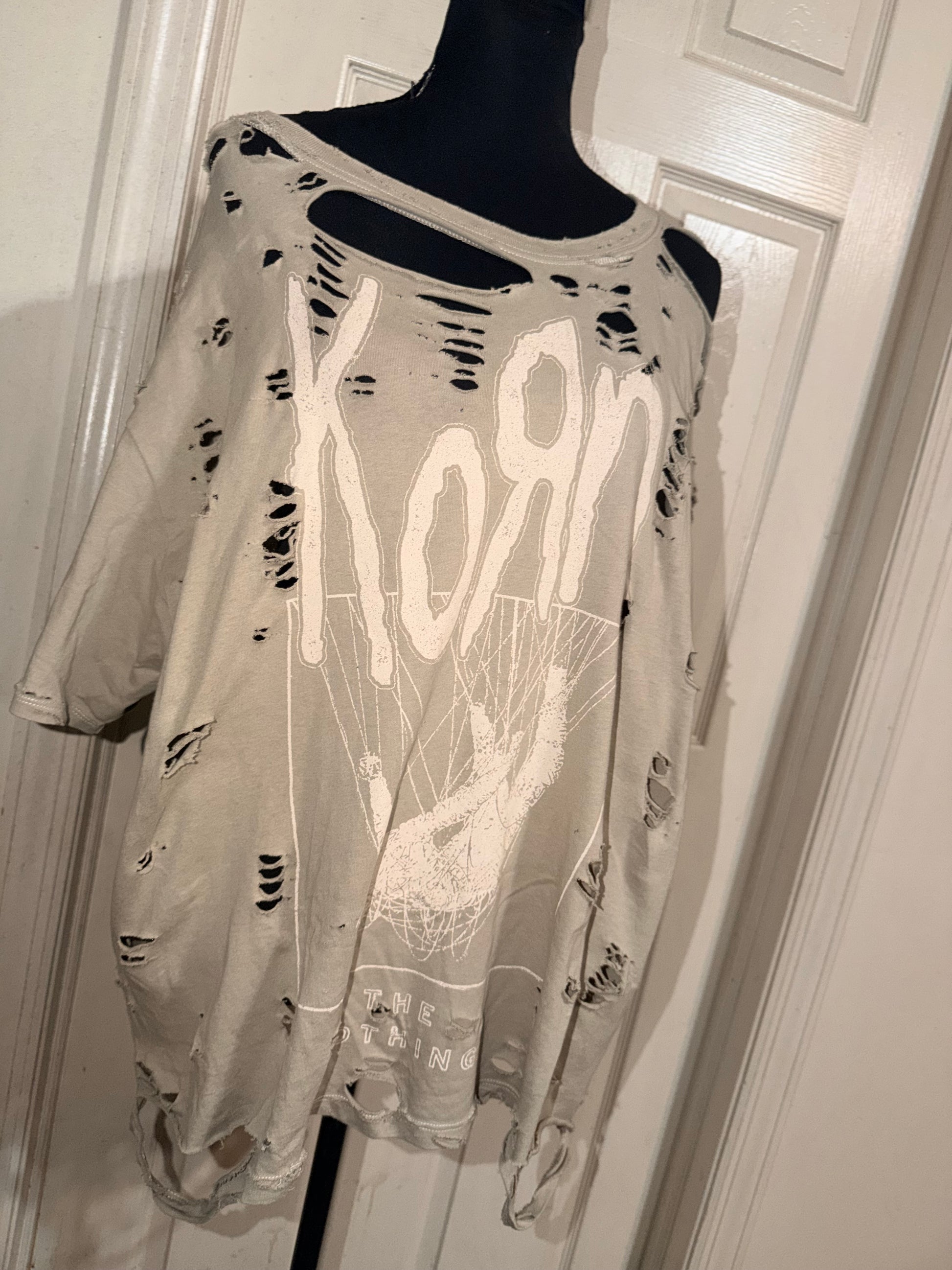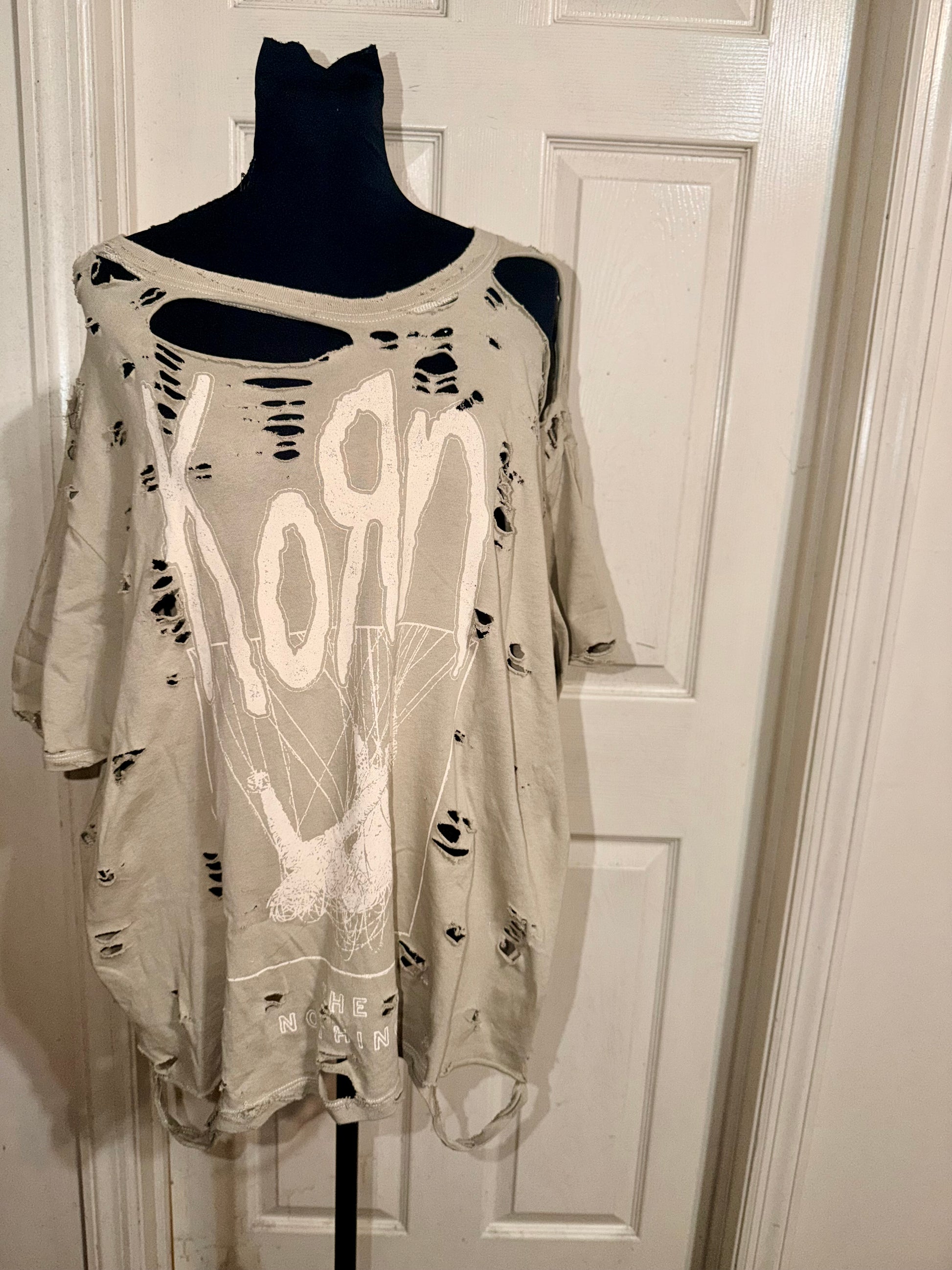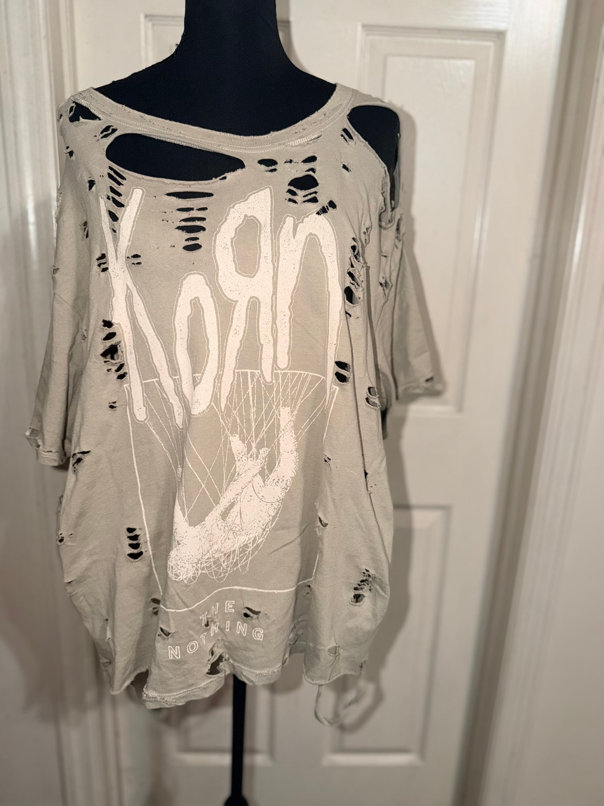 This is distressed as is. Such a pretty neutral light green tee with the iconic Korn font with a cool graphic and “Like Nothing” underneath. Fits so cute oversized, size XL.
