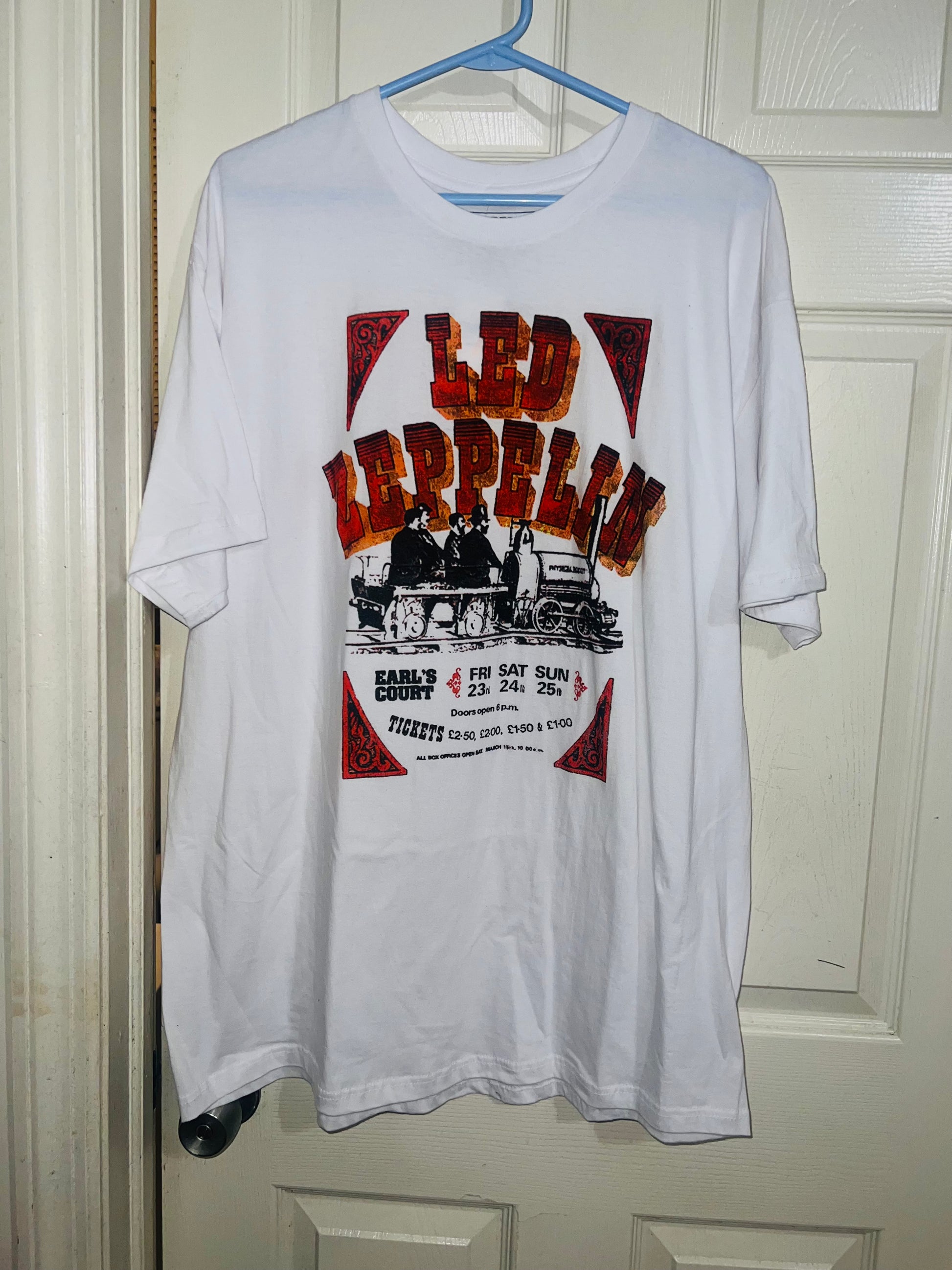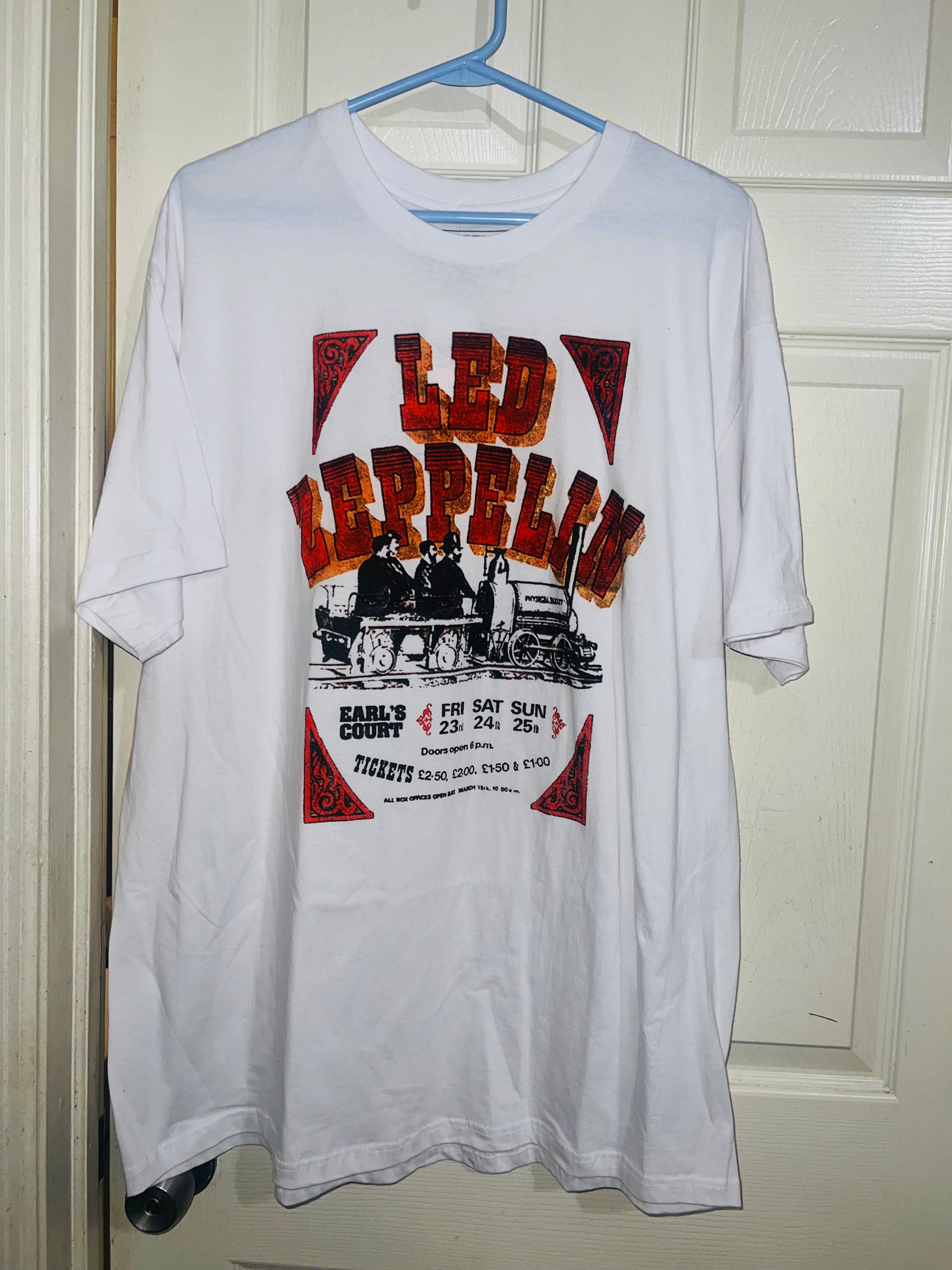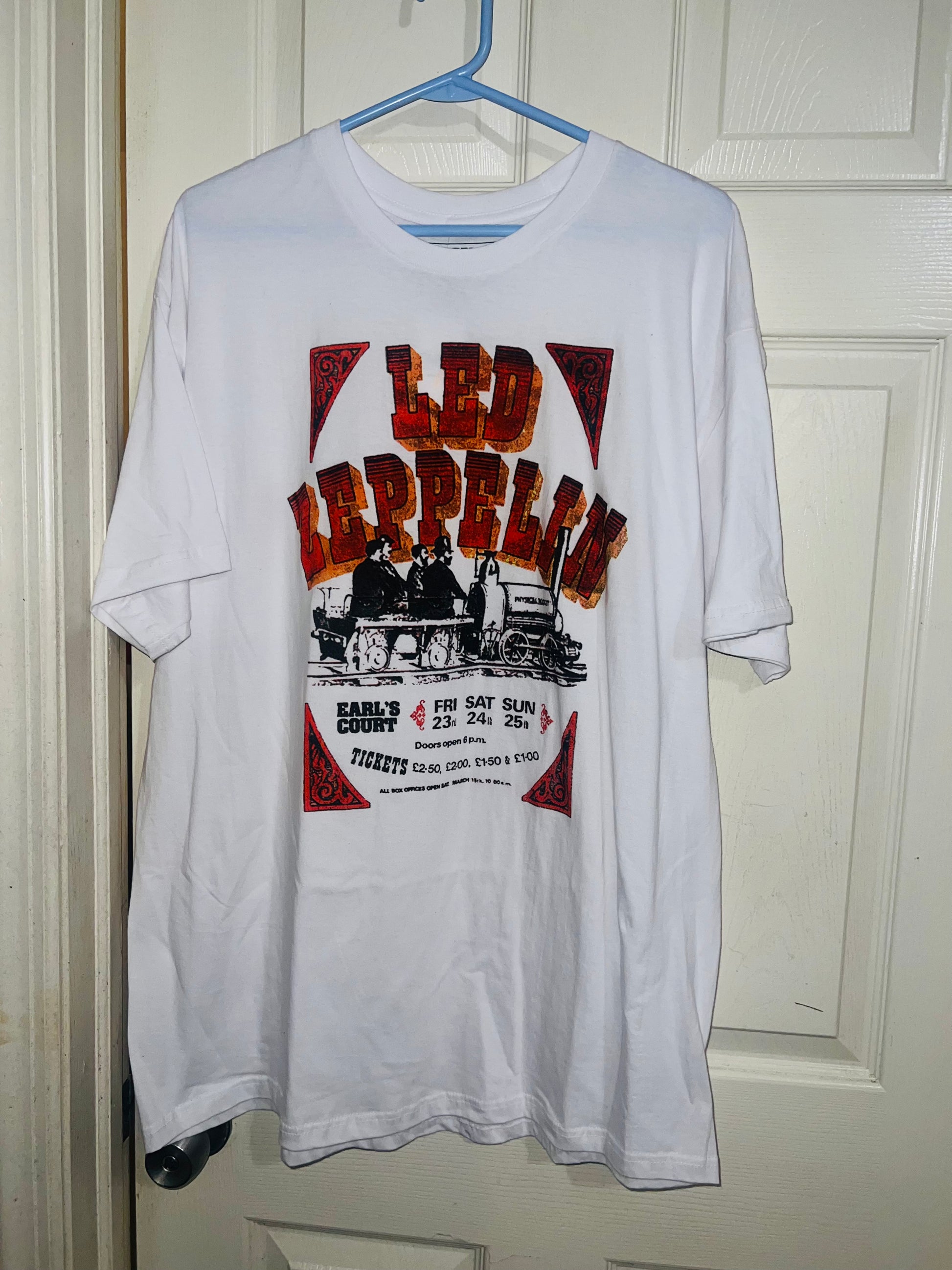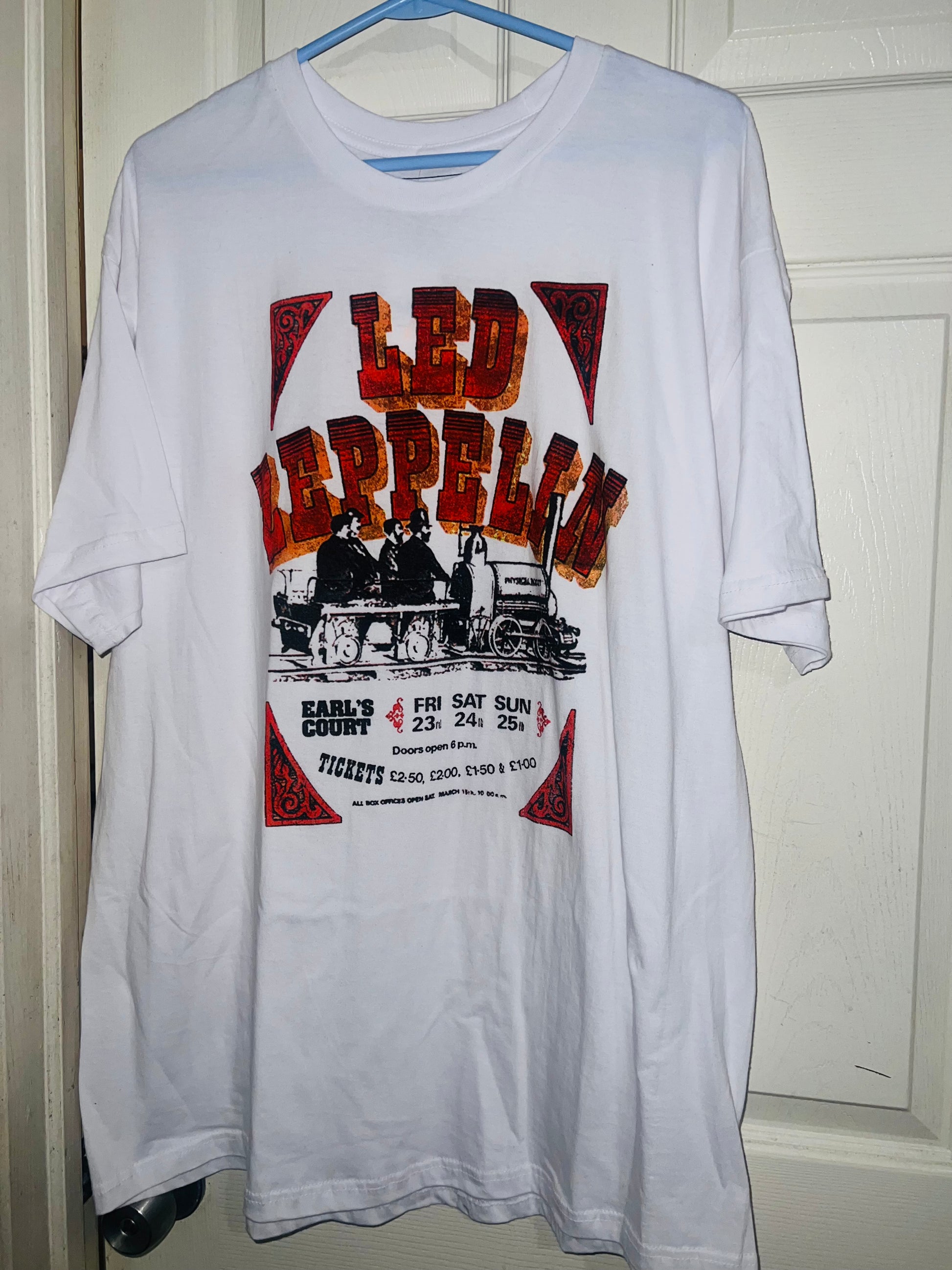A white oversized Led Zeppelin Earle’s Court concert we with the train on the front. Super cool graphic, comfy! Size XL & XXL.