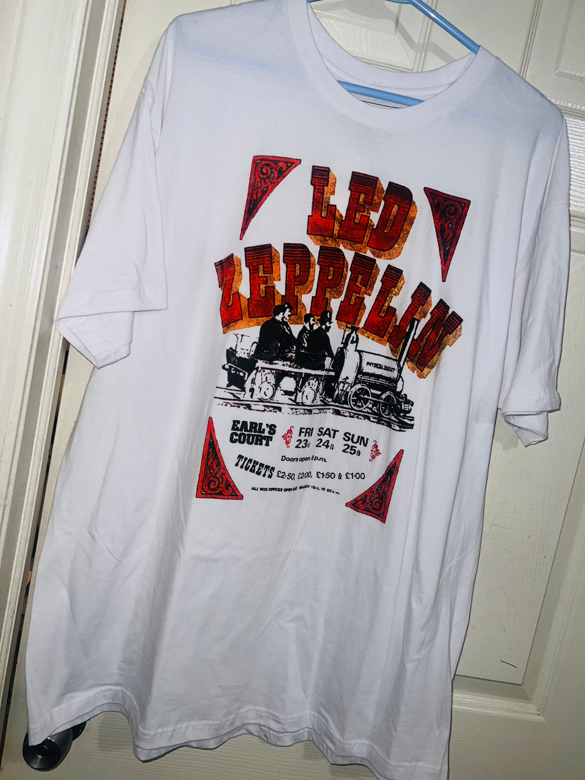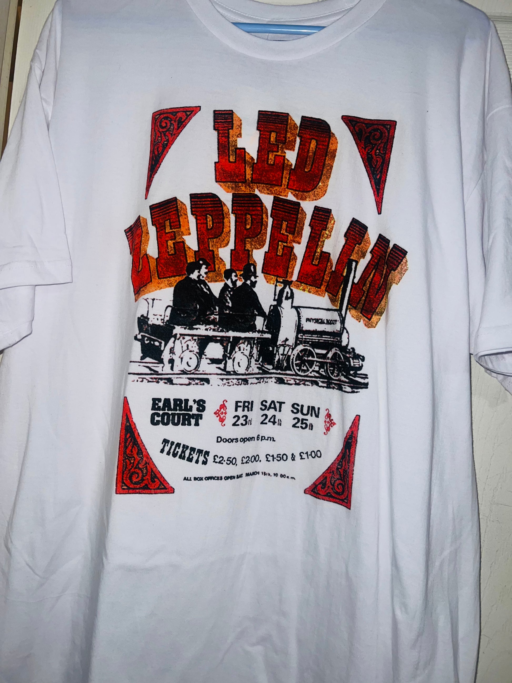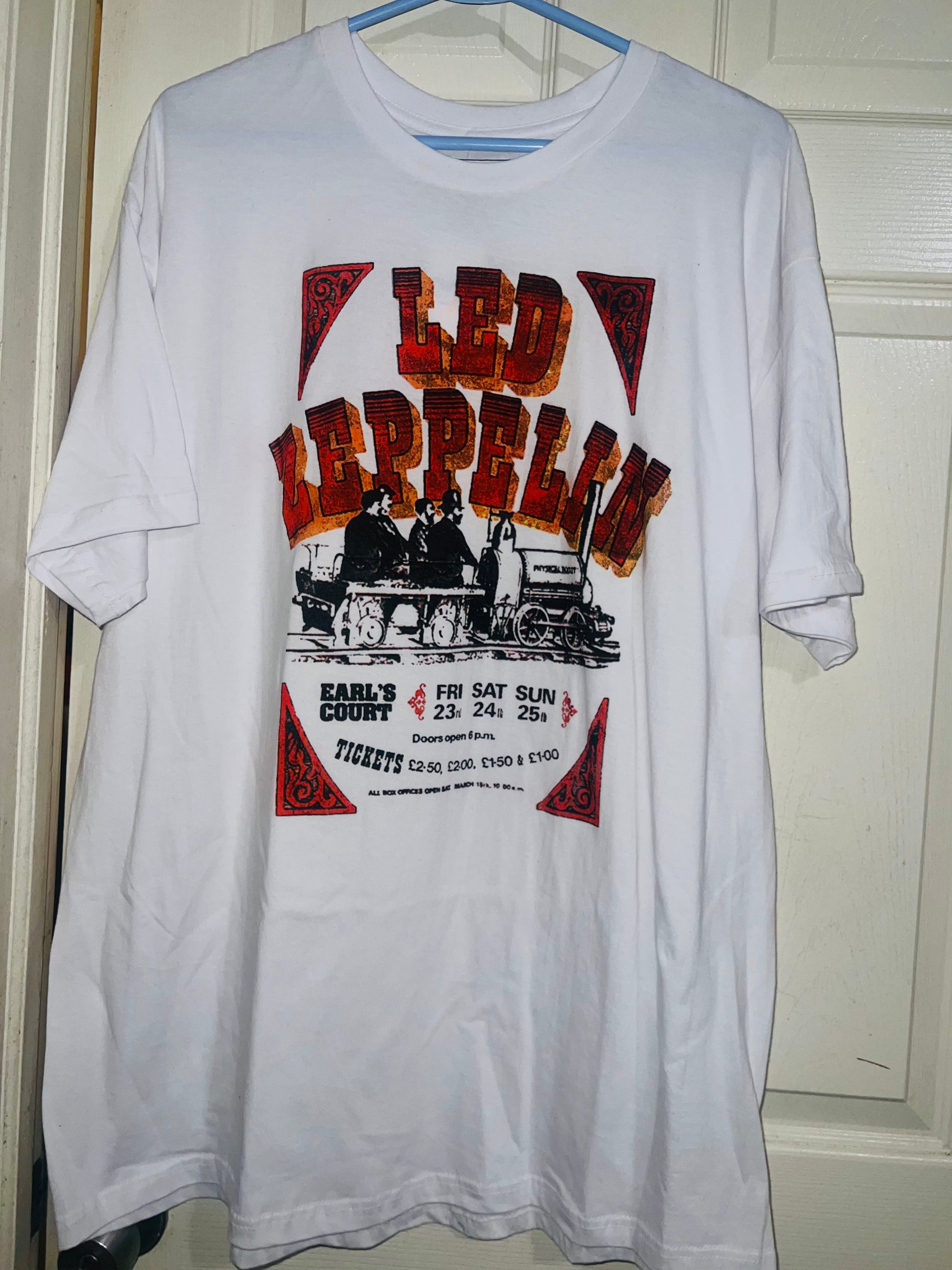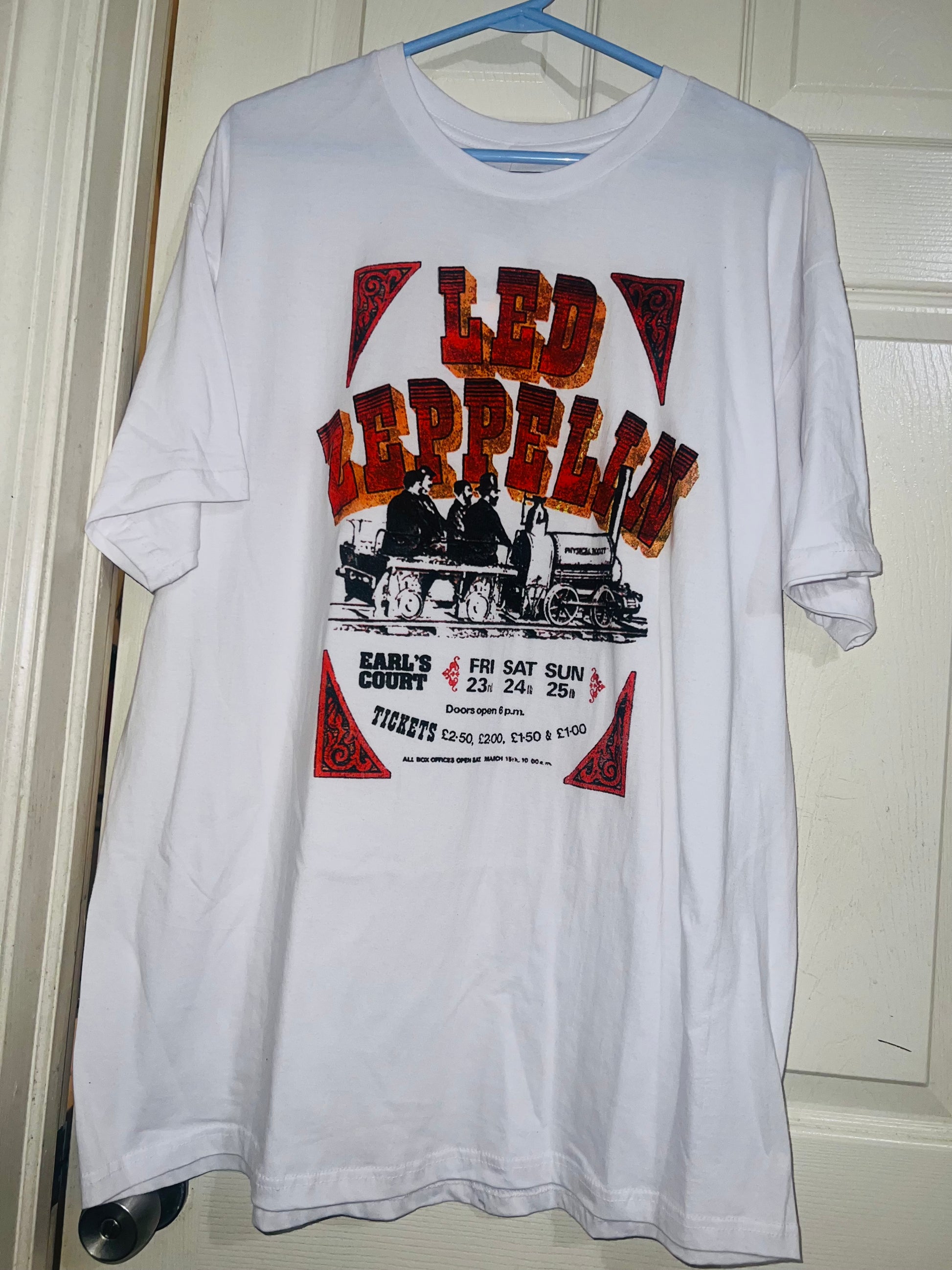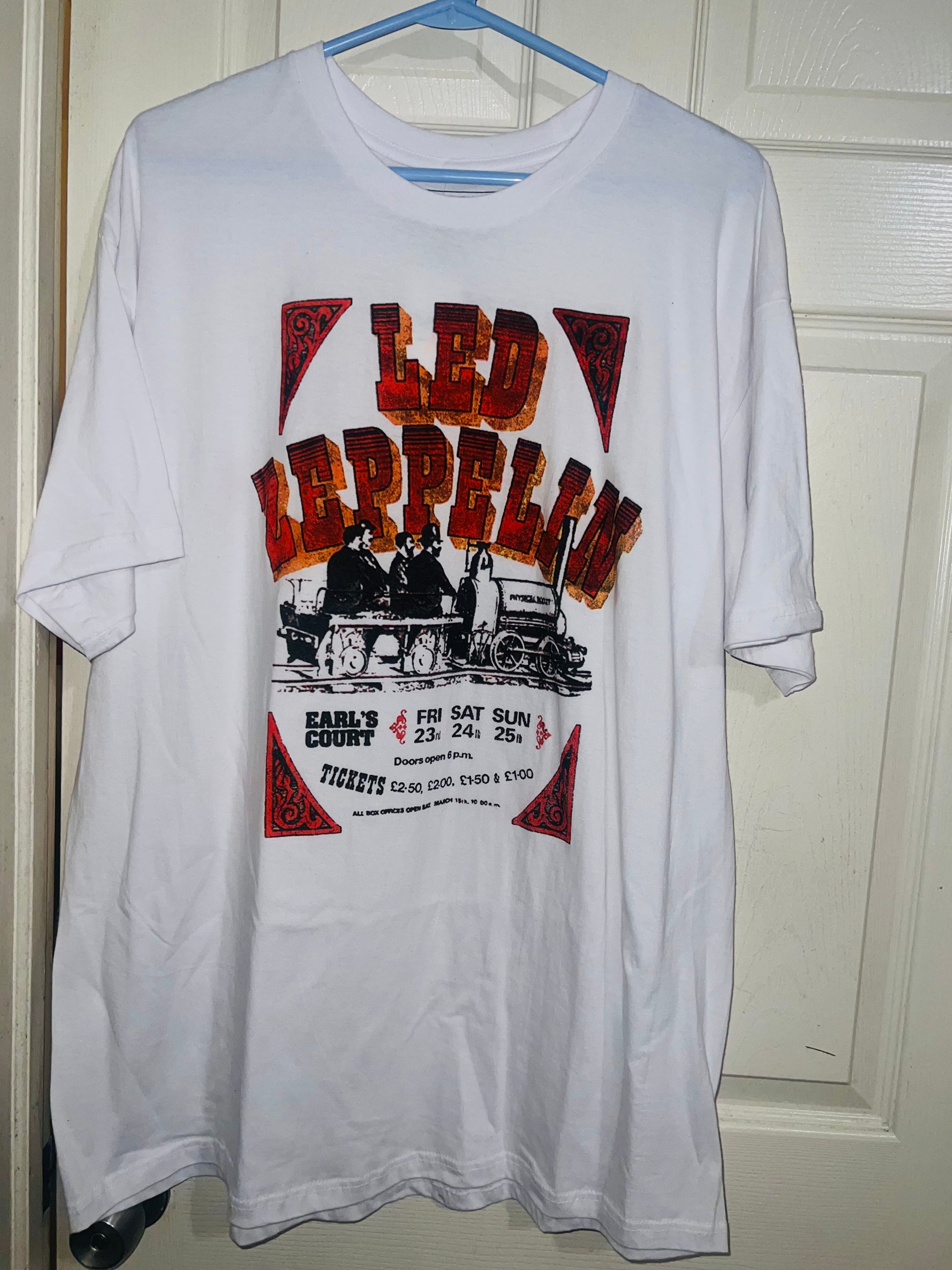 A white oversized Led Zeppelin Earle’s Court concert we with the train on the front. Super cool graphic, comfy! Size XL & XXL.
