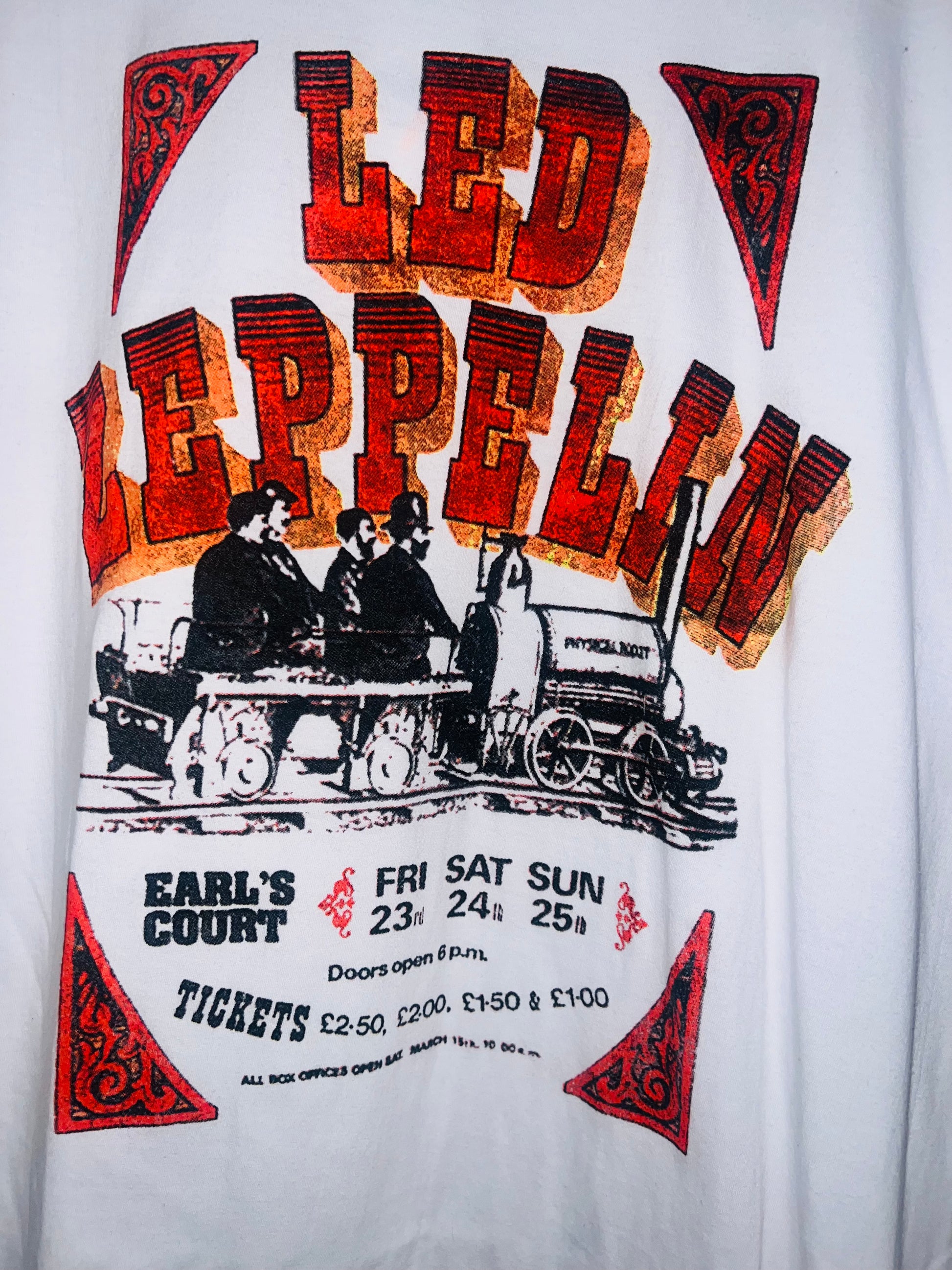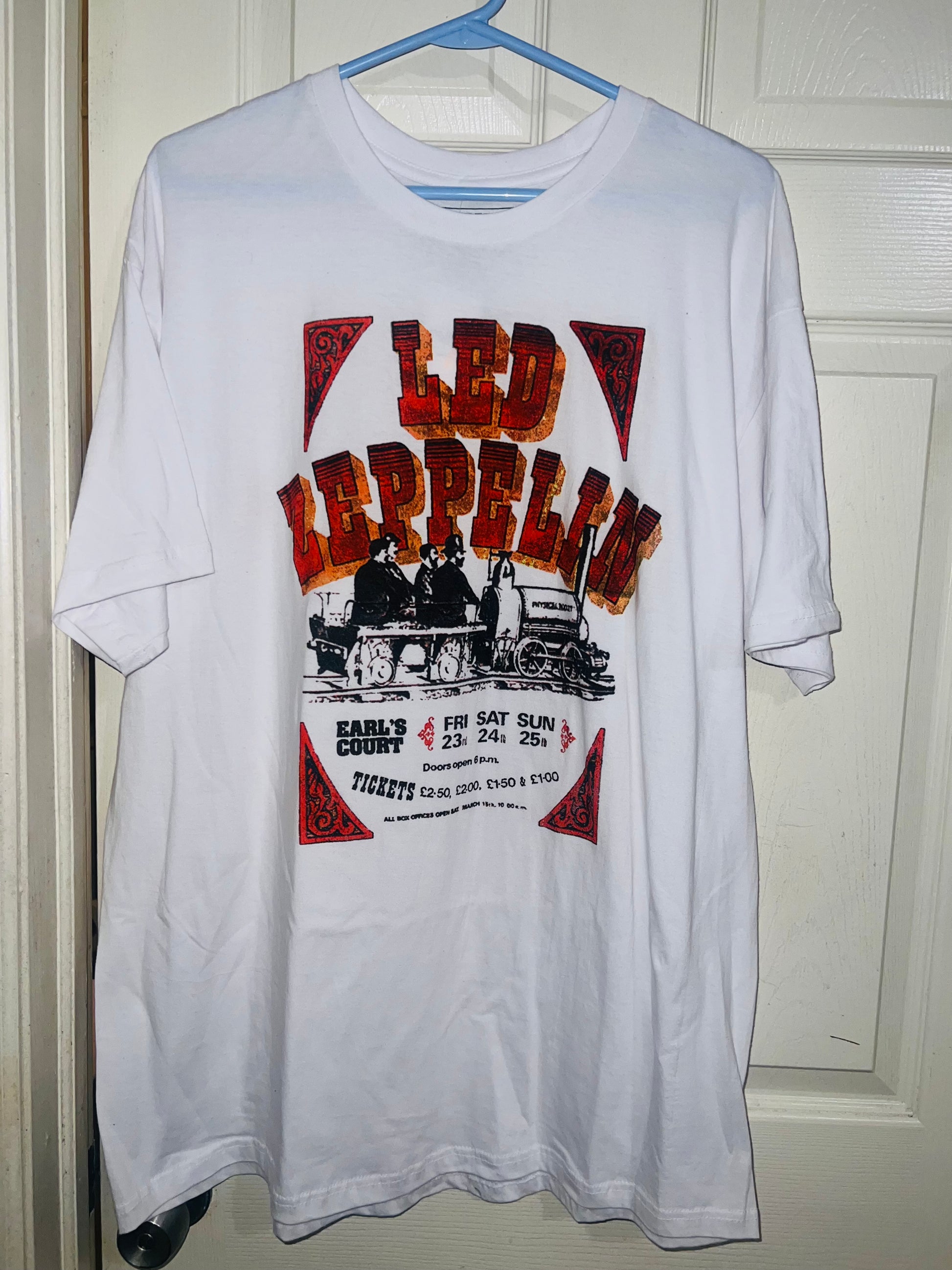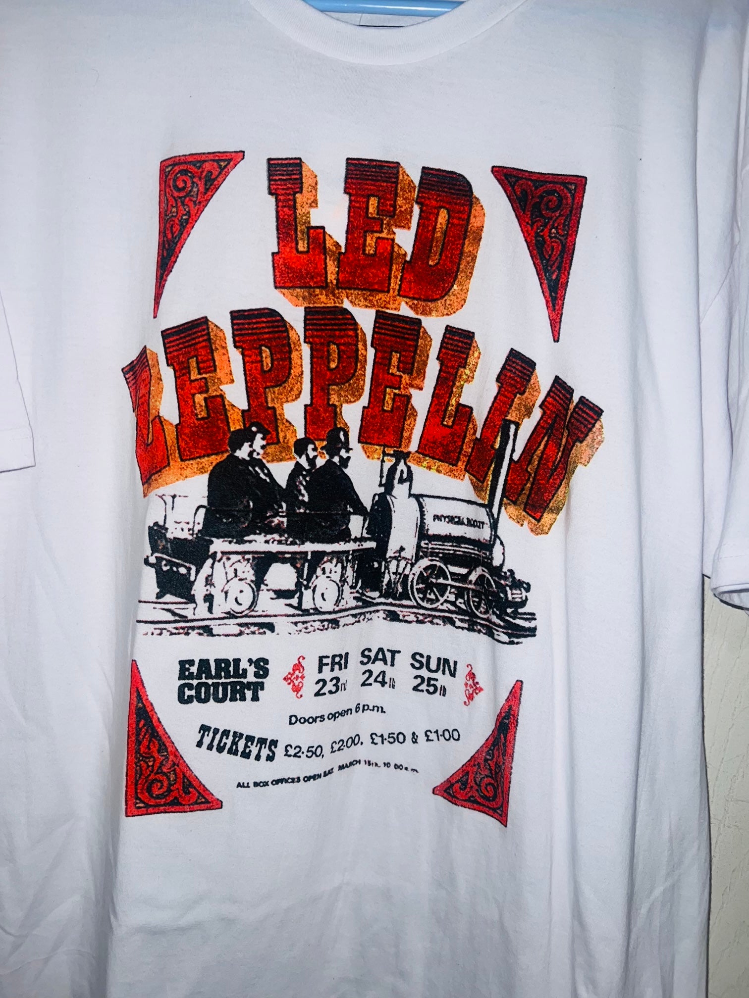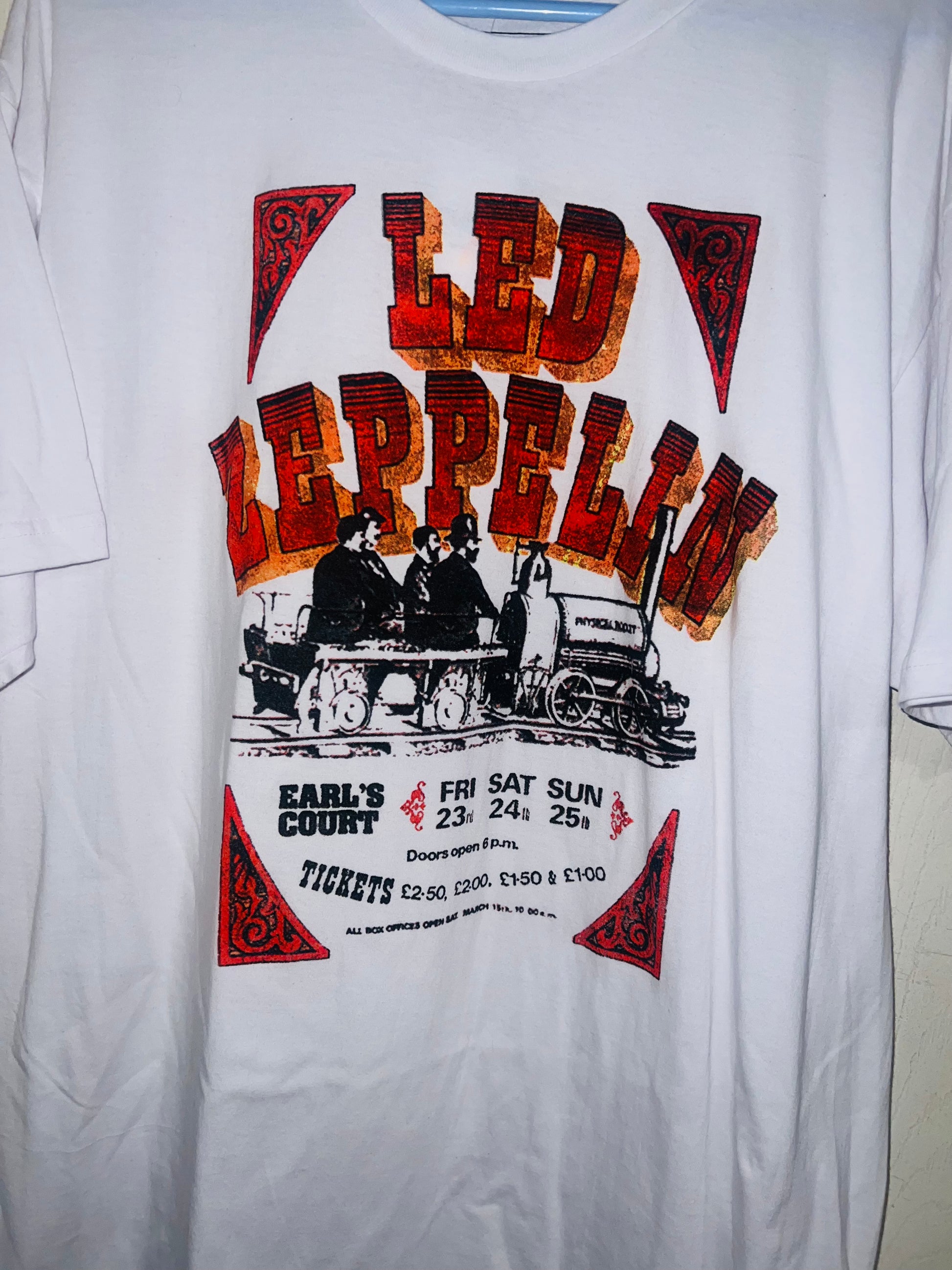 A white oversized Led Zeppelin Earle’s Court concert we with the train on the front. Super cool graphic, comfy! Size XL & XXL.